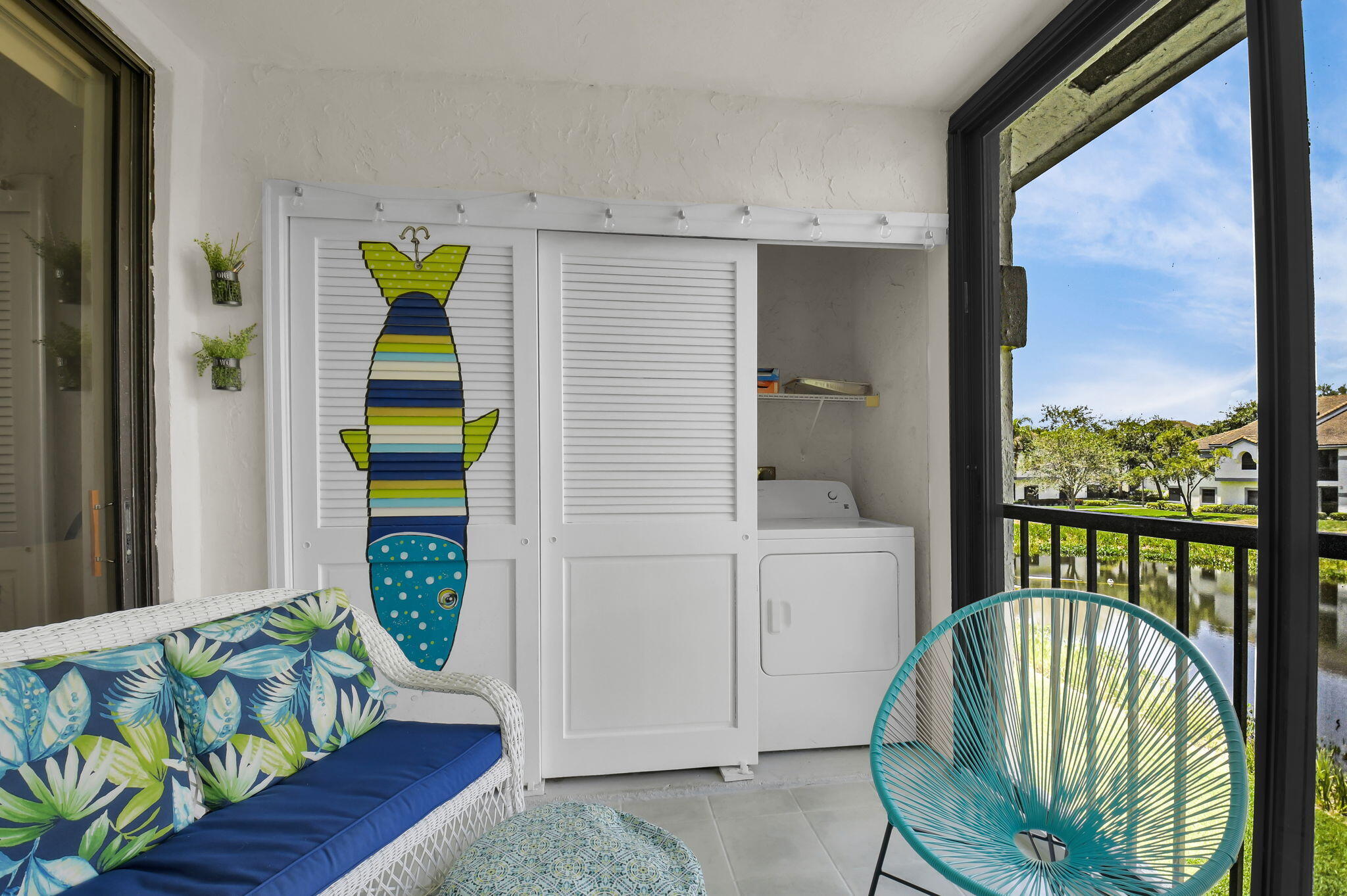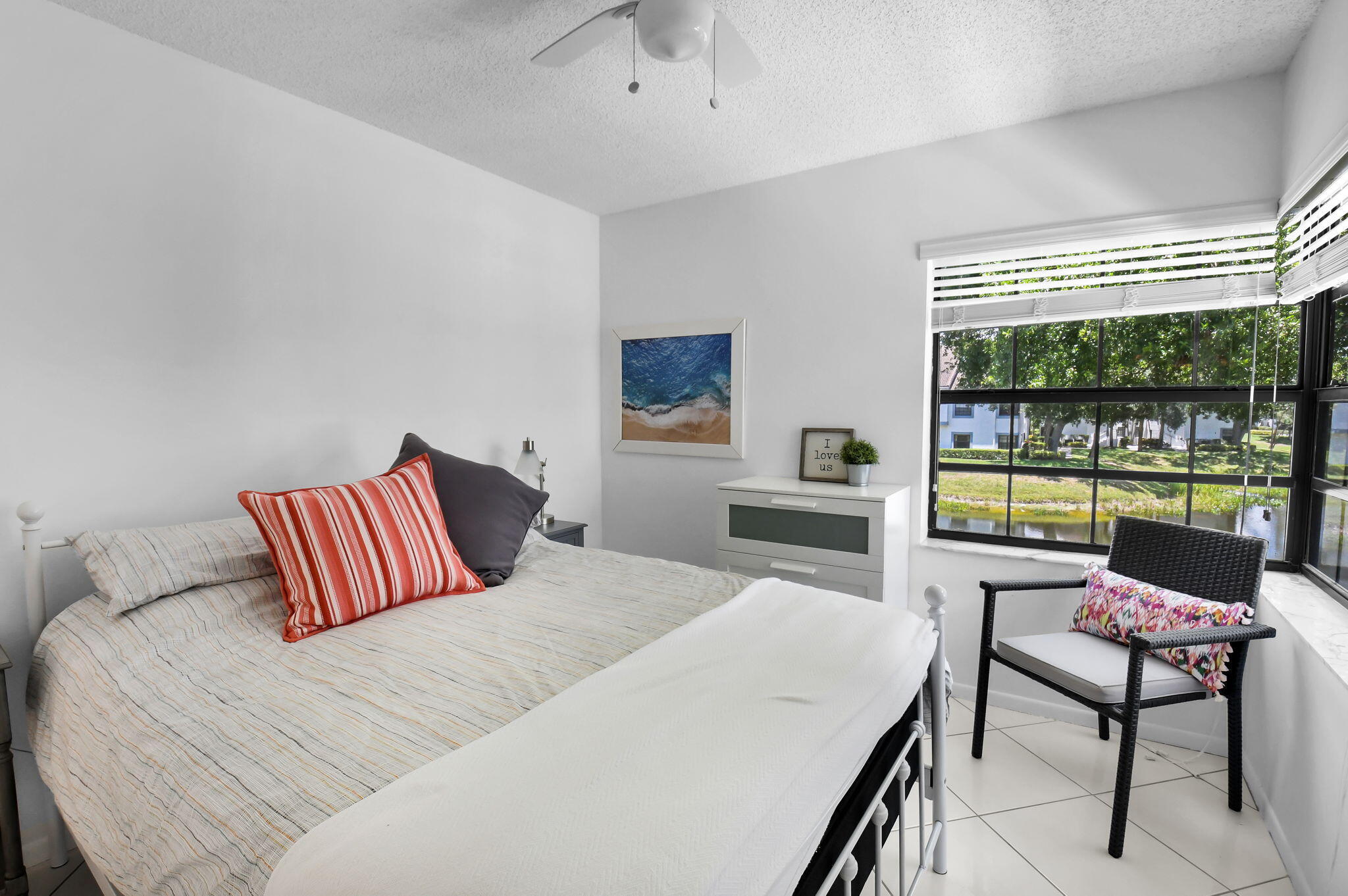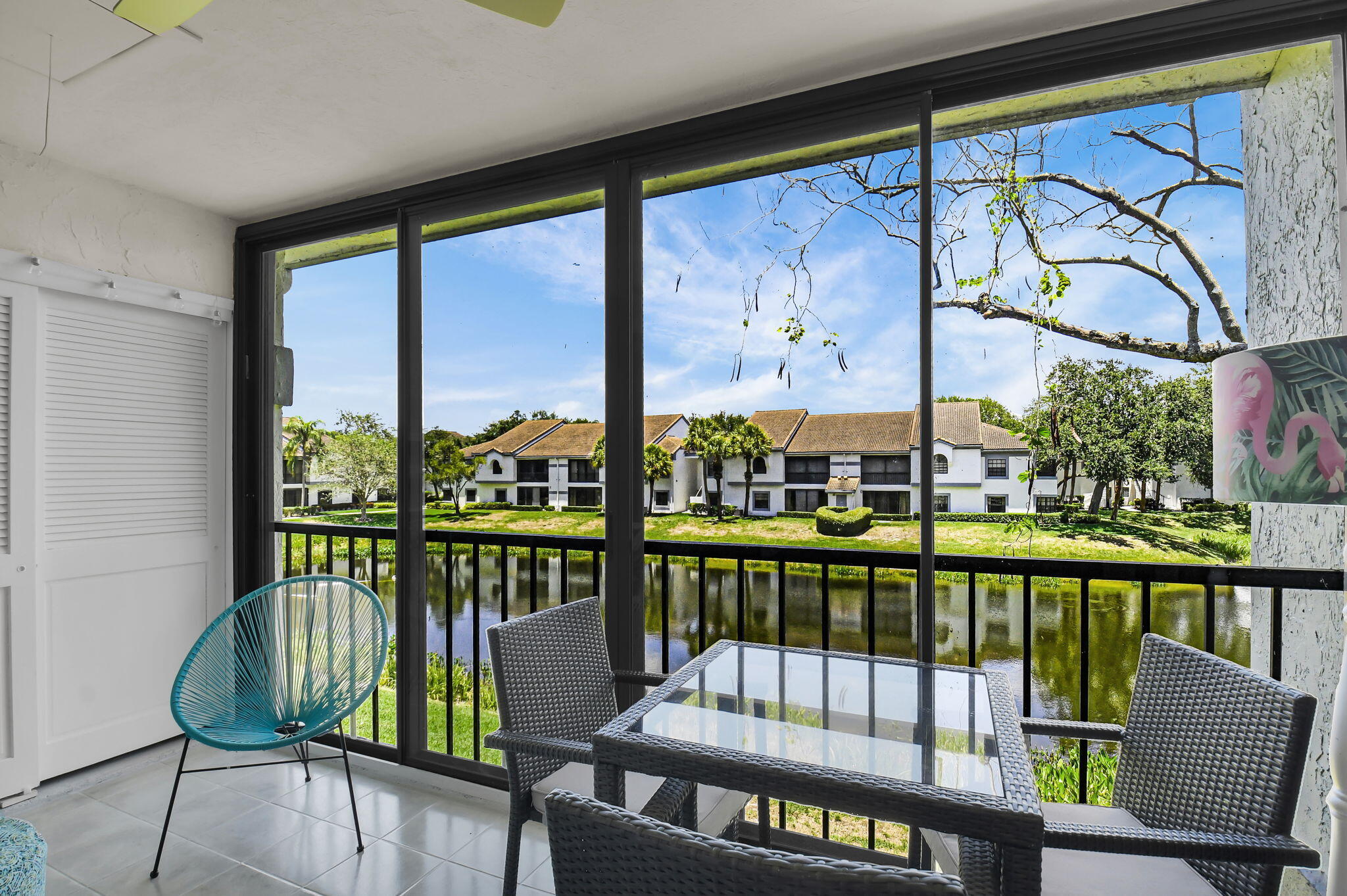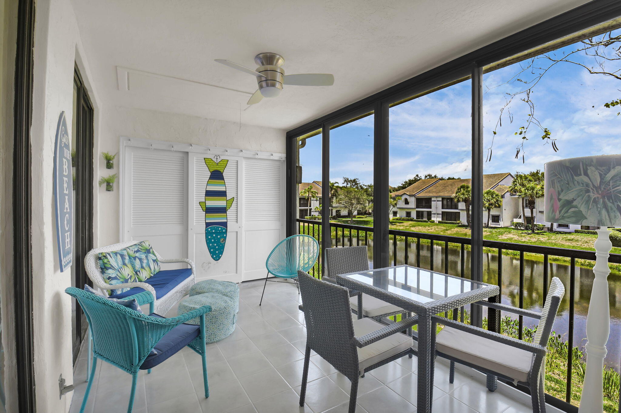 Discover your perfect getaway or forever home with this charming 2nd floor condo that offers picturesque lake views, a cozy beach-inspired ambiance, and turn-key convenience. It's ready for you to move in, fully equipped with tasteful furniture and everything you need for year-round living or a dream vacation retreat. Enjoy the serene beauty of the lake from every window. Whether you're sipping your morning coffee or unwinding after a long day, the tranquil water views bring a sense of peace and relaxation to your everyday life. The entire home is unified with sleek ceramic tile that not only enhances the aesthetic but also provides durability and easy maintenance. The eat-in kitchen boasts granite countertops, stainless-steel appliances, and ample cabinet storage.It's a space where style meets practicality. With three bedrooms, this condo is ideal for accommodating family, guests, or creating a dedicated home office space. The beachy motif throughout the home adds a light and inviting touch to every room. The master bathroom has been thoughtfully updated with granite countertops and a frameless walk-in shower. The updated second bathroom features a new toilet and a modern vanity with granite countertops. The glass and screen-enclosed balcony is an inviting space where you can soak in the lake views year-round, rain or shine. It's perfect for enjoying a good book, dining al fresco, or simply relaxing while surrounded by nature. Don't miss your chance to own this quaint condo in a community that discerning buyers place at the top of their list! Platina offers care-free, resort-style living at its very best! AT&T FIBER OPTIC HIGH SPEED INTERNET is INCLUDED IN THE CONDO FEES along with DIRECT TV, PEST CONTROL, ROOF MAINTENANCE and WATER. All you pay for is electricity! The active 20,000 square foot clubhouse is stunning! Cafe open for breakfast and lunch now offering take-out meals, card rooms, fitness center with stationary bicycles in a solarium overlooking the pool area. Relax in one of the satellite pools or at the enormous free-form main pool and spacious sundeck. Tennis, handball and pickleball courts. There is also an art room with a kiln! With shows, bingo, and an array of clubs, you will not be bored! 24-hour guard gated community. Convenient access to I-95 and the Florida Turnpike. Close to shopping and wonderful restaurants. DON'T FORGET TO VISIT THE CLUBHOUSE.
