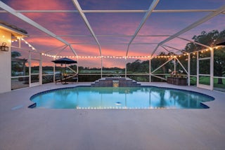 Elegant lakefront estate nestled in a tranquil cul-de-sac, offering sweeping sunset views over a private 20 acre lake. Set on serene .68-acre lot, this residence boasts 4 bedrooms(possible 5), 3 full baths, 2 spacious primary suites w/walkin closets, plus an office/den. The lanai w/pool, spa, outdoor pergola w/builtin grill, firepit creates the ultimate retreat. Features include 2 new AC units,new well, newer appliances, LED lighting, updated kitchen w/granite, reverse osmosis,fresh interior paint, outside painted 2021, circular driveway, 3 car garage, complete hurricane protection to add peace of mind, fruit trees and garden.The Cape Club golf membership is avalable not mandatory. 24/7 guardgated community w/low HOA. Experience unapparelled privacy, elegance, lakeside living at its finest