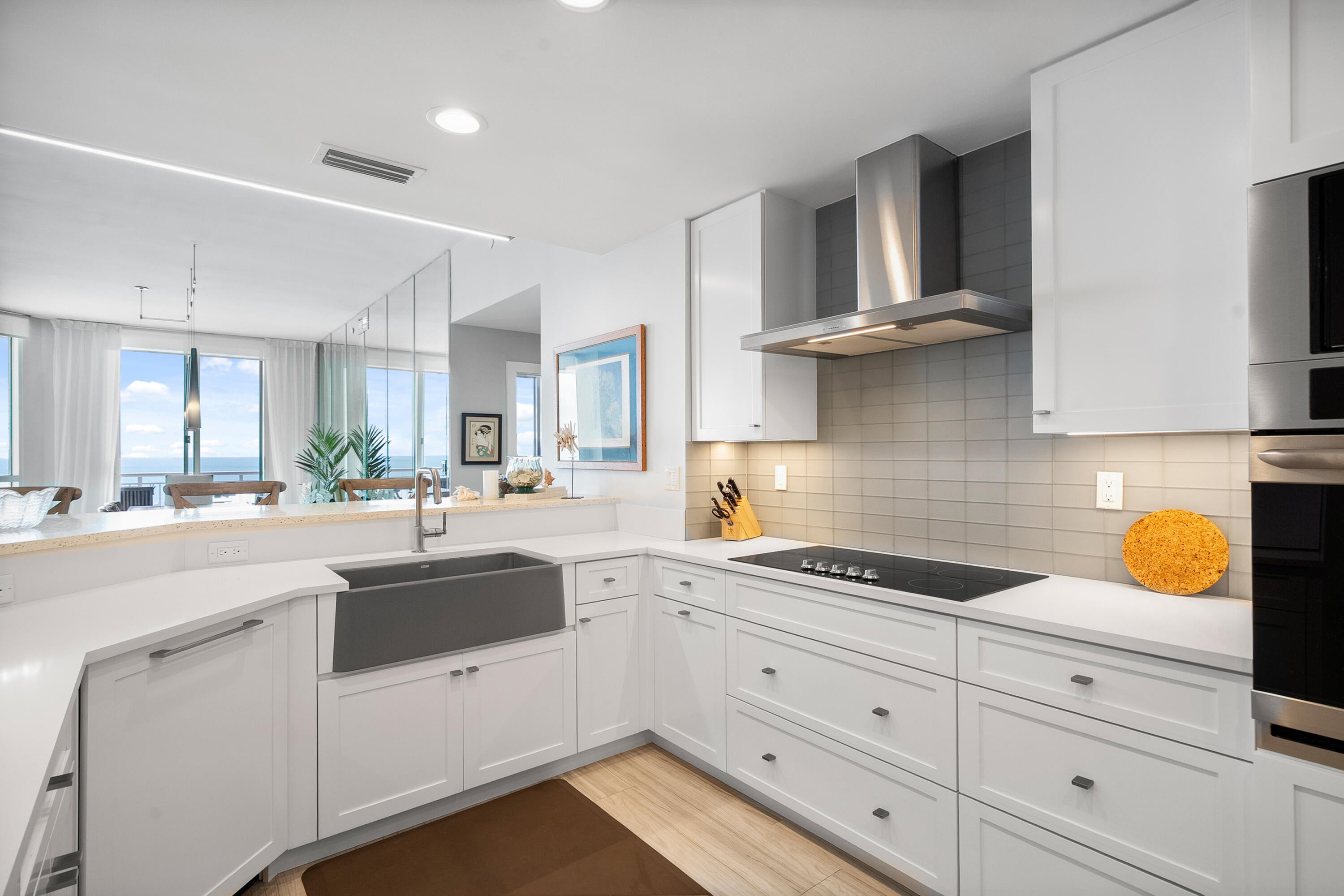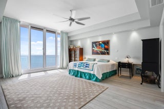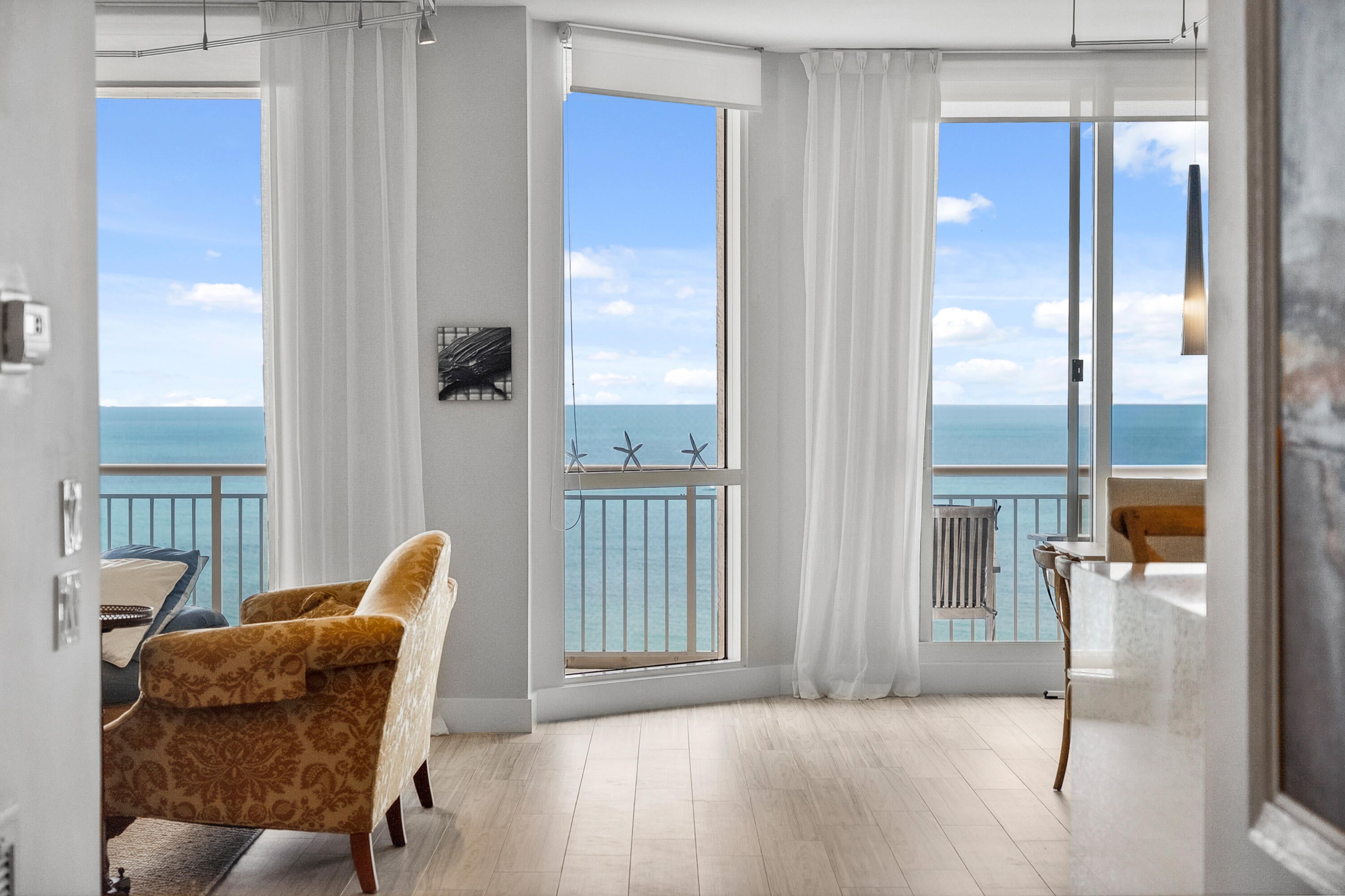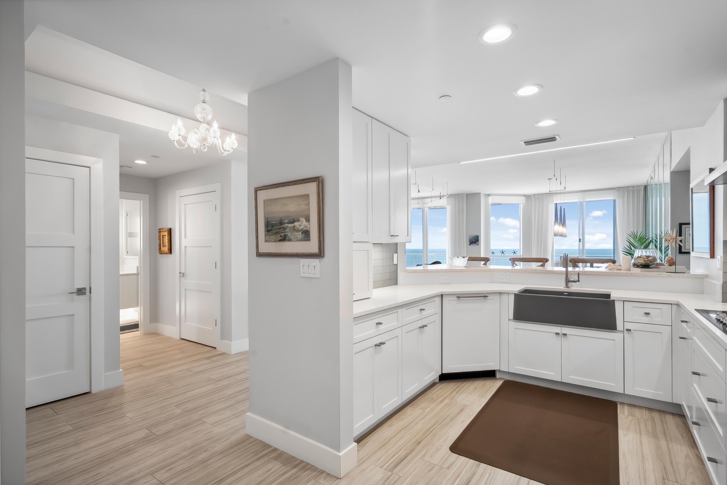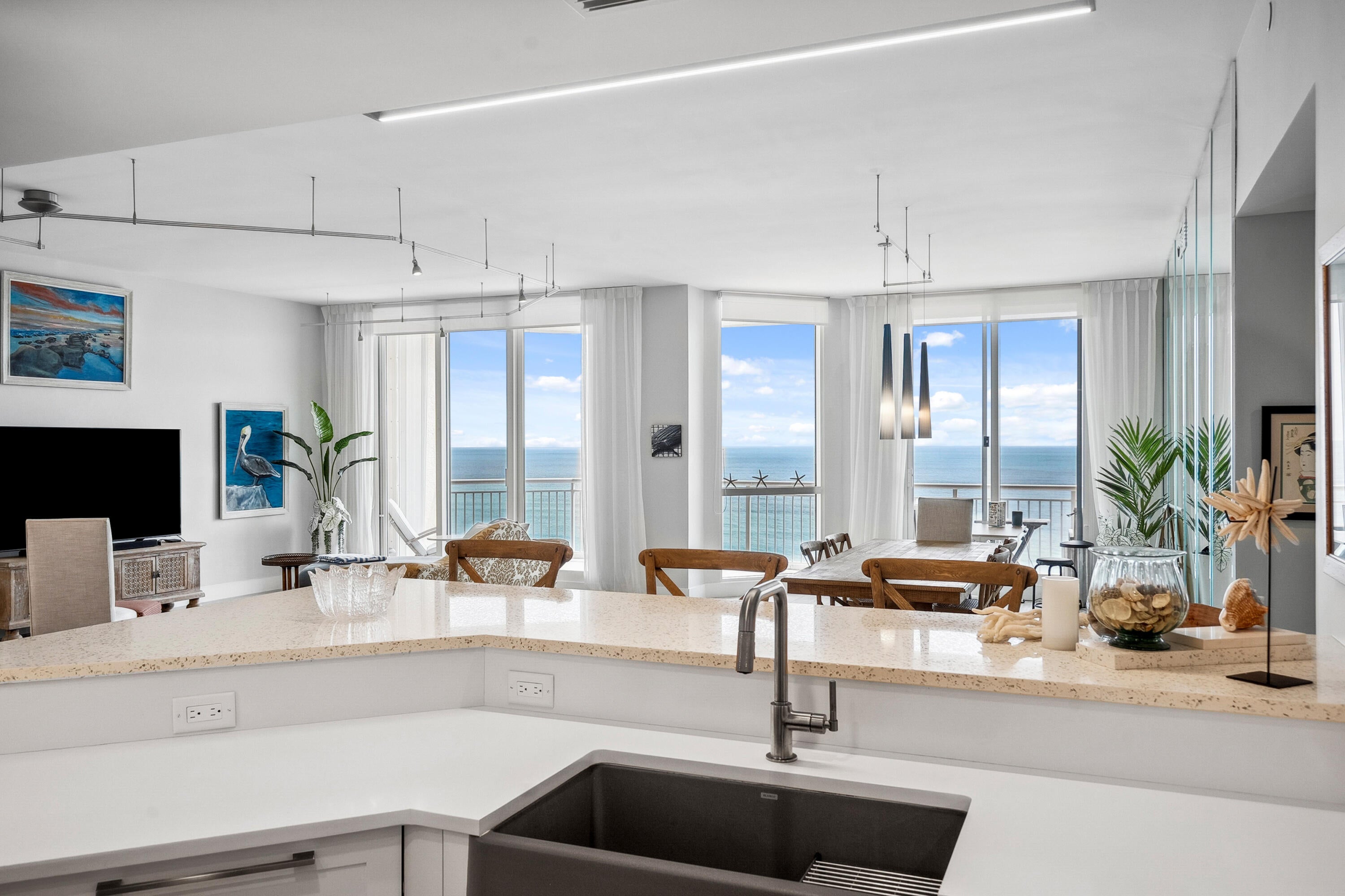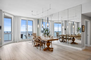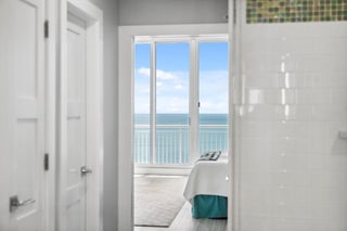 Welcome to an exceptional Penthouse Residence offering refined coastal luxury. This beautifully reimagined 3-bedroom, 3-bath 12th-floor Penthouse showcases sweeping ocean views and elegant finishes throughout. Sophisticated plank-style ceramic tile flooring creates a seamless, upscale feel. The custom kitchen features quartz countertops, bespoke cabinetry, and premium stainless-steel appliances. The living area is enhanced by a sleek built-in wall unit with ample storage. The spacious primary suite offers serene ocean views, two walk-in closets, and a spa-inspired bath with a jacuzzi tub. The second bedroom includes a private en suite bath, while the third bedroom or office features a convenient Murphy bed. Enjoy the rare private garage and resort-style amenities including an oceanfrontpool, tennis court, grilling area, gym, and clubroom. Centralized hot water, high-speed internet, and cable are included in the HOA.