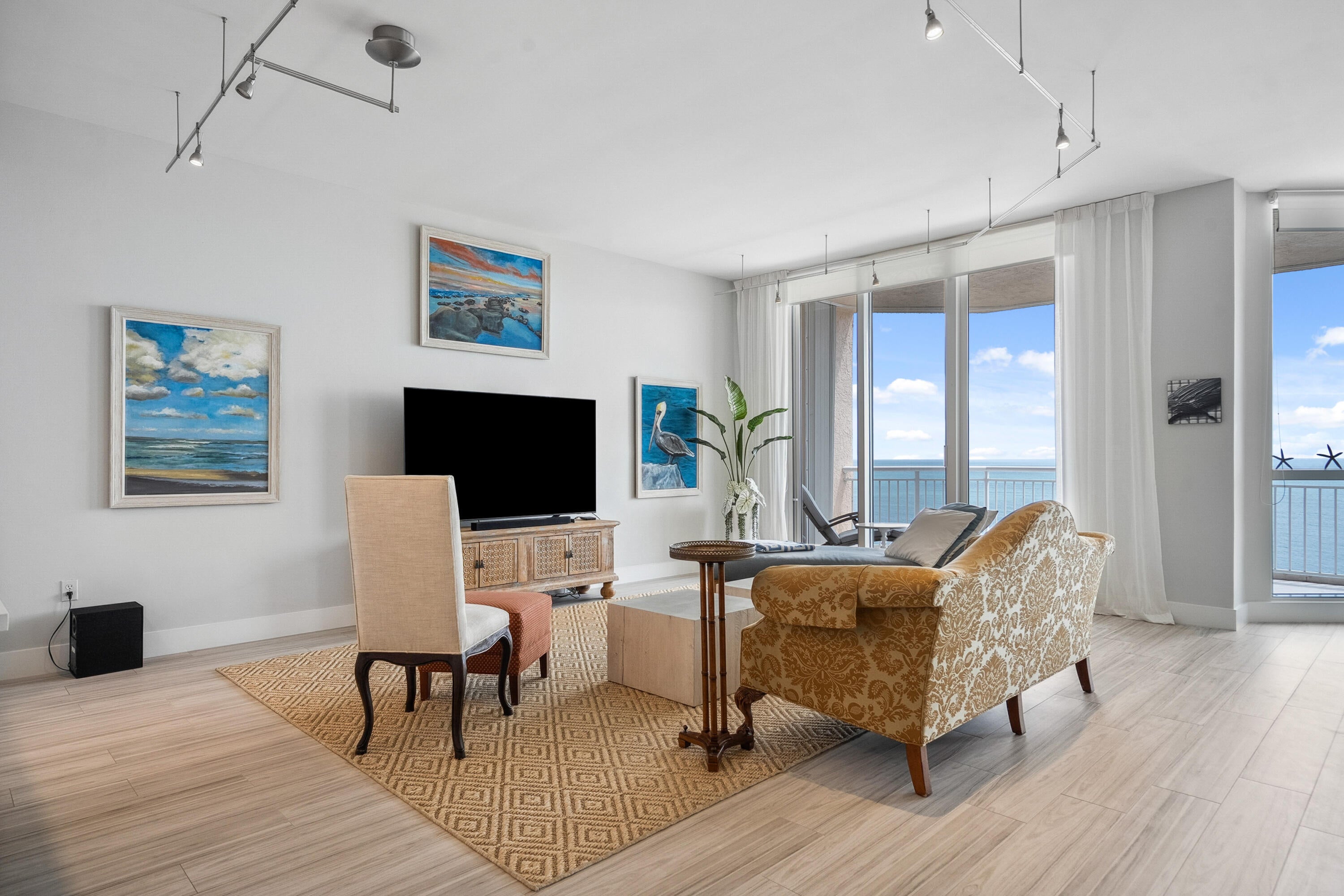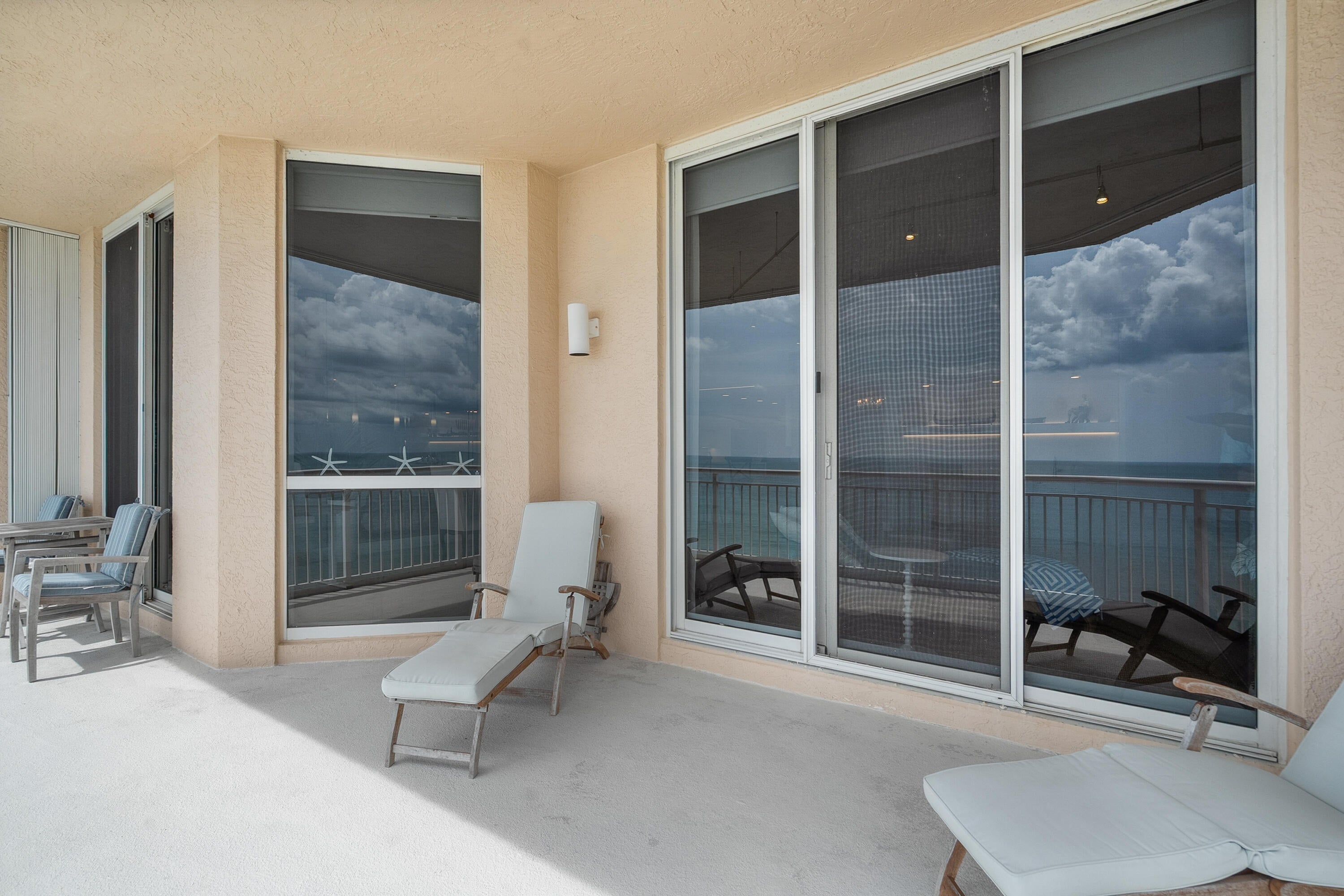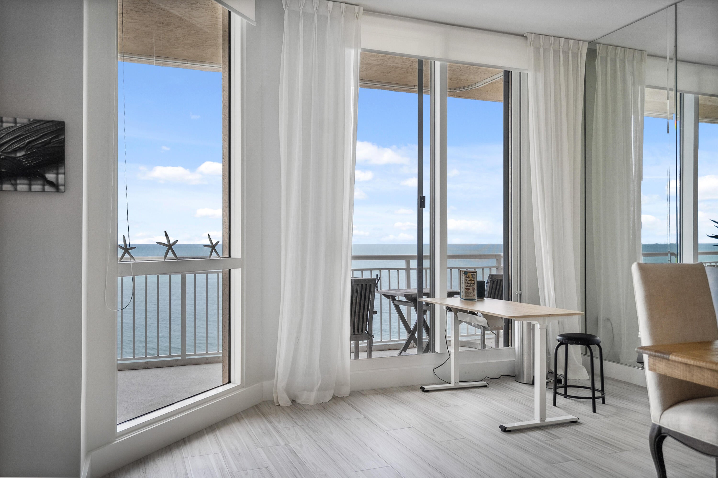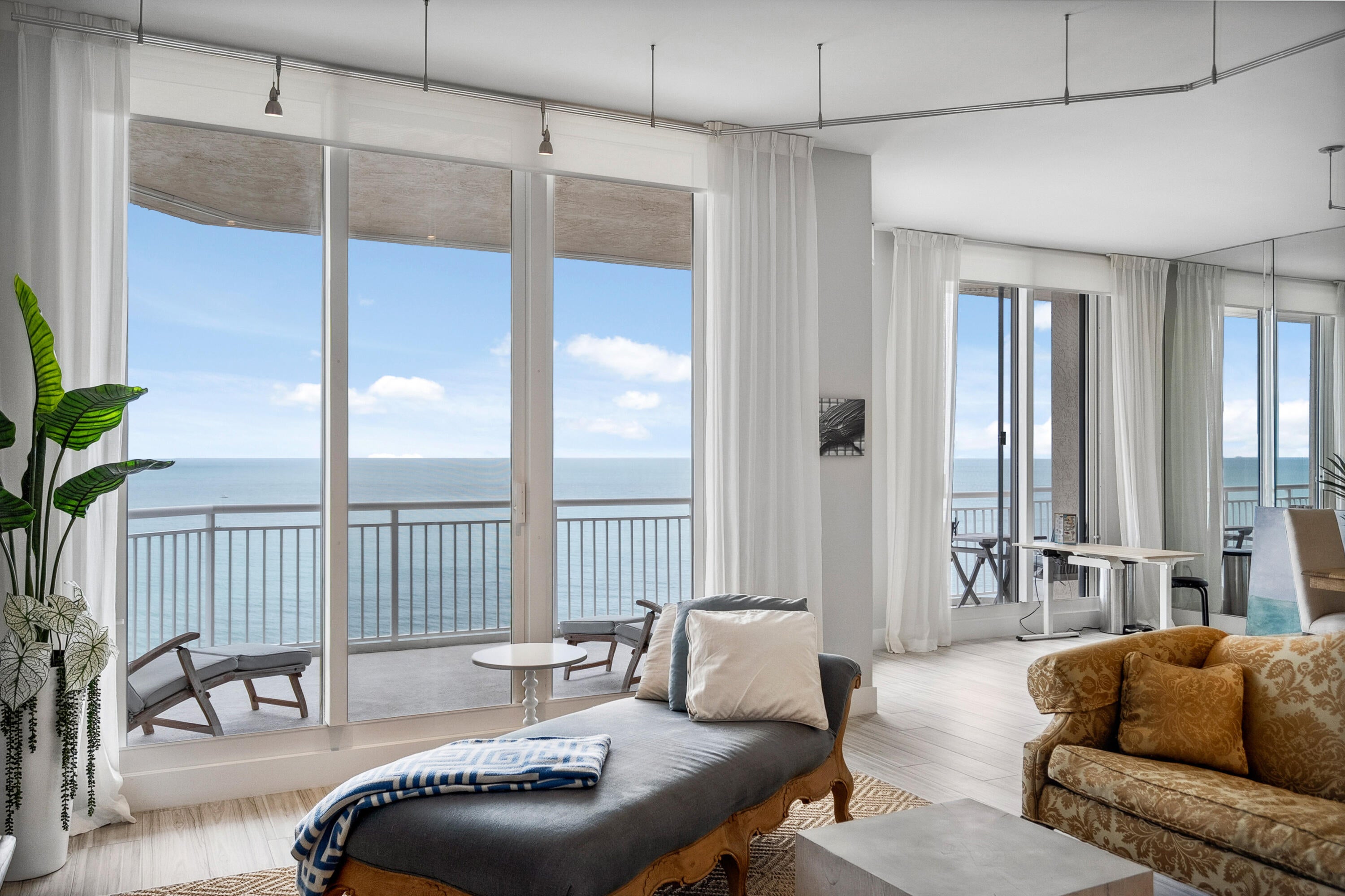 Welcome to an exceptional Penthouse Residence offering refined coastal luxury. This beautifully reimagined 3-bedroom, 3-bath 12th-floor Penthouse showcases sweeping ocean views and elegant finishes throughout. Sophisticated plank-style ceramic tile flooring creates a seamless, upscale feel. The custom kitchen features quartz countertops, bespoke cabinetry, and premium stainless-steel appliances. The living area is enhanced by a sleek built-in wall unit with ample storage. The spacious primary suite offers serene ocean views, two walk-in closets, and a spa-inspired bath with a jacuzzi tub. The second bedroom includes a private en suite bath, while the third bedroom or office features a convenient Murphy bed. Enjoy the rare private garage and resort-style amenities including an oceanfrontpool, tennis court, grilling area, gym, and clubroom. Centralized hot water, high-speed internet, and cable are included in the HOA.