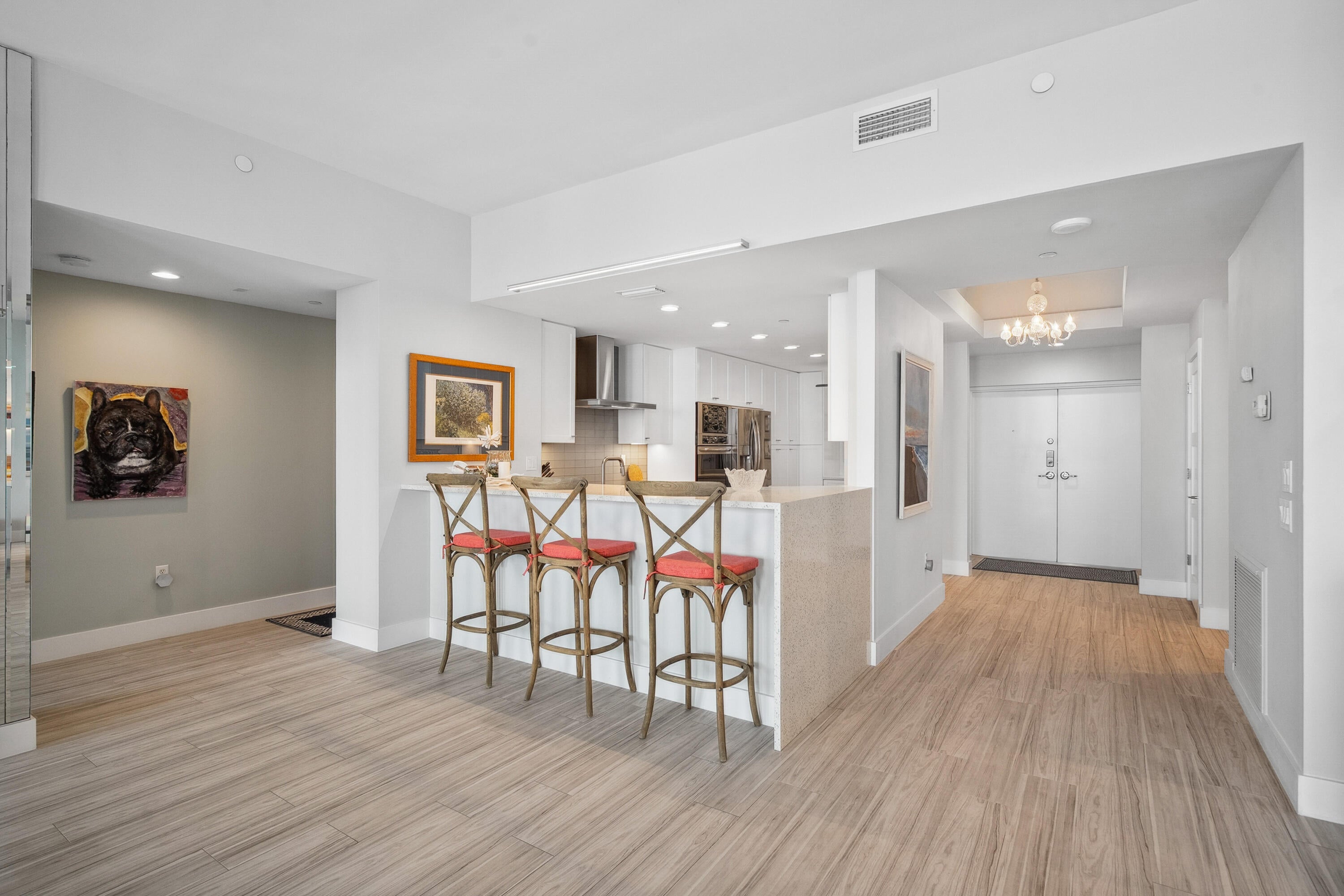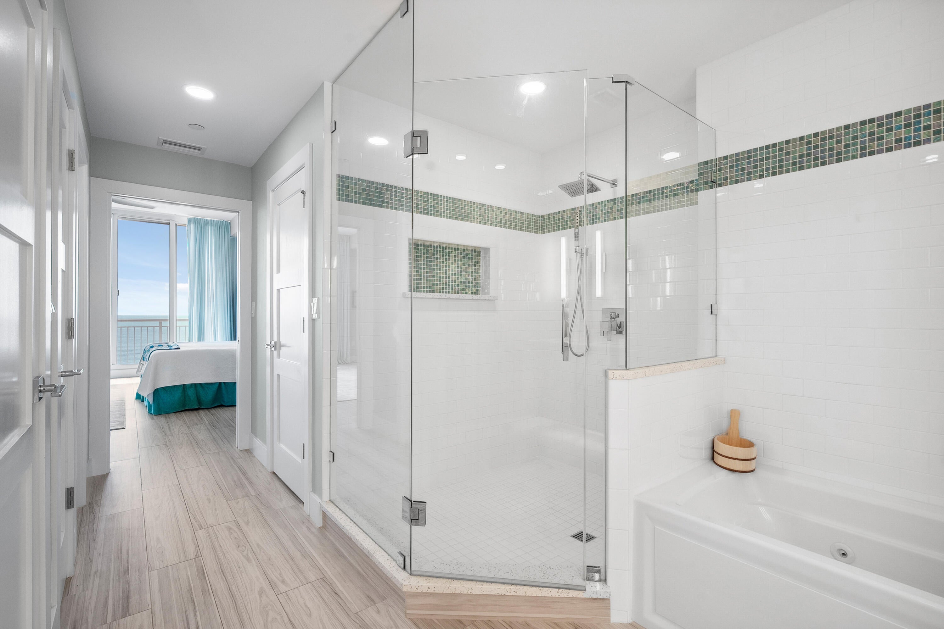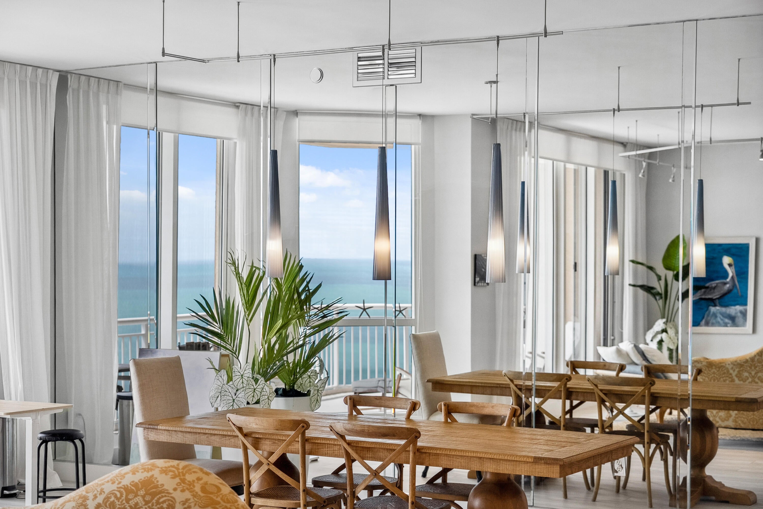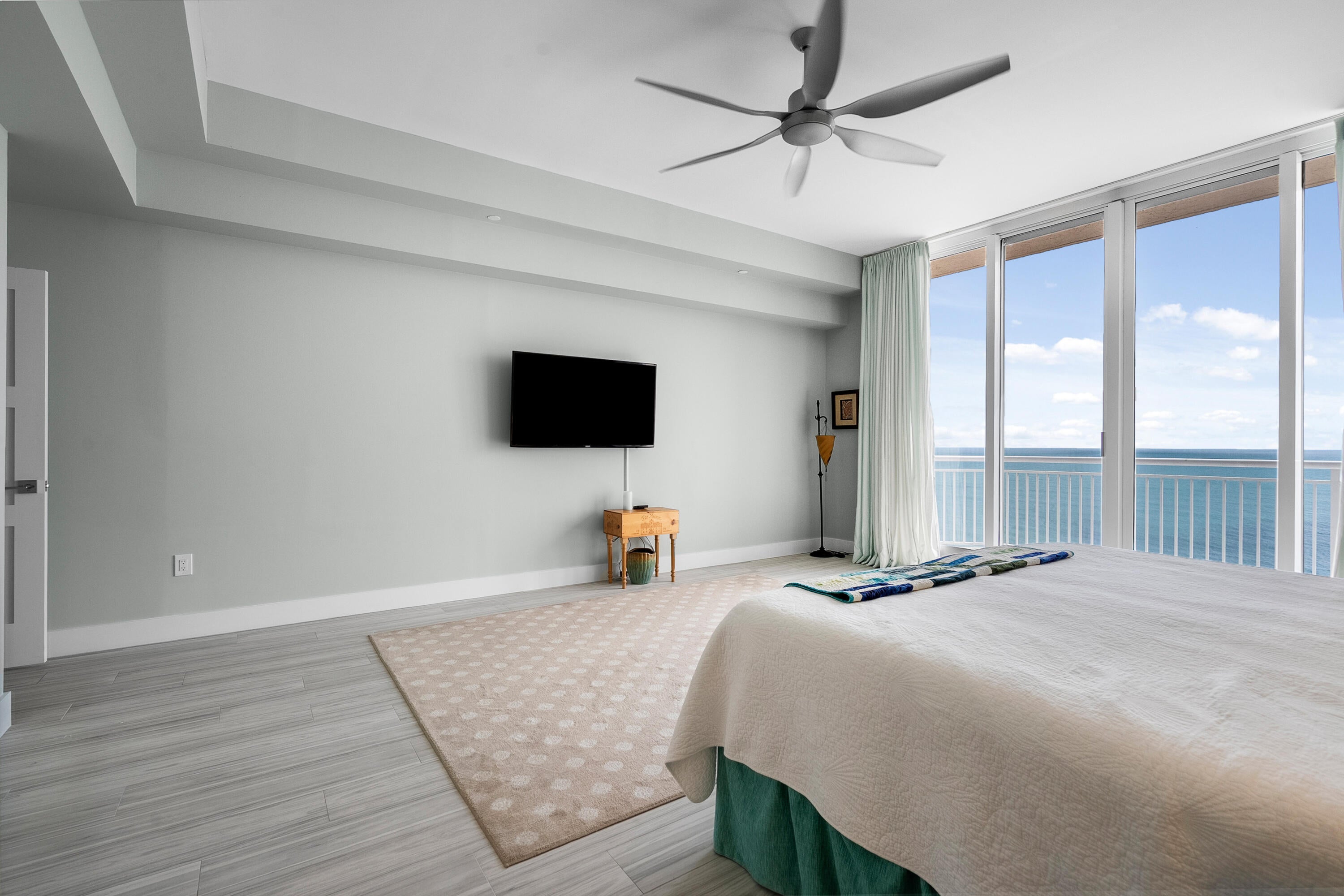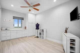 Welcome to an exceptional Penthouse Residence offering refined coastal luxury. This beautifully reimagined 3-bedroom, 3-bath 12th-floor Penthouse showcases sweeping ocean views and elegant finishes throughout. Sophisticated plank-style ceramic tile flooring creates a seamless, upscale feel. The custom kitchen features quartz countertops, bespoke cabinetry, and premium stainless-steel appliances. The living area is enhanced by a sleek built-in wall unit with ample storage. The spacious primary suite offers serene ocean views, two walk-in closets, and a spa-inspired bath with a jacuzzi tub. The second bedroom includes a private en suite bath, while the third bedroom or office features a convenient Murphy bed. Enjoy the rare private garage and resort-style amenities including an oceanfrontpool, tennis court, grilling area, gym, and clubroom. Centralized hot water, high-speed internet, and cable are included in the HOA.