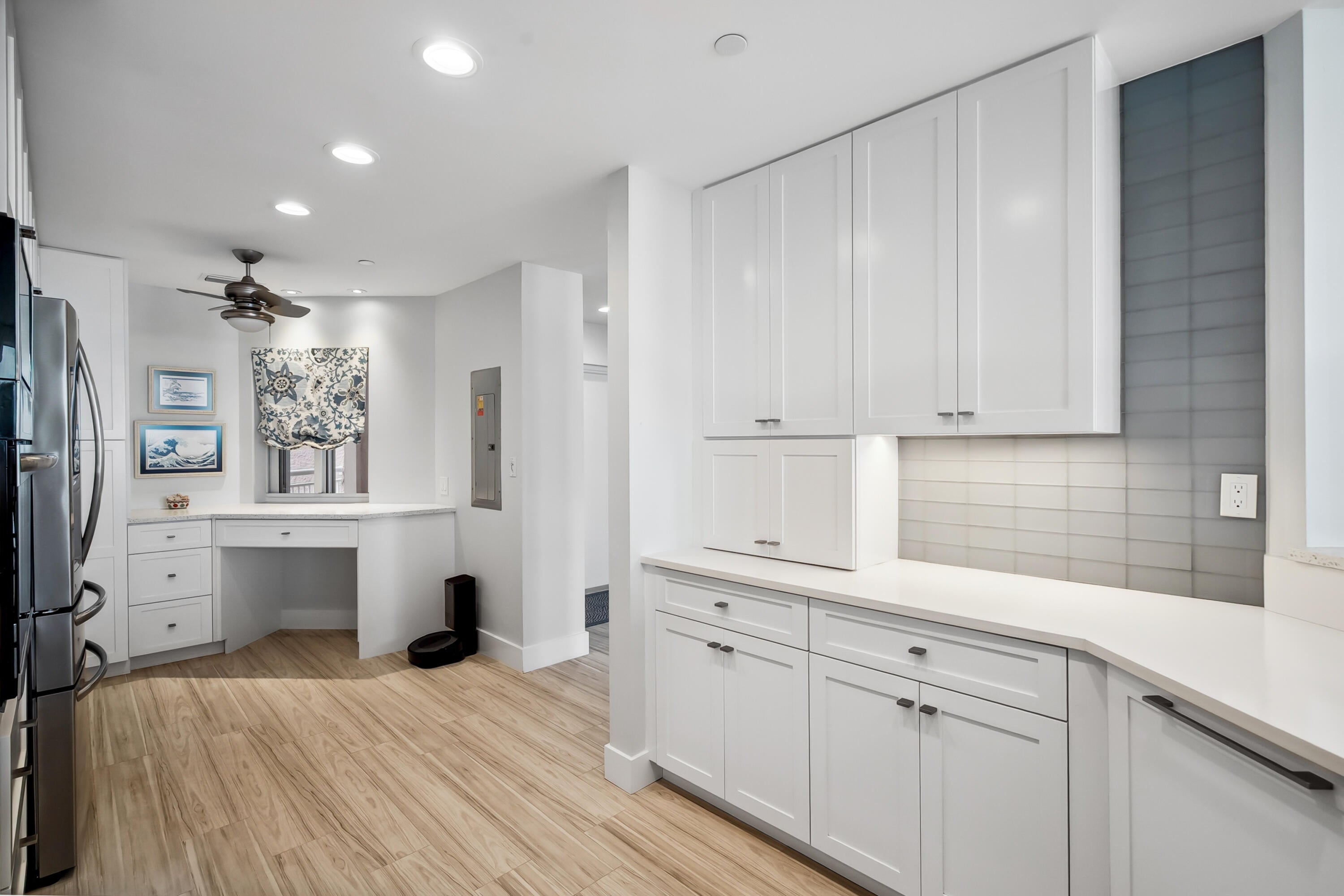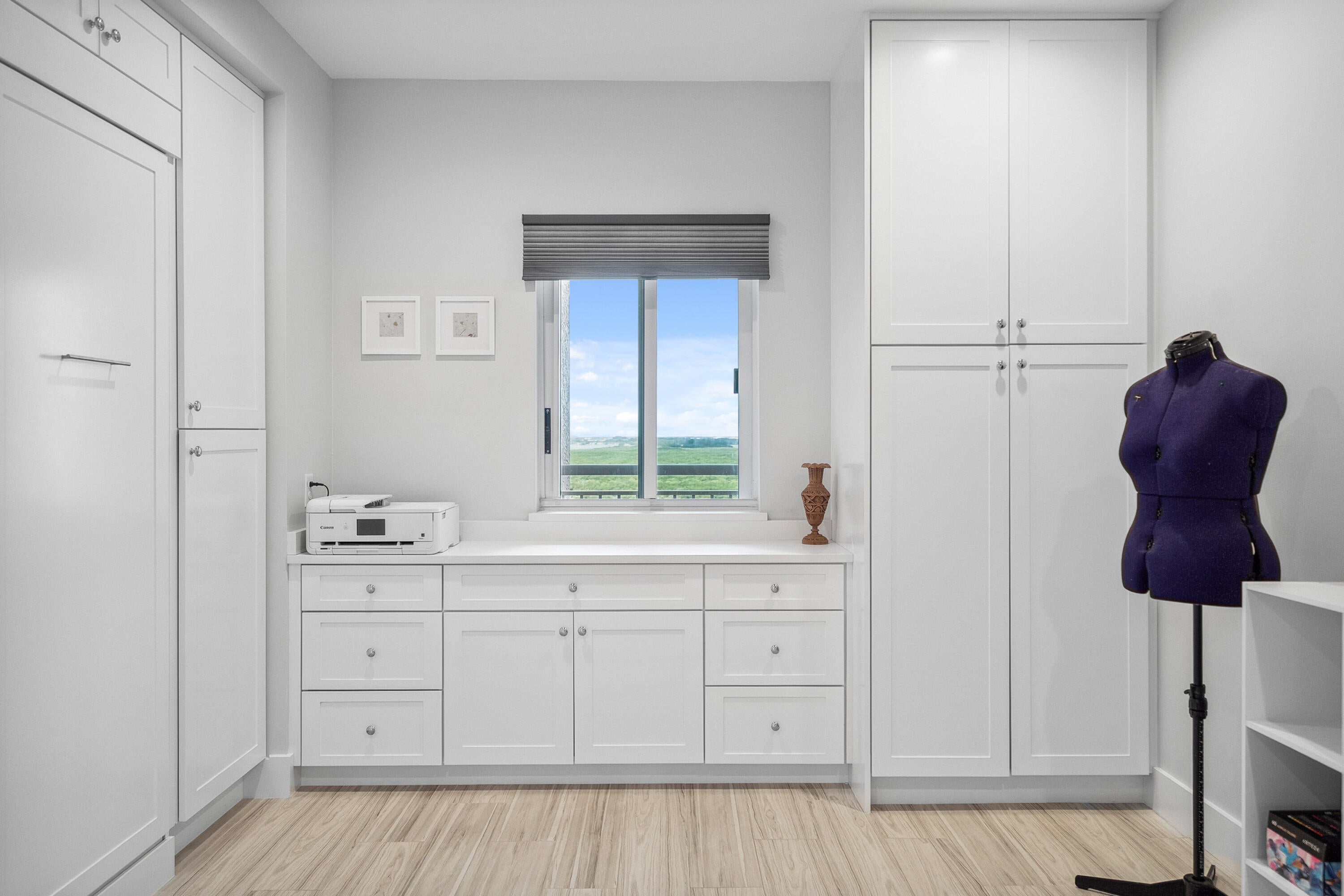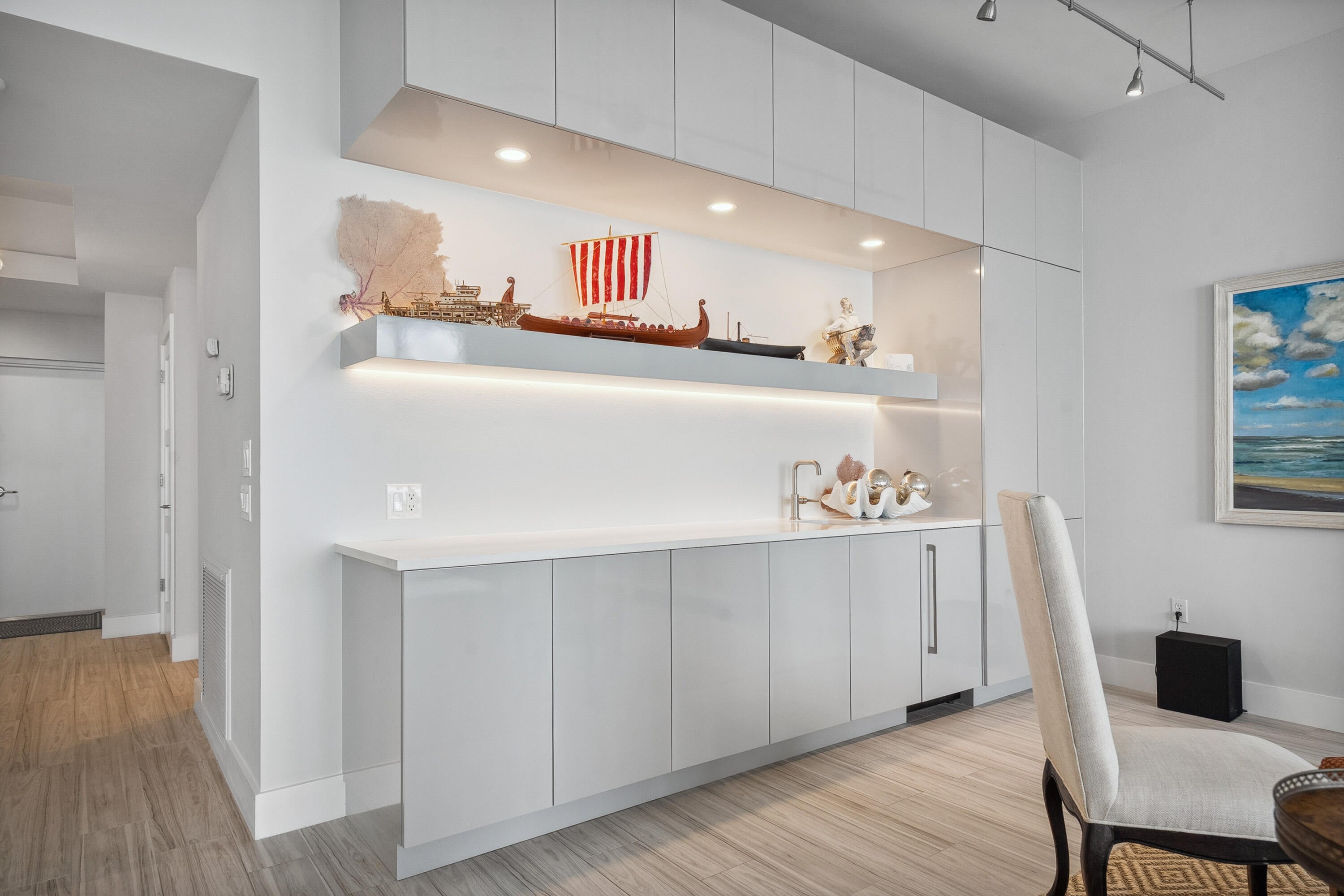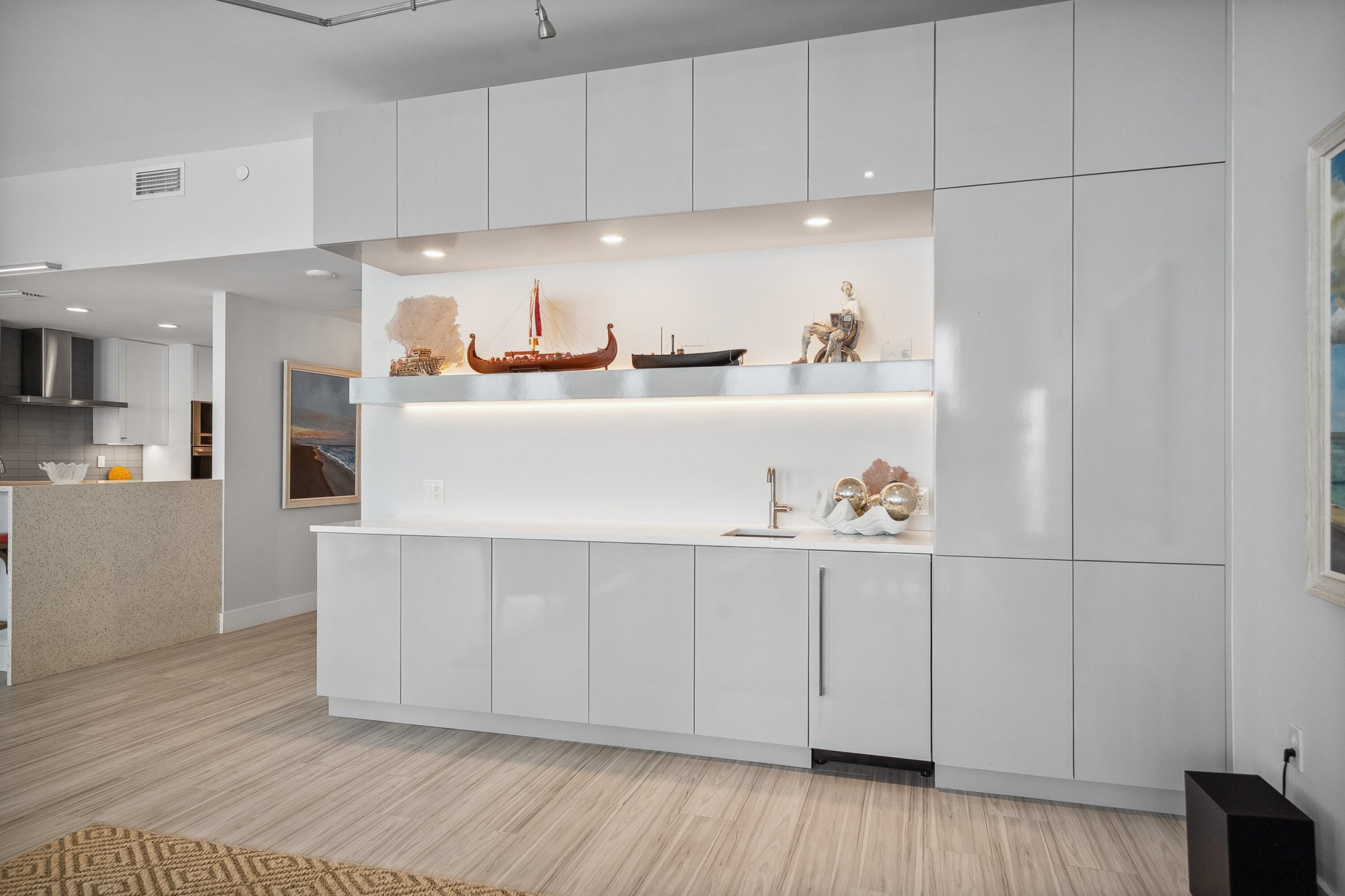 Welcome to an exceptional Penthouse Residence offering refined coastal luxury. This beautifully reimagined 3-bedroom, 3-bath 12th-floor Penthouse showcases sweeping ocean views and elegant finishes throughout. Sophisticated plank-style ceramic tile flooring creates a seamless, upscale feel. The custom kitchen features quartz countertops, bespoke cabinetry, and premium stainless-steel appliances. The living area is enhanced by a sleek built-in wall unit with ample storage. The spacious primary suite offers serene ocean views, two walk-in closets, and a spa-inspired bath with a jacuzzi tub. The second bedroom includes a private en suite bath, while the third bedroom or office features a convenient Murphy bed. Enjoy the rare private garage and resort-style amenities including an oceanfrontpool, tennis court, grilling area, gym, and clubroom. Centralized hot water, high-speed internet, and cable are included in the HOA.