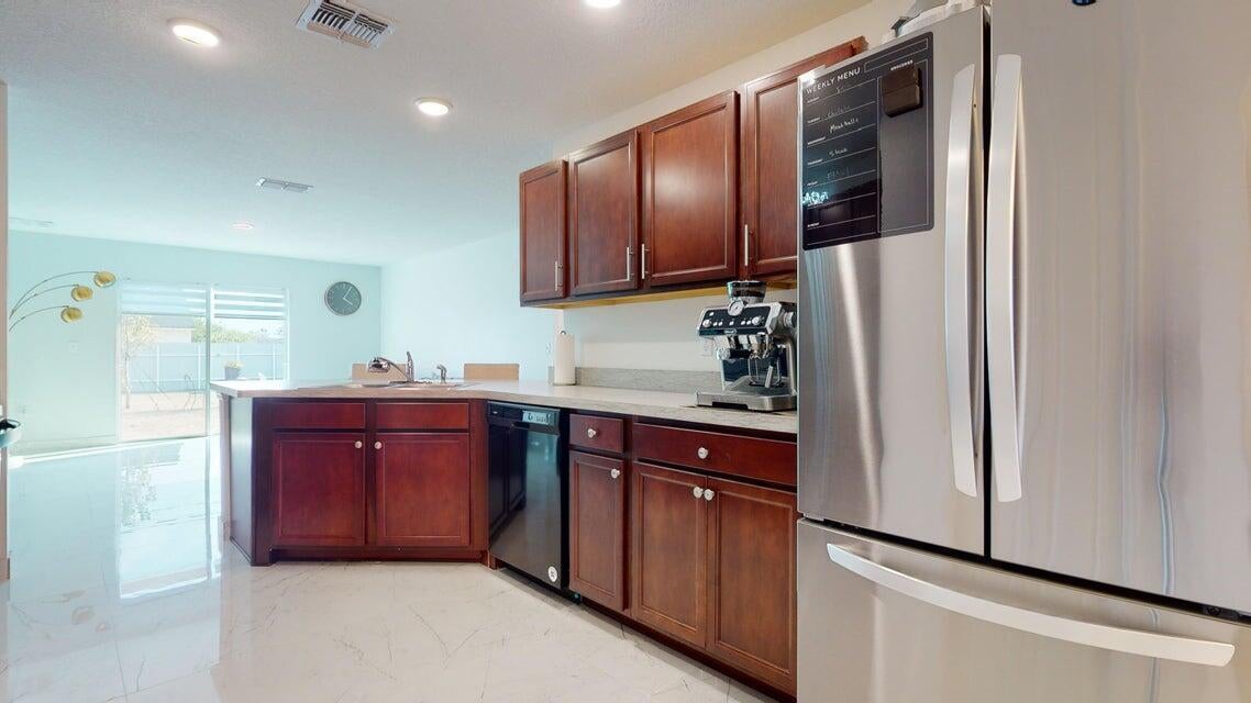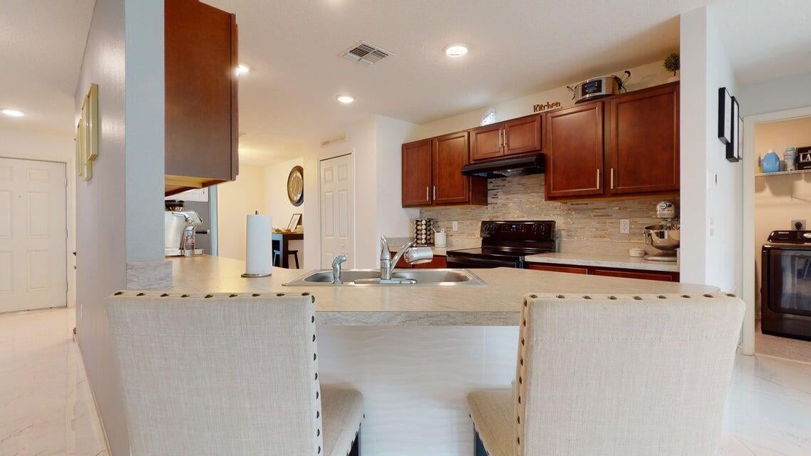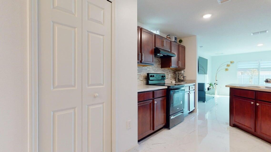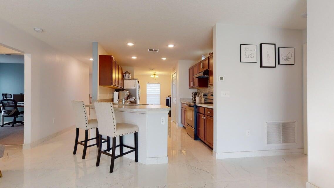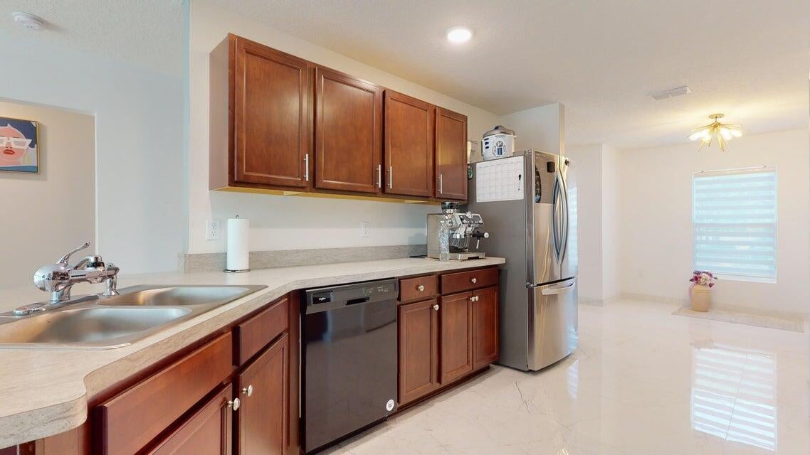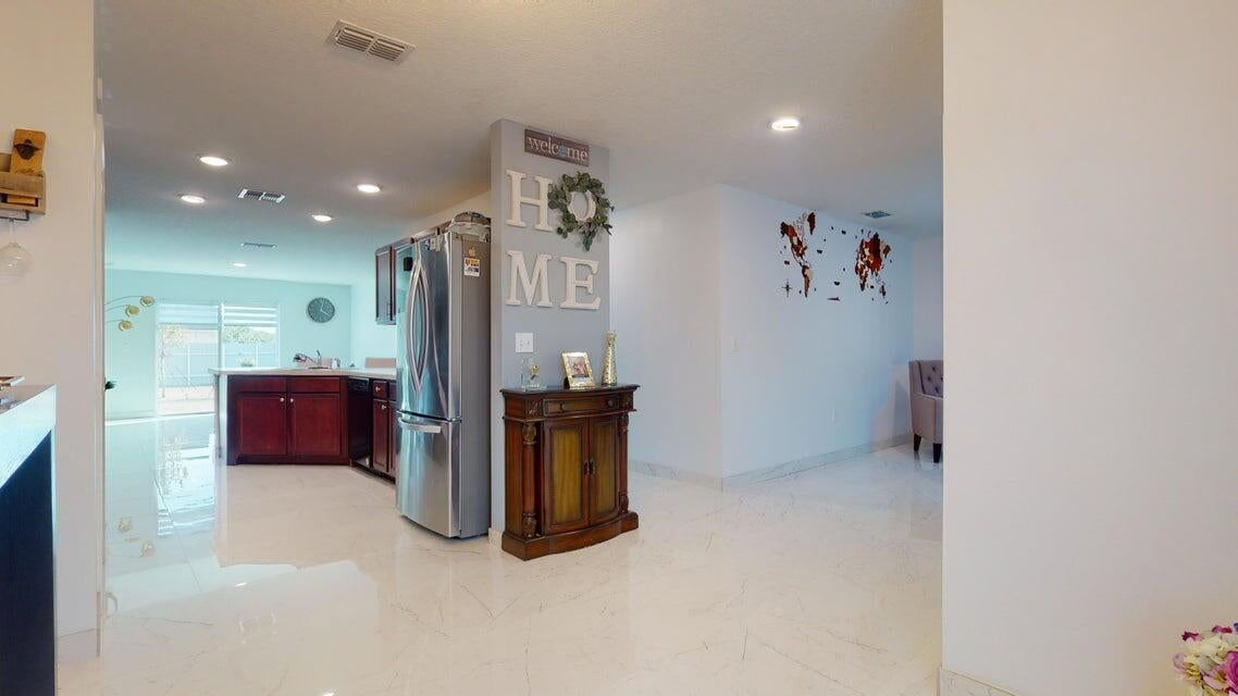 Tranquil Living Just Minutes from Tradition!Welcome to this beautifully upgraded home featuring elegant gold accents and premium flooring imported from Spain. Enjoy a water view from the spacious living room, perfect for relaxing or entertaining guests.The formal dining area flows seamlessly into a large, open kitchen equipped with stainless steel appliances, ample counter space, and a walk-in pantry. The desirable split floor plan offers privacy, with the master suite featuring a double vanity, walk-in closet, and spa-like finishes.Two additional bedrooms are located on the opposite side of the home, both overlooking the fully fenced backyard with lush greenery--ideal for outdoor living, play, or peaceful sunset views.Located in a quiet neighborhood. Minutes from shopping.