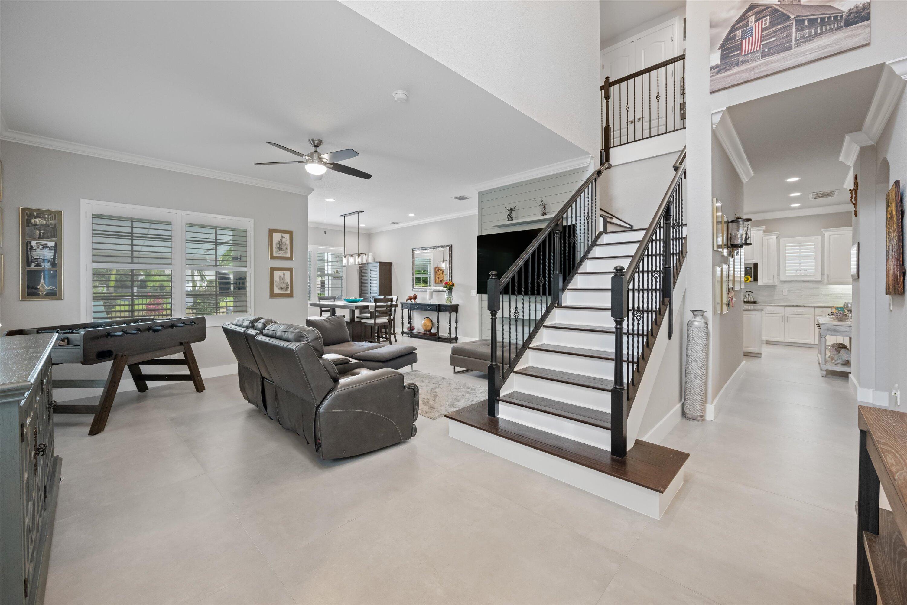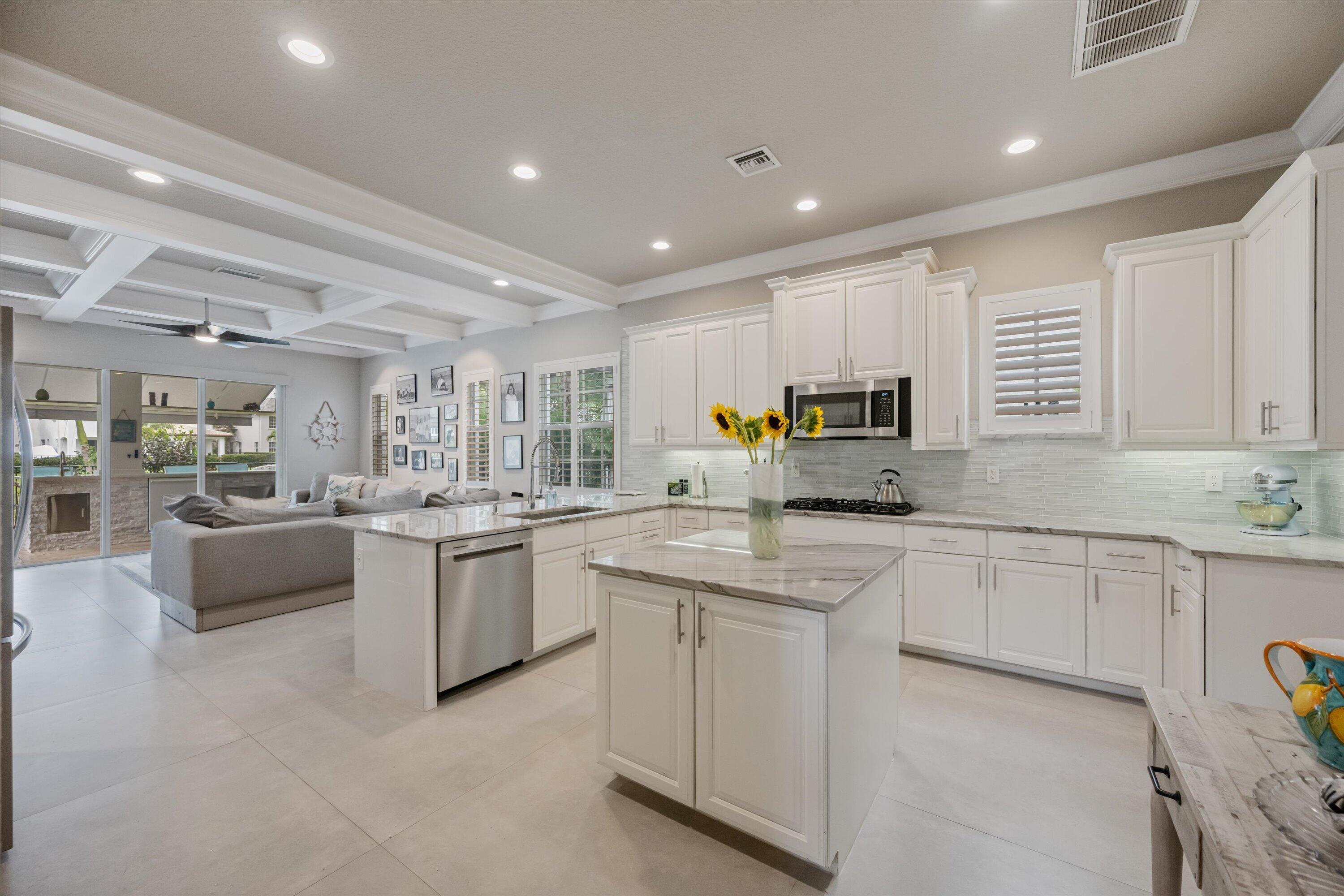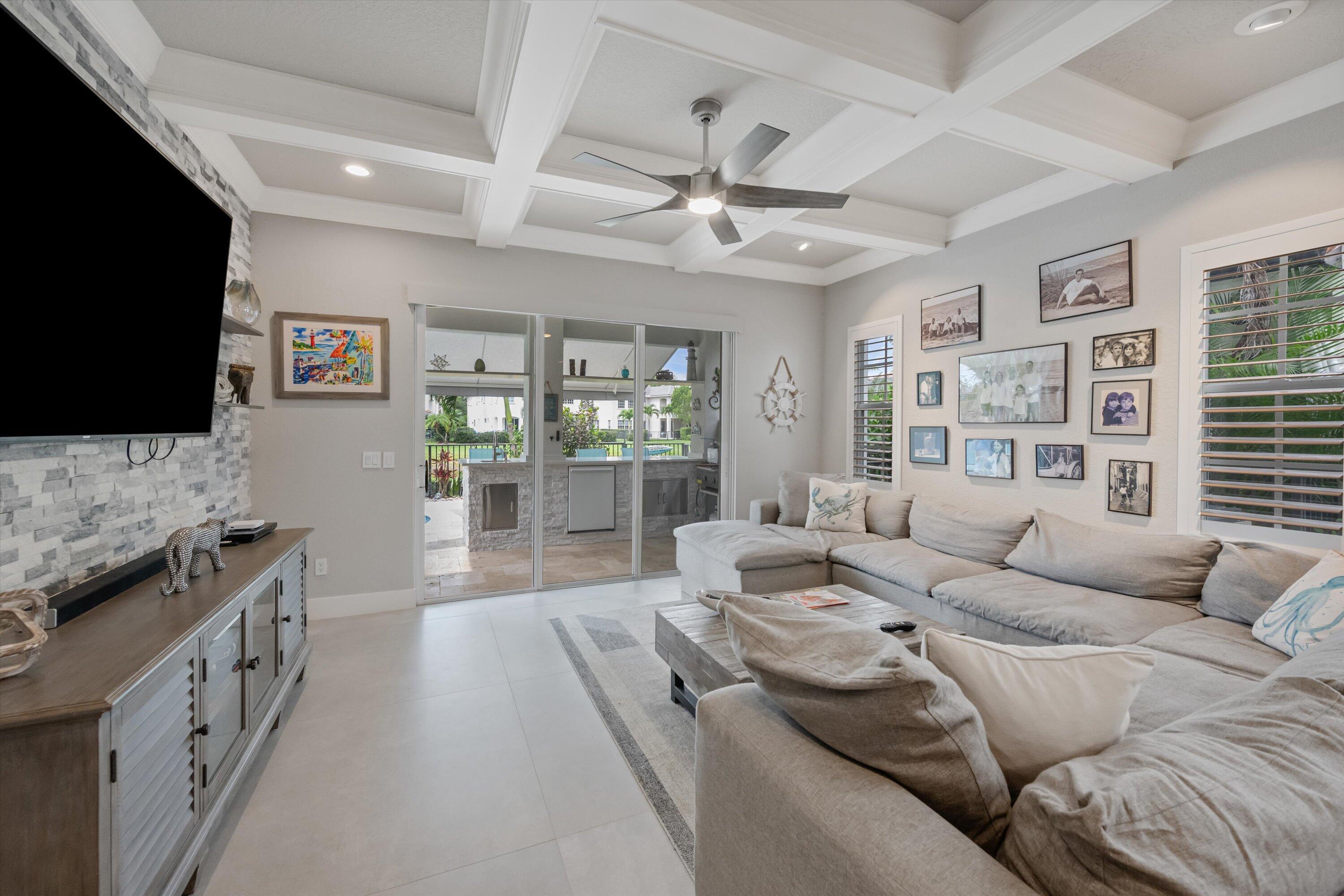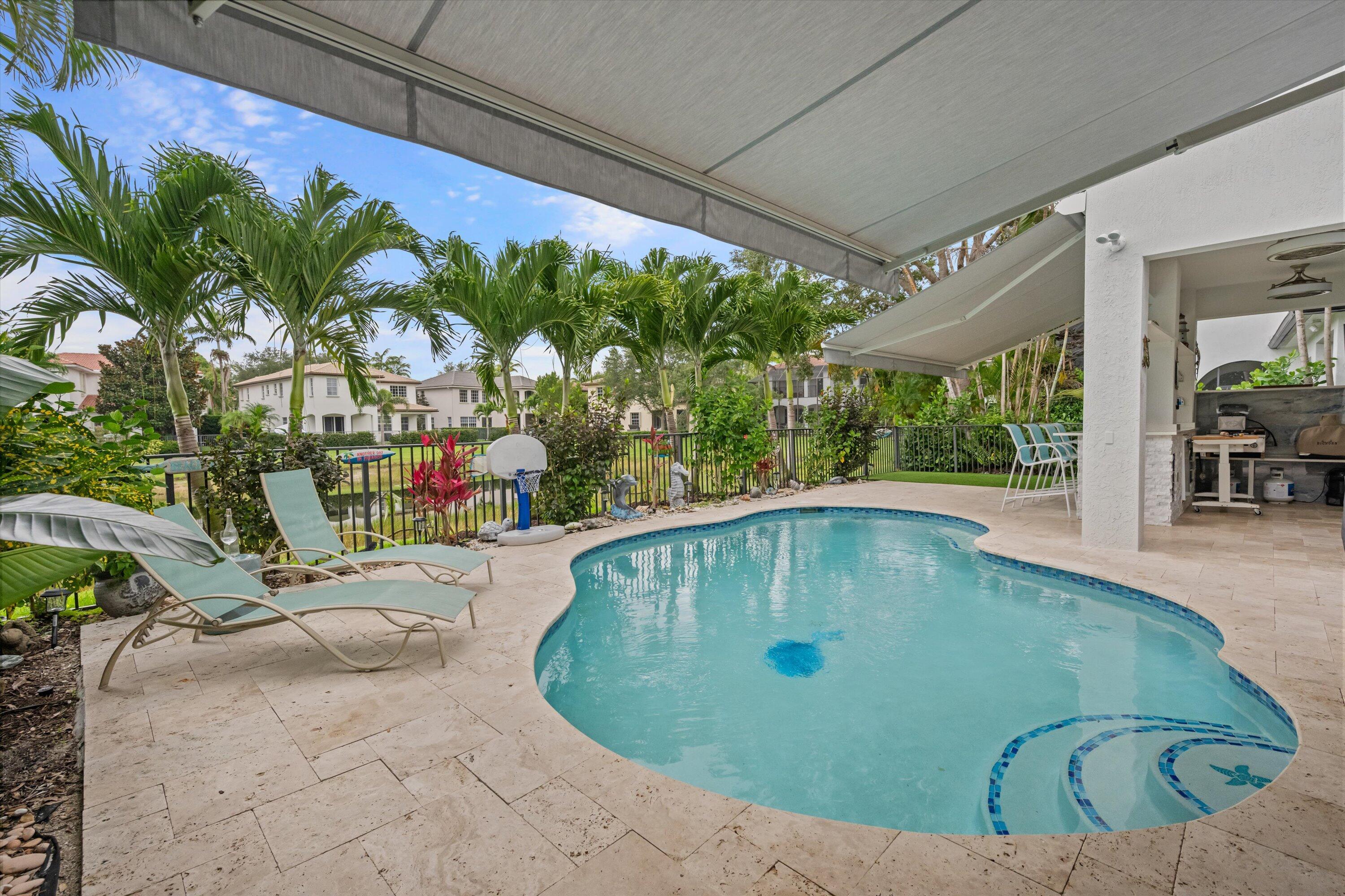 GORGEOUS, RENOVATED 4 bedroom plus den, 4 bathroom home in resort- style Evergrene Community. This home boasts new porcelain tile flooring down stairs and newer wood flooring upstairs, updated kitchen with quartz counter tops ,all new bathrooms and plantation shutters. Enjoy entertaining your friends and family with a beautiful summer kitchen and saltwater pool with heater and chiller overlooking the lake. The back yard is fenced and has artificial turf. The community offers an infinity pool, Tiki bar, splash park, gym, weight room, basketball and pickle ball courts, manned gates, security and much more !!!!Take a short stroll to Lake Dorothy and enjoy the sights of this beautiful Audubon Signature Society. Minutes from Juno Beach, PBI airport, the Gardens Mall, Tanger Outlets, I 95The family room has custom coffered ceilings and stone accent wall. The living room has a wooden accent wall. The kitchen has 2 ovens a wine frig and soft close cabinets. The garage has custom shelving on walls and ceiling.