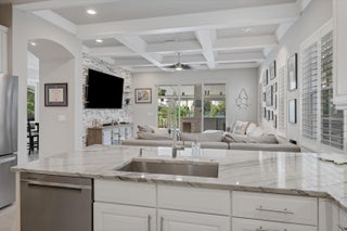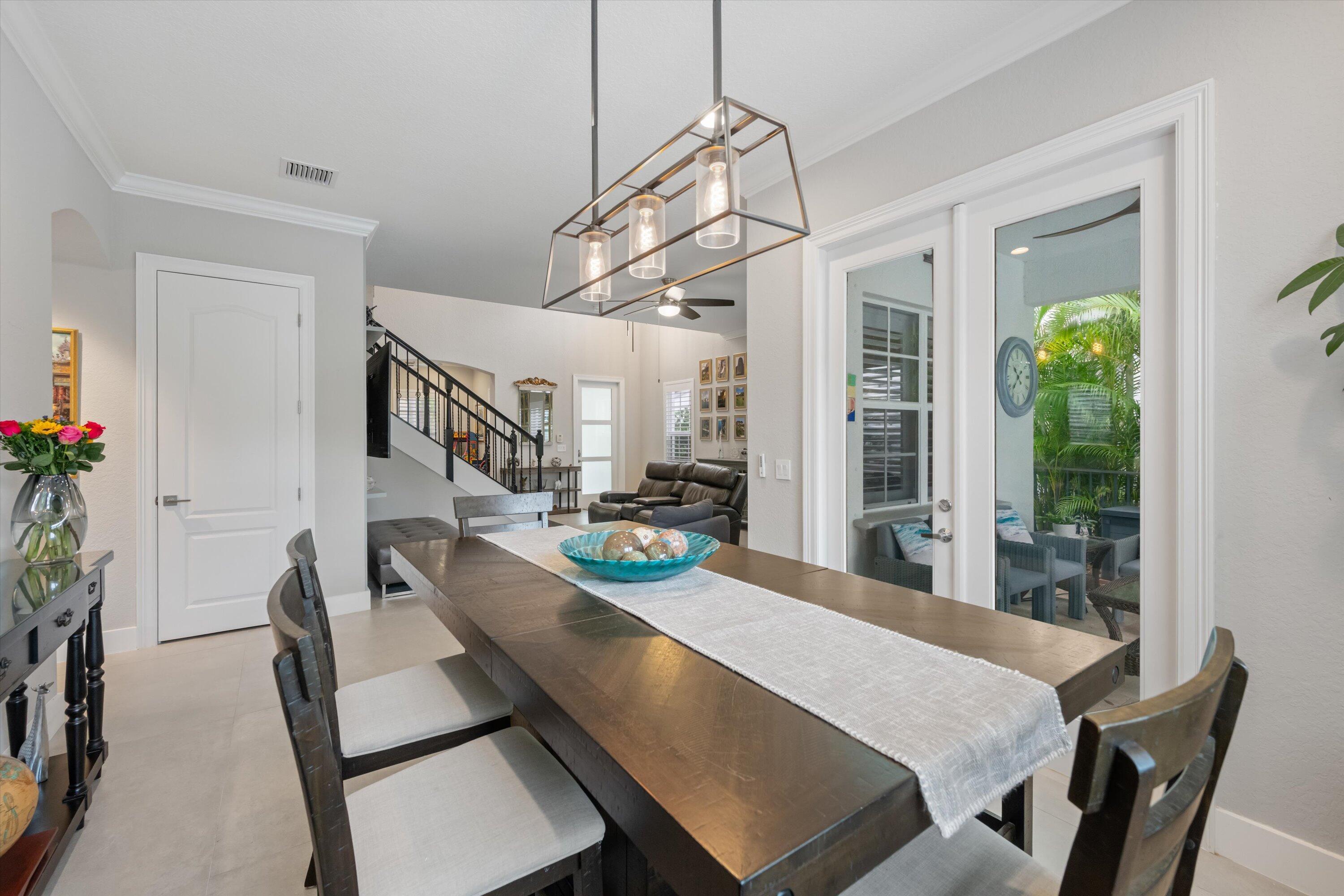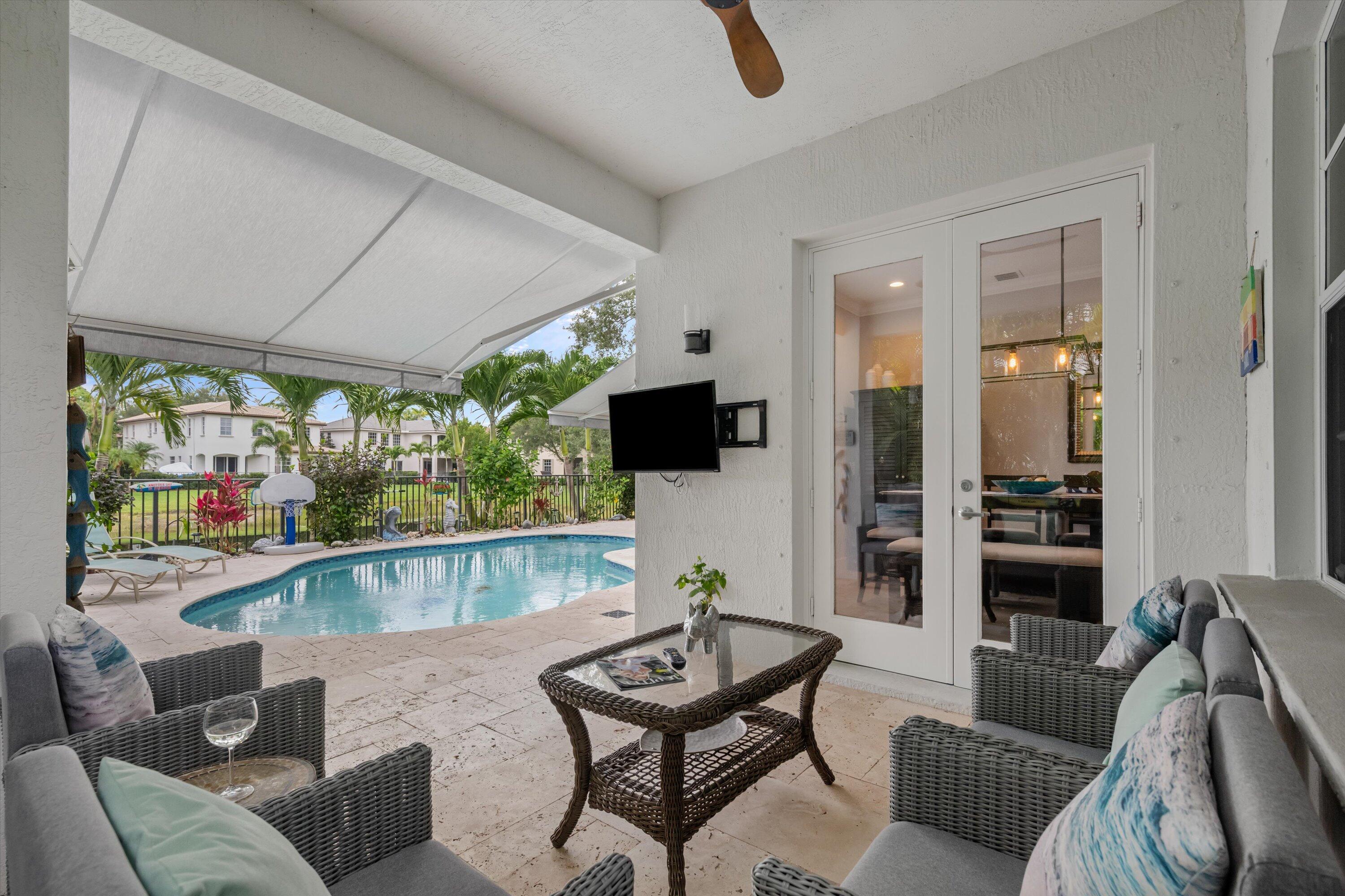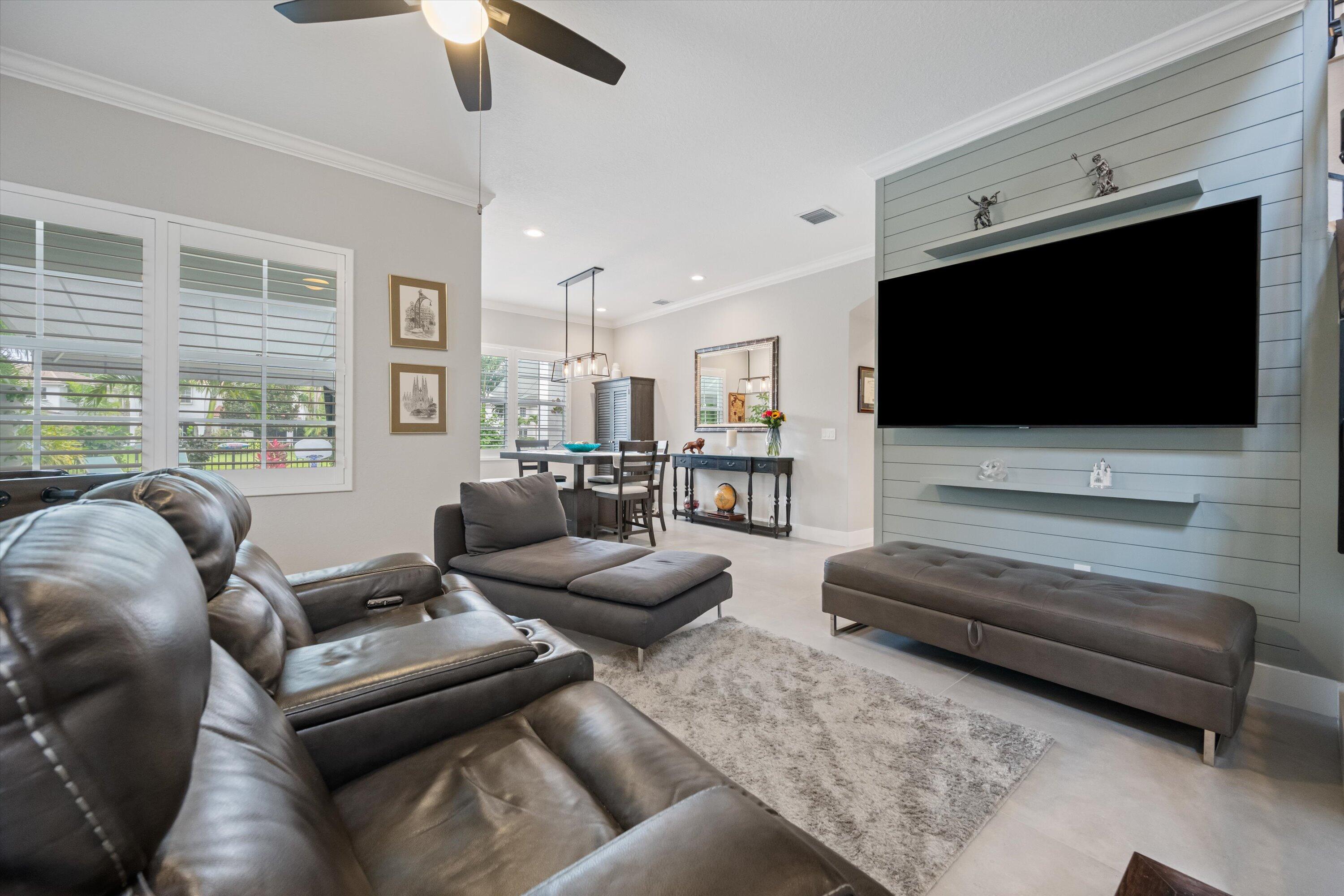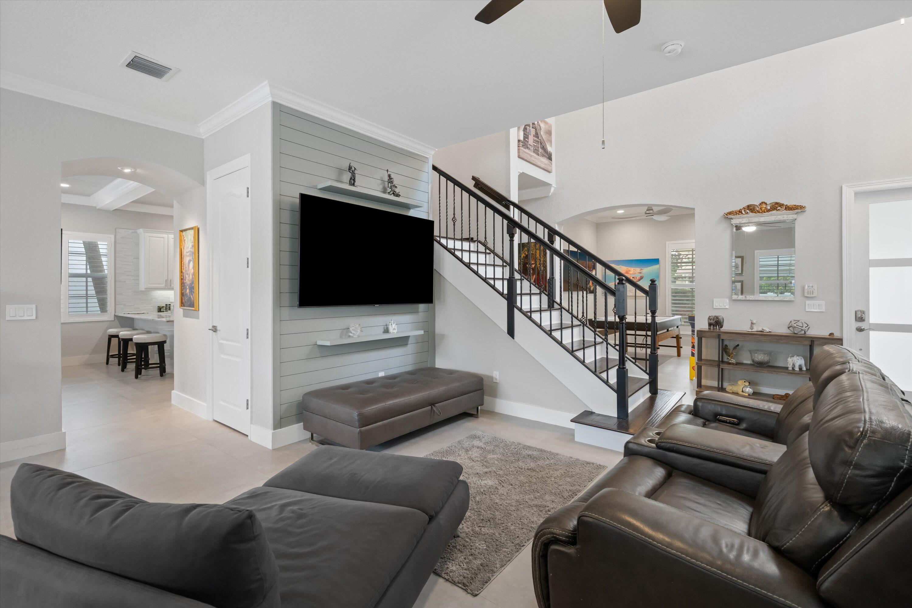 GORGEOUS, RENOVATED 4 bedroom plus den, 4 bathroom home in resort- style Evergrene Community. This home boasts new porcelain tile flooring down stairs and newer wood flooring upstairs, updated kitchen with quartz counter tops ,all new bathrooms and plantation shutters. Enjoy entertaining your friends and family with a beautiful summer kitchen and saltwater pool with heater and chiller overlooking the lake. The back yard is fenced and has artificial turf. The community offers an infinity pool, Tiki bar, splash park, gym, weight room, basketball and pickle ball courts, manned gates, security and much more !!!!Take a short stroll to Lake Dorothy and enjoy the sights of this beautiful Audubon Signature Society. Minutes from Juno Beach, PBI airport, the Gardens Mall, Tanger Outlets, I 95The family room has custom coffered ceilings and stone accent wall. The living room has a wooden accent wall. The kitchen has 2 ovens a wine frig and soft close cabinets. The garage has custom shelving on walls and ceiling.