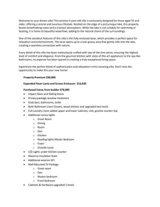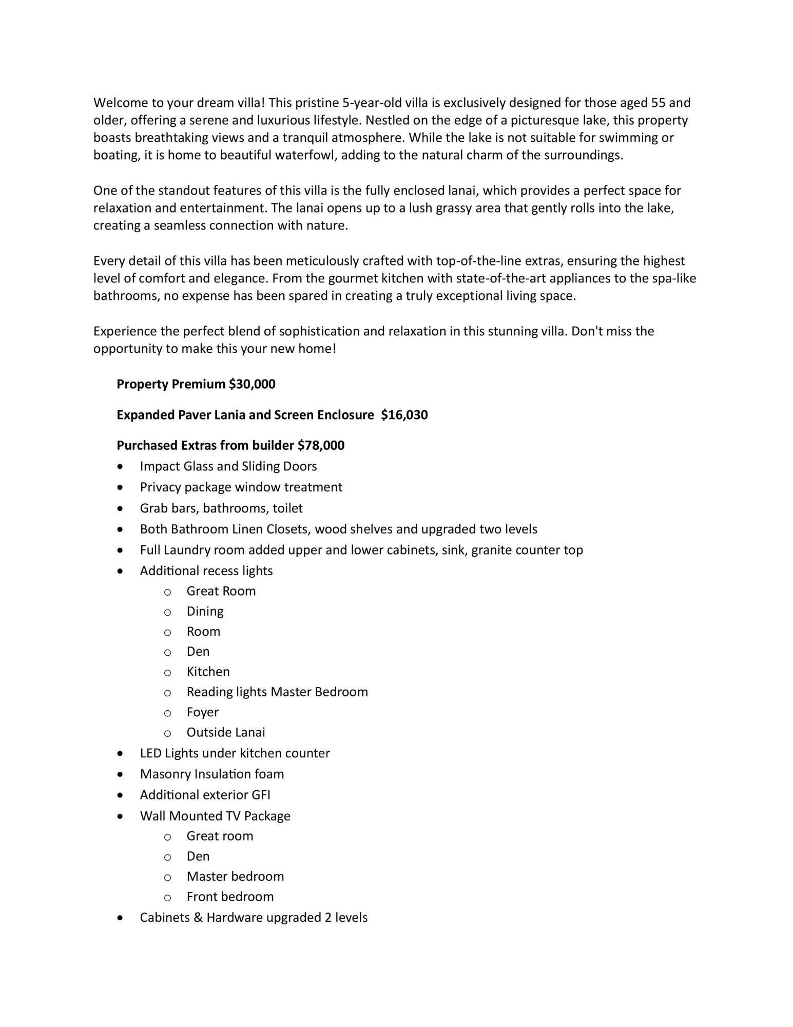 Welcome to your dream villa! This pristine 5-year-old villa is exclusively designed for those aged 55 andolder, offering a serene and luxurious lifestyle. Nestled on the edge of a picturesque lake, this property boasts breathtaking views and a tranquil atmosphere. While the lake is not suitable for swimming or boating, it is home to beautiful waterfowl, adding to the natural charm of the surroundings. One of the standout features of this villa is the fully enclosed lanai, which provides a perfect space for relaxation and entertainment. The lanai opens up to a lush grassy area that gently rolls into the lake, creating a seamless connection with nature.Every detail of this villa has been meticulously crafted with top-of-the-line extras, ensuring the highest level of comfort and elegance. From the gourmet kitchen with state-of-the-art appliances to the spa-like bathrooms, no expense has been spared in creating a truly exceptional living space. Experience the perfect blend of sophistication and relaxation in this stunning villa. Don't miss the opportunity to make this your new home!