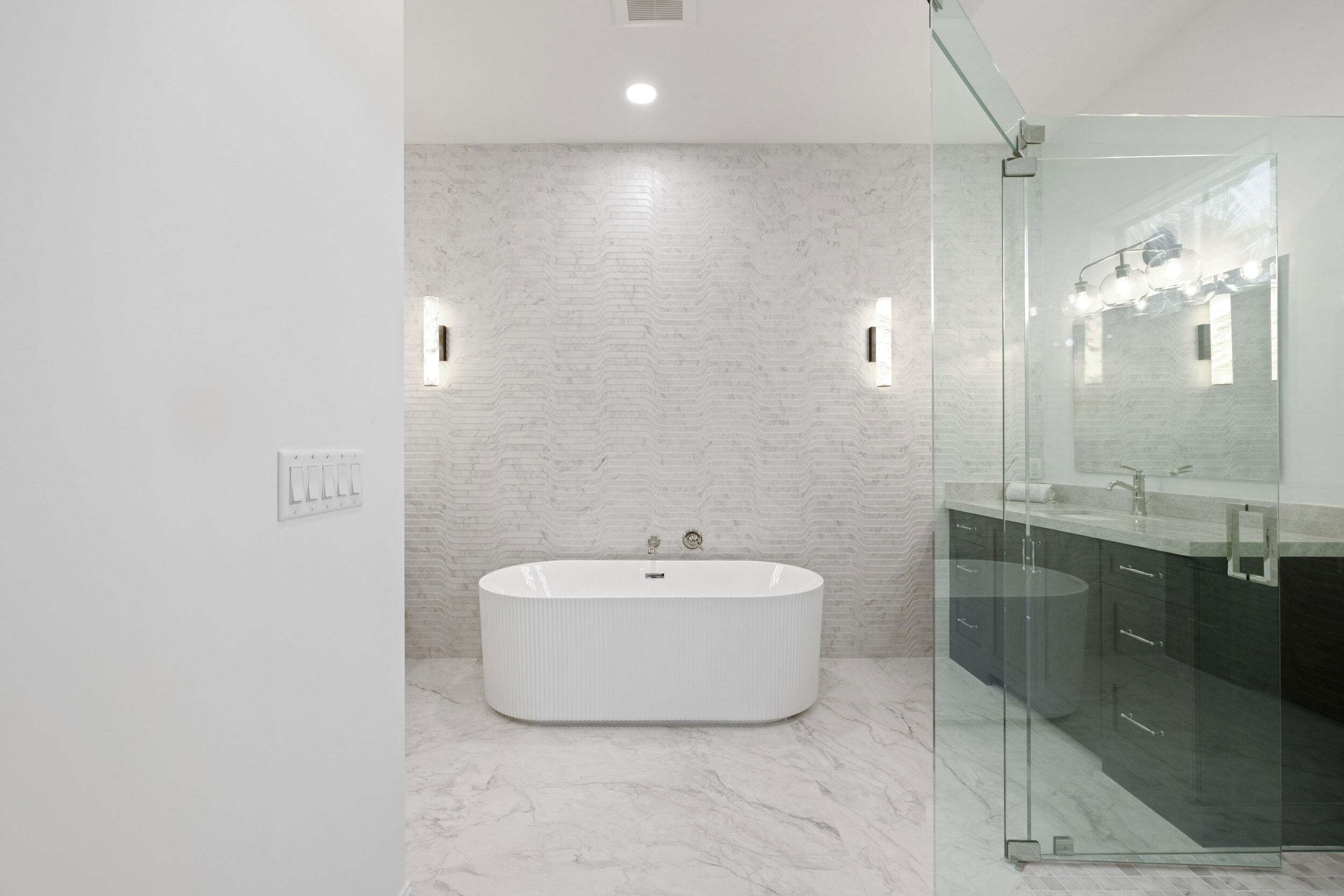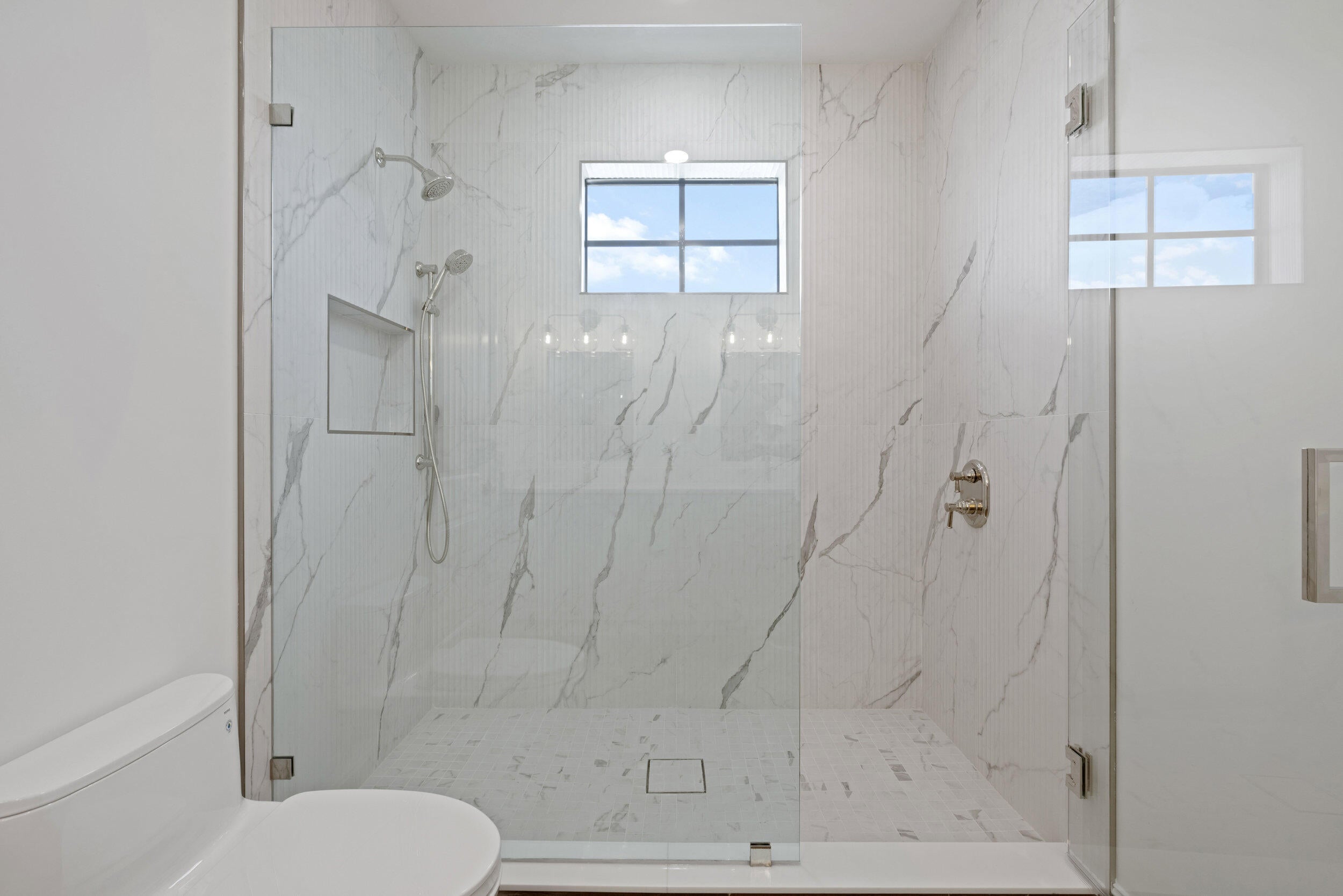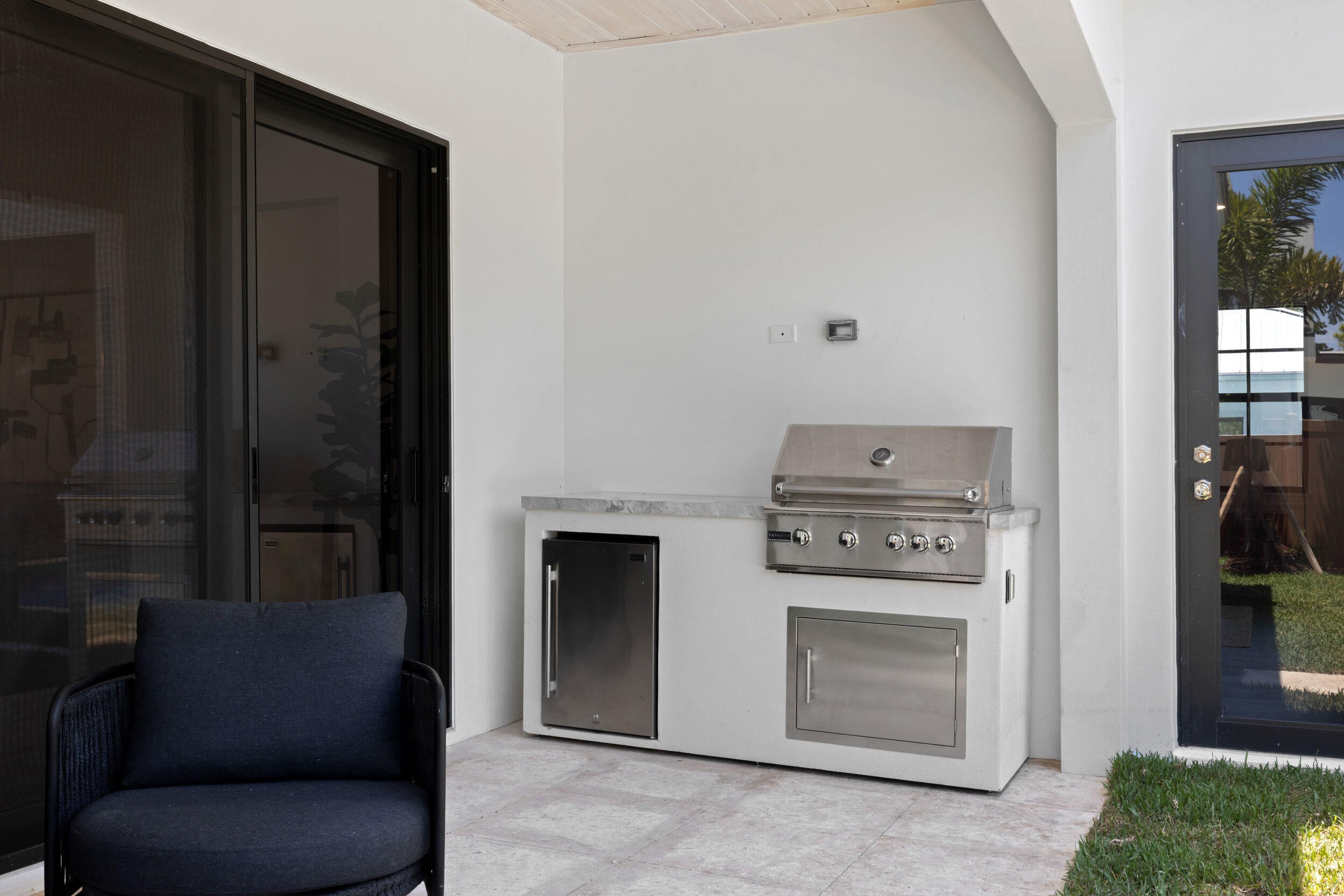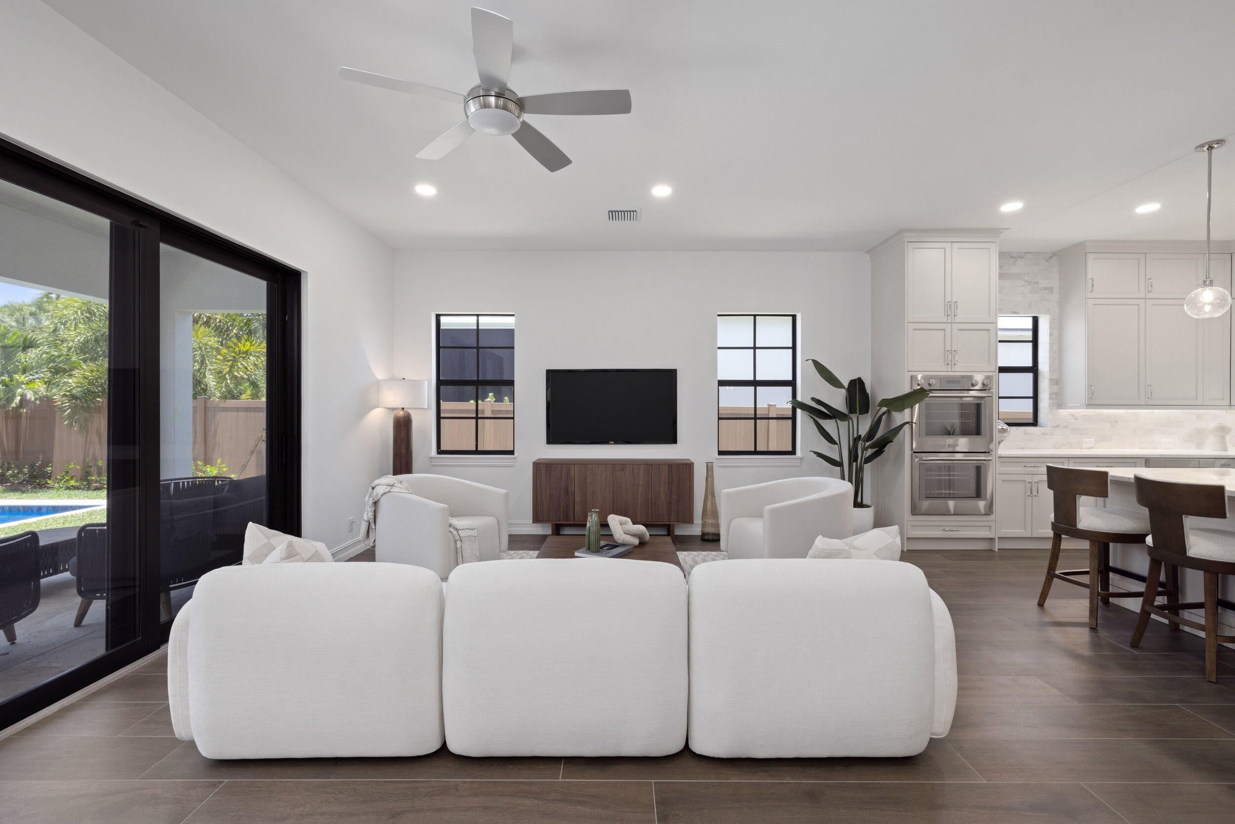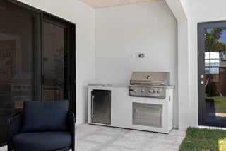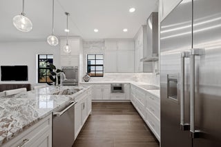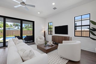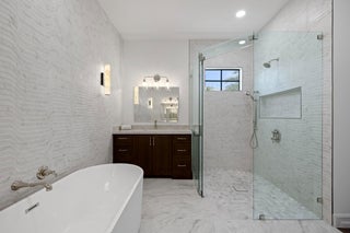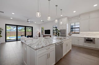 Welcome to 309 Cascade Lane the only brand-new construction home in all of Palm Beach Shores. This stunning Spanish Colonial-style residence is truly one of a kind, offering a luxurious blend of elegance and comfort. Situated on a prime lot, the home features a governor's driveway and a spacious two-car garage with durable epoxy floors--complete with a brand-new 6-seater golf cart to enjoy the golf-cart-friendly community of Singer Island.As you step through the grand double doors, you're welcomed by rich, dark wood-look porcelain tile flooring that flows seamlessly throughout the home. The open-concept layout connects the living, dining, and kitchen spaces, creating a warm and inviting environment perfect for entertaining or relaxing. The heart of the home is the designer kitchen, featuring a show-stopping fantasy brown marble island that is bookmatched into the custom sink basin. Mystery white quartzite countertops, a sleek backsplash, bone-colored custom cabinetry, and nickel hardware complete the elegant design. Off the living room, retreat to your oversized primary suite with dual walk-in closets and a luxurious en-suite bathroom. The spa-like space boasts marble flooring, a double vanity, a seamless glass shower, a freestanding soaking tub, and a marble wave accent wall that adds texture and sophistication. Upstairs, you'll find a second primary suite and a flexible den/office or sitting area with a large walk-in shower. Two additional Jack-and-Jill bedrooms offer privacy and convenience, all connected by a beautifully crafted custom wood railing and a large window that fills the stairwell with natural light. Step outside into your private backyard oasis featuring a fully fenced yard, a heated saltwater pool with water features, and a built-in summer kitchen with a grill and refrigerator perfect for enjoying the Florida lifestyle year-round. Located just a few blocks from the Palm Beach Inlet, 309 Cascade is connected to a scenic walking trail that links every street in Palm Beach Shores. You're only minutes from the beach and within walking distance to Ocean Mall, home to six restaurants, a coffee shop, and charming souvenir stores. Don't miss this opportunity to own the finest new construction home in Palm Beach Shores.