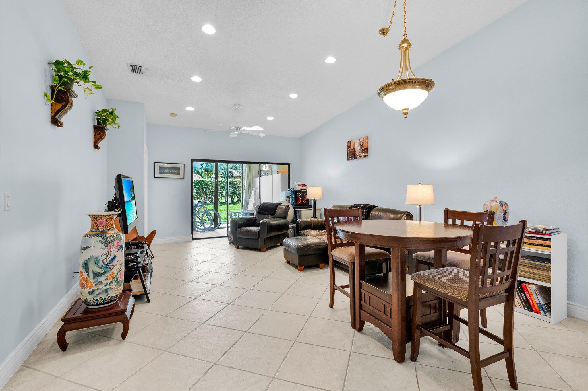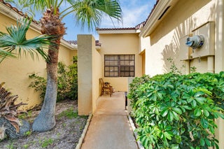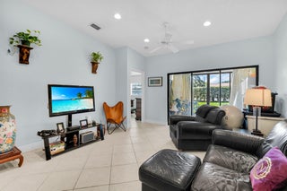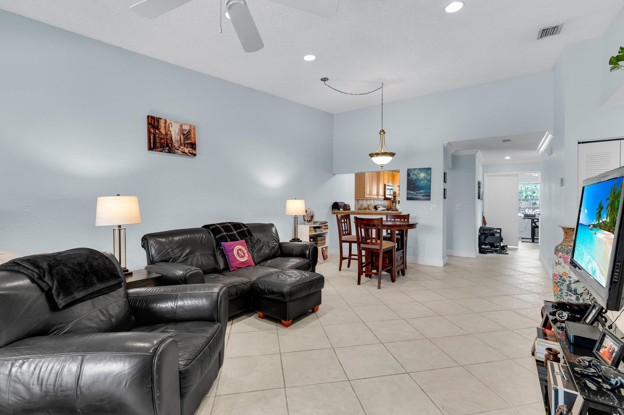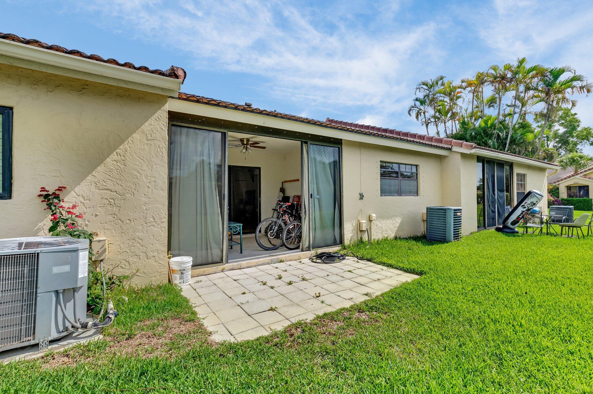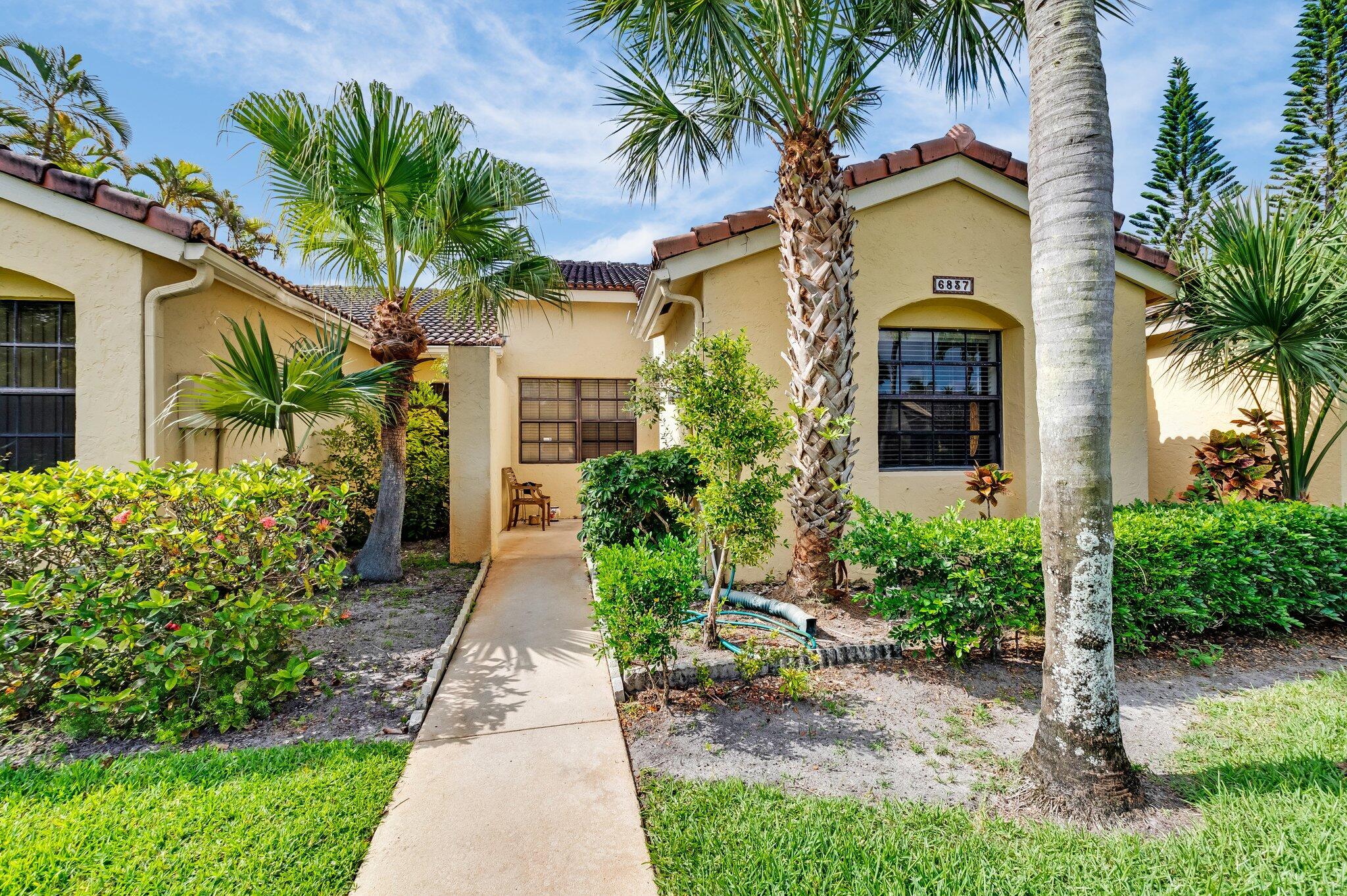 Welcome to your new home nestled in the heart of convenience and serenity! This stunning 3-bedroom, 2-bathroom villa offers an unparalleled lifestyle, boasting breathtaking views of lush greenery. Upon entering, you're greeted by an abundance of natural light that illuminates the spacious living areas, adorned with beautiful white ceramic tile flooring throughout. The open layout seamlessly flows from the living room to the dining area, creating the perfect space for entertaining guests or enjoying cozy evenings with loved ones. The well-appointed kitchen is a chef's delight, featuring modern appliances, ample cabinet space, and a convenient breakfast bar for casual dining. Retreat to the expansive master bedroom, complete with vaulted ceilings, a huge walk-in closet and a luxurious en-suite bathroom. The two additional bedrooms are generously sized and offer plenty of room for rest and relaxation. Step out onto the air-conditioned patio, glassed with floor-to-ceiling sliding doors, seamlessly blending indoor and outdoor living and adding additional interior living area. Located in an excellent school district, this home offers the perfect blend of convenience and tranquility. Enjoy strolls to your favorite shopping destinations, gym, houses of worship, and fine dining establishments, all just steps away from your front door. With easy access to I-95 and Florida's Turnpike, commuting to Palm Beach or Fort Lauderdale is a breeze, allowing you to explore the best that South Florida has to offer. Please be respectful and remember to take your shoes off before entering this meticulously maintained property. Additionally, pets are allowed, adding to the comfort and joy of your new home. Please note that there is a restriction on renting for the first 2 years of ownership, ensuring a sense of community and stability. Don't miss out on the opportunity to call this beautiful villa your own! Schedule your showing today and experience the best of Florida living in this friendly, well-taken-care-of community.