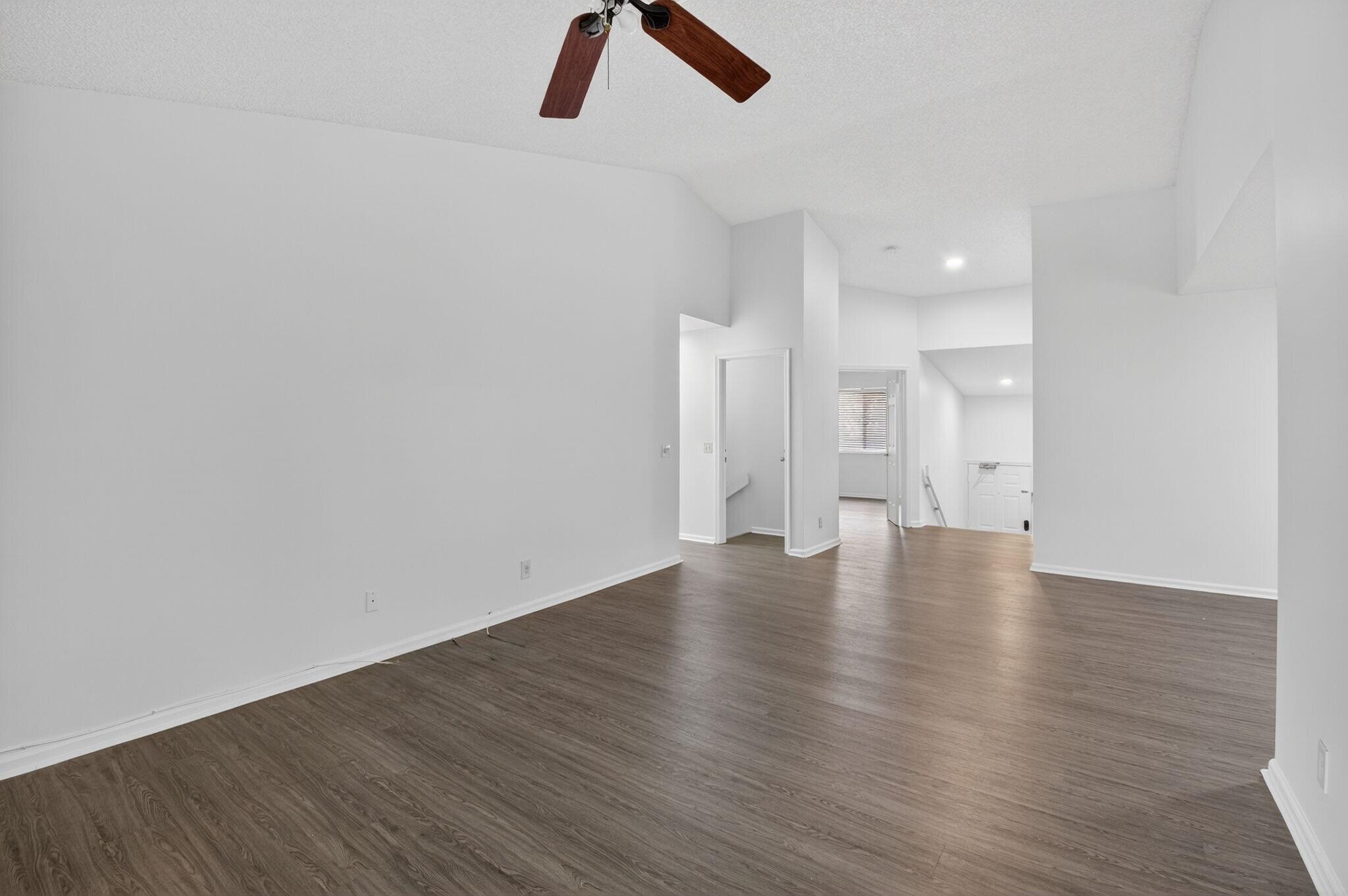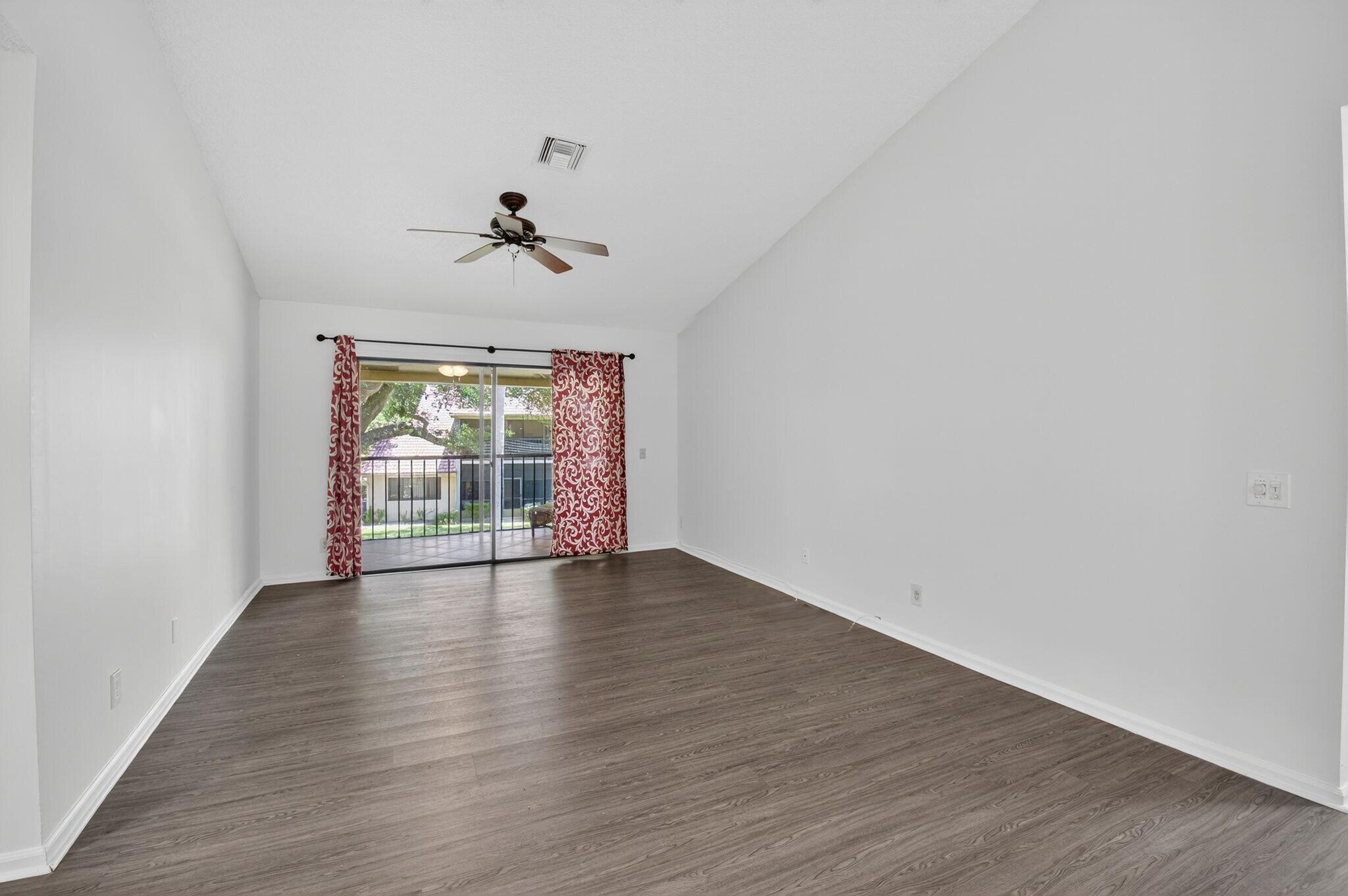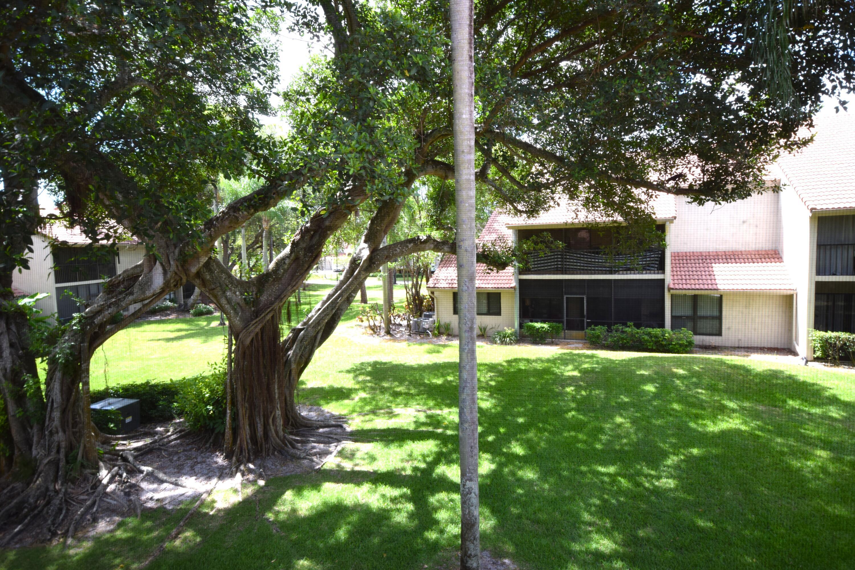 Tucked away on a quiet cul-de-sac in the all-ages Coach Houses of Town Place community, this spacious 3-bedroom, 2-bath home with a 1-car garage offers peace, privacy, and convenience. This is a highly desirable corner unit offering abundant natural light and a private front door entrance. The freshly painted interior features wood-look laminate flooring and vaulted ceilings, creating an open and airy feel throughout. Enjoy a large eat-in kitchen, separate dining area, and a comfortable living room - perfect for entertaining. Step out onto the expansive screened-in balcony and take in views of a lush green area shaded by a mature banyan tree. The stacked bedroom floor plan includes a primary suite with a walk-in closet and an ensuite bathroom featuring dual sinks and a sunken tub. Twoadditional bedrooms and an in-unit laundry room round out this lovely home. Other notable features include a new AC (1 year) and newer hot water heater (4 years). Ideally located near Town Center Mall, FAU, Lynn University, A-rated public schools, dining, shopping, and beaches. Residents enjoy access to the community pool.