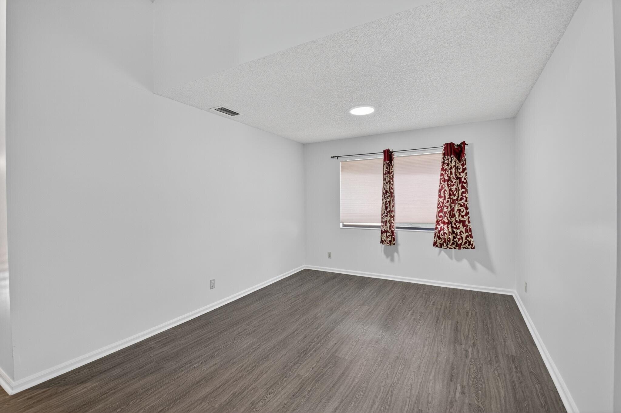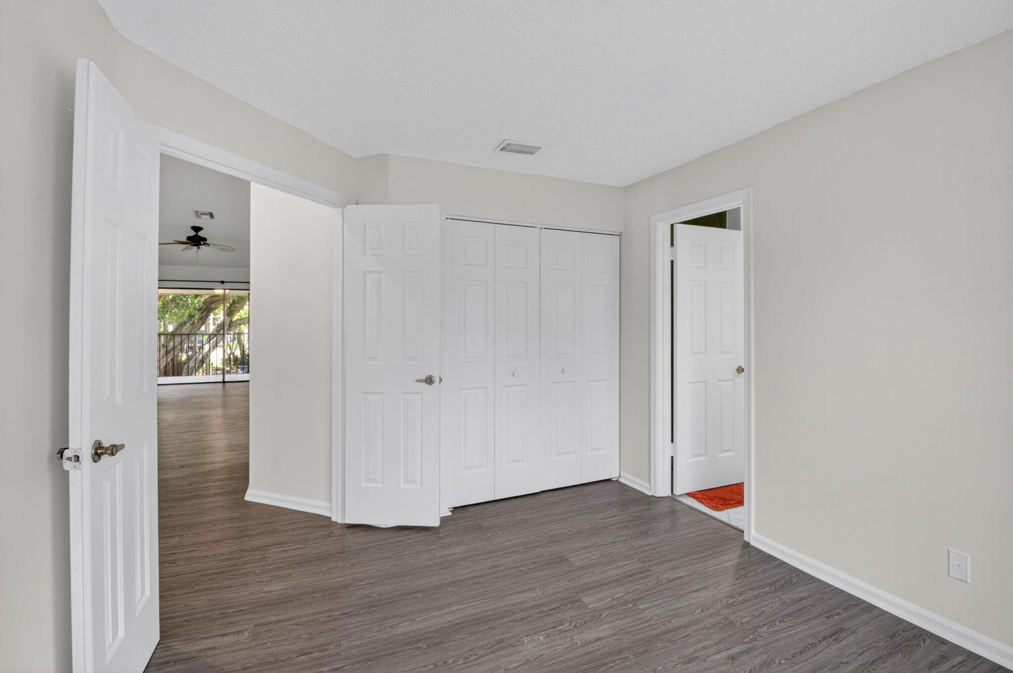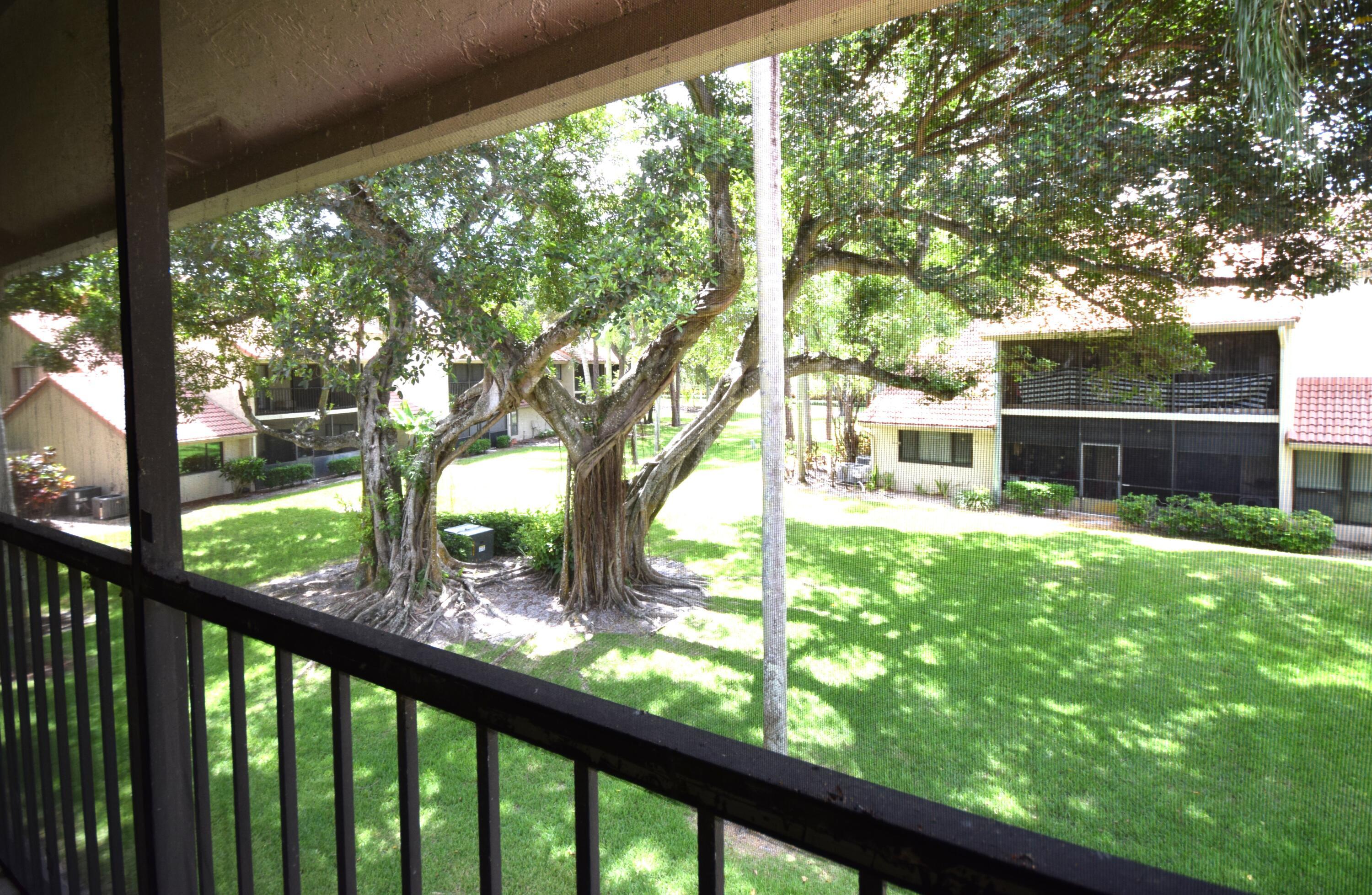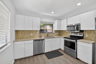 Tucked away on a quiet cul-de-sac in the all-ages Coach Houses of Town Place community, this spacious 3-bedroom, 2-bath home with a 1-car garage offers peace, privacy, and convenience. This is a highly desirable corner unit offering abundant natural light and a private front door entrance. The freshly painted interior features wood-look laminate flooring and vaulted ceilings, creating an open and airy feel throughout. Enjoy a large eat-in kitchen, separate dining area, and a comfortable living room - perfect for entertaining. Step out onto the expansive screened-in balcony and take in views of a lush green area shaded by a mature banyan tree. The stacked bedroom floor plan includes a primary suite with a walk-in closet and an ensuite bathroom featuring dual sinks and a sunken tub. Twoadditional bedrooms and an in-unit laundry room round out this lovely home. Other notable features include a new AC (1 year) and newer hot water heater (4 years). Ideally located near Town Center Mall, FAU, Lynn University, A-rated public schools, dining, shopping, and beaches. Residents enjoy access to the community pool.