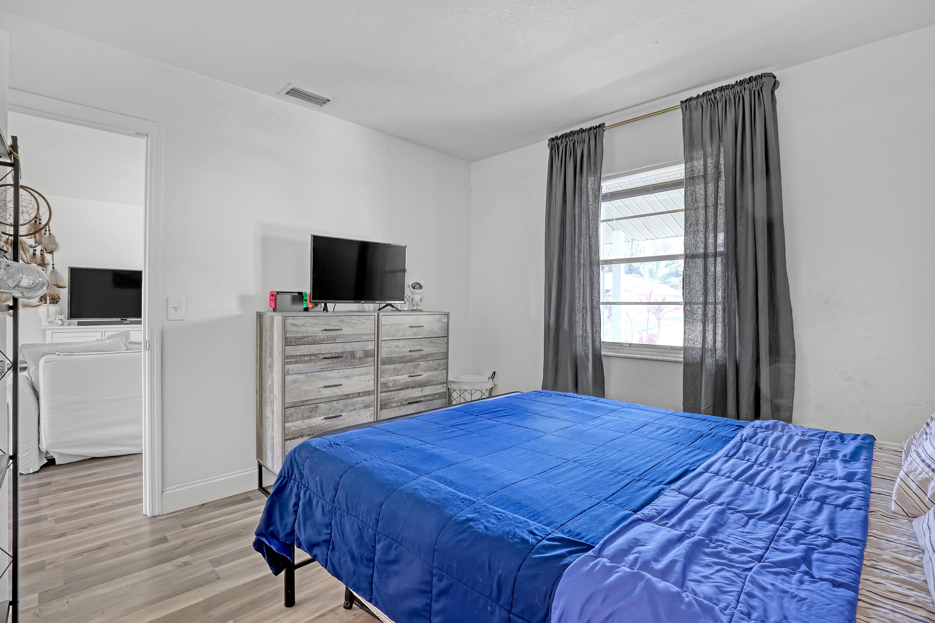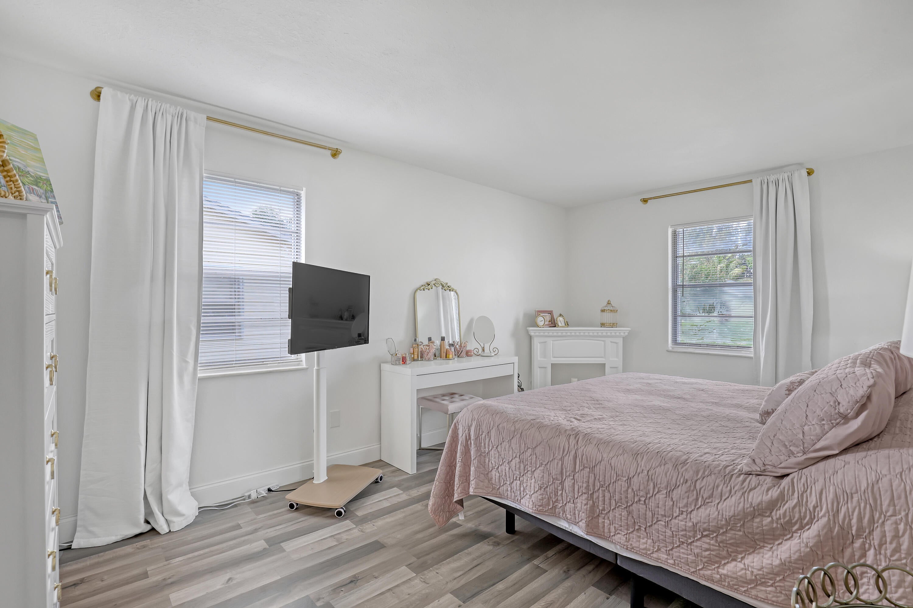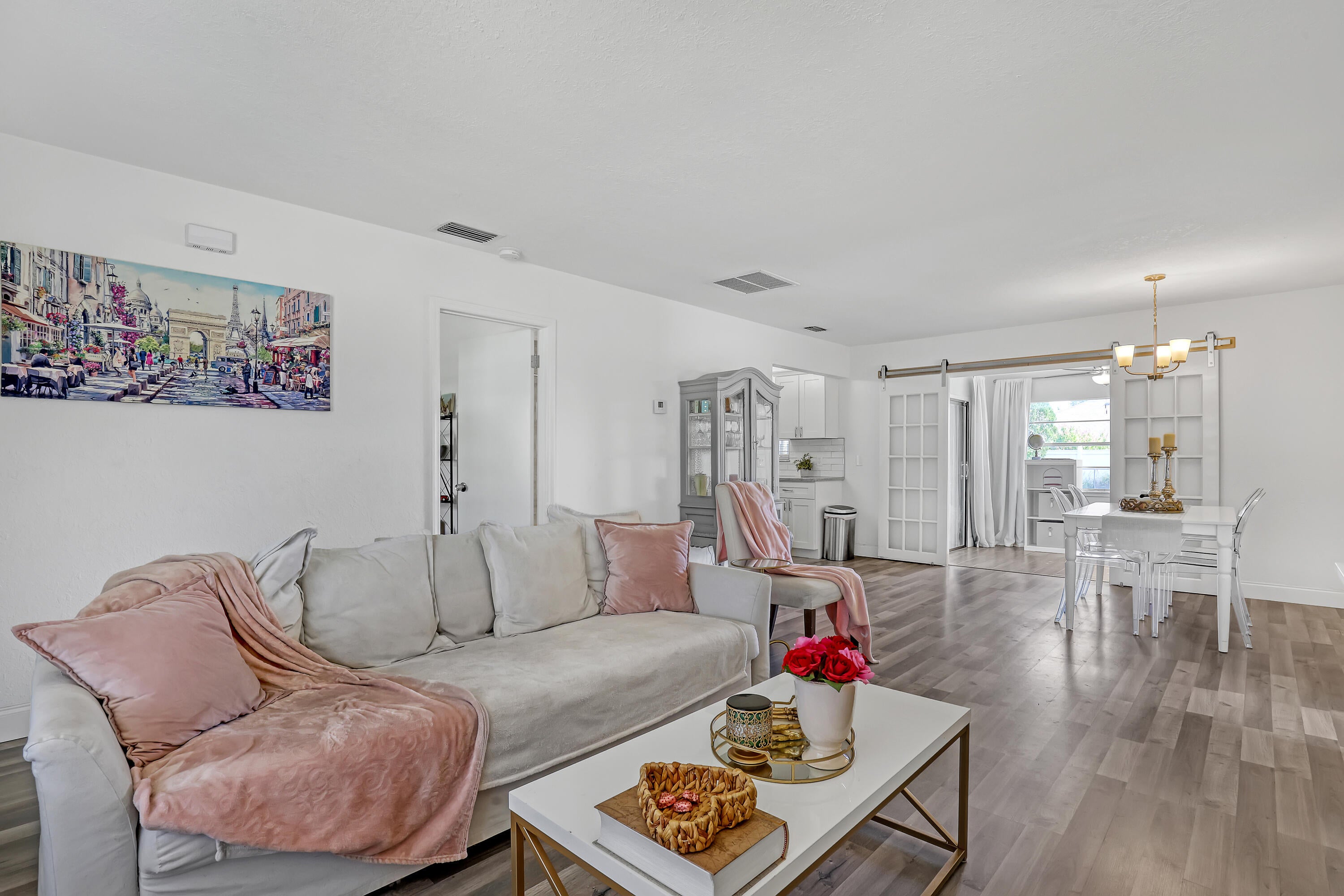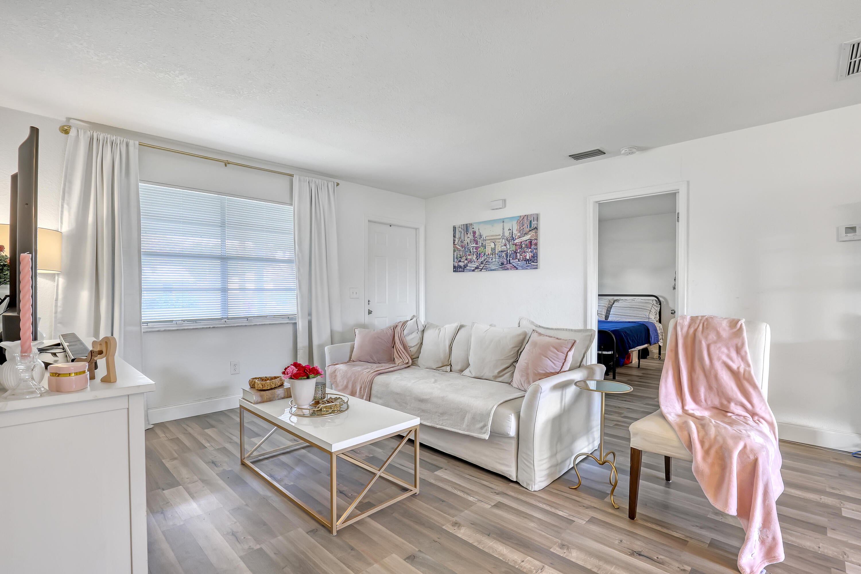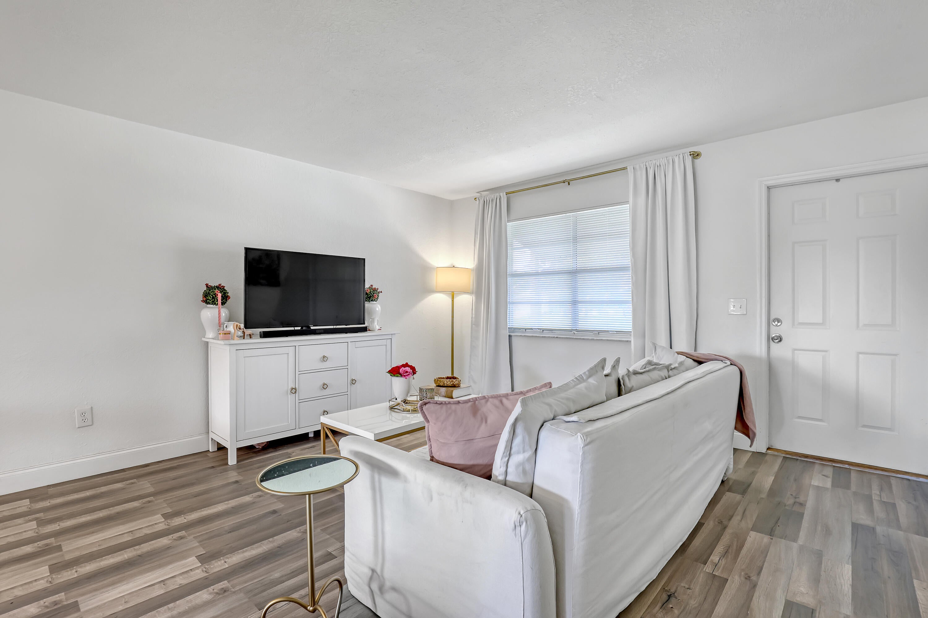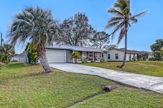 2 BD 2 BA Plus Florida Room & 2 Car Garage. New Roof (2024). Updates completed in 2023 include: A/C; Garage Door; Kitchen (granite countertops, cabinets, & SS appliances); Bathrooms (Complete); New Flooring throughout. Easy to Close Accordion Shutters. All sizes are approximate. **Draperies Are Not Included**