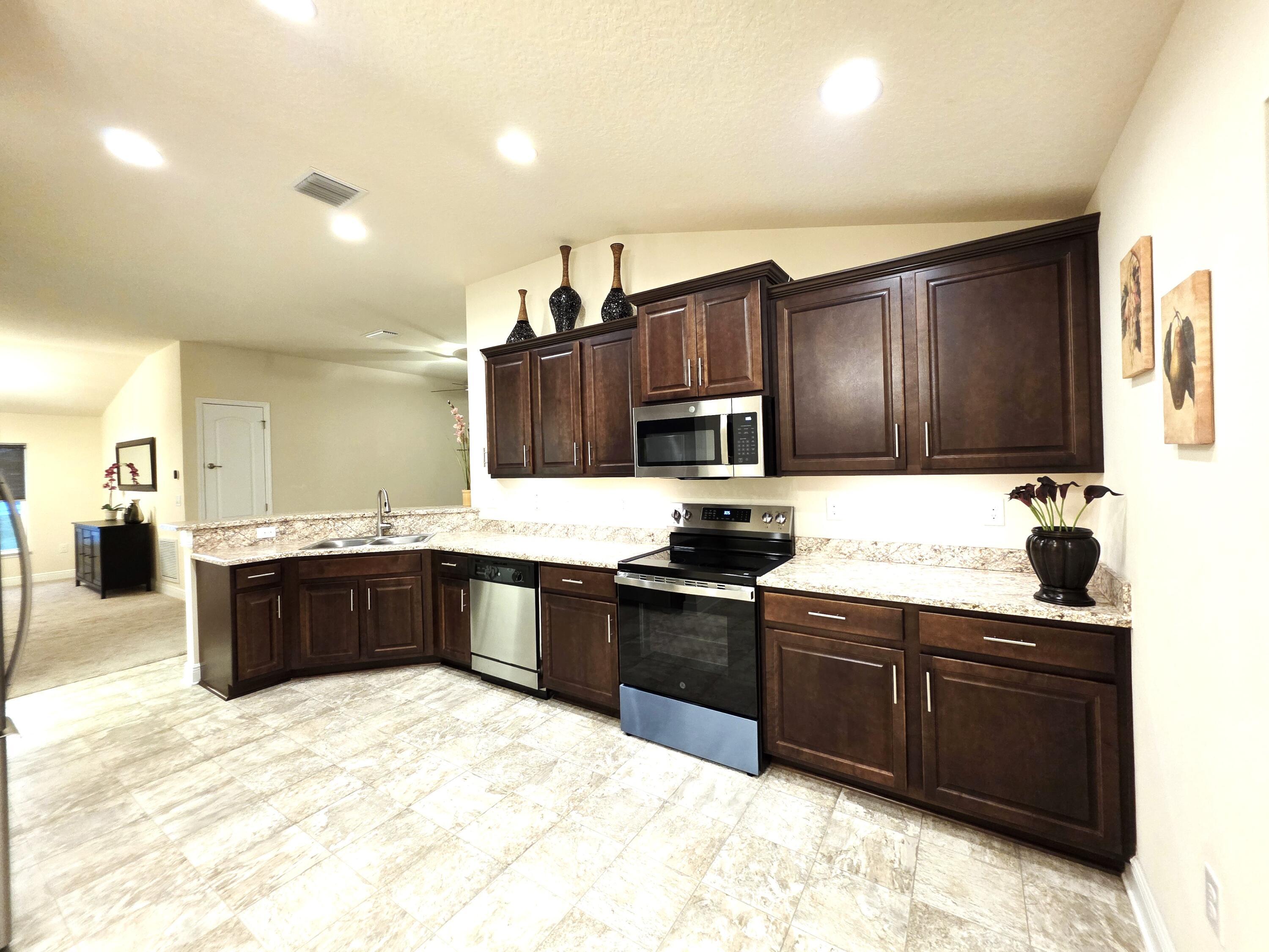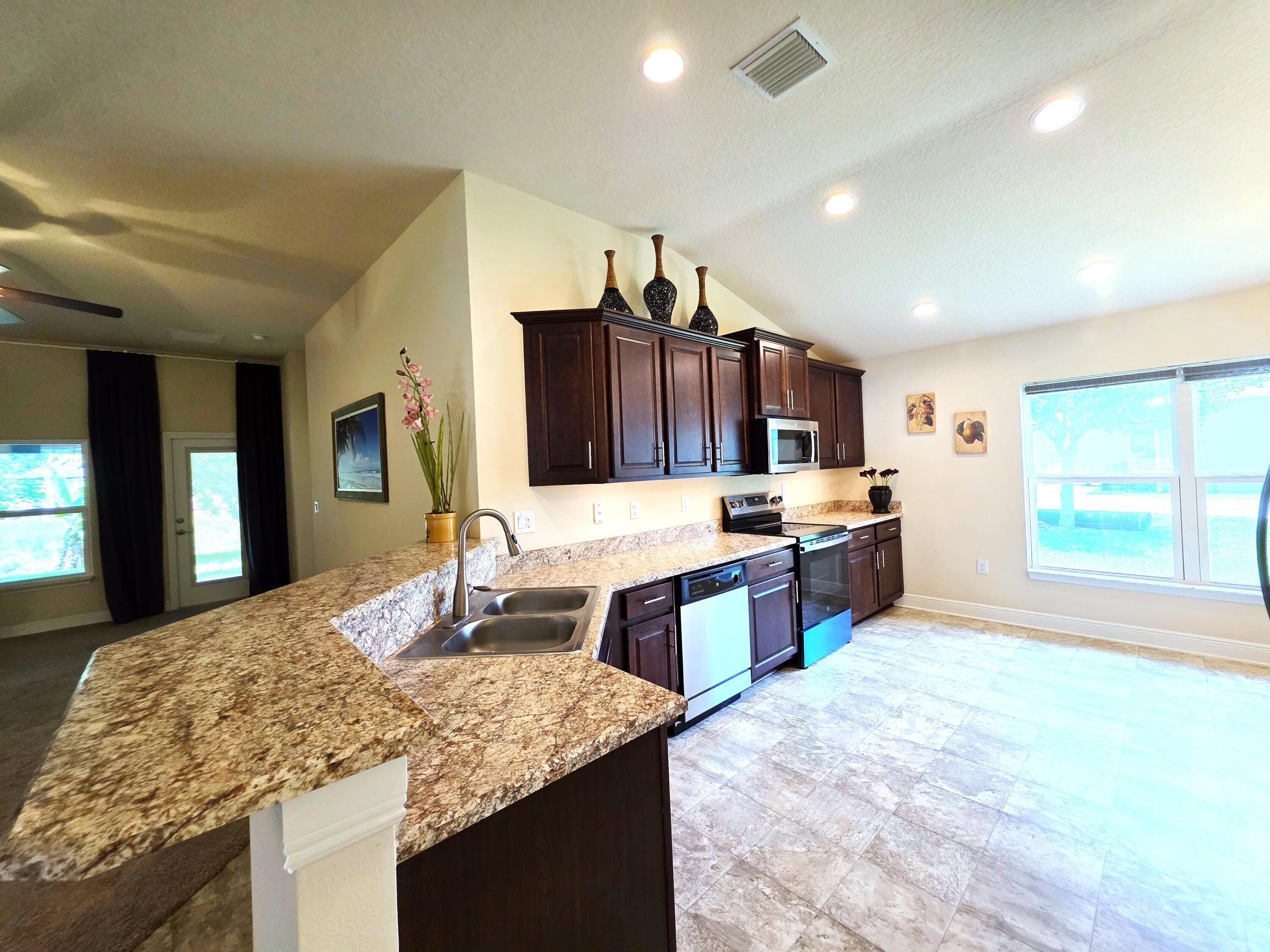 For Rent. Spacious and immaculately kept 4/2/2 home with charging station for electric cars. Nice and clean home on corner lot. Well maintained landscaping included in monthly rent. Large kitchen with lots of elegant wood cabinets, stainless steel appliances and roomy pantry. Lovely convenient breakfast area and breakfast bar. Open floor plan to formal dining room and living room, Crown moldings, Low E Double Paned Windows,, 2- Panel Doors. Textured Walls. Split floor plan, sizable master bedroom with walk-in closet. Master bath with dual sinks, shower and desirable soaking tub. Light and bright with tented windows, covered front porch and back porches. Close to Shopping, parks, Schools, Dining, medical and beaches.