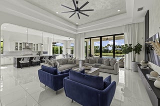 Step into unparalleled luxury in this stunning single-story estate nestled within the exclusive guard-gated Palm Meadows Estates. Your 4-bedroom, 3.5-bathroom Cheshire model boasts over 3,080 square feet of meticulously designed living space, blending timeless elegance with modern sophistication in an open-concept layout with dramatic volume tray ceilings and sleek lines throughout, creating a bright and airy ambiance perfect for both grand entertaining and serene relaxation. Gourmet chef's kitchen, the heart of the home, showcases a massive designer island, top-tier stainless steel appliances, custom cabinetry seamlessly connect to an expansive great room & elegant dining area.Your lavish primary suite is a private oasis, offering tranquil water views a dual walk-in closets!In the Florida sunshine, you'll indulge in a resort-style backyard retreat featuring a sparkling saltwater pool, covered lanai, and serene lakefront vistas framed by lush tropical privacy landscaping. Perfect for sunset gatherings or unwinding under the stars, your expansive yard beyond the pool offers space for a garden, playset, or your personal touch. Seller Incentive: Slash your mortgage payments with a seller-funded 2-1 temporary rate buydownenjoy a 2% lower interest rate in year one, 1% lower in year two, saving you thousands! (Subject to lender approval.) Additional highlights include impact windows and doors, a split 3-car garage with a fully equipped personal gym in the smaller bay, high-efficiency HVAC system, upgraded lighting fixtures, and more! Residents enjoy exclusive access to Palm Meadows' premier amenities, including a state-of-the-art clubhouse, fitness center, tennis and pickleball courts, resort-style pool, hot tub, cabanas, and more. This home delivers the ultimate blend of luxury, comfort, and lifestyleschedule your showing today!