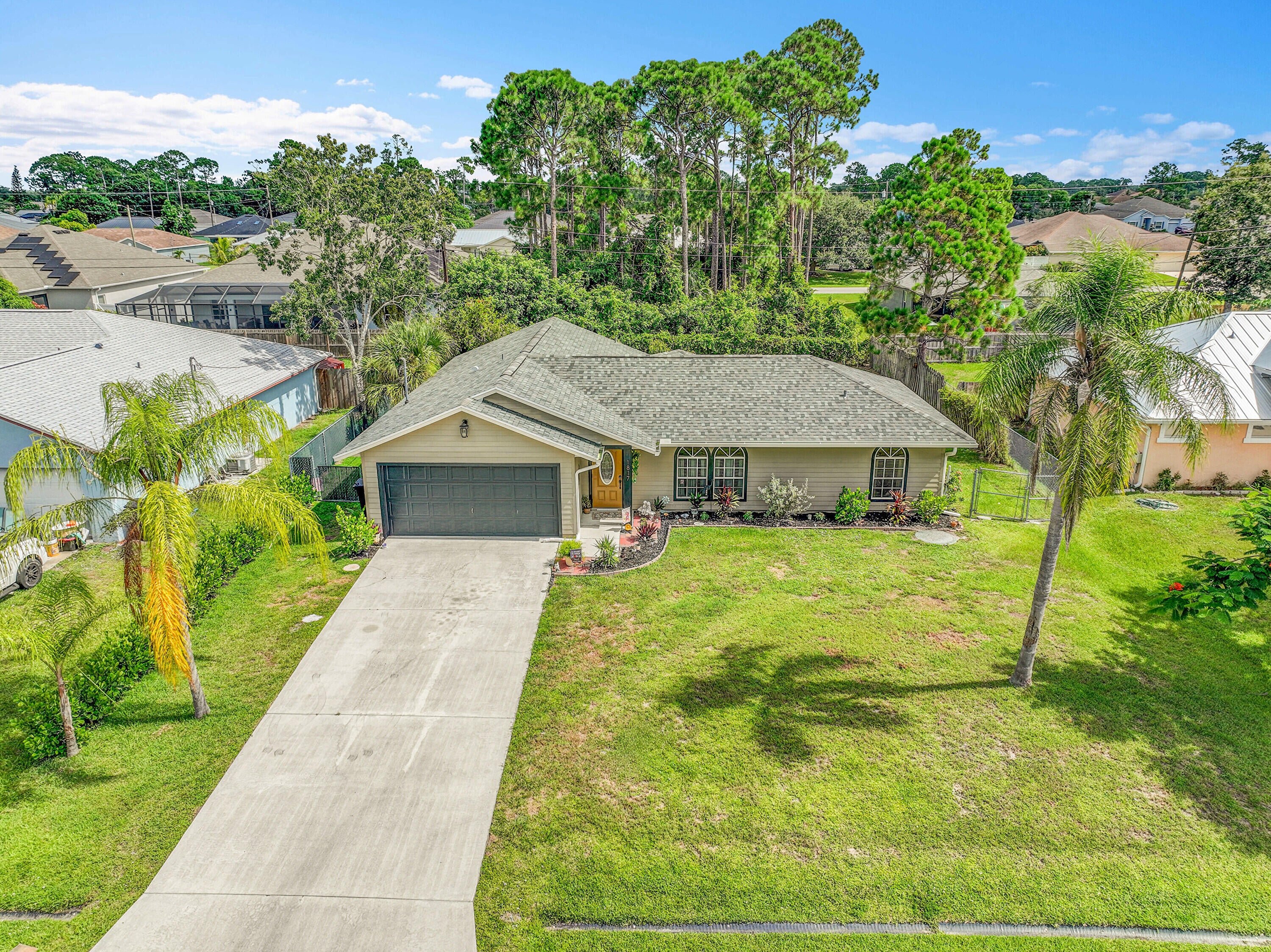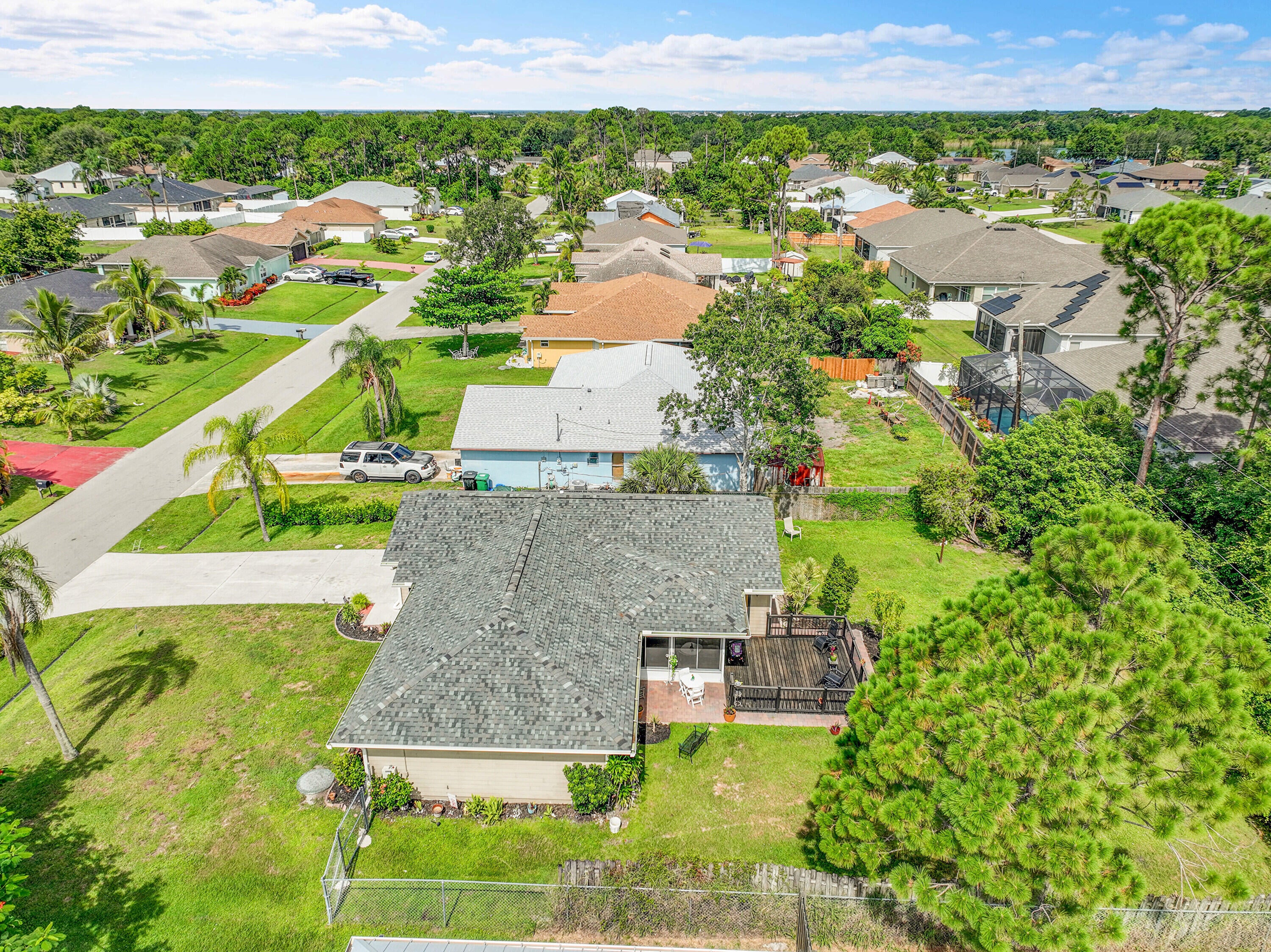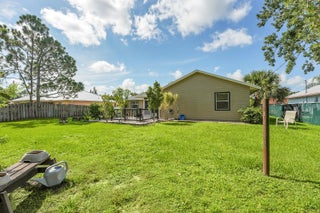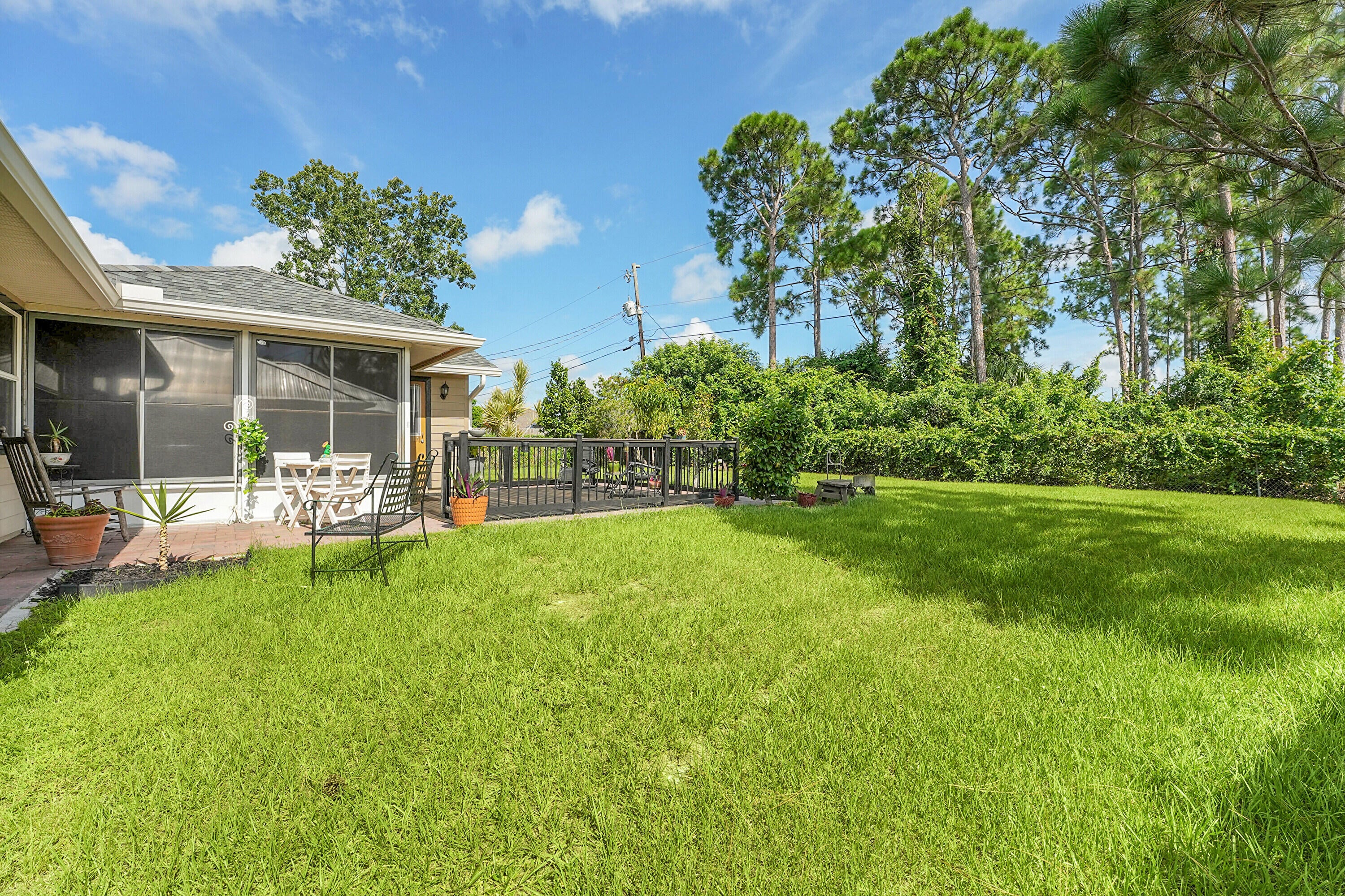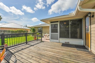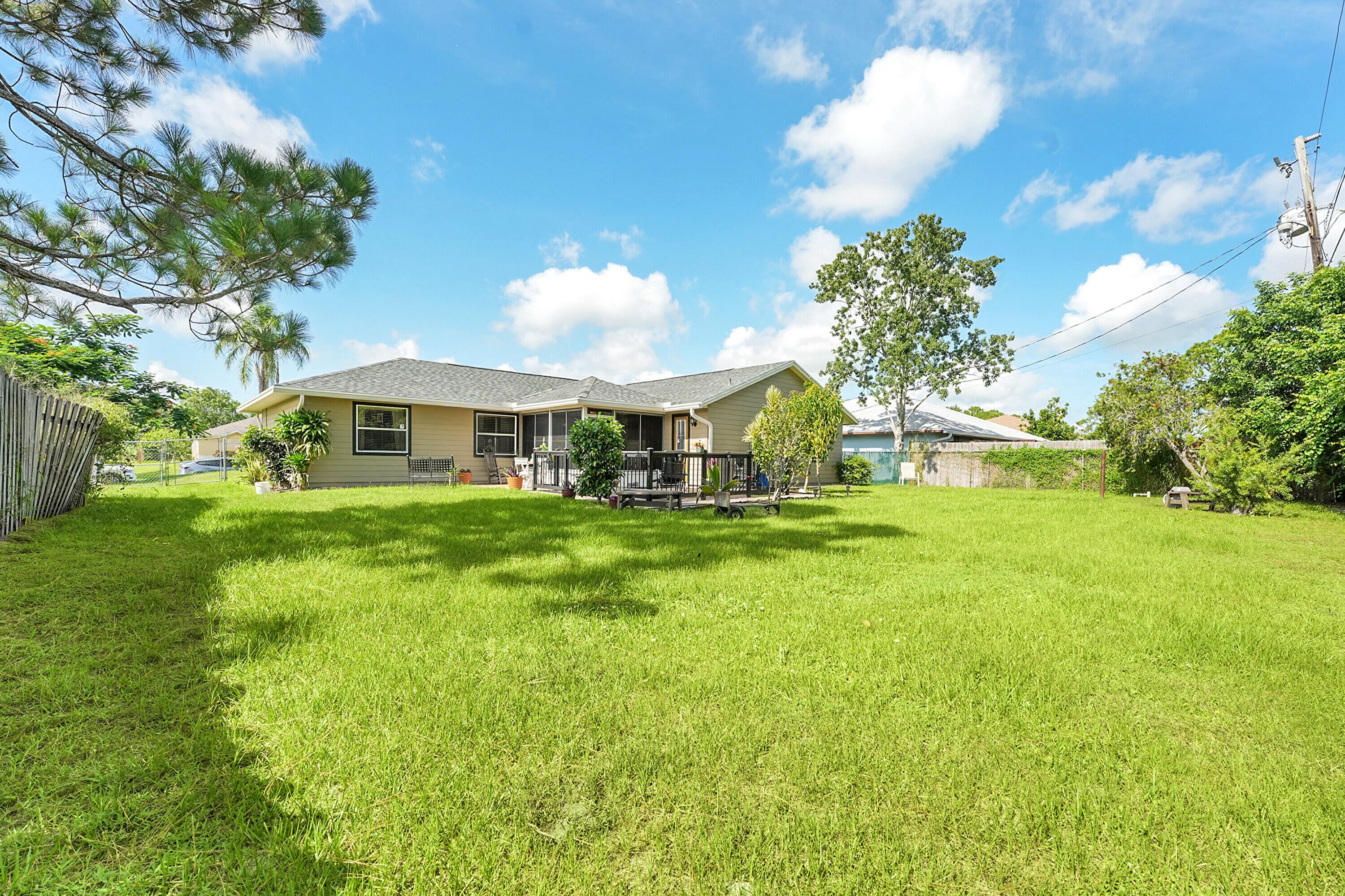 Nestled in the desirable Rosser Reserve area of Port St. Lucie, this beautifully upgraded 3-bedroom, 2-bath home blends modern comfort with everyday convenience located just minutes from I-95, shopping, schools, parks, and the thriving Tradition area. From the moment you arrive, the curb appeal speaks for itself. A freshly painted exterior trim adds a crisp, polished look, while mature landscaping, lush green lawn, and a full hedge of vibrant Clusias offer privacy and a sense of tropical serenity. Inside, you're welcomed by fresh interior paint and a bright, open layout that flows seamlessly into a thoughtfully updated kitchen. A stacked stone backsplash, Corian countertops, and newer stainless steel appliances make this kitchen both stylish and functional.Vinyl plank flooring adds warmth and durability to the bedrooms, each featuring its own walk-in closet for plenty of storage. The primary suite offers a peaceful retreat with a large walk-in closet and en-suite bathroom. This split floor plan includes a dedicated laundry room and a refreshed cabana bathroom for you to step outside into your very own Florida oasis. A fully enclosed Florida room with brand new screens and vinyl windows opens up to a custom wood deck framed by elegant paver accents. Whether you're hosting a BBQ or enjoying quiet evenings under the stars, this outdoor space was made to be enjoyed. Peace of mind comes easy here with a 2023 roof, durable fiber cement siding (Hardie plank/board), 2024 water heater, and over $3,000 in HVAC upgrades, including a new evaporator coil and blower motor. Plus, the 30 amp Interlock generator hookup ensures the entire home stays powered during outages. Even the little things are done for you like the new side garage door, new exterior window screens, and fresh landscaping touches throughout. Set in a quiet, established neighborhood with no HOA and surrounded by well-kept homes, this property offers the perfect mix of privacy, location, and livability. This is more than a home- it's a lifestyle upgrade waiting for you in the heart of Port St. Lucie.