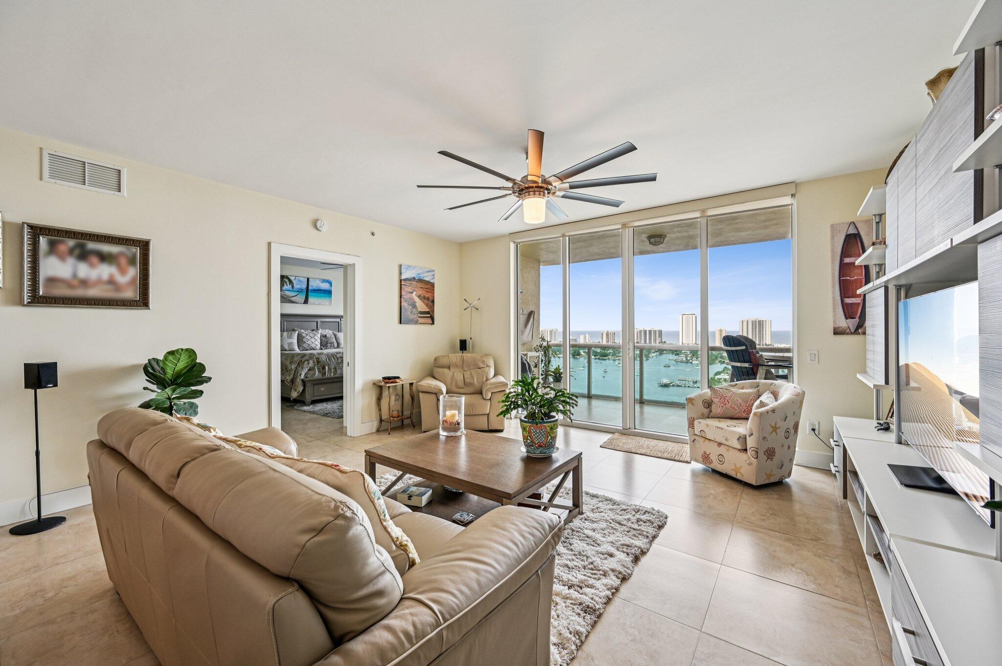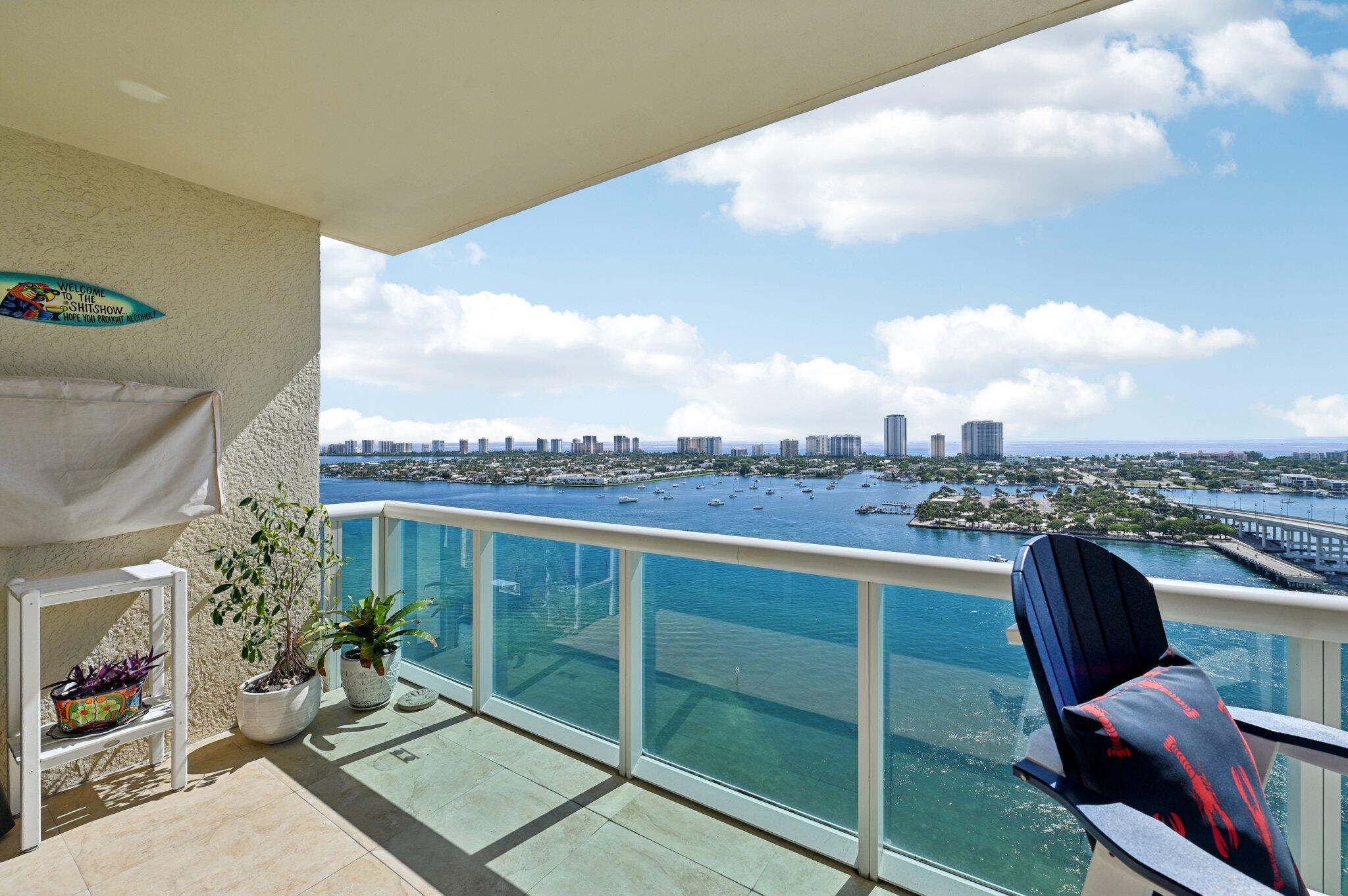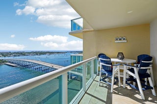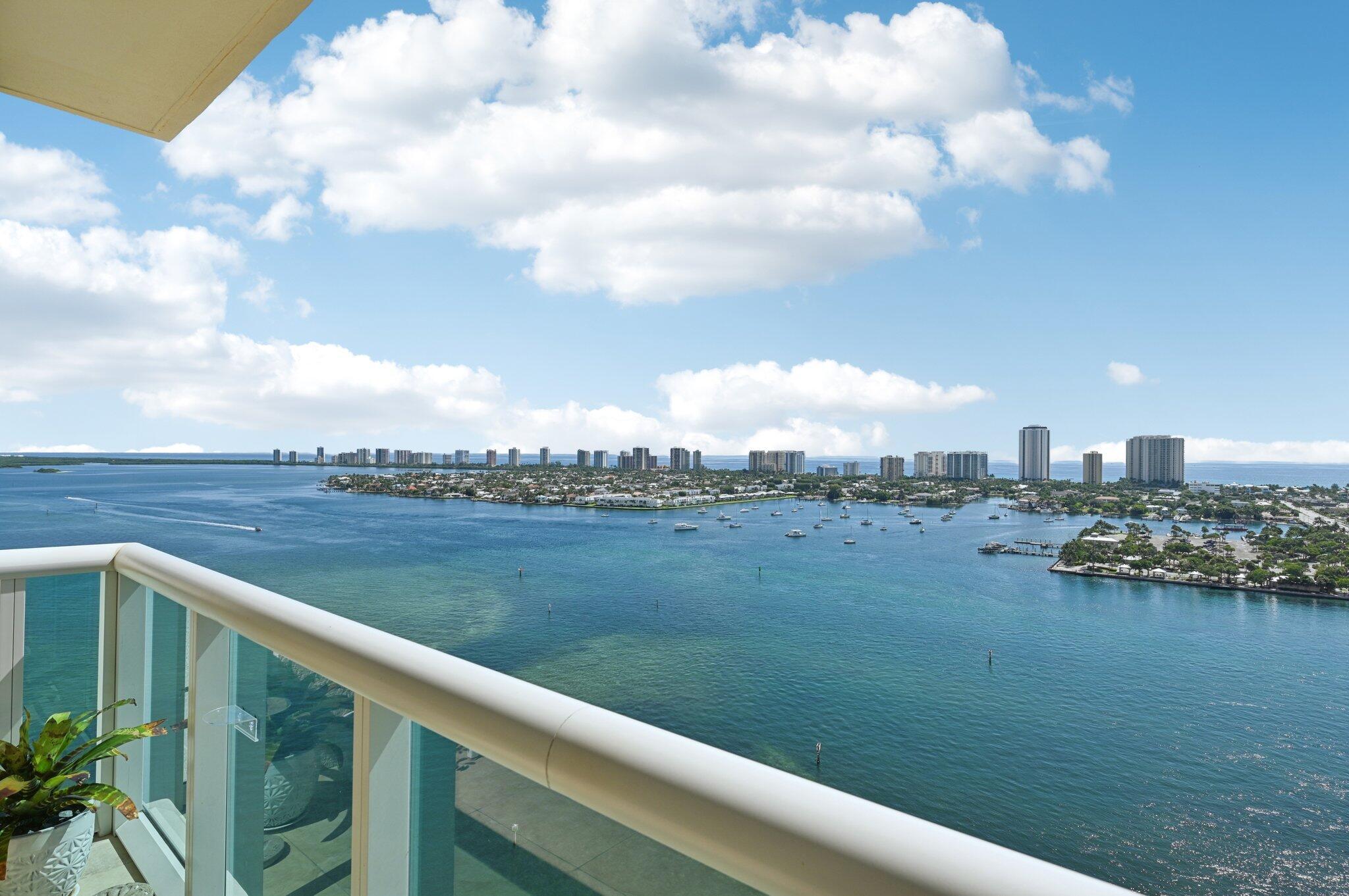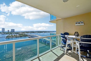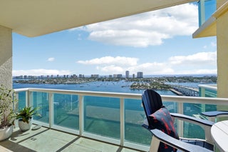 Gorgeous direct, unobstructed views of the Intracoastal Waterway and Atlantic Ocean from this preferred Ocean Tower, 23rd-floor residence at Marina Grande. Enjoy breathtaking sunrises and refreshing ocean breezes from your spacious balcony, living room, and owner's suite. Desirable split floor plan features 2 bedrooms plus a large den--ideal for a home office or 3rd bedroom. The chef's dream kitchen boasts seating for six at the countertop bar, new custom cabinetry, white quartz countertops, a turquoise glass backsplash, and premium Kenmore & KitchenAid stainless steel appliances, including induction cooktop, warming drawer, and convection oven. The owner's suite is a relaxing retreat with dual white custom vanities, a walk-in shower with frameless glass doors, a separate water closet, andhis & hers custom closets with additional built-in cabinetry. The guest bath has been fully remodeled with a white vanity, quartz countertop, stone vessel sink, and frameless glass shower doors. Additional highlights include an inside laundry room with added storage and a new sleek LG washer/dryer, full impact glass throughout, newer Bosch HVAC with Reme Halo air purifying system, custom interior doors with new casings, upgraded baseboards, and 24"x24" tile flooring throughout (NO carpet). This prestigious residence is offered fully furnished for the perfect turnkey sale. Marina Grande amenities include a heated lap pool, barbecue grills, poolside bar and fireplace, tennis, pickleball, bocce ball, and a waterfront clubhouse hosting community social event.