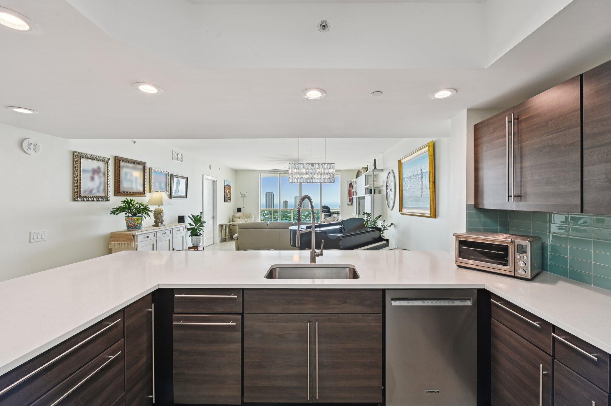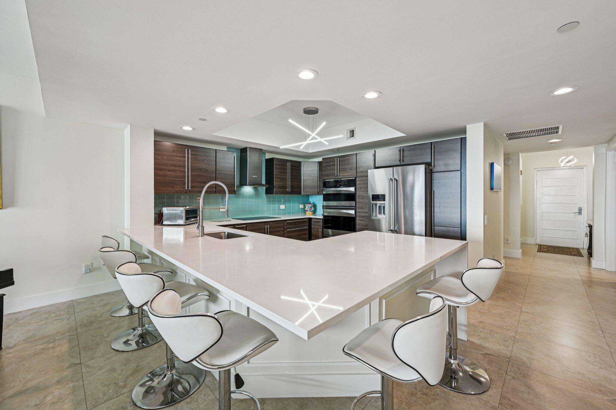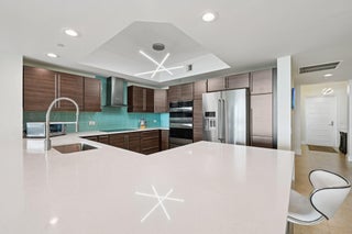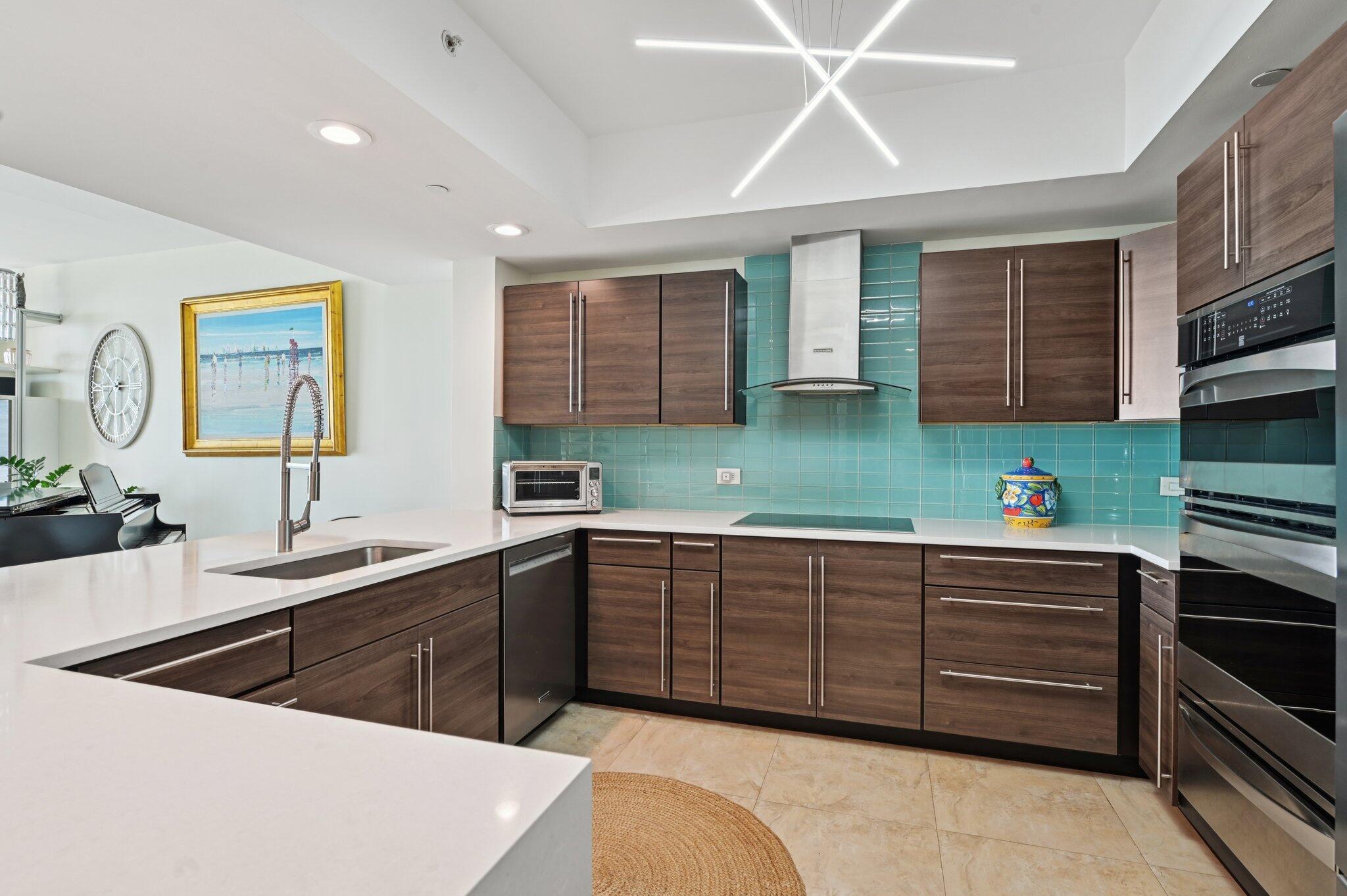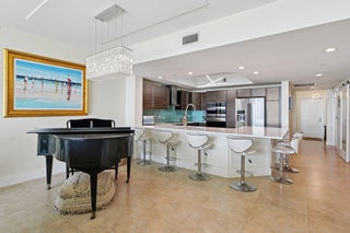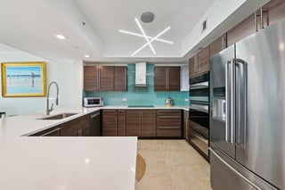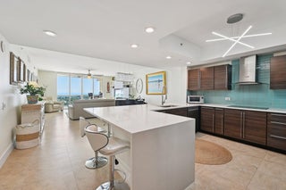 Gorgeous direct, unobstructed views of the Intracoastal Waterway and Atlantic Ocean from this preferred Ocean Tower, 23rd-floor residence at Marina Grande. Enjoy breathtaking sunrises and refreshing ocean breezes from your spacious balcony, living room, and owner's suite. Desirable split floor plan features 2 bedrooms plus a large den--ideal for a home office or 3rd bedroom. The chef's dream kitchen boasts seating for six at the countertop bar, new custom cabinetry, white quartz countertops, a turquoise glass backsplash, and premium Kenmore & KitchenAid stainless steel appliances, including induction cooktop, warming drawer, and convection oven. The owner's suite is a relaxing retreat with dual white custom vanities, a walk-in shower with frameless glass doors, a separate water closet, andhis & hers custom closets with additional built-in cabinetry. The guest bath has been fully remodeled with a white vanity, quartz countertop, stone vessel sink, and frameless glass shower doors. Additional highlights include an inside laundry room with added storage and a new sleek LG washer/dryer, full impact glass throughout, newer Bosch HVAC with Reme Halo air purifying system, custom interior doors with new casings, upgraded baseboards, and 24"x24" tile flooring throughout (NO carpet). This prestigious residence is offered fully furnished for the perfect turnkey sale. Marina Grande amenities include a heated lap pool, barbecue grills, poolside bar and fireplace, tennis, pickleball, bocce ball, and a waterfront clubhouse hosting community social event.