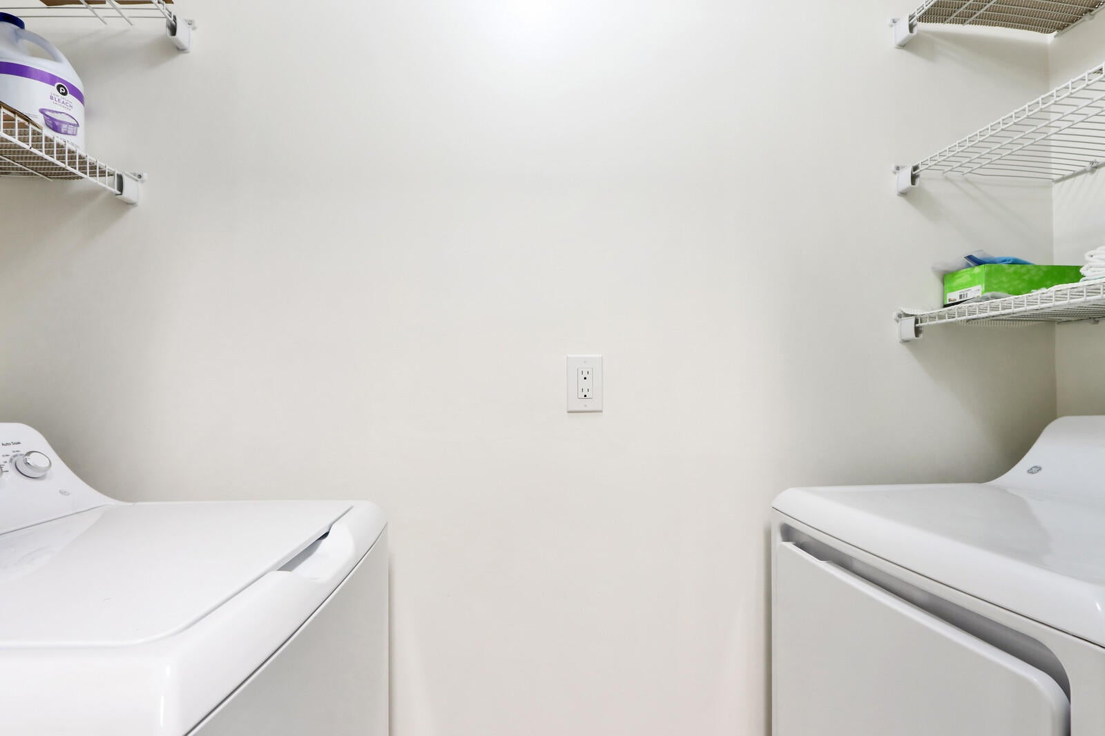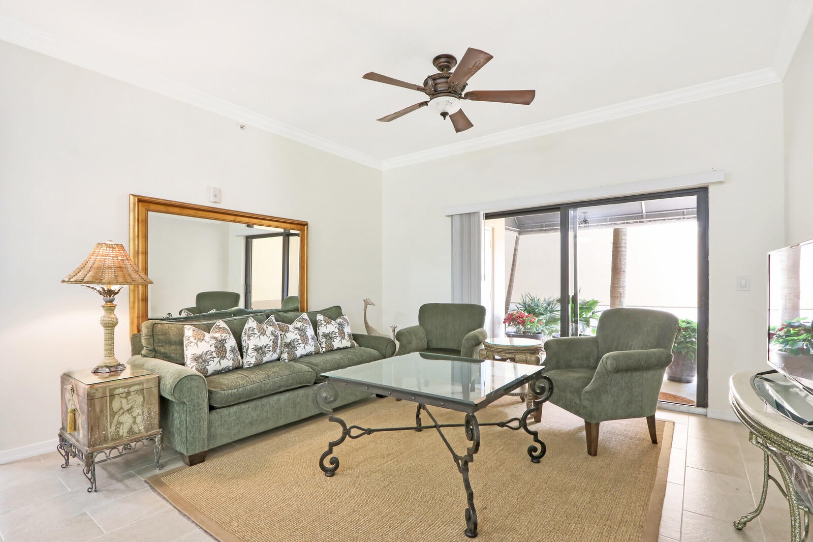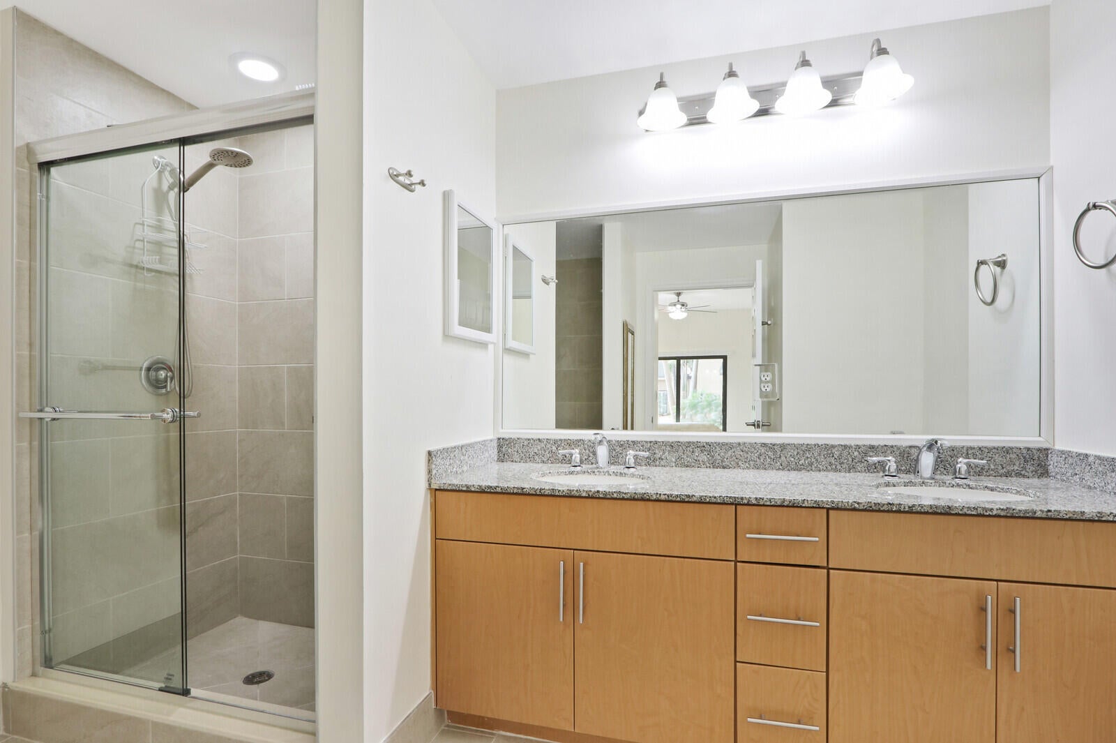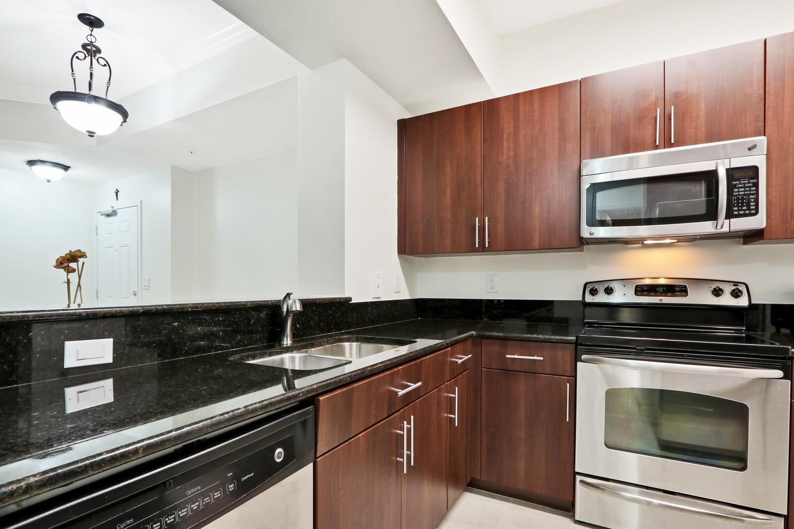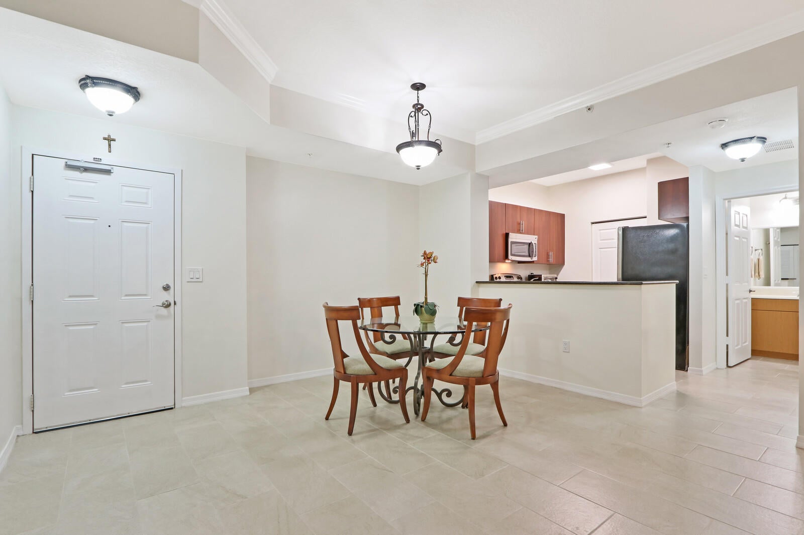 Spacious tastefully furnished 2 bedroom condo overlooking tropical courtyard. Two assigned parking spaces, one steps away in the covered garage. Ceiling fans, crown molding and impact windows. Updated tile floors throughout the unit. Open kitchen with granite counters and stainless steel appliances. Inside laundry room with washer/dryer. Unit is on the first floor for easy access. Large TVs in Living Room and Master. Master Bath has separate shower, large tub and two sinks. Second bath has shower. Midtown amenities include a beautiful clubhouse, with gym, business center, heated pool/spa and pickleball/tennis court. All of this in a secure gated building close to I-95 and the Turnpike. Walking distance to restaurants, grocery stores and the shops of Midtown.