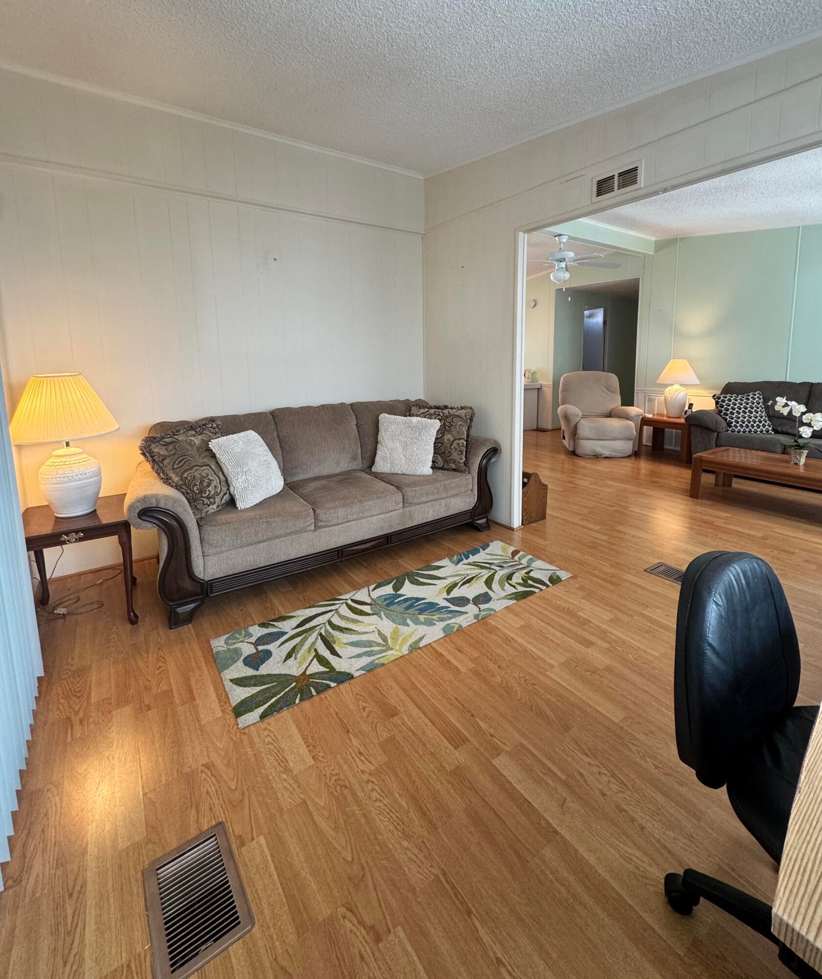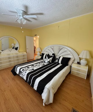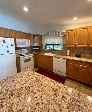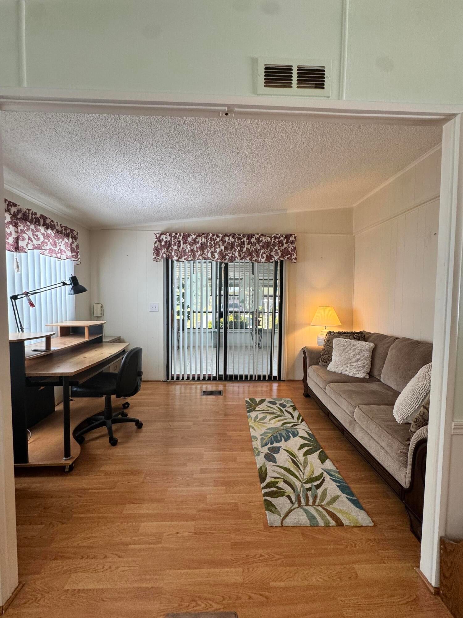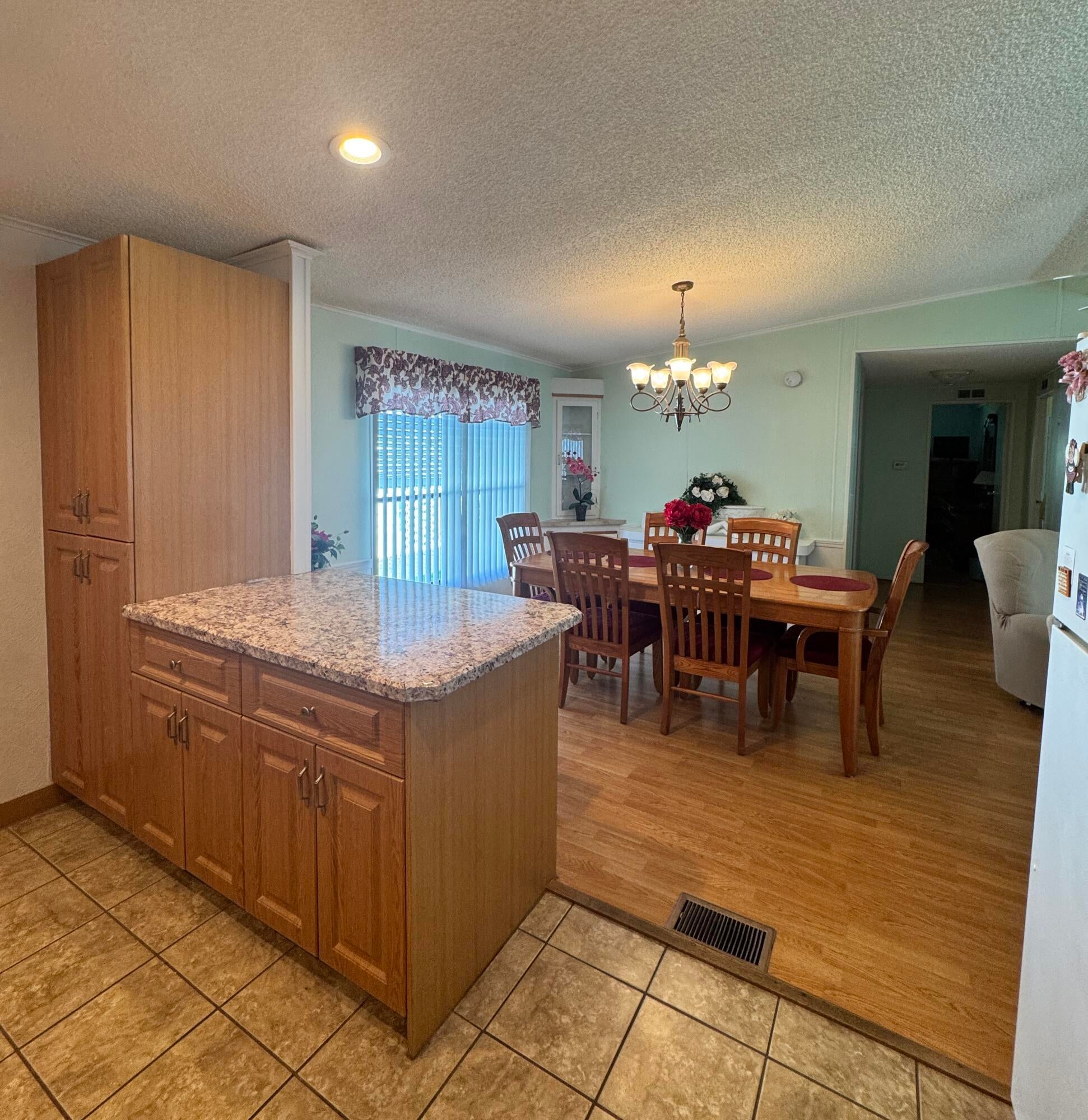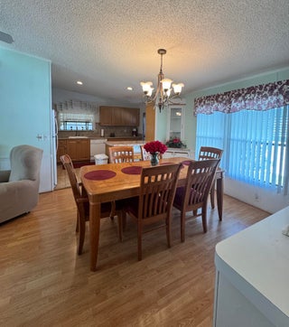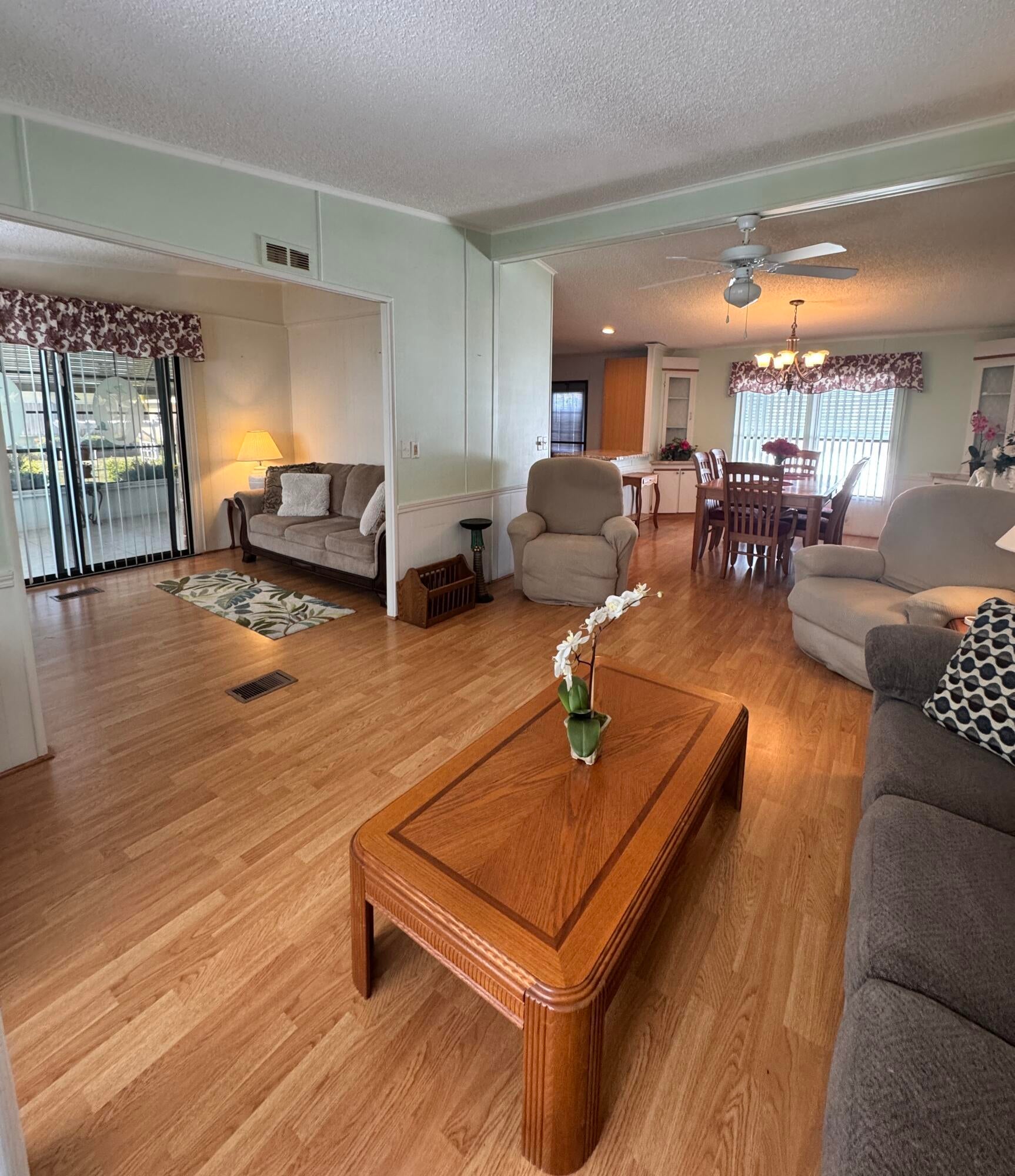 Lovely 2-bedroom 2-bath home in the desirable 55+Spanish Lakes Country Club community. This home has a spacious front Florida room. A den that can be used as an office or living room. The kitchen has granite countertops with an eat-in bar area. The dining room has two built-in shelves for added storage. This home has an extra-long carport as well as a shed. Home backs up to a wooded area for added privacy. HOME IS BEING SOLD FURNISHED AND IS TURN-KEY. NO CARPET! Lawn care, trash removal and golf included in lot rent.18-hole golf course, two pools, tennis, pickleball, bocce ball, shuffleboard, and much more. Must See!
