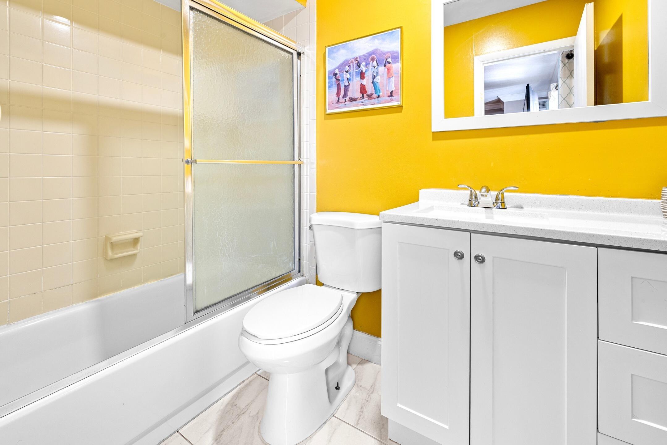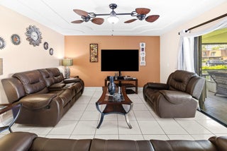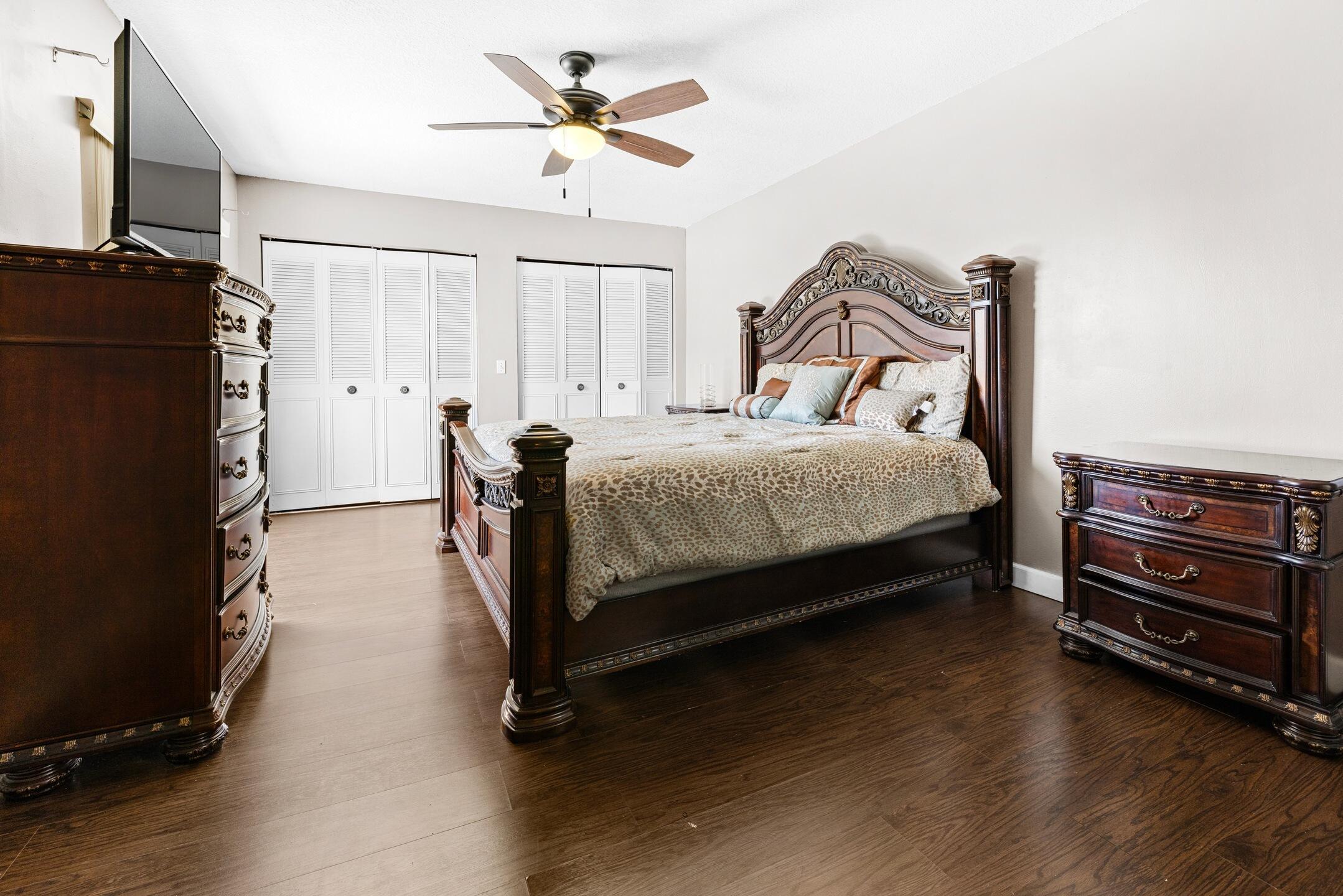 Welcome home to this beautifully designed 3-bedroom, 2.5-bath builder's model townhouse in the desirable Villages of Turnberry community. The spacious open floor plan features tile flooring throughout the main living areas, with one bedroom and a guest half bath conveniently located on the first floor. Upstairs, you'll find two generous primary suites, each with its own private bath and walk-in closet. Additional highlights include a full-size washer and dryer, extra storage, a private deck, and a screened patio perfect for relaxing outdoors. Accordion shutters provide peace of mind, while the community pool is just steps from your back door.The Villages of Turnberry is a well-maintained community in Lake Worth, FL, offering a serene neighborhood feel with low HOA fees. Ideally located just minutes from the Florida Turnpike, residents enjoy easy access to shopping, dining, parks, golf courses, and the area's beautiful beaches.