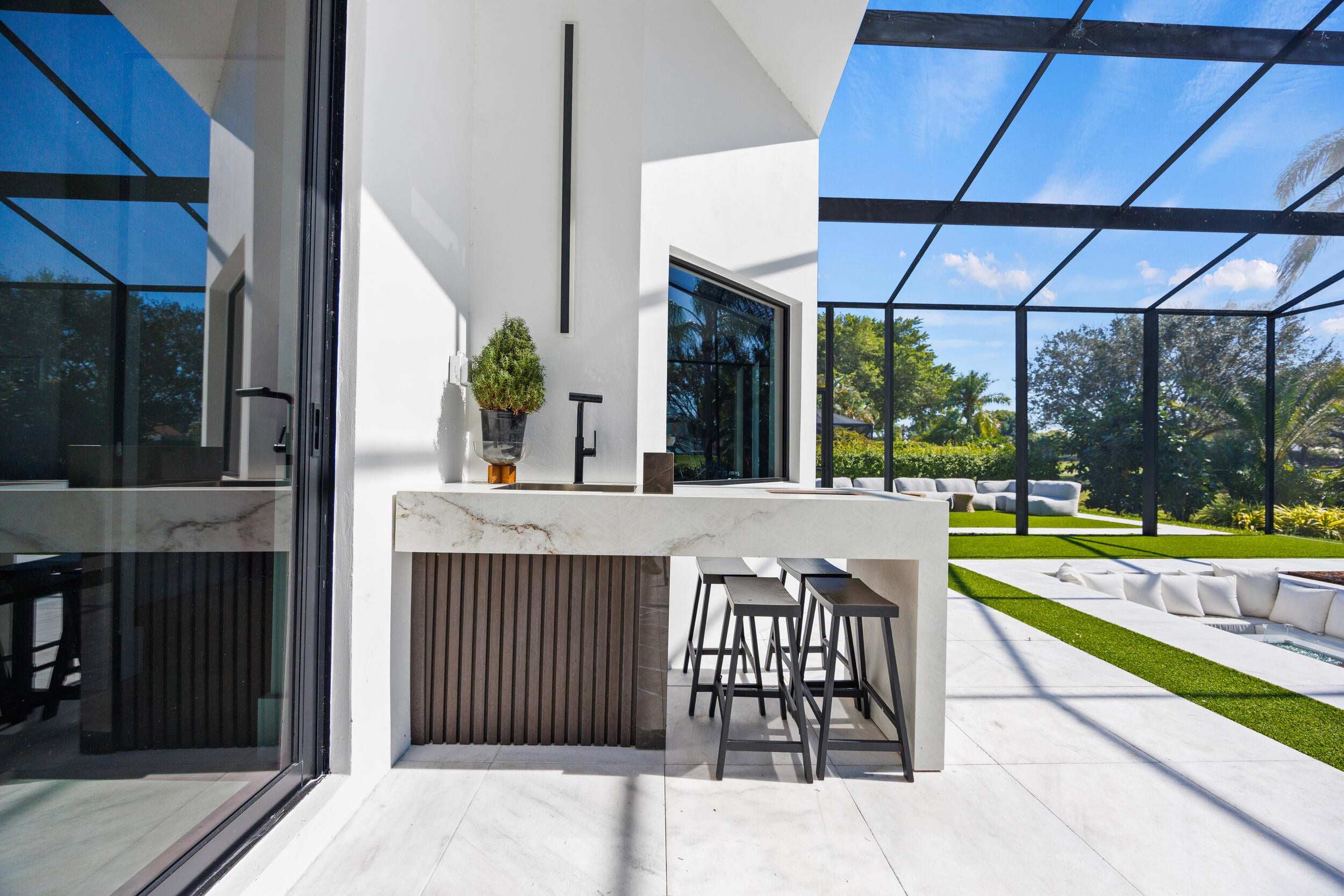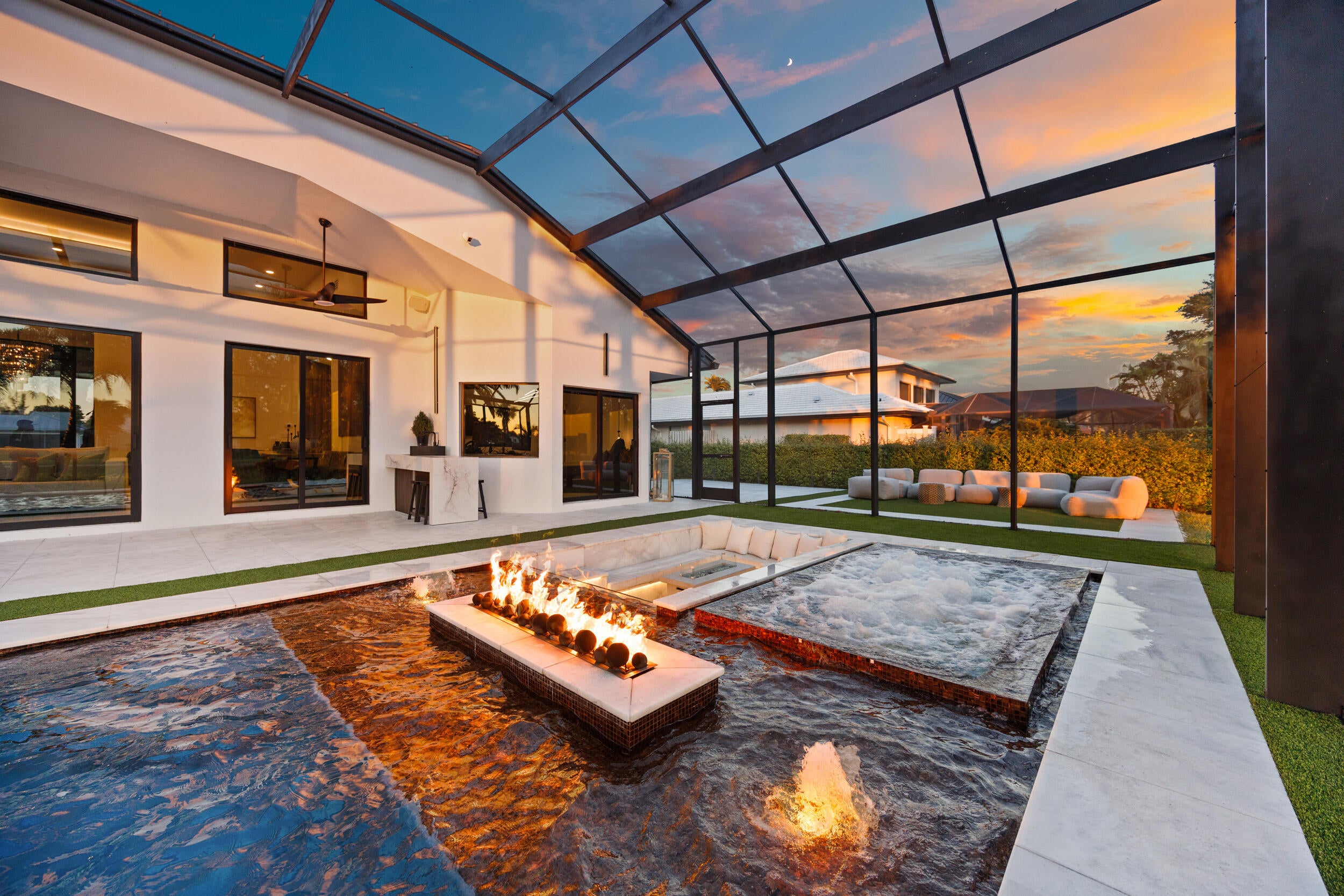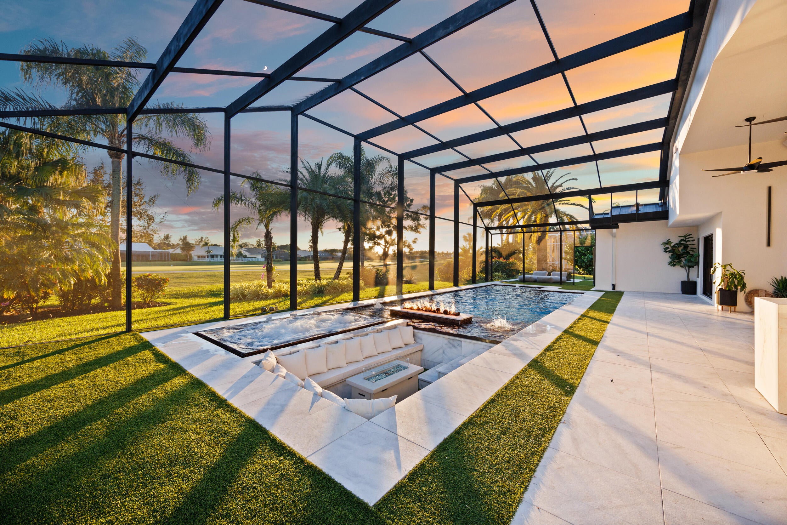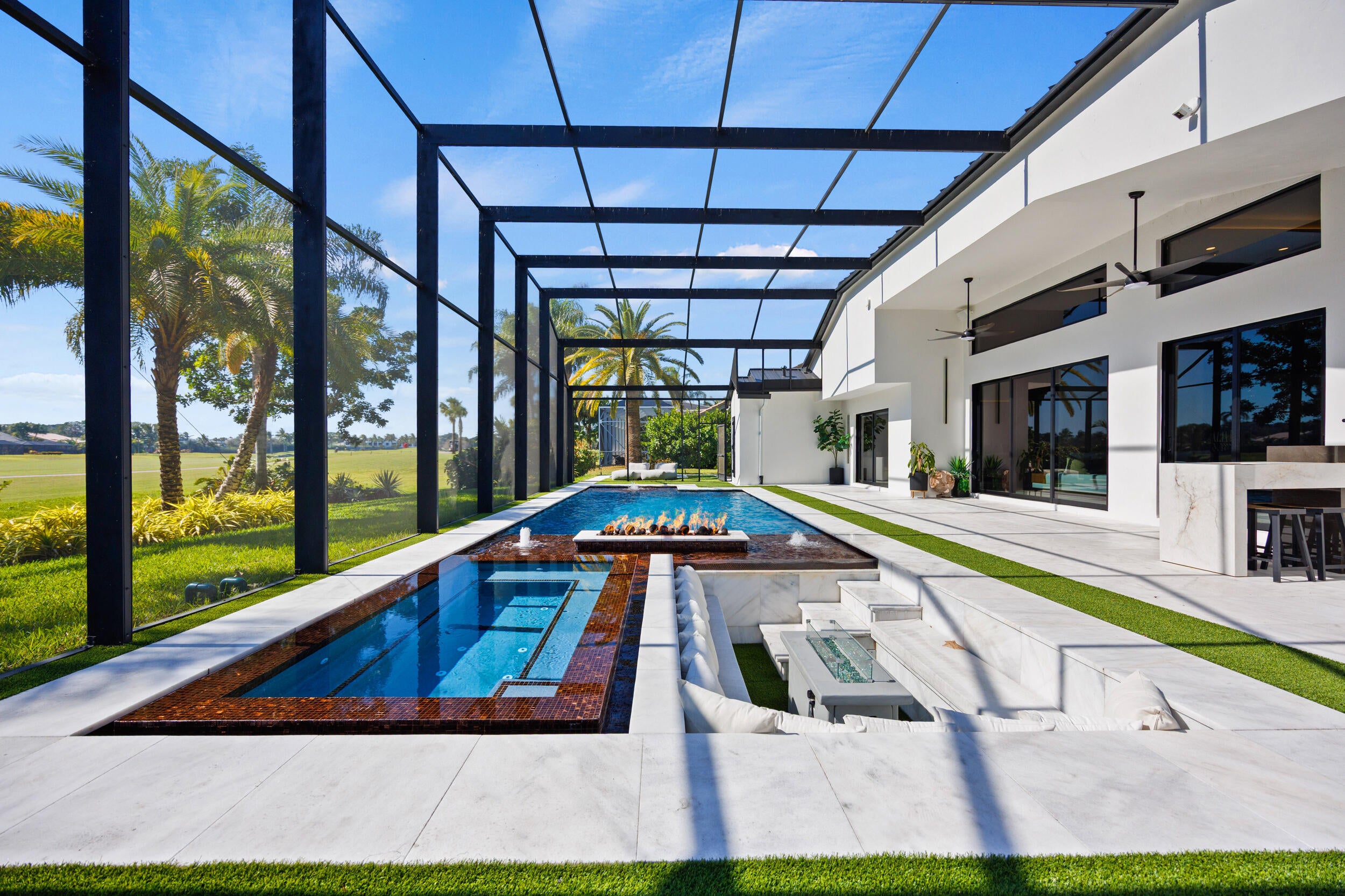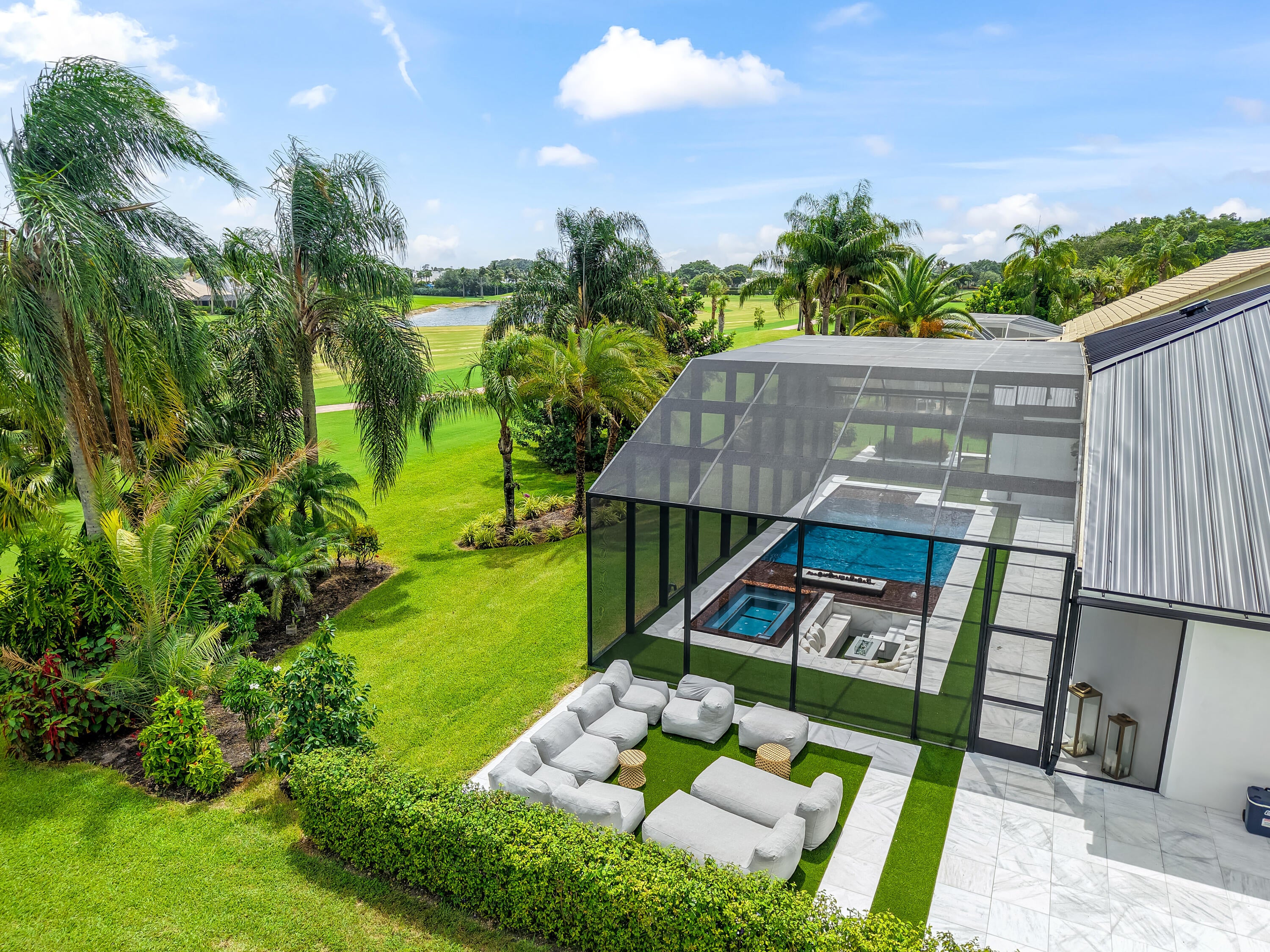 From the moment you arrive, this fully renovated home captivates with a floating water walkway and front glass pivot door. Inside, soaring 19-foot ceilings, open-concept living, and impeccable high-end finishes set the stage for sophisticated living. The residence features 4 en-suite bedrooms with custom closets, a spacious primary bedroom with wet-room and dream closet, a chef's kitchen with Wolf appliances, bespoke cabinetry, and quartzite island, a modern Taj Mahal stone fireplace, as well as a 300-bottle wine cellar and man cave garage that elevate lifestyle and entertainment. Step outside to your private resort oasis with a saltwater pool, sunken lounge, in-pool fire pit, swim jets,10-person spa, and cabana steam bath, all framed by lush tropical landscaping and golf course views.This stunning Fully Renovated Home with No Detail Overlooked can be yours. Exterior & Structural "' 'New Standing Seam Metal Roof - Installed 2024 (50+ year life expectancy, energy-efficient, hurricane-rated) "' 'Complete Foam Insulation System - Installed 2024 for maximum energy efficiency "' 'Smooth Stucco Finish - Entire exterior refinished 2024 "' 'Freshly Painted Interior & Exterior - 2024 "' 'Hurricane Impact Protection - Installed 2024 "' 'High-performance impact windows & doors (energy-efficient & noise reducing) "' 'Insulated hurricane-rated garage doors (2-car + golf cart garage) "' 'Expanded Circular Driveway - New paver driveway & walkway with modern hardscaping (2024) Mechanical, Electrical & Plumbing "' 'Dual High-Efficiency HVAC Systems - 2 new units with condensers (2024) "' 'Complete HVAC Ductwork Replacement - Optimized for air quality and comfort (2024) "' 'Smart Control Thermostats - Multi-zone management (2024) "' 'HVAC UV Light Protection "' 'Upgraded 200-Amp Electrical Panel - Installed 2024 "' 'Whole-House Surge & Lightning Protection System - 2024 "' 'Smart Hybrid Electric Water Heater - Energy-efficient with intelligent controls (2024) "' 'Full Repiping Throughout Entire House - Installed 2024 (all new plumbing supply lines) "' '500-Gallon Underground Propane Tank - Installed 2024 (dedicated to range & generator-ready) "' 'Tesla EV Charger - Installed 2025 "' 'Dedicated Irrigation Well - Installed 2025 with rust-prevention system "' 'Smart Irrigation System - Wi-Fi controlled (2025) "' 'Smart Smoke & Carbon Monoxide Detectors - Throughout Lighting & Home Automation "' 'Fully Integrated Smart Home System - Lighting, security, sound, and climate control "' 'Smart Switches & Dimmers - Throughout "' 'LED Recessed High-Hat Lighting - Energy-efficient & modern design "' 'Motorized Window Treatments - Programmable for privacy & efficiency "' 'Smart Sonos Whole-House Audio System - Interior & exterior zones Pool & Outdoor Living "' 'Modern Pool Resurfacing & Custom Tile Design - 2024 "' 'Smart Automated Pool System - Jets, bubbles, LED lighting, automated controls (2024) "' 'Electric Pool Heater & Saltwater System - 2024 "' 'Champagne Spa / Hot Tub - Built-in with dual temperature zones, foot massage pump, and targeted hydrotherapy blowers "' 'Integrated Sunken Lounge - With built-in gas fireplace & modern seating "' '20' High Screen Enclosure - With UV protection (new) "' 'Modern Cabana Bathroom & Steam Room Shower "' 'Outdoor Wet Bar - Built-in with modern finishes "' 'Professionally Designed Landscaping - With LED low-voltage lighting "' 'Ring Security System - Exterior cameras & smart doorbell Interior Features "' 'Modern Custom Walk-In Wine Cellar - Insulated glass, floating racks, capacity ~300 bottles "' 'Custom European-Style MDF Panels & Hidden Doors - For a sleek, modern aesthetic "' 'Custom Kitchen Cabinetry & Bar Pantry - With integrated panel-ready appliances "' 'Luxury Appliance Package: Wolf 60" Professional Fuel Range, Wolf 24" Built-In Microwave Drawer, Signature 60" Refrigerator & Freezer (60" built-in), Asko Dishwasher, LG Tower Washer & Dryer "' 'Modern Custom Closets - Designer MDF-built with integrated lighting "' 'Porcelain Tile Flooring - Oversized 24" x 48" slabs throughout "' 'Smart Toilets - Multiple units with bidet features & ambient lighting "' 'Designer Bathrooms - LED backlit mirrors, premium fixtures, and modern spa-style finishes "' 'Smart Frame TVs - Flush-mounted, integrated entertainment "' 'Interior Fireplaces - Contemporary electric fireplaces with LED accent lighting A Private Club Lifestyle- Golf Paradise!!! Boca Woods Country Club is nestled in the heart of Boca Raton and just minutes from two miles of beautiful white sandy Boca Raton Beaches. Located in Palm Beach County, Boca Raton offers residents an assortment of casual and fine dining, world-class shopping and entertainment venues. Boca Woods Country Club welcomes members to Palm Beach living, in an upscale community, to enjoy an active lifestyle that is set in a relaxed and comfortable golf and country club private residential community. It's a family friendly community where neighbors become friends and friends are like family. Members embrace a complete lifestyle with an array of resort-style amenities including 36-holes of spectacular golf, 7 Har Tru tennis courts, pickleball, modern Fitness Center, card rooms and an elegant-contemporary clubhouse for dining and socializing. Lifelong friendships are made while enjoying a life well lived. Championship Golf in Boca Raton Boca Woods Country Club is home to two of the best golf courses in Southeast coast of Florida. Boca Woods is a golfer's paradise with two of the lowest density courses in the Boca Raton area. Golfers have five sets of tees to choose from, plus recently installed family tees. At Boca Woods, you are sure to enjoy easy golf access to tee times and frequent games. New and seasoned golfers benefit from Boca Woods resources. Newly renovated practice facilities include chipping, putting and driving range facilities, and a newly installed range hood providing plenty of space for golfers to practice in the shade. The Woods Course, de