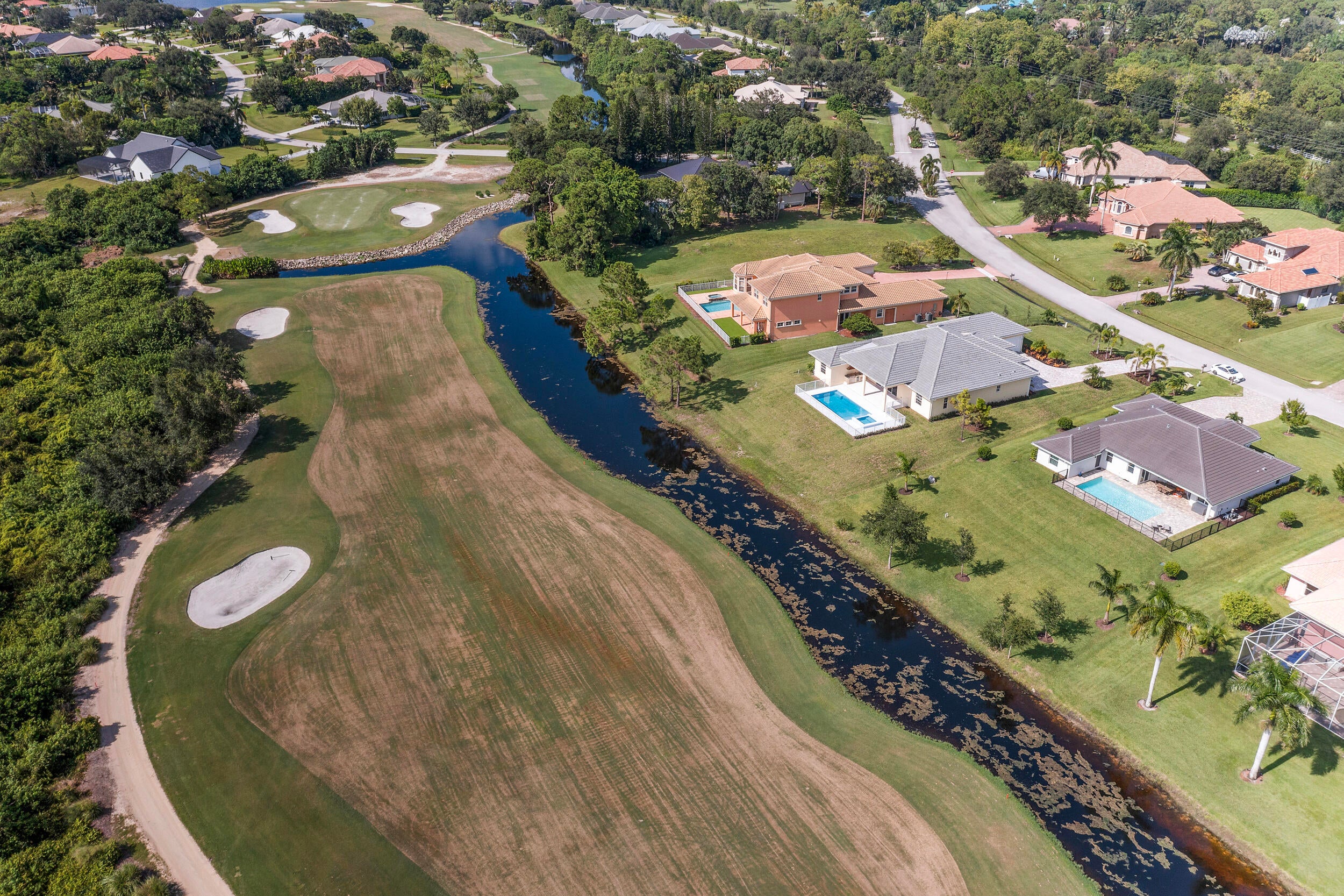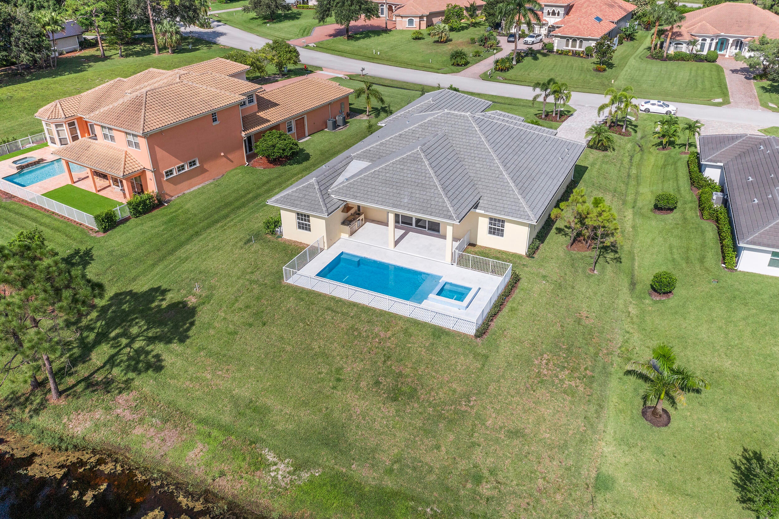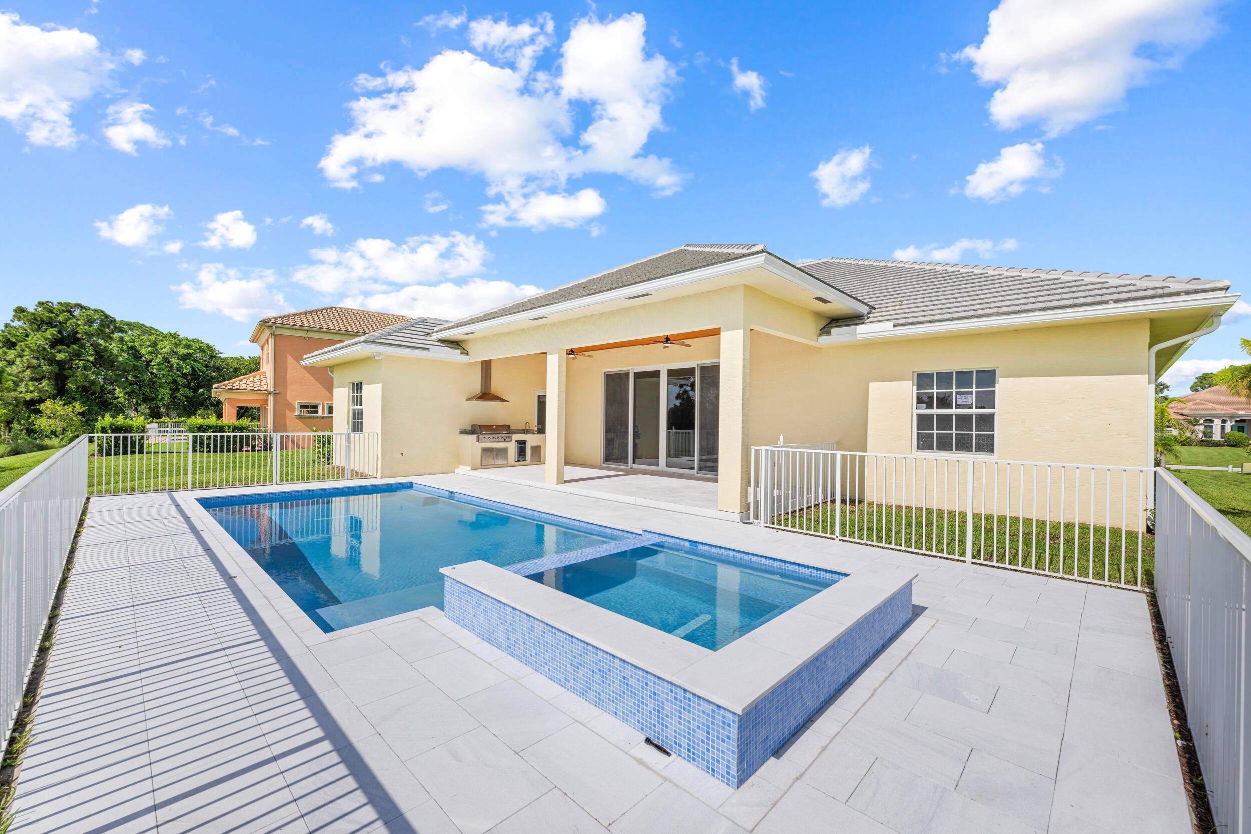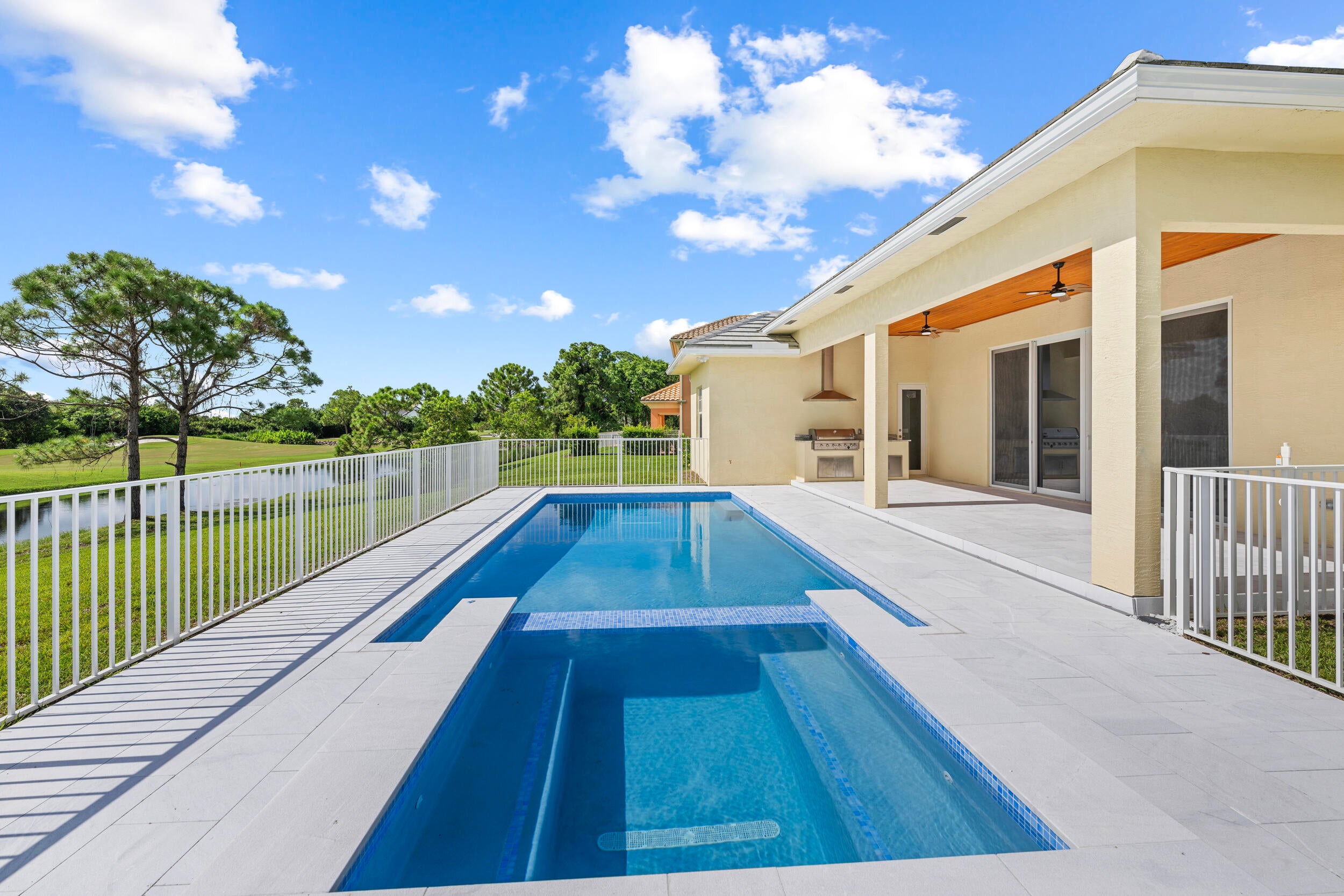 Brand-new modern estate in Palm City's prestigious Cobblestone community, overlooking the recently renovated Cape Club golf course. This home sits on a half-acre lot with low HOA fees and was designed for both elegance and comfort. Featuring soaring 10-14 ft. ceilings, crown molding, upgraded tile throughout, and a bright open-concept layout. The chef's kitchen boasts a large island and premium appliances, while the split plan includes a private guest suite off the pool. Enjoy the ultimate Florida lifestyle with a spacious outdoor living area, summer kitchen, and resort-style pool with raised spa, all capturing panoramic golf course views. Don't miss this rare opportunity to own New Construction in a gated golf course community!