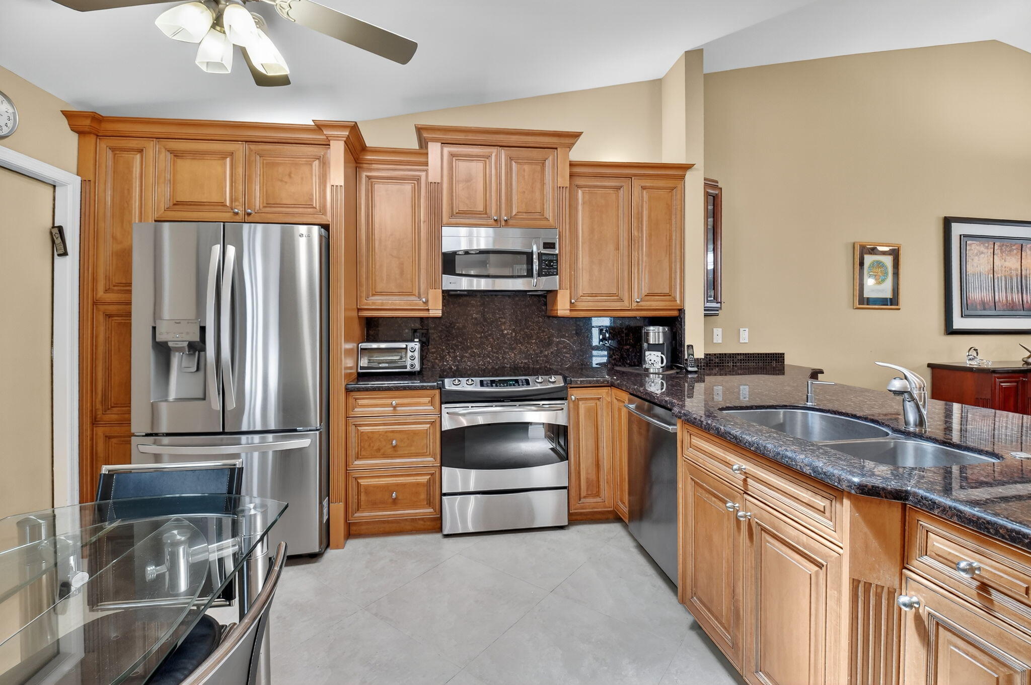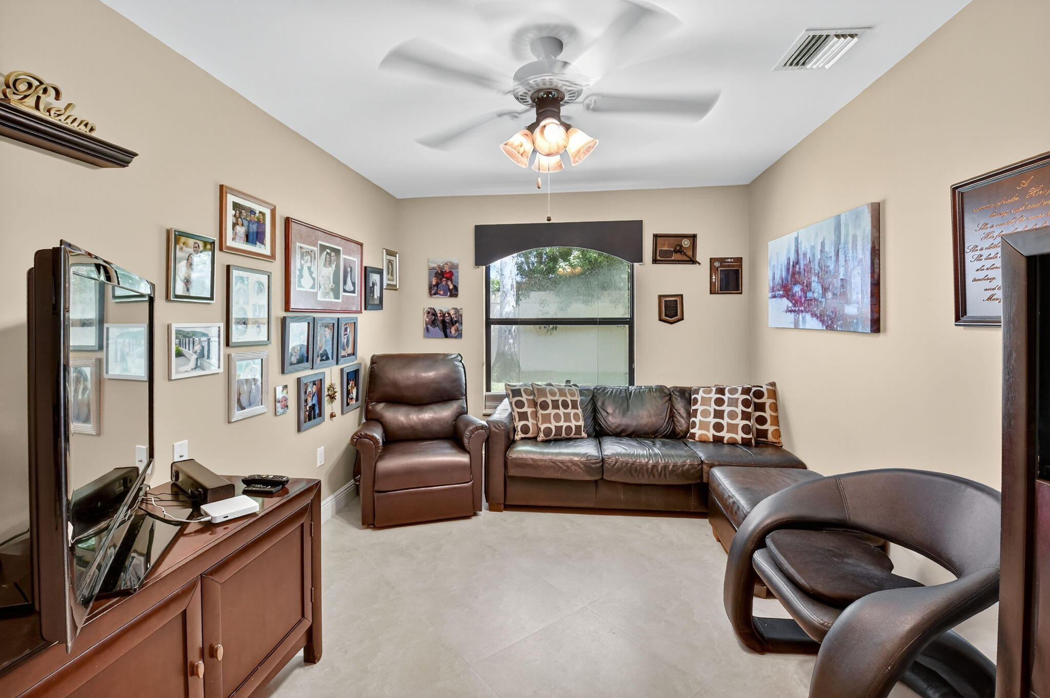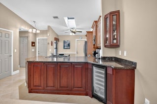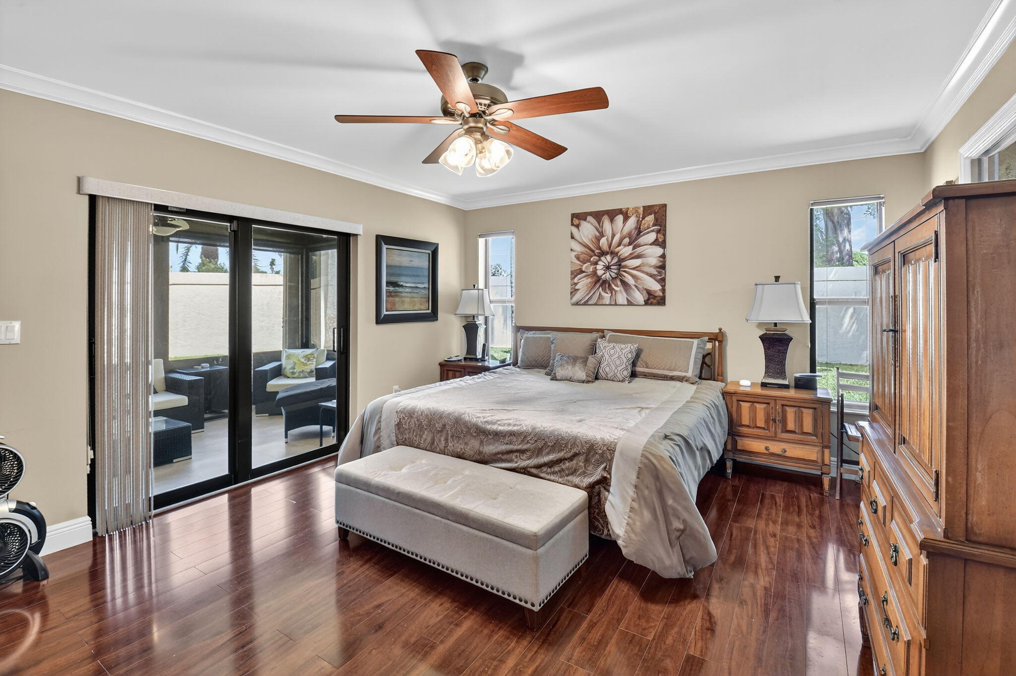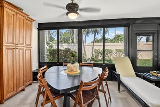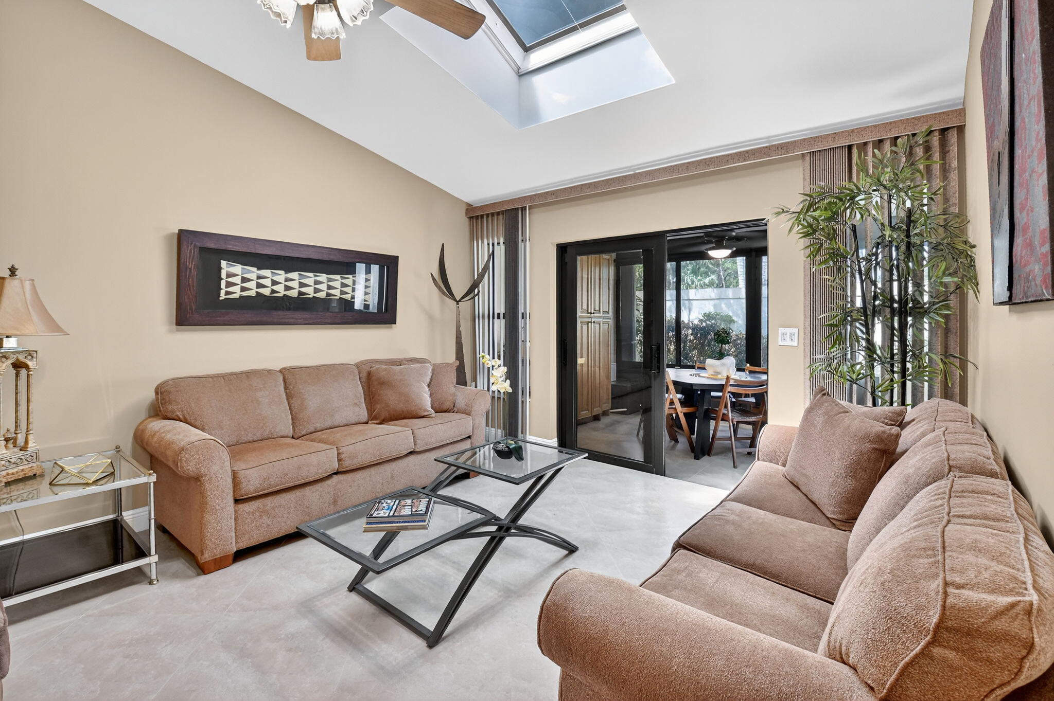 Beautifully remodeled and meticulously maintained 3/2 villa w/ fully enclosed & air-conditioned patio adding to the living square footage (1769 sq feet including enclosed patio area). This home has a gorgeous custom wood kitchen w/ all the bells & whistles including granite countertops, updated appliances, & a wine refrigerator. Porcelain floors throughout living area & laminate/tile flooring in the bedrooms. Add'l updates include impact windows & doors, updated bathrooms, 2022 a/c, 2021 hot water heater, crown molding, smooth ceilings, large pantry, full size washer & dryer, & the list goes on. FULLY FURNISHED (w/ some exclusions). Corner lot w/ lots of privacy & greenspace. Palm Chase Lakes is an active 55+ community w/ resort style amenities. Walking distance to houses of worship.