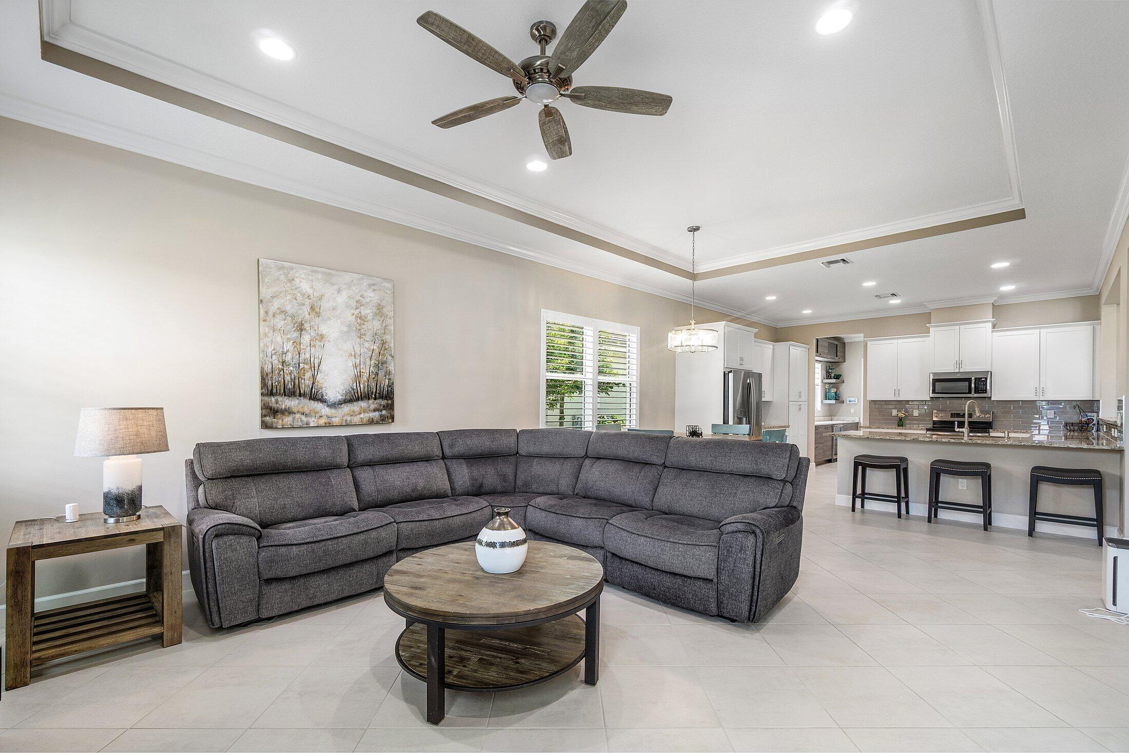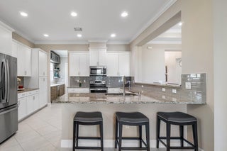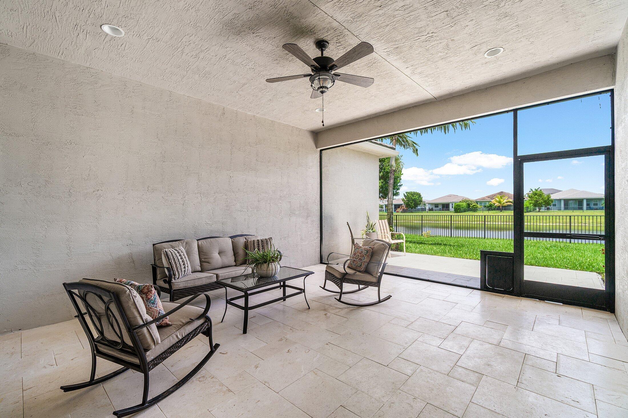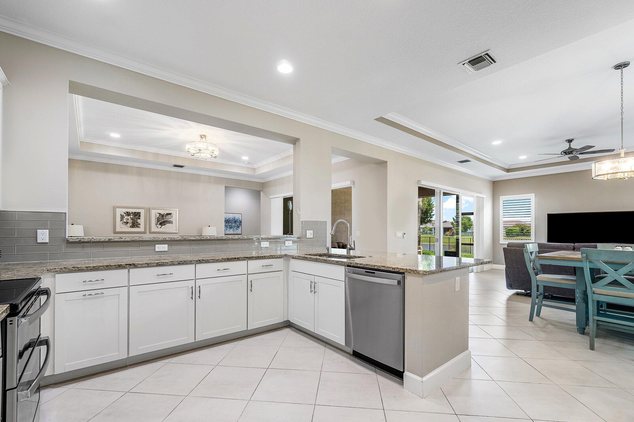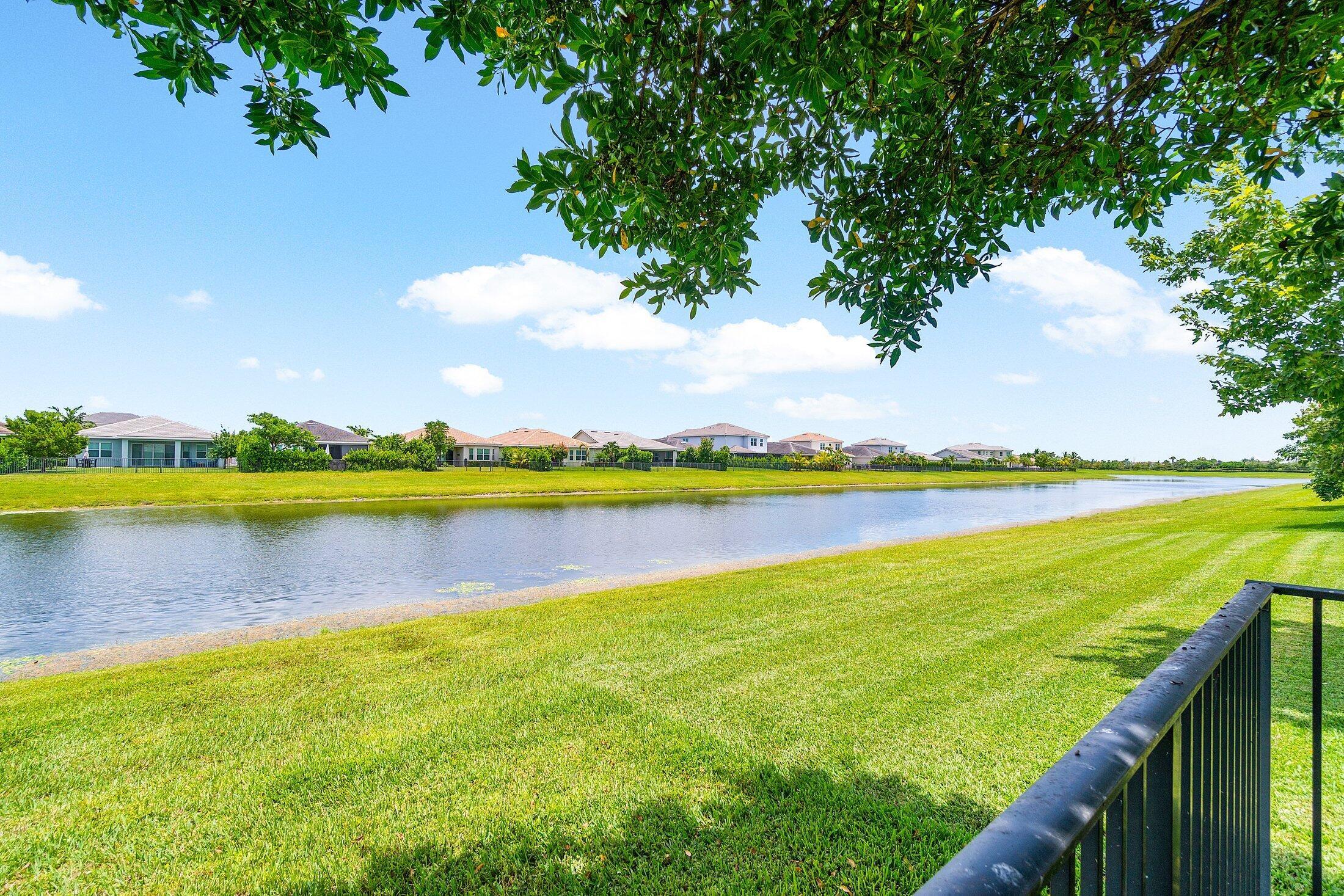 Save time and money with a move-in ready home boasting over $30,000 in valuable upgrades including an oversized driveway, epoxy garage floors, plantation shutters and motorized blinds, custom built-in cabinets and closets, plus a screened travertine porch. Furniture negotiable! Beautifully designed CBS construction featuring 4 bedrooms, 3 bathrooms, 4th bed currently a den that can be converted back to bedroom, and a 3-car garage. An impressive foyer opens to the formal living room and adjacent dining room with a custom built-in buffet, conveniently located next to the chef's kitchen that showcases white cabinetry, stainless steel appliances, and granite countertops. The Kitchen flows into the casual dining area and family room....with stunning views of the lush landscaped yard and lake. The secluded master suite offers serene water vistas, two custom walk-in closets, and a large, well-appointed bathroom. Additional bedrooms are located off a private hallway with a den featuring a custom built-in cabinet with fridge and microwave, previously set up with a barn door for use as an in-law suite. This side of the home also includes a utility room and a dedicated one-car garage. Additional features include impact windows, custom closets throughout, extra-wide driveway, and an open patio perfect for enjoying the lakefront setting. Across the road from The Hammocks is Westlake Adventure Park, offering extensive amenities including a splash pad, lagoon pool, tower slide, lodge pool, concert pavilion, pump park, playground, basketball courts, bocce and lawn games, food truck court, snack shack, and morea true resort-style lifestyle at your doorstep!
