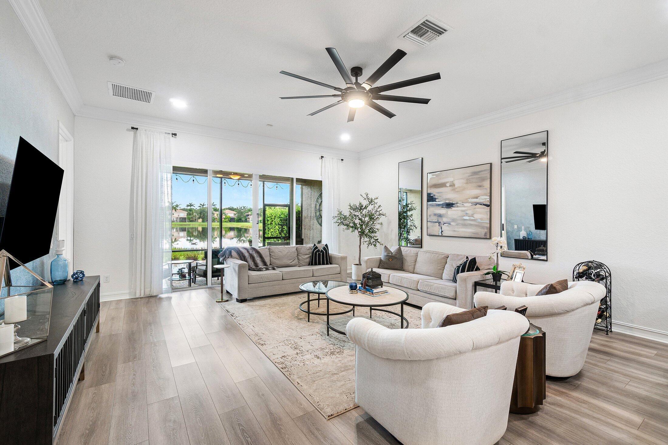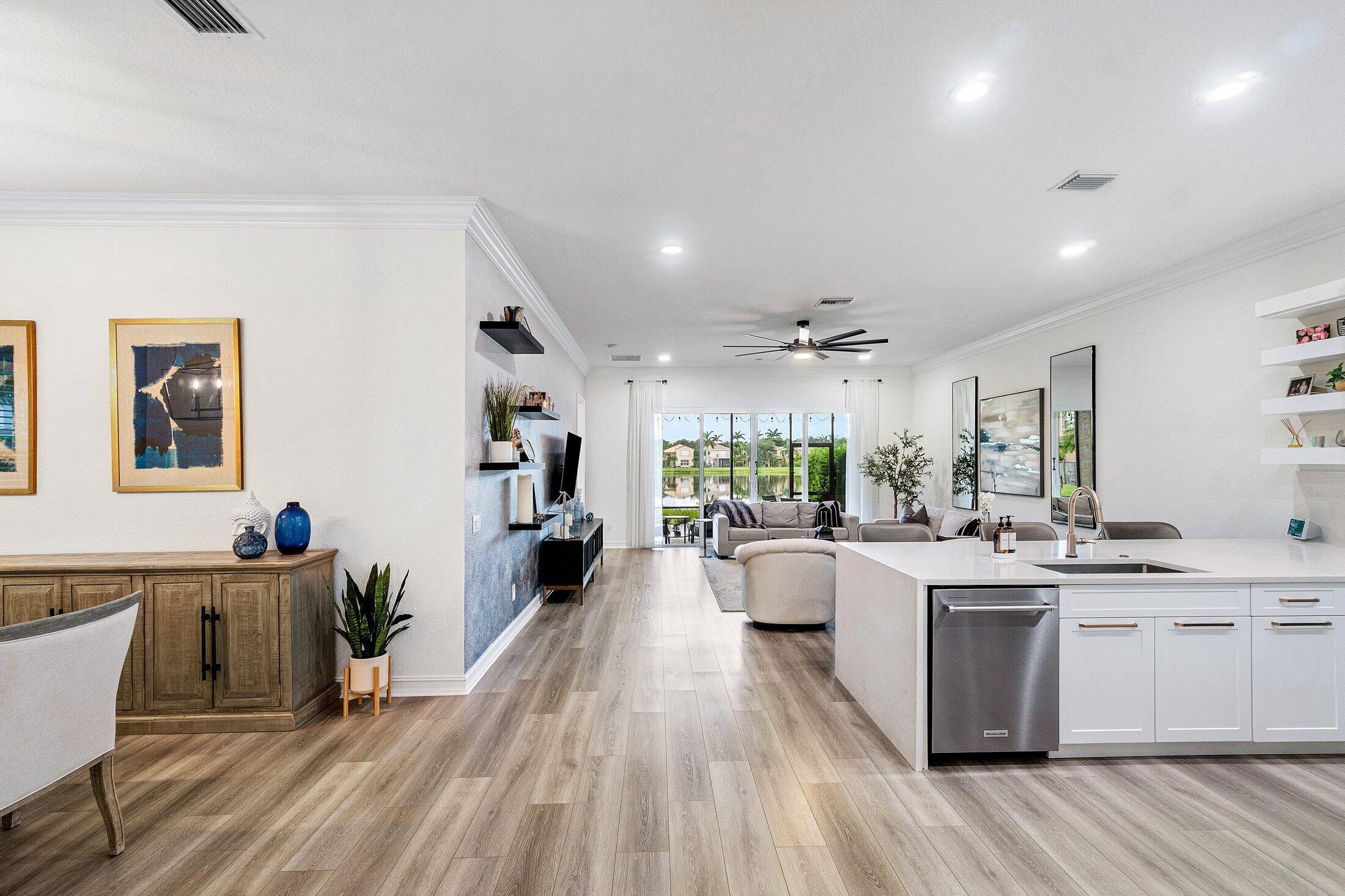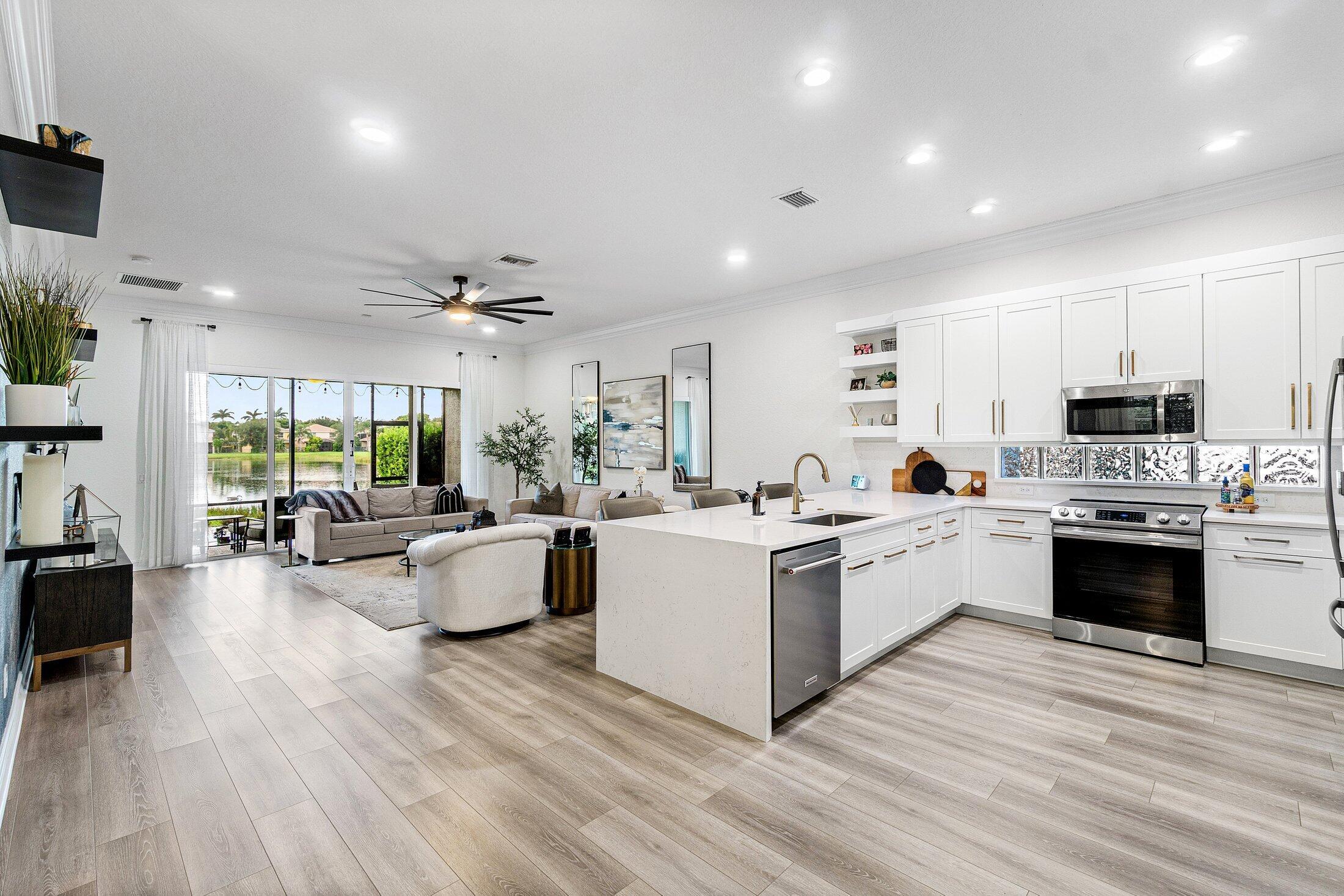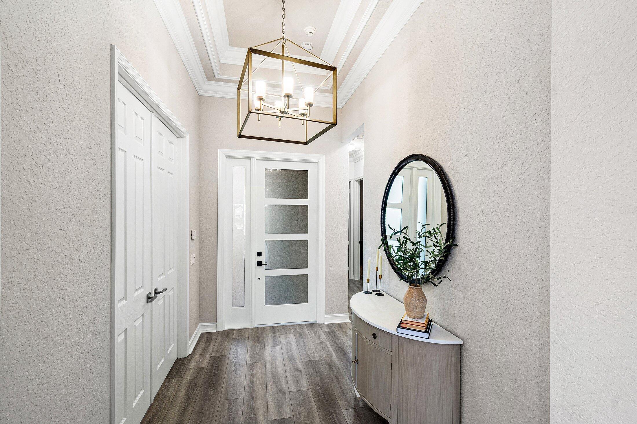 Take in breathtaking lake views in this beautifully renovated open-concept home. The kitchen features white cabinetry, quartz countertops and backsplash, pull-out drawers, an oversized island, and a spacious pantry with custom shelving. The family room overlooks serene sunsets, complemented by a formal dining room ideal for entertaining. Double door den off the foyer. The primary suite offers a Roman tub, separate shower, dual vanities. Additional upgrades include custom closets in all 3 bedrooms, designer lighting and fans, lush landscaping, and luxury vinyl flooring throughout. The laundry room is complete with custom cabinetry. Additional features include crown molding, accordion shutters, an extended driveway on an easement lot, epoxy-coated garage floor, overhead storage, EV Charge