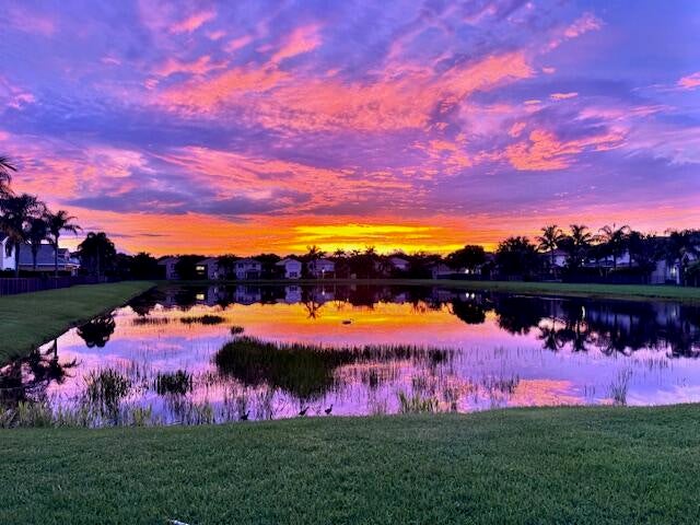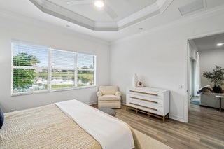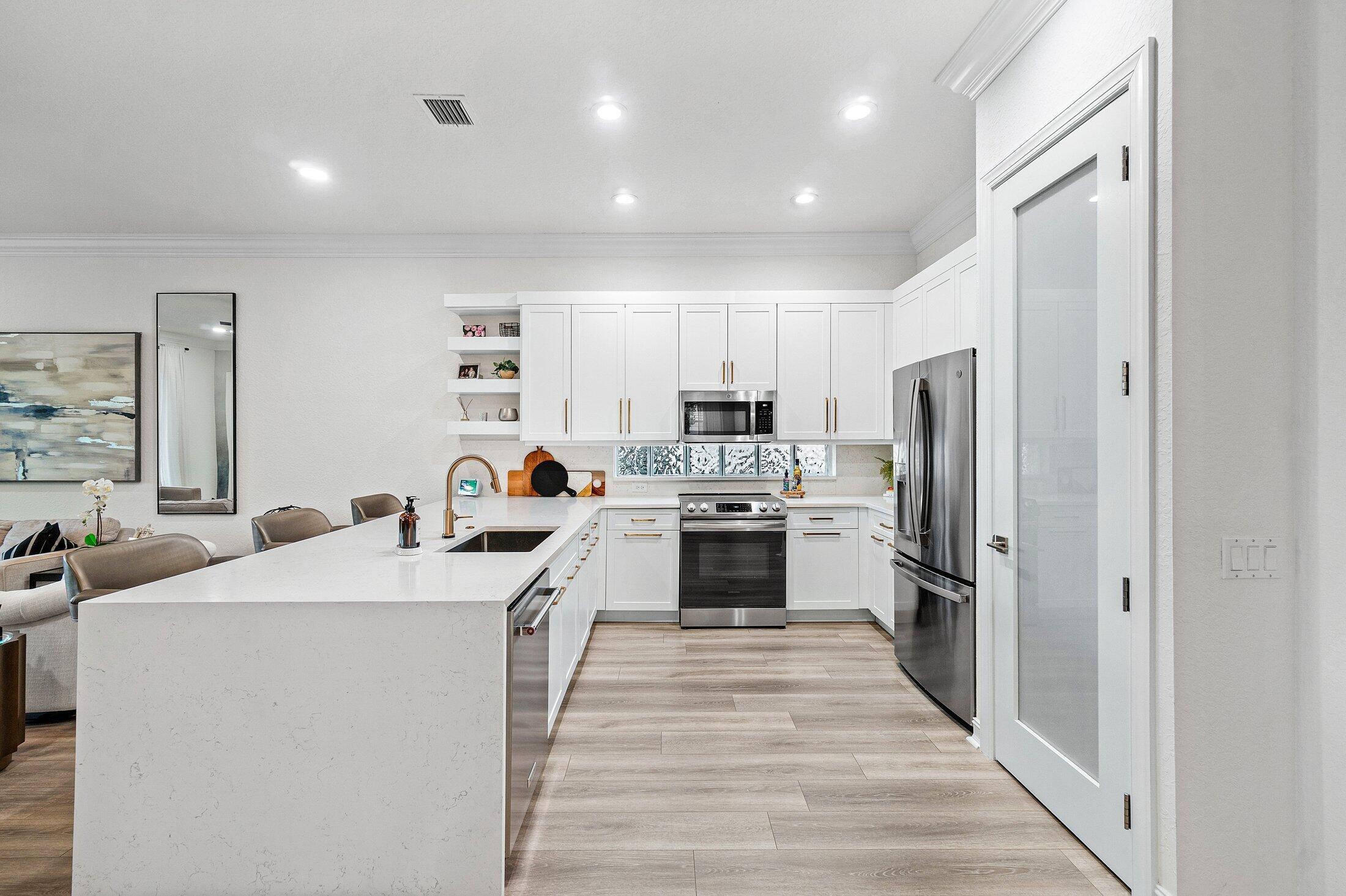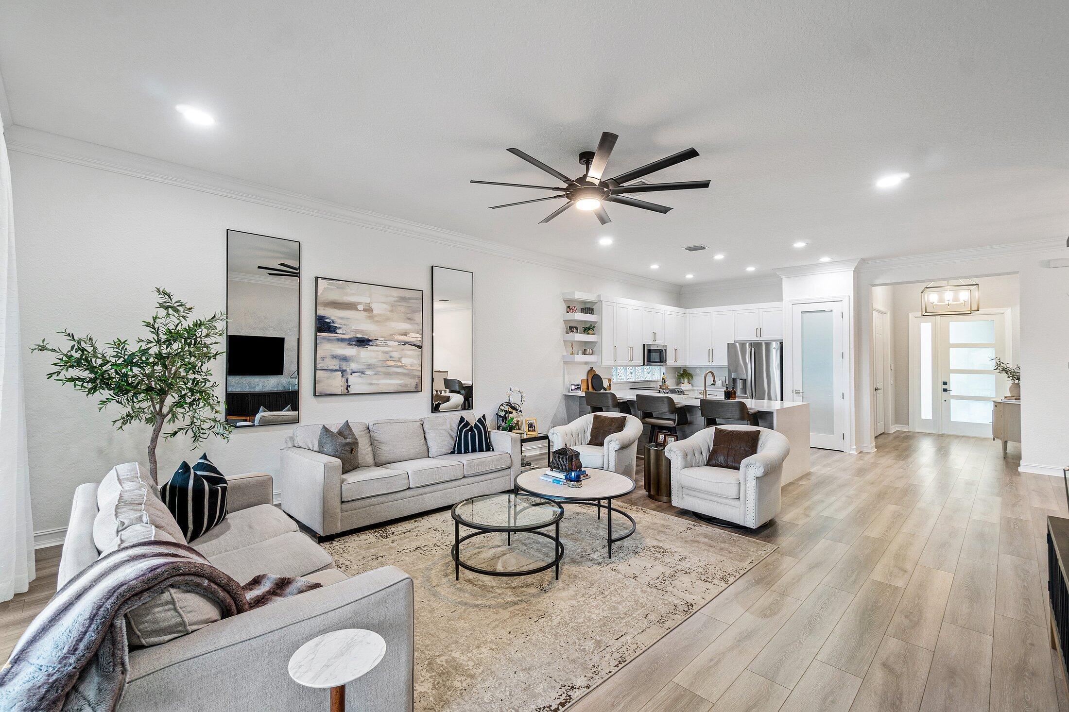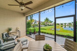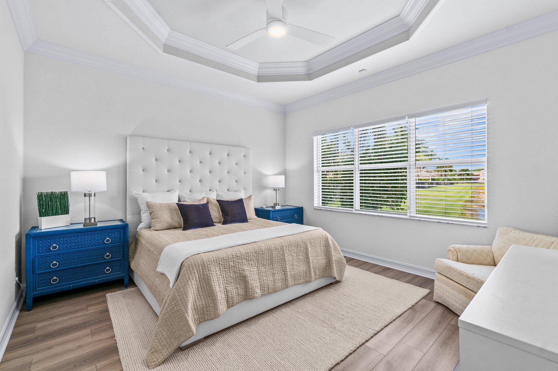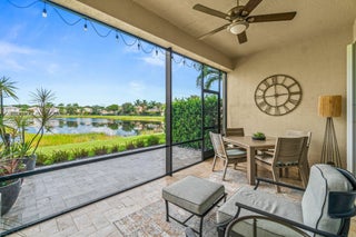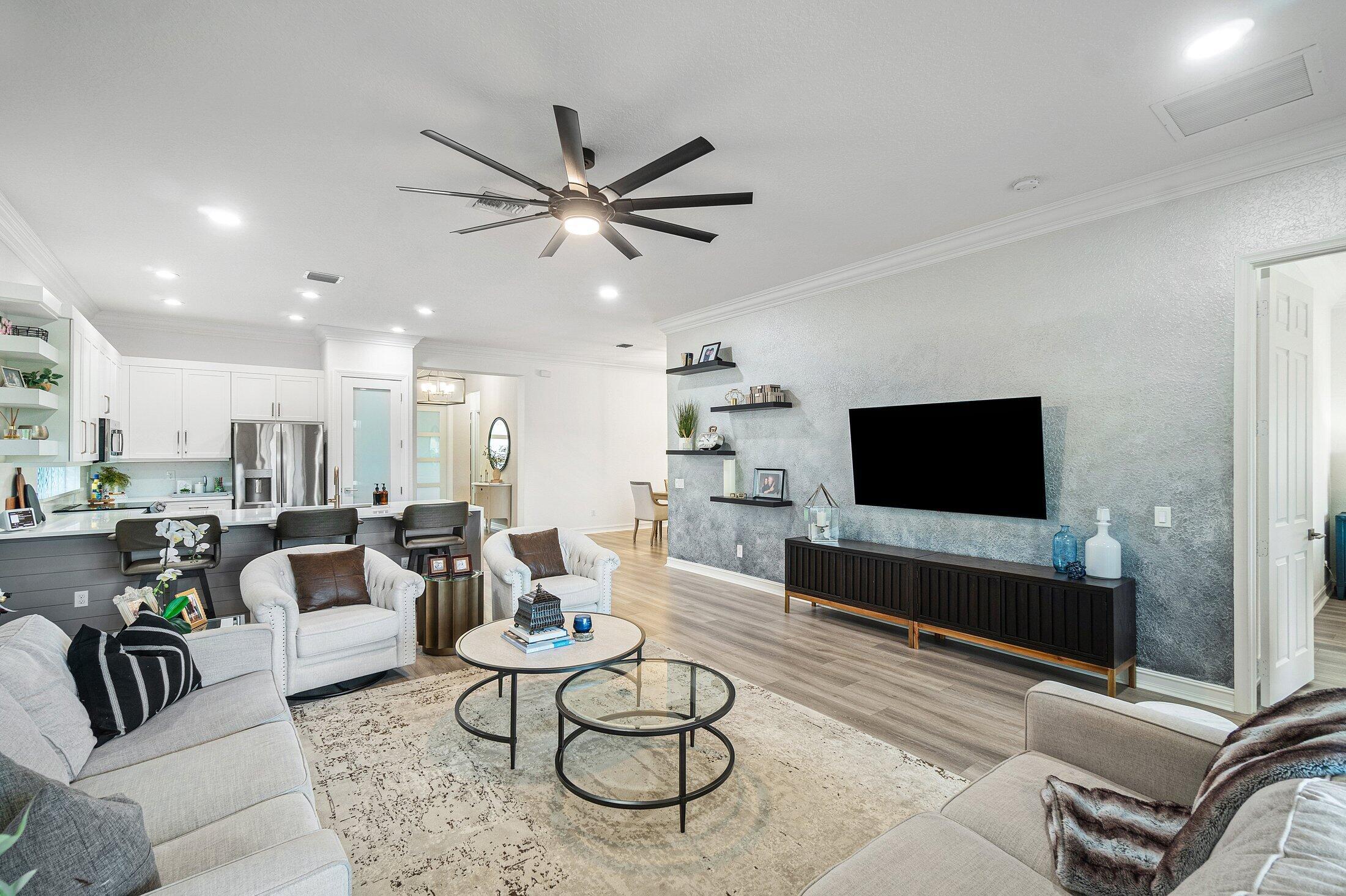 Take in breathtaking lake views in this beautifully renovated open-concept home. The kitchen features white cabinetry, quartz countertops and backsplash, pull-out drawers, an oversized island, and a spacious pantry with custom shelving. The family room overlooks serene sunsets, complemented by a formal dining room ideal for entertaining. Double door den off the foyer. The primary suite offers a Roman tub, separate shower, dual vanities. Additional upgrades include custom closets in all 3 bedrooms, designer lighting and fans, lush landscaping, and luxury vinyl flooring throughout. The laundry room is complete with custom cabinetry. Additional features include crown molding, accordion shutters, an extended driveway on an easement lot, epoxy-coated garage floor, overhead storage, EV Charge