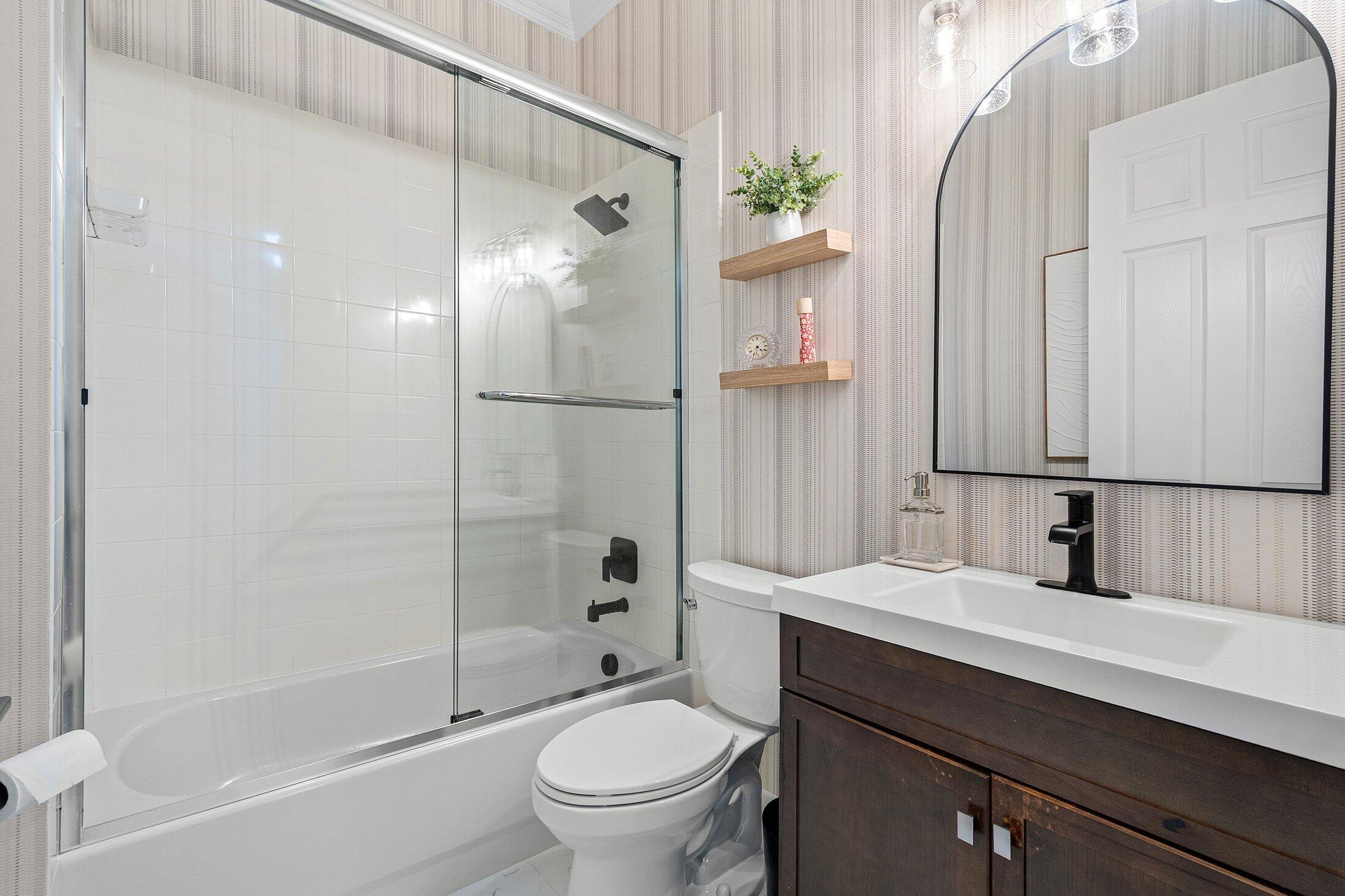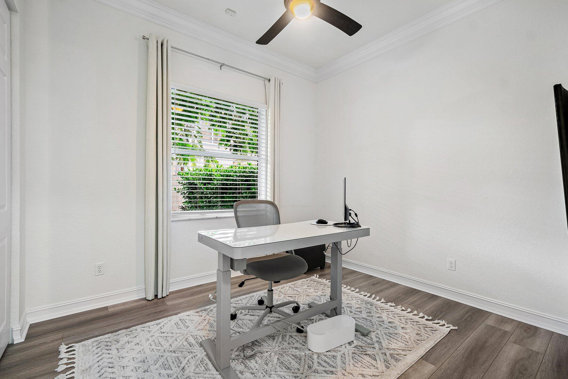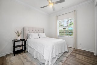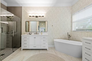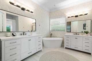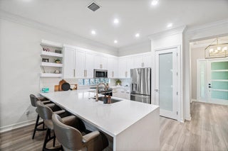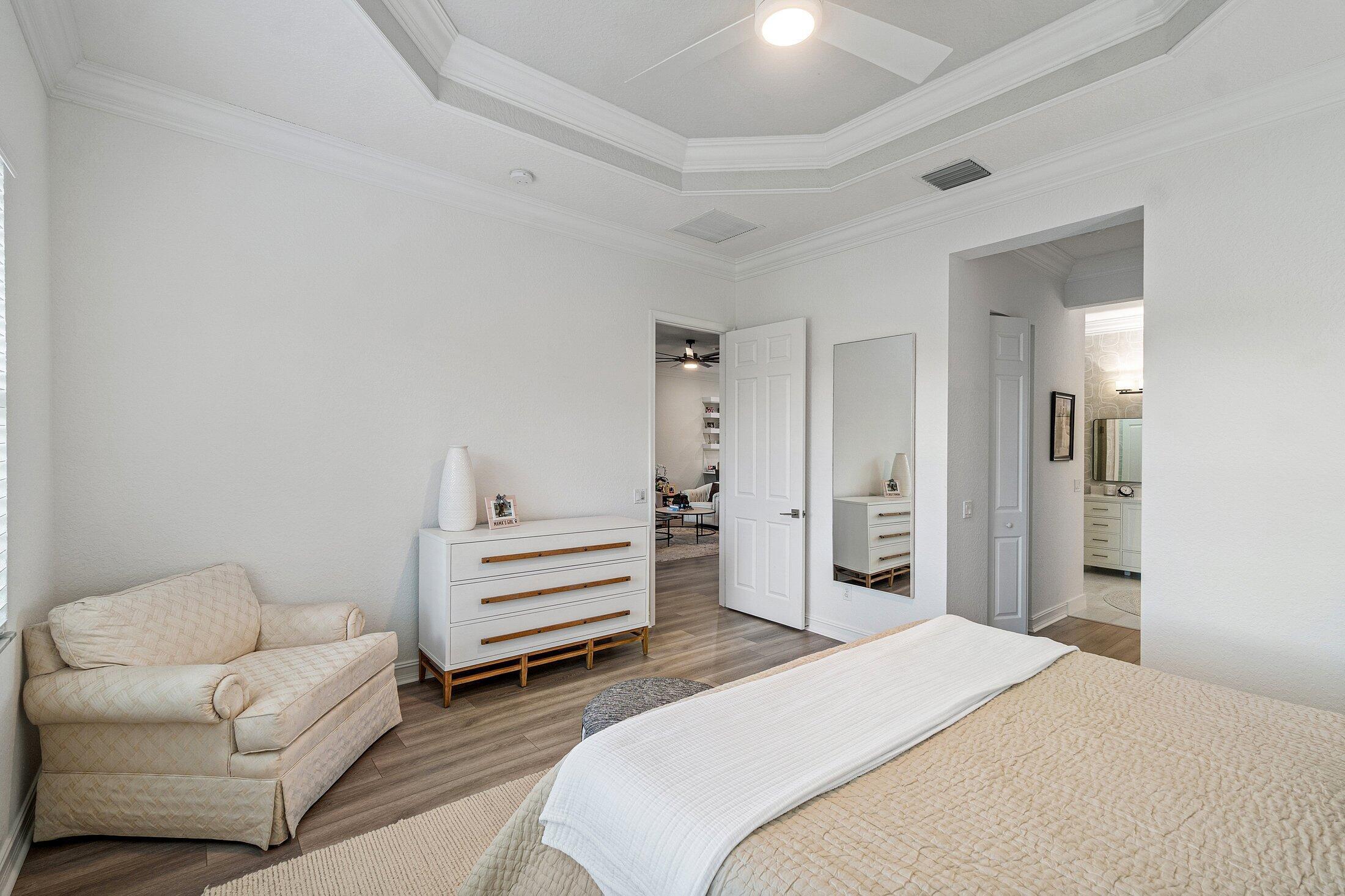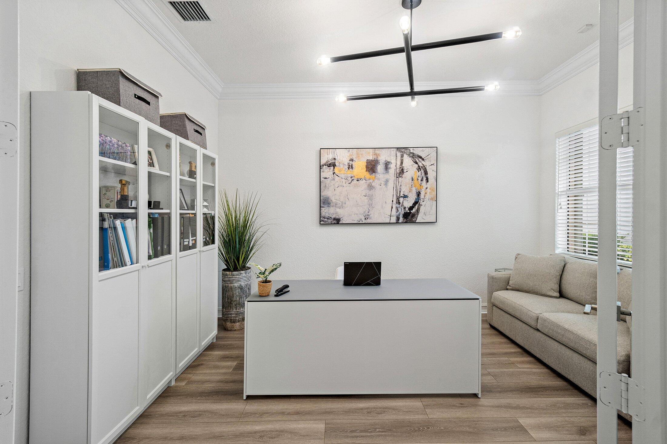 Take in breathtaking lake views in this beautifully renovated open-concept home. The kitchen features white cabinetry, quartz countertops and backsplash, pull-out drawers, an oversized island, and a spacious pantry with custom shelving. The family room overlooks serene sunsets, complemented by a formal dining room ideal for entertaining. Double door den off the foyer. The primary suite offers a Roman tub, separate shower, dual vanities. Additional upgrades include custom closets in all 3 bedrooms, designer lighting and fans, lush landscaping, and luxury vinyl flooring throughout. The laundry room is complete with custom cabinetry. Additional features include crown molding, accordion shutters, an extended driveway on an easement lot, epoxy-coated garage floor, overhead storage, EV Charge