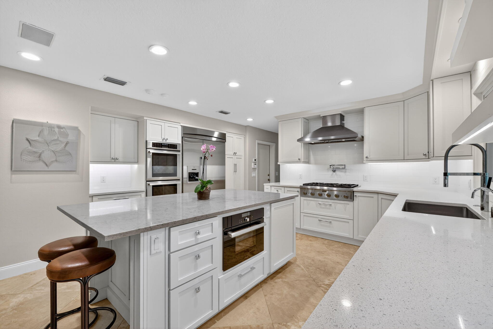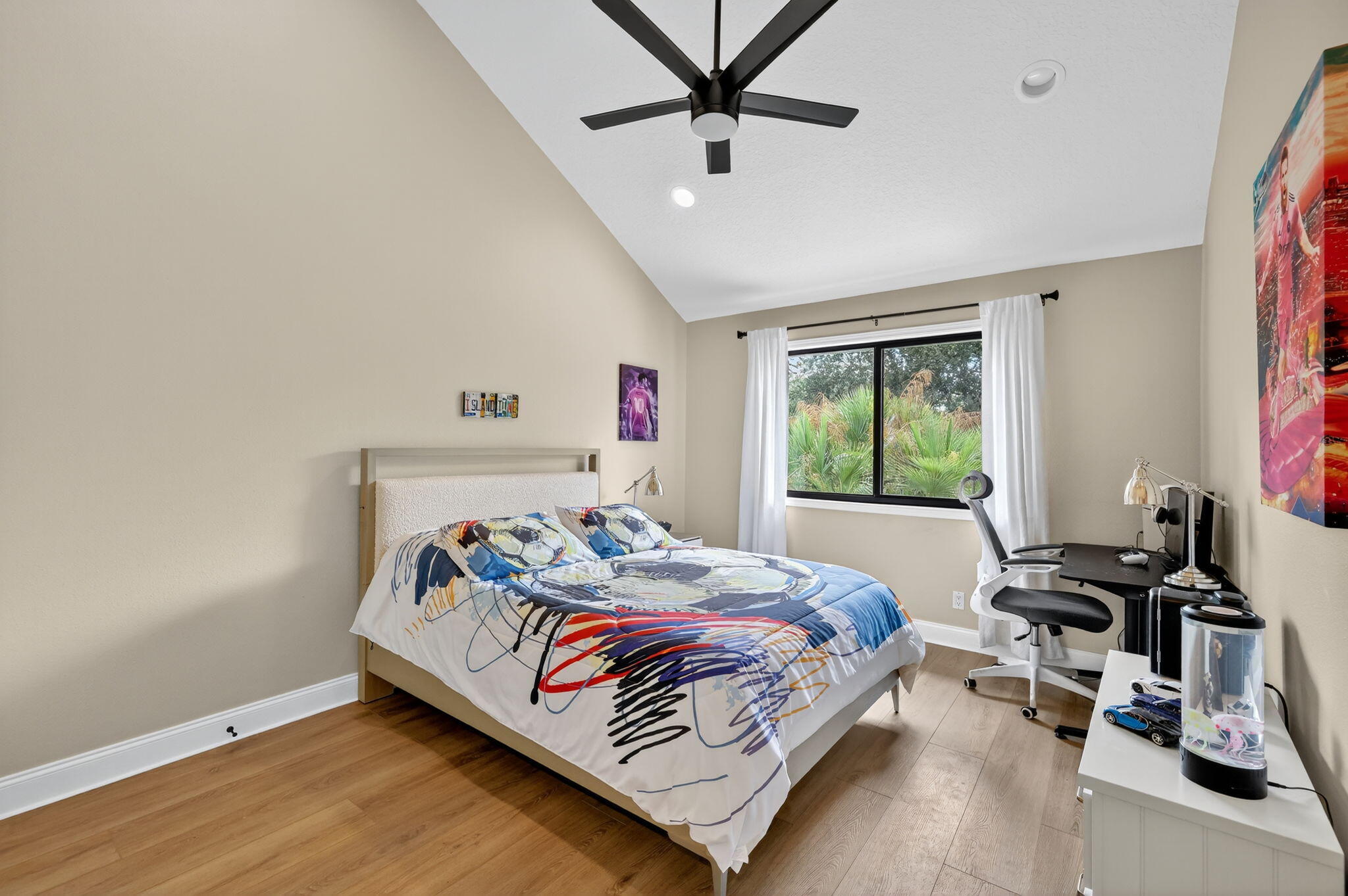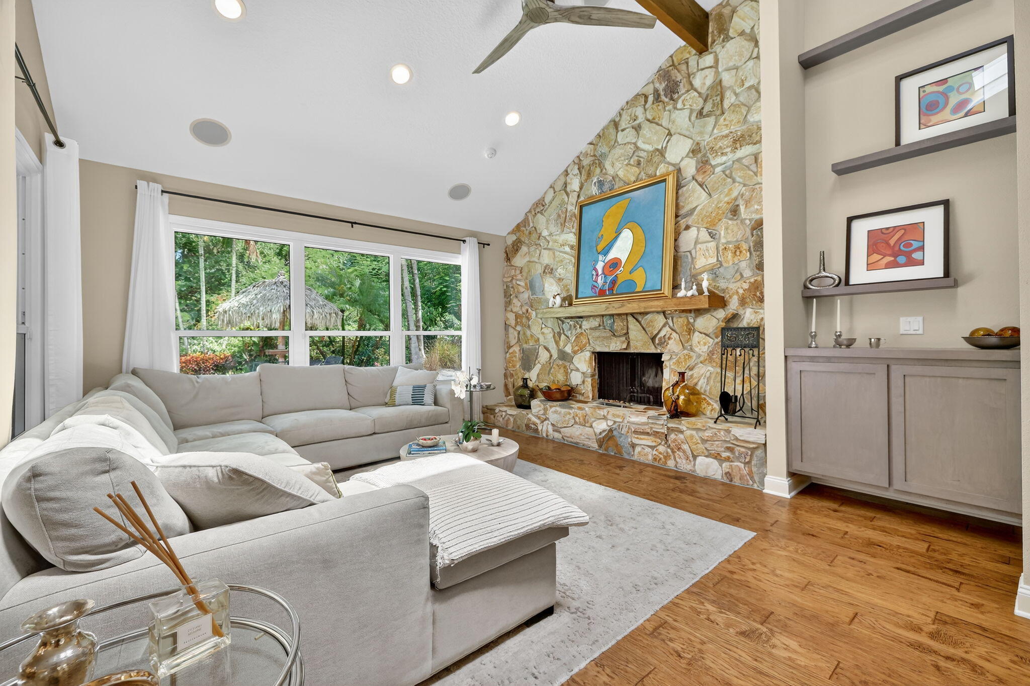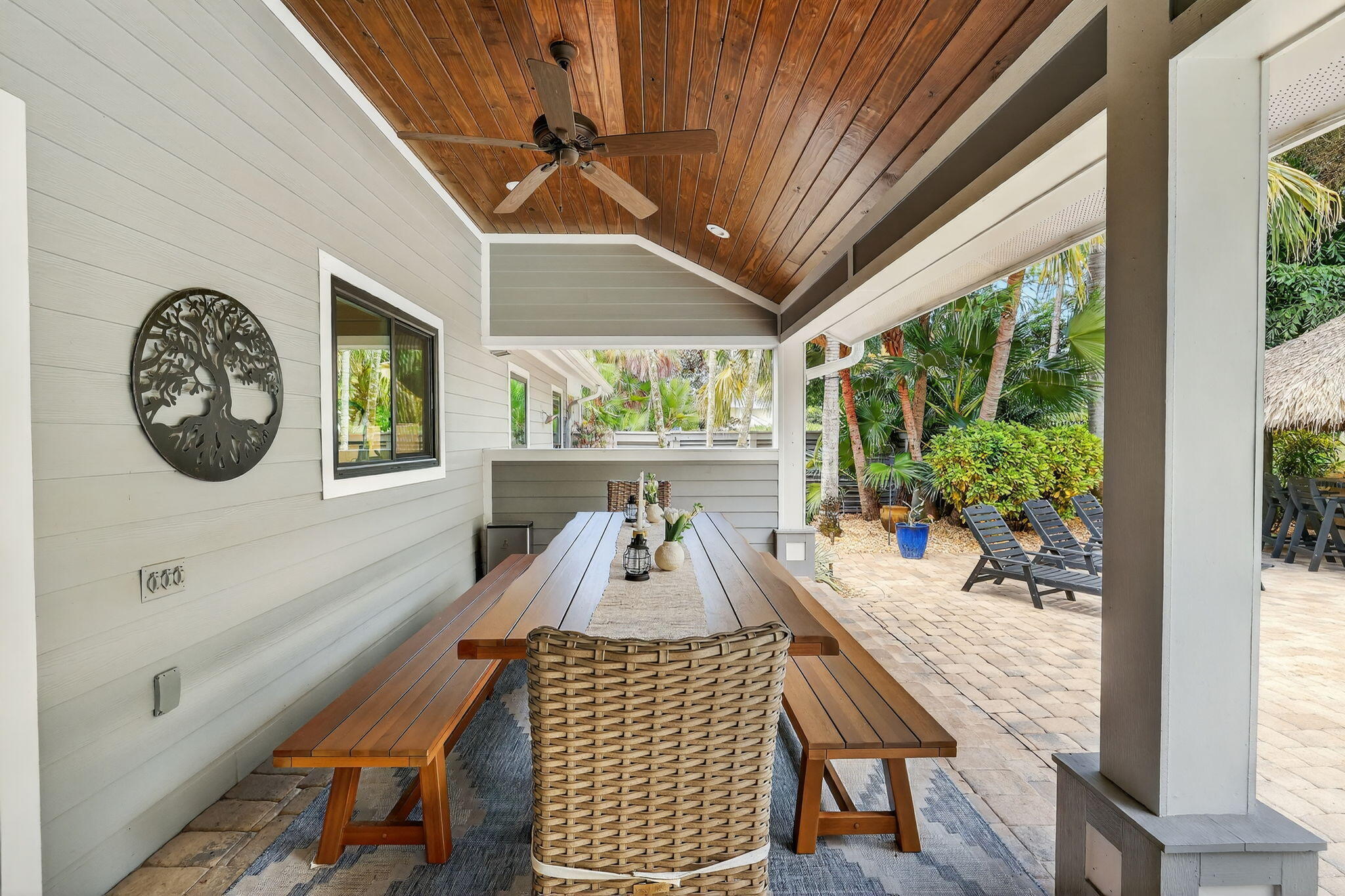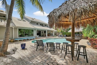 Live, work & play in your own tropical oasis! Nestled on over 1.5 lush acres in the heart of Palm City, this beautifully updated home features 5bed/3.5bath/3car, den & office spacious media room with closet and 2 gym studios. Enjoy over 5400+ sq ft of living space with room for everybody! Upgrades include impact windows and doors throughout, updated open kitchen with large island, quartz countertops and high-end appliances with master suite on main level with own sitting area. Step outside to your private paradise complete with tiki bar, grill & TV, cabana bath & saltwater pool with fire pit, perfect for year-round entertaining and relaxing in the Florida sunshine. Great location close to A-Rated schools, golf, tennis, I-95, Turnpike, fine and casual dining, beaches and PBI Airport.