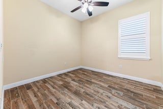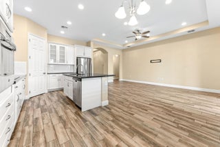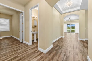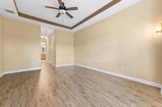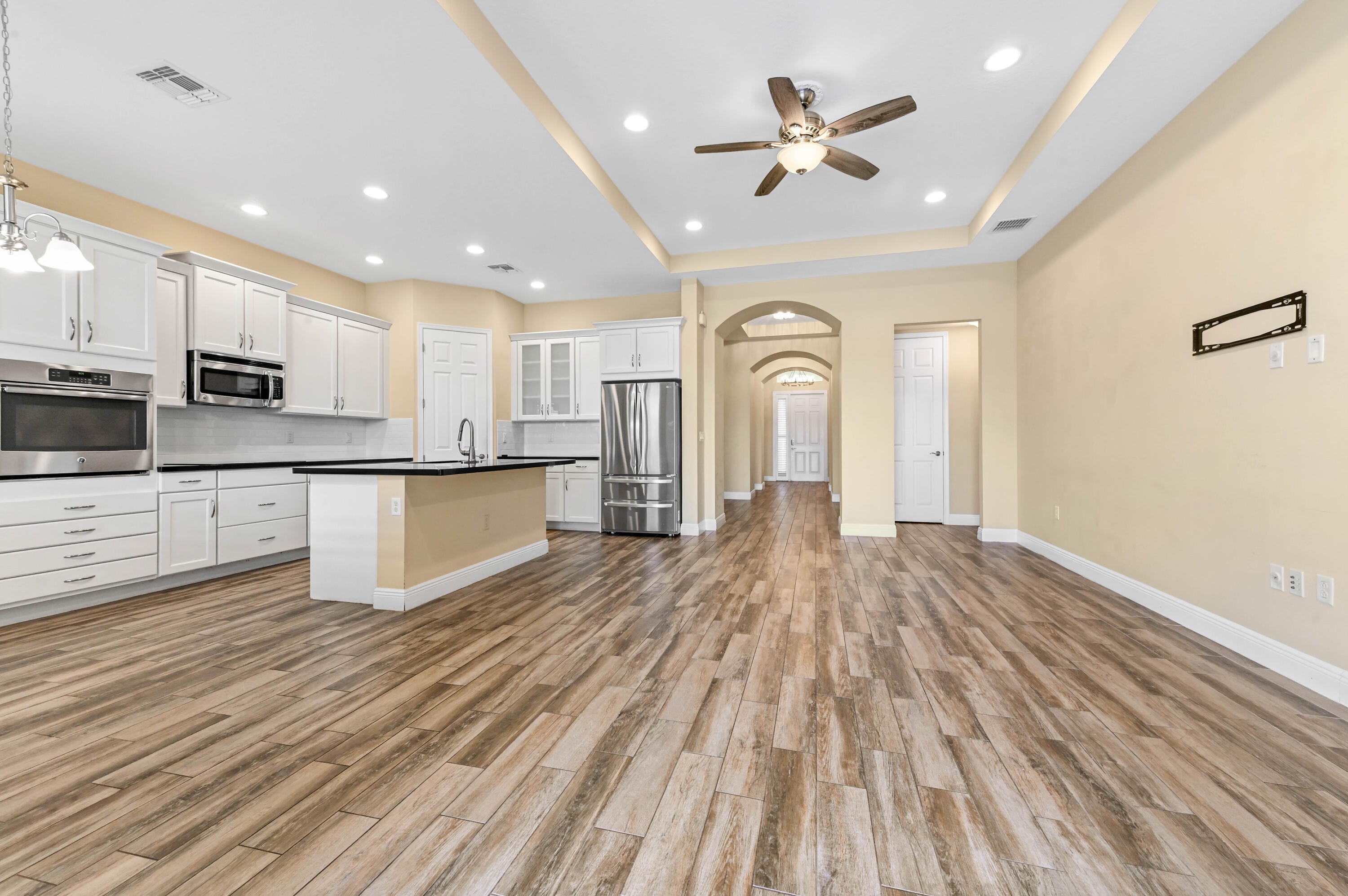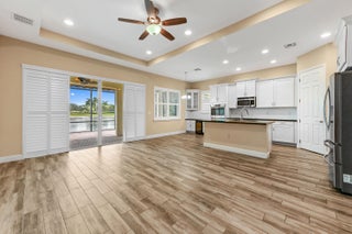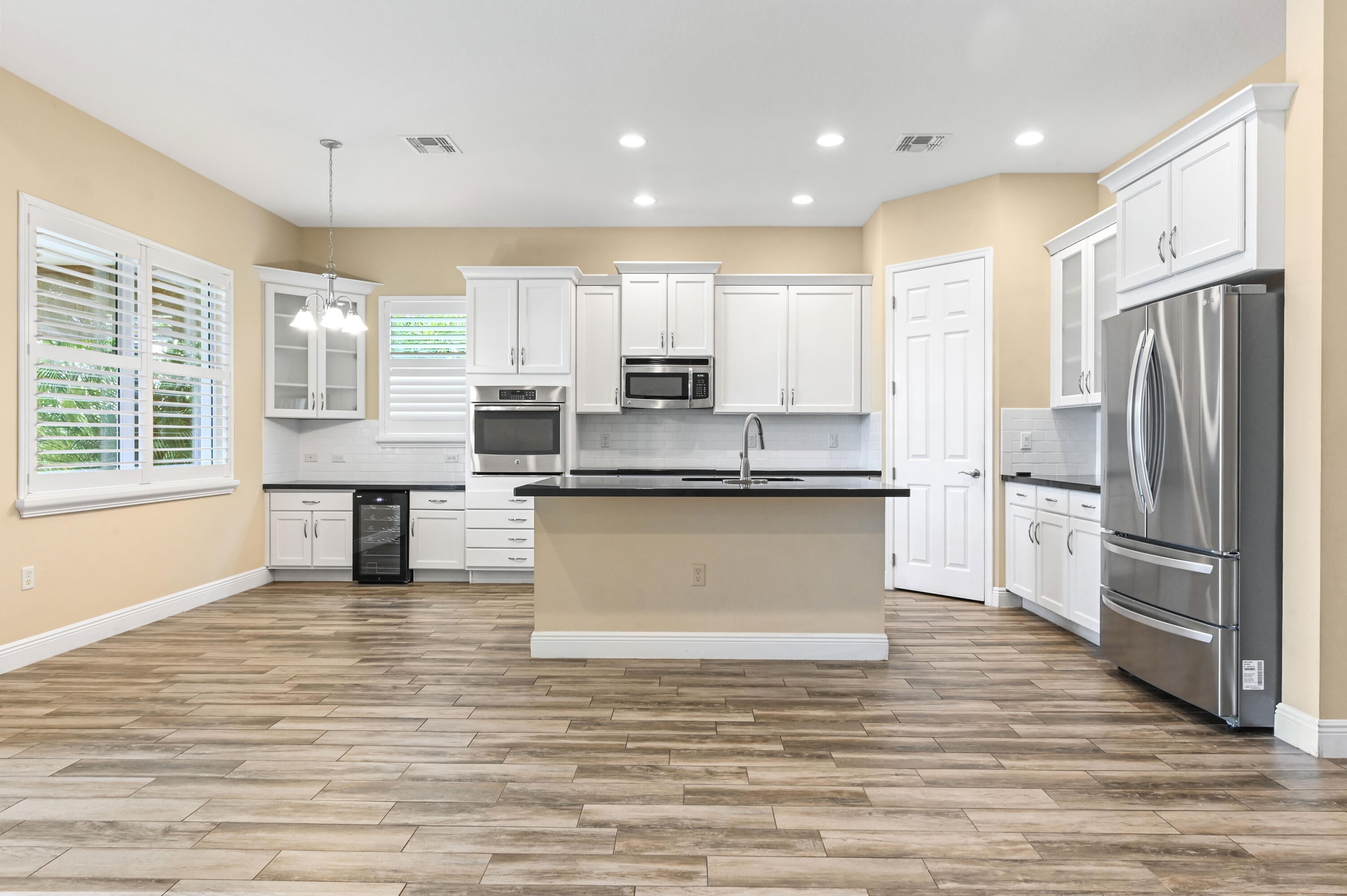 Stunning lakefront gem with a privately fenced yard and oversized screened lanai with picture-perfect water views, boasting 4 beds and 2.5 baths. The home features a massive main bedroom retreat with walk-in closets, formal dining room, and a wide great room that flows into a chef's dream open kitchen. Highlights include an eat-in breakfast nook, black quartz center island, brand new top-of-the-line stainless appliances, triple-door fridge, new induction cooktop paired with a sleek wall oven, temperature-controlled built-in wine storage, complete with white custom cabinetry, and a walk-in pantry. The primary suite is oversized, with an ensuite spa-style bathroom and a huge walk-in shower.Over $35K in upgraded plantation shutters, woodgrain laminate flooring, curved archways, and tray ceilings, along with built-out laundry room storage. Portosol is a quiet, gated community with resort-style amenities that include a clubhouse, gym, resort-style pools, billiards, on-site management, tennis, pickleball, basketball, and volleyball courts. Vacant, easy to show - don't miss out, schedule a showing today!