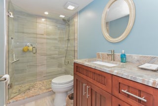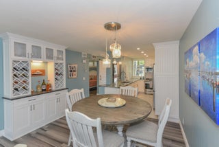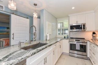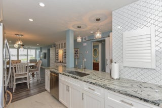 Beautiful main floor unit with river and dock view. Remodeled and ready to move into. All new custom cabinets, appliances and countertops.Remodeled bathrooms and full-sized washer and dryer in the unit. Bamboo flooring & tile and plantation shutters on all the windows. New hurricane proof sliding doors and master bedroom window.Covered end parking space.Furniture is negotiable. Come take a look and you'll want to make it yours!