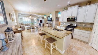 This stunning 2-bedroom, 2-bath home with a versatile den offers just under 1,700 square feet of open living space designed for both comfort and entertaining. The gourmet kitchen overlooks the dining and family room and features granite countertops, 42-inch cabinets, a gas range, upgraded backsplash, and a newer dishwasher. The oversized master suite is a retreat of its own with his-and-her sinks, a spacious walk-in closet, and a seamless glass walk-in shower.Step outside to your private lanai and pool area--truly a dream setting with a tiled lanai, privacy shades, hurricane screens, heated pool, and fenced yard surrounded by upgraded landscaping for ultimate privacy.Additional updates include freshly painted interior and exterior, new washer and dryer, upgraded recessed lighting, impact windows and doors, and a durable tile roof. The split floor plan makes the second bedroom and bath perfect for guests, while the den offers flexibility for a home office or hobby space. Whether relaxing by the pool or hosting friends, this home was made for entertaining and enjoying the Florida lifestyle.