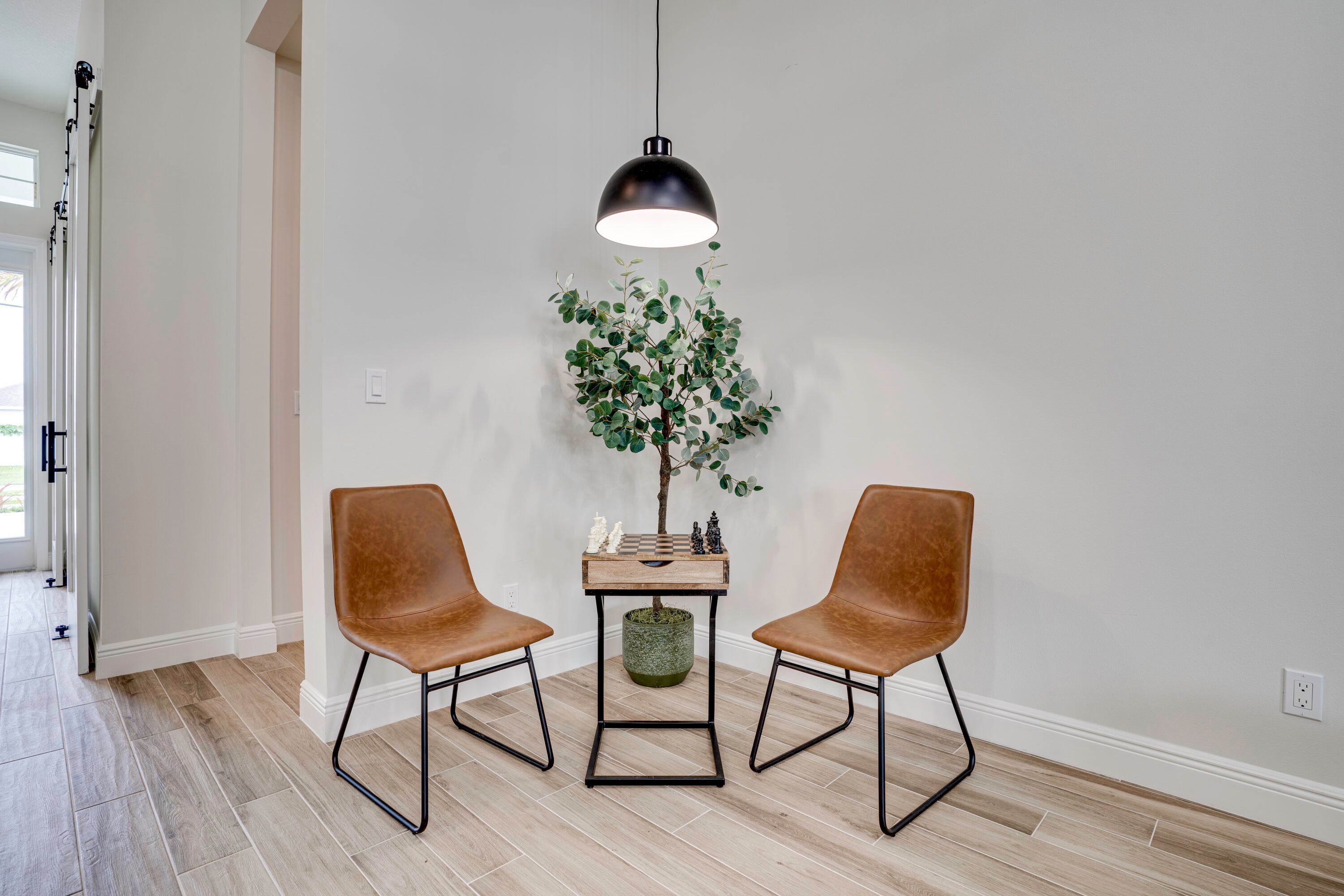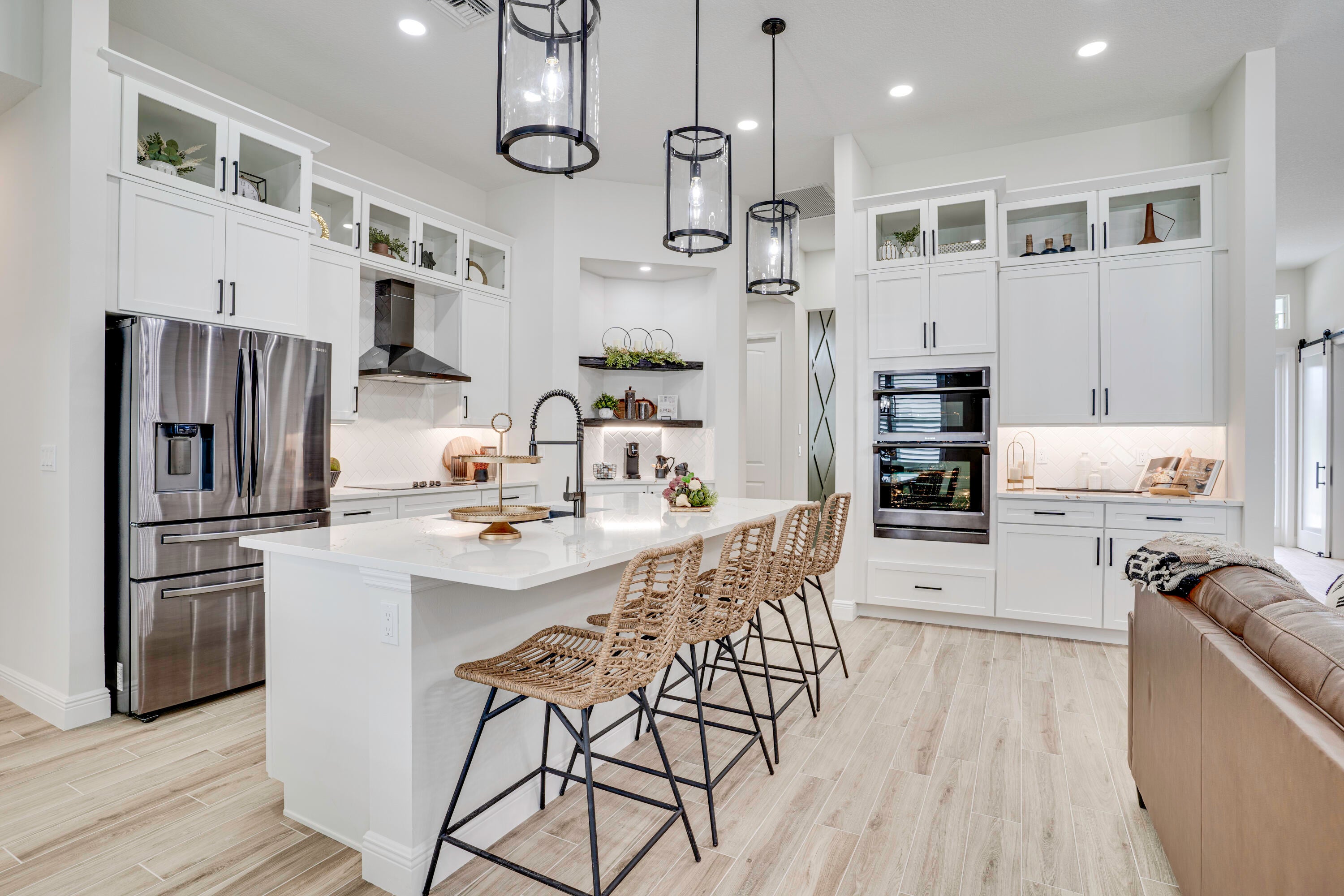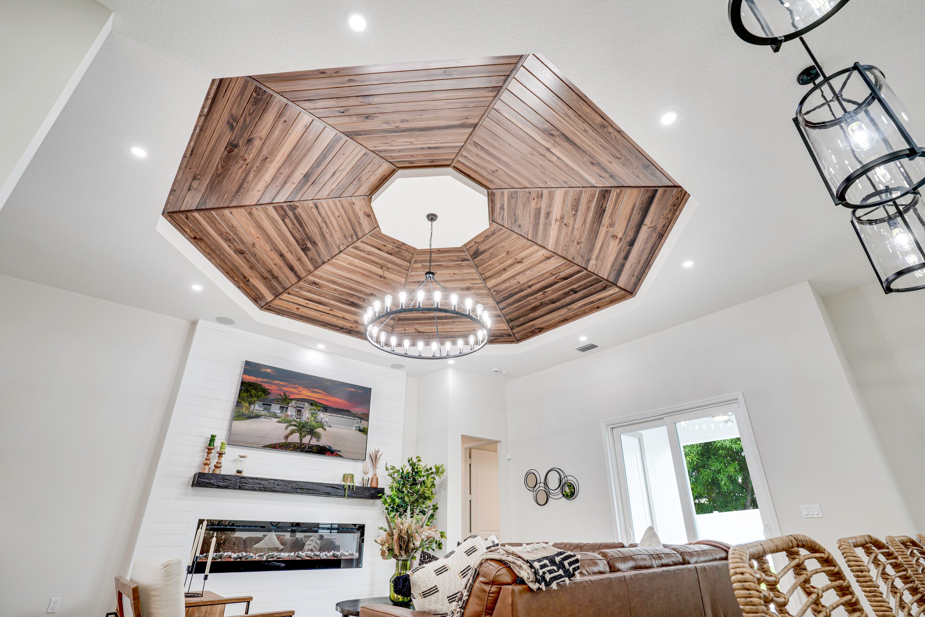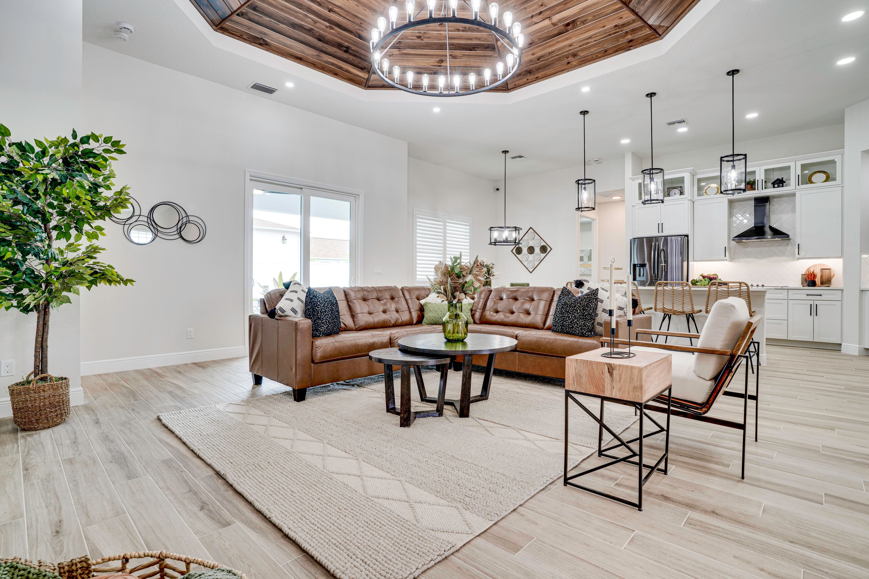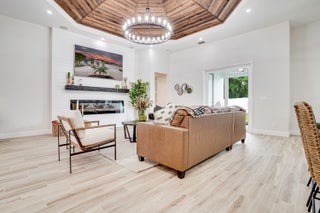 This Builder Model is sold fully furnished with designer-selected furniture & decor, plus $100K+ in luxury upgrades; move in and live the dream from day one! Featuring 4BR/3BA + den, 11'4'' ceilings with tall doors, and a show-stopping wood-stained octagon coffer. The chef's kitchen wows with Cambria quartz, black stainless appliances, wall oven + hood, reverse osmosis, and a spacious walk-in pantry. Elegant details include wood plank tile, impact windows with plantation shutters, barn doors, shiplap fireplace with mantle, dry bar, cabana bath, and epoxy-finished garage. Outdoors, enjoy a fire pit, covered patio, lush fenced 1/4 acre lot, and a circular driveway for curb appeal that stuns. A rare, one-of-a-kind opportunity!