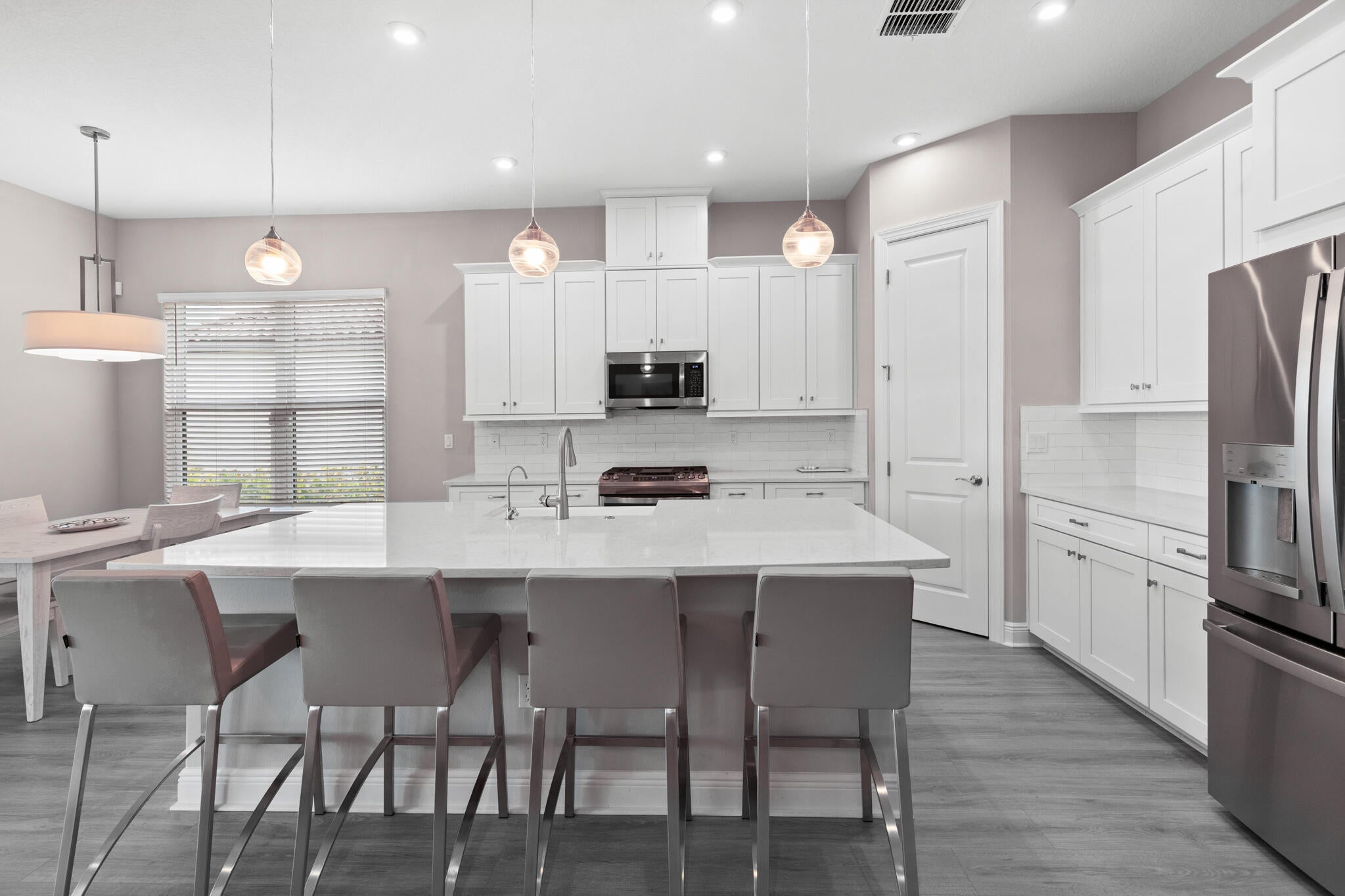 Live the resort lifestyle in Esplanade at Tradition with this spectacular Franese model showcasing $120K + in builder installed upgrades. Featuring 3 bedrooms plus flex room, 3.5 baths, open floor plan, gourmet kitchen with quartz countertops, GE Profile appliances with gas range, laminate flooring, crown molding in tray ceilings, hi-hat lighting, modern fixtures, window coverings and bay window in primary suite. Pocketing sliders with power shades lead to an extended covered lanai with an expanded screen enclosure, pre-wired for pool and plumbed for outdoor kitchen. Added highlights: 4-ft garage extension, glass front door, dimmers and extensive landscaping. Community amenities include a resort clubhouse with pool, cafe', gym, spa event and card rooms, kitchen, outdoor BBQ and more.