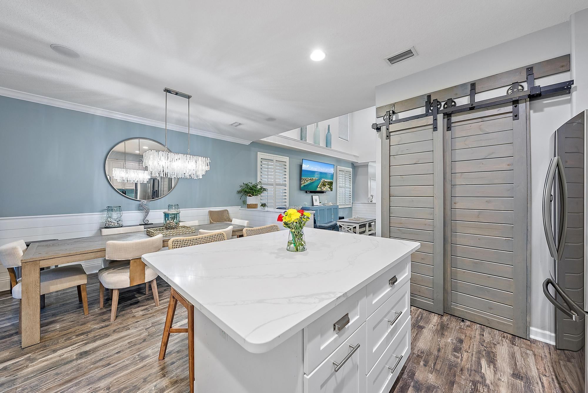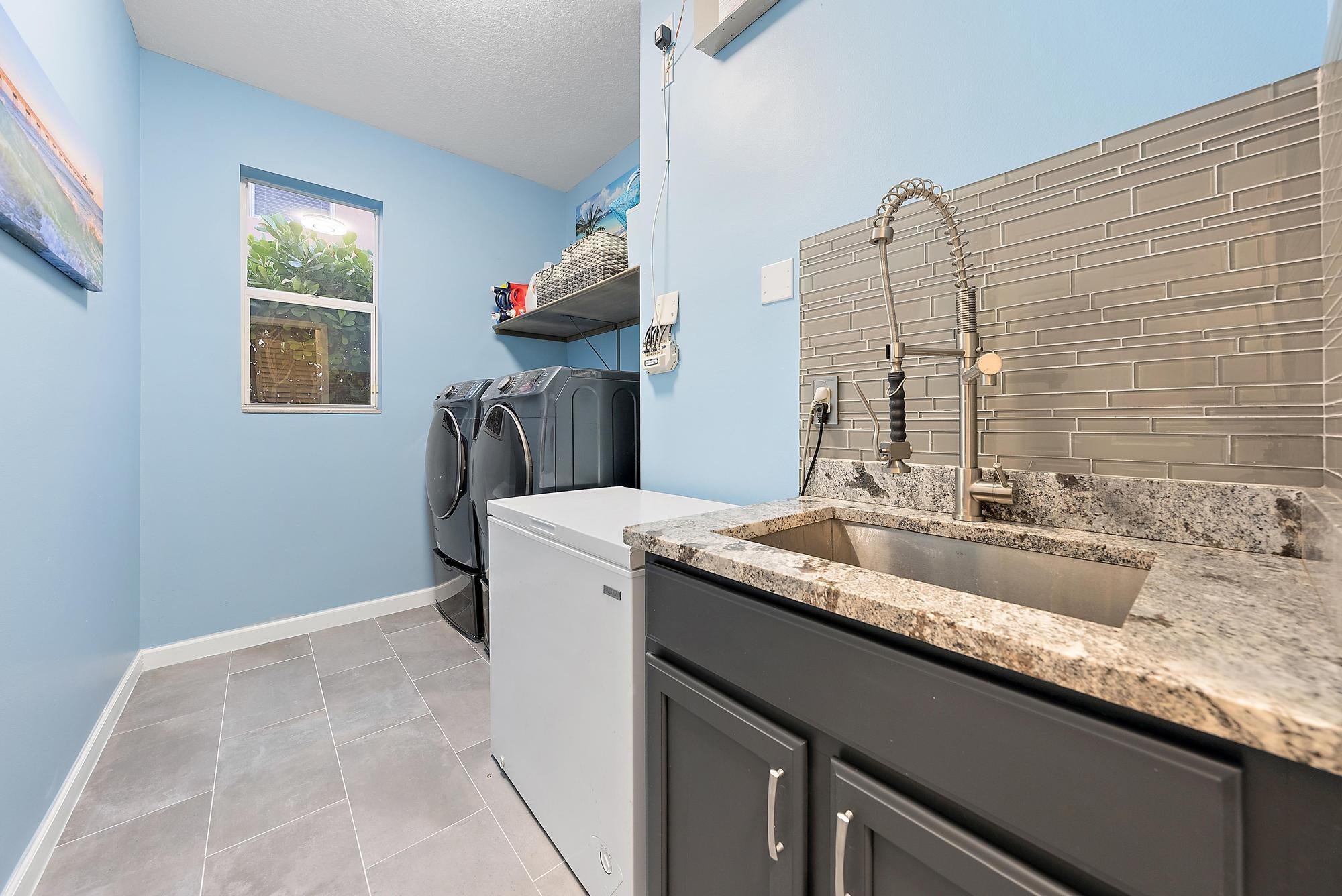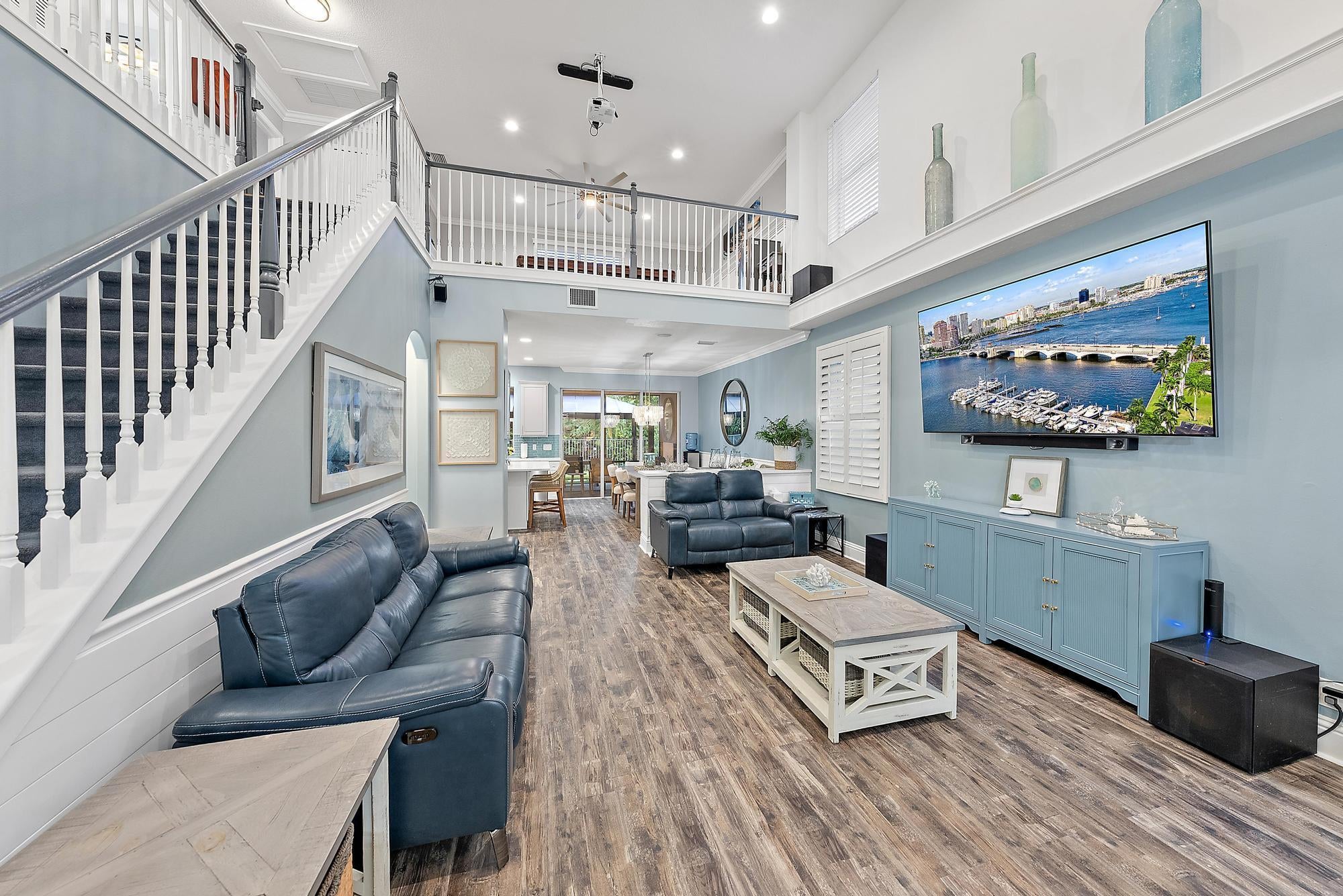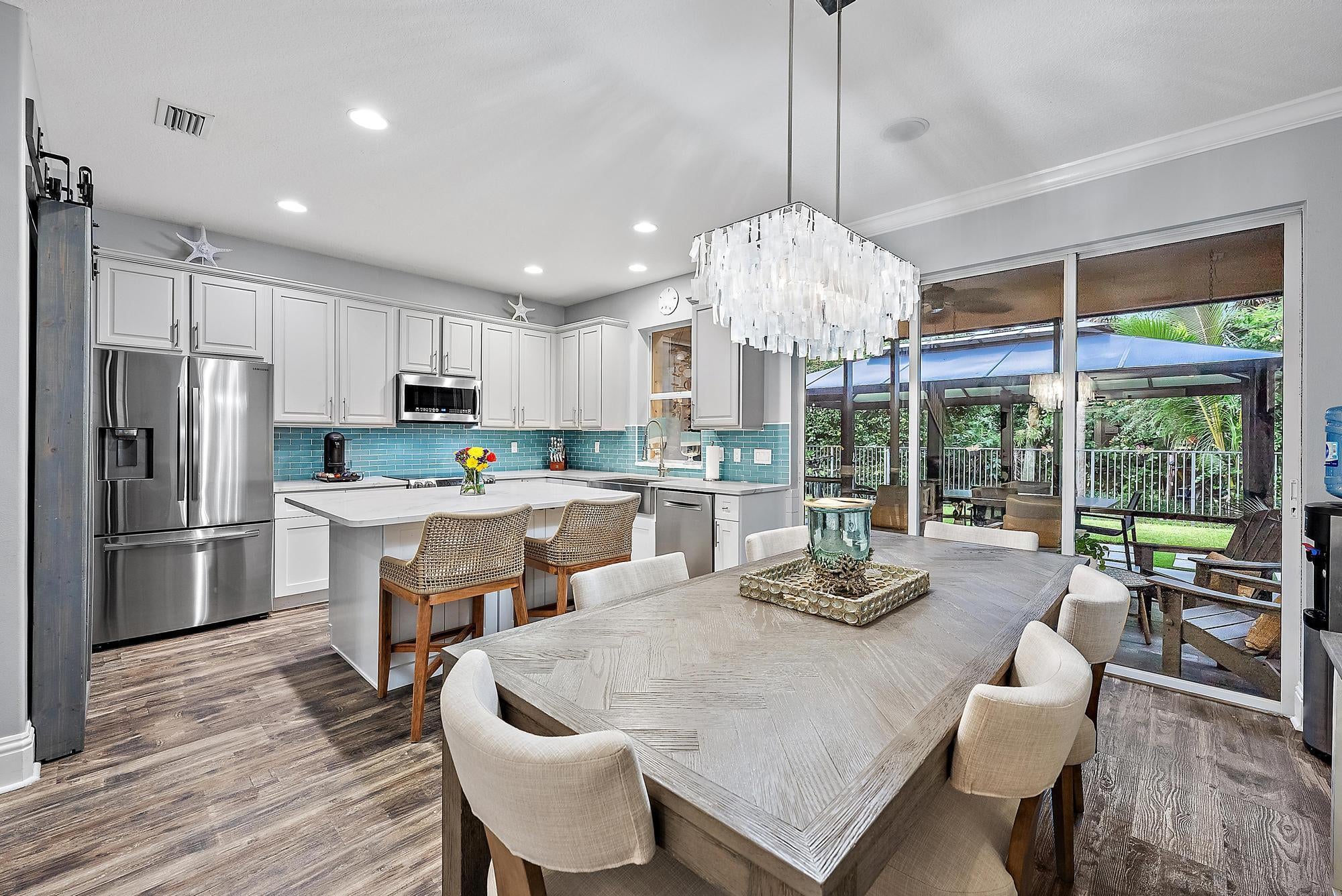 Stunning 4-bedroom, 3.5-bath Catalina model in the sought-after Oaks of Hobe Sound. This home combines elegance with everyday functionality. Step inside to soaring ceilings and abundant natural light, creating a bright, open, and inviting atmosphere. The spacious family room flows effortlessly into the newly remodeled gourmet kitchen, featuring 42'' wood cabinetry, quartz countertops, tile backsplash, a large island, and newer Samsung appliances. Pocket sliding doors extend the living space to the screened lanai, offering the perfect indoor-outdoor lifestyle. The first-floor primary suite is a private retreat with sliding doors to the patio, dual walk-in closets, and a beautifully updated ensuite complete with dual vanities, a Jacuzzi tub, and a separate shower.The ground floor features a powder room and a spacious laundry room equipped with a Samsung front-loading washer and dryer on stands, a deep stainless steel Kraus sink, granite countertops, and a spray faucet. Upstairs, a large loft/media room offers versatile living space, accompanied by two bedrooms with walk-in closets, a remodeled bathroom with a concave tub, and a second master suite with its own ensuite. All bathrooms have been beautifully updated with Moen hardware and high-end finishes. This home is filled with modern upgrades and custom touches throughout. Highlights include custom-built closets and pantry, barn doors, shiplap accents, and smooth-finished walls for a clean, contemporary look. The main living areas feature wood-plank luxury vinyl flooring, new custom baseboards, and crown molding in key spaces, including the primary bedroom, loft, front entry, and dining room. Outdoor living is just as impressive, featuring a fenced backyard with a 12x20 gazebo, a screened lanai with slate tile, and meticulously maintained landscaping highlighted by a striking Sylvester Palm. Recently added LED smart bistro lights and solar pathway lighting create the perfect ambiance, while seamless gutters were installed in 2022. Additional upgrades include a new A/C (2023), newer water heater (2023), tinted windows for energy efficiency, custom garage cabinetry, and grey marble window sills throughout the ground floor. Both the interior and exterior have been freshly painted with Sherwin-Williams Super Paint, and all light fixtures upgraded to LED. Blending elegance, convenience, and thoughtful customization, this home is truly move-in ready and designed to impress. The Oaks HOA includes lawn care, a basic cable and high-speed internet bundle, gated entrances, a resort-style pool, a hot tub, and a playground. Hobe Sound is a hidden gem tucked away between Jupiter and Stuart. The Oaks is minutes away from some of the best beaches on the Treasure Coast, including Hobe Sound Beach on Jupiter Island, Jimmy Graham Park, where you can launch your boat, kayak, or paddleboard, and Gomez Preserve, which offers some of the best biking & hiking trails in South Florida. Downtown Hobe Sound has boutique shops & restaurants. This home is perfect for families or anyone seeking a peaceful lifestyle surrounded by nature. Don't miss your chance to make it yours!
