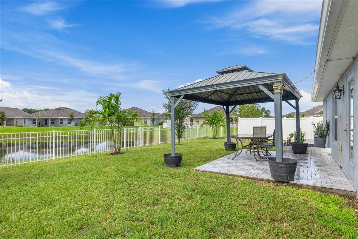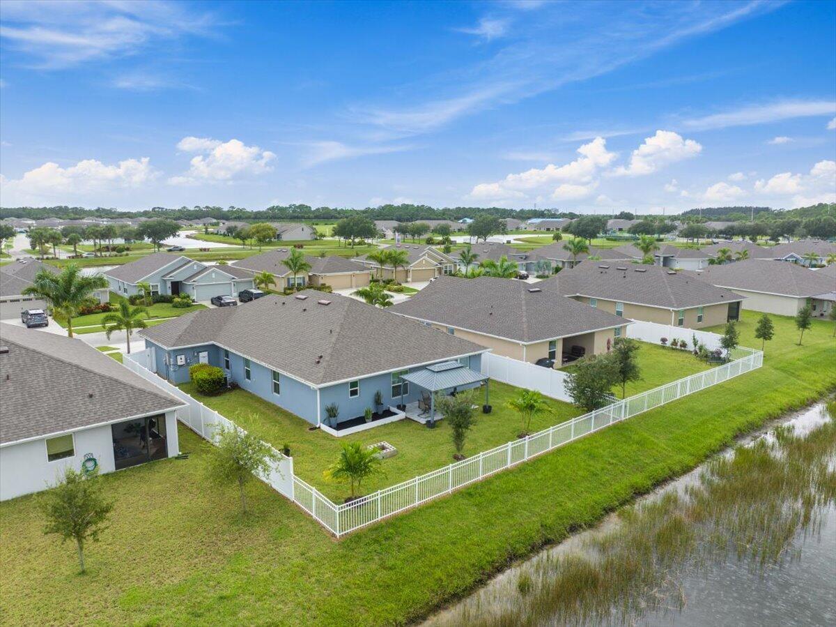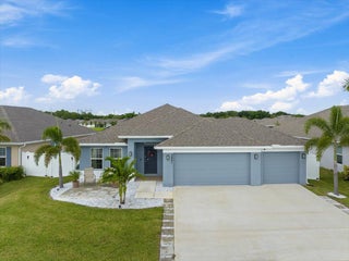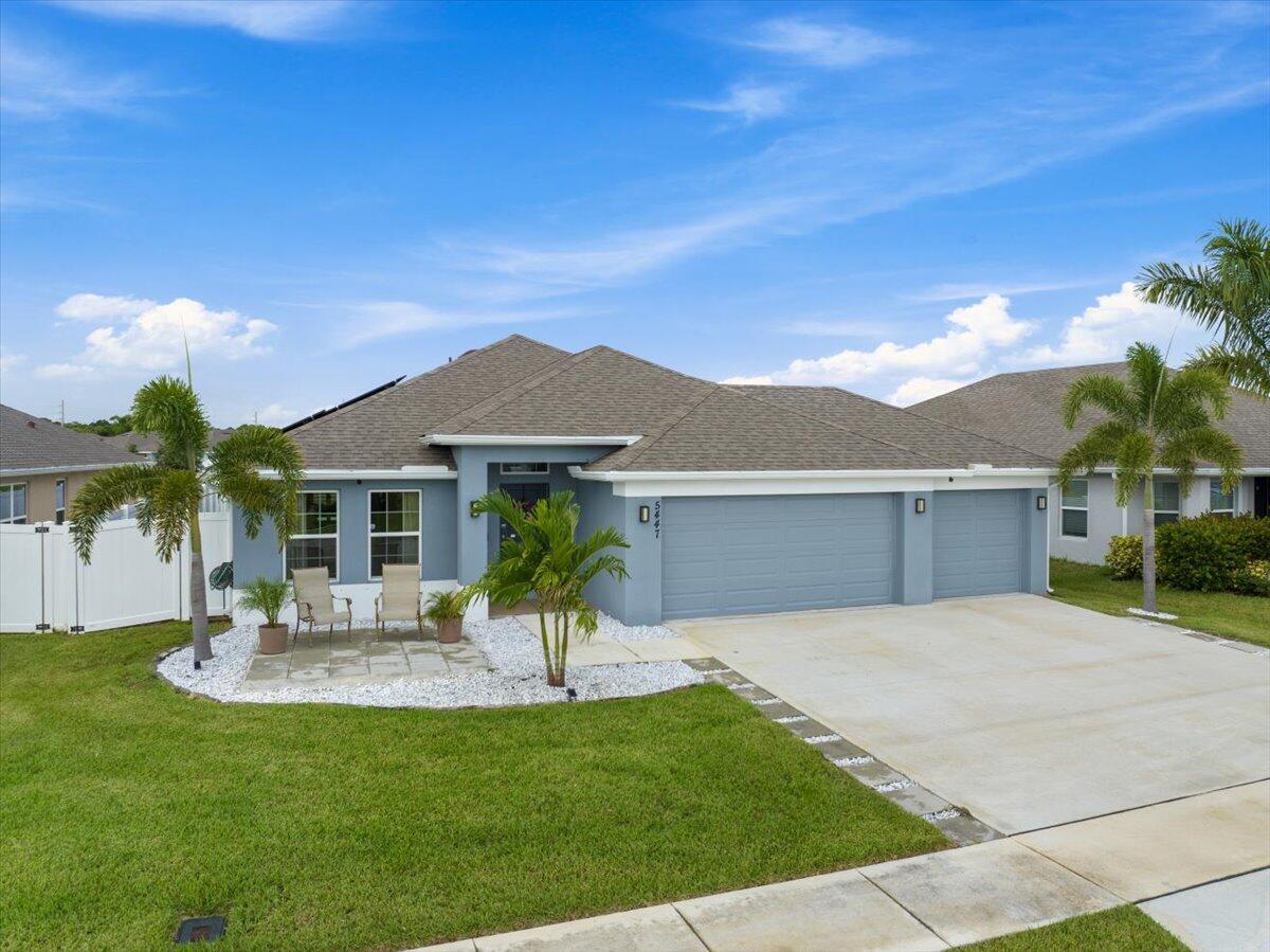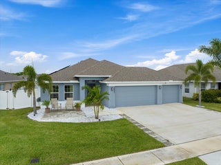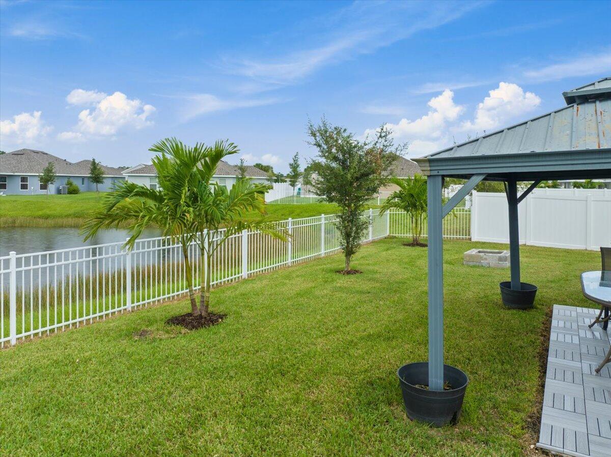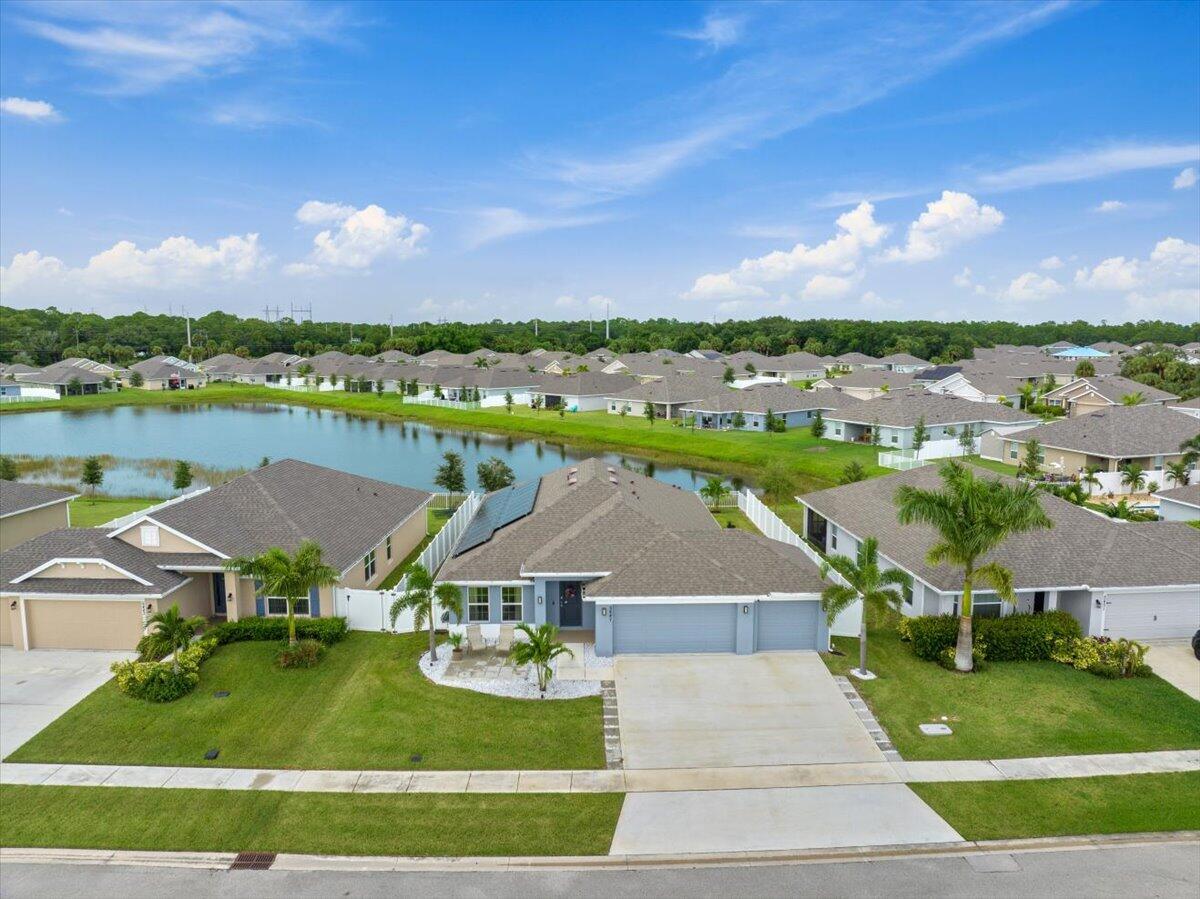 Welcome to Waterstone--a vibrant community where modern convenience meets serene waterfront living. This stunning 4-bedroom, 2-bathroom home with a massive 620sqft 3-car garage, built by Adams Homes in 2021, sits on a premium lot offering peaceful water views and thoughtful upgrades throughout. Step inside to an open floor plan adorned with LifeProof Dusk Cherry vinyl plank flooring and a gourmet kitchen featuring a peninsula-style granite countertop, ideal for casual dining or entertaining. The home's upgrades blend style and function--a hybrid heat-pump water heater (2022) for energy efficiency, solar panels by Windmar Solar financed through Sunnova, and a smart home system complete with Alexa-compatible switches, thermostat, and Blink outdoor cameras for peace of mind.The owner has added numerous touches to elevate comfort and style: a backyard pergola, Christmas palms (front and back), fresh landscaping with pavers and rock accents, and a fully fenced yard with three gated access points installed in 2022. Even the smallest details were consideredgutters, a Simplisafe alarm system, and labeled hurricane shutters for easy installation are all in place. Enjoy modern comforts like the fiberglass shower in the primary bath, garden tub in the guest bath, and top-tier appliances including a Whirlpool French door refrigerator and Samsung washer/dryer set (all 2021). Additional features include an Acura EV charger (2025), trimmed oak trees, and low HOA fees of only $12/month under Atmos Living Management Group. Every inch of this home was designed for comfort, style, and practicalityoffering a turnkey lifestyle in one of the area's most desirable communities. Perfectly situated between Vero Beach and downtown Fort Pierce, you'll enjoy quick access to beautiful beaches and the fun-fishing inlet/jetty! Plus, you're just minutes from both I-95 and US-1, making commuting a breezewhether it's for work or a weekend getaway.