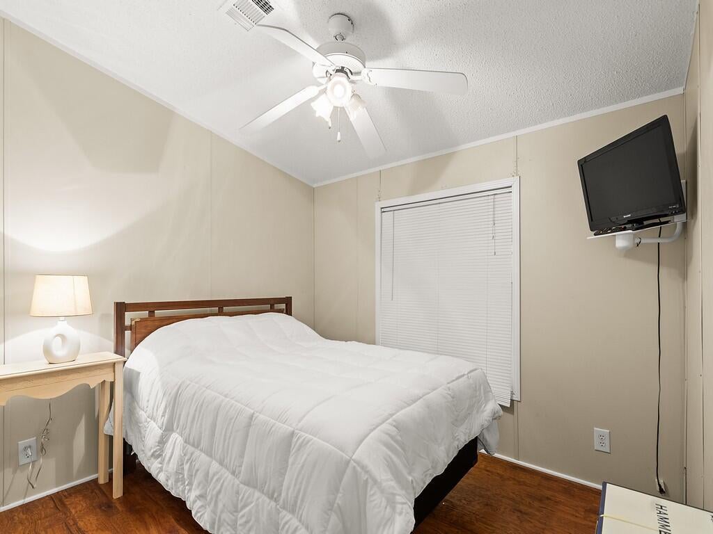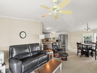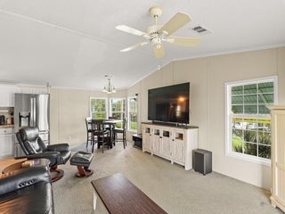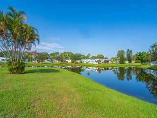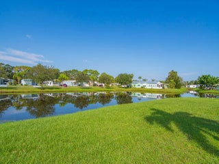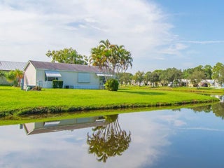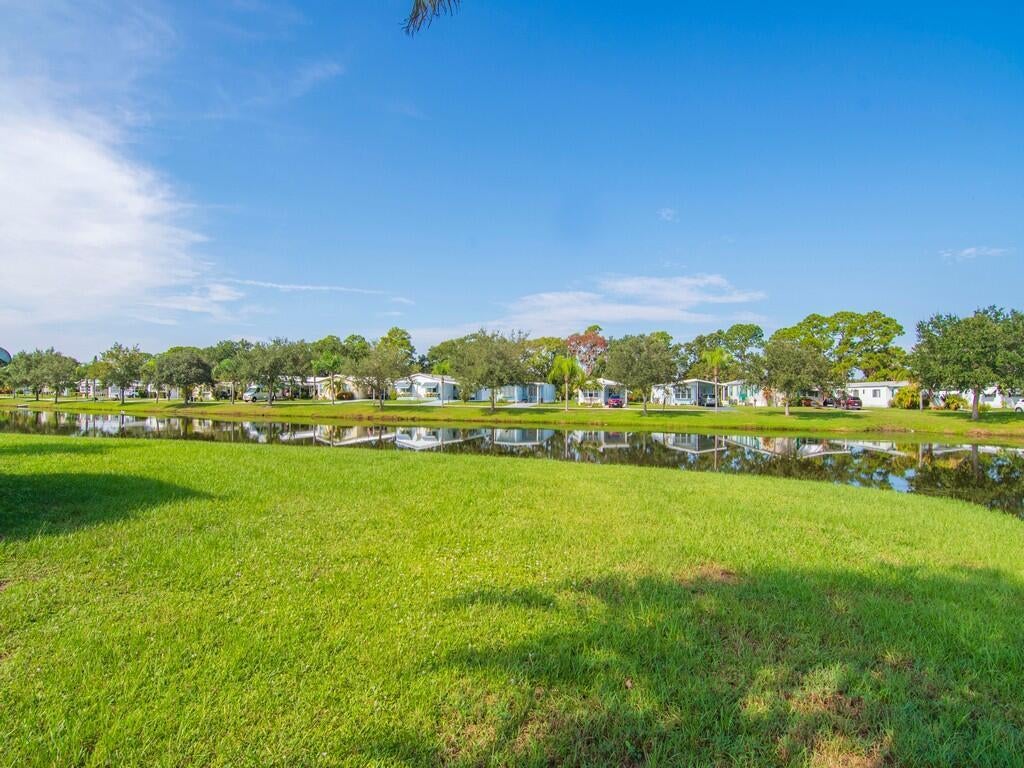 Charming waterfront retreat in Spanish Lakes Riverfront, a 55+ community nestled on a quiet cul-de-sac. This beautifully maintained 2-bedroom, 2-bathroom home offers 1,240 sq ft of spacious living with panoramic lake views that will take your breath away. Open kitchen comes with new appliances. Wake up to tranquil lake views and unwind with stunning sunsets from your living room. Vaulted ceilings and a flowing layout make entertaining effortless. The long driveway has an epoxy coating and accommodates up to four vehicles, plus a 2-car carport for covered parking and a storage shed. Enjoy golf, tennis, pool, clubhouse, and more in the vibrant Spanish Lakes Riverfront community. Whether you're downsizing, or retiring, this home is ready to welcome you.