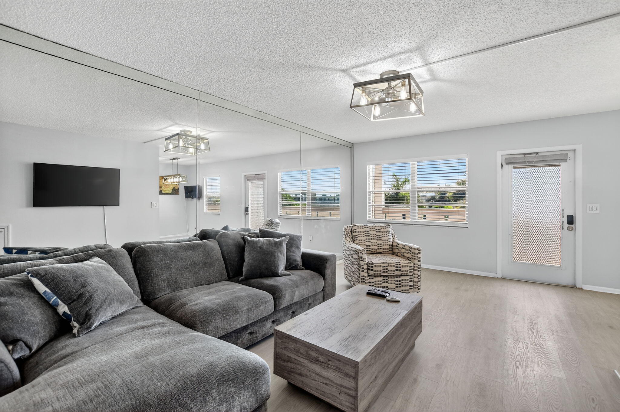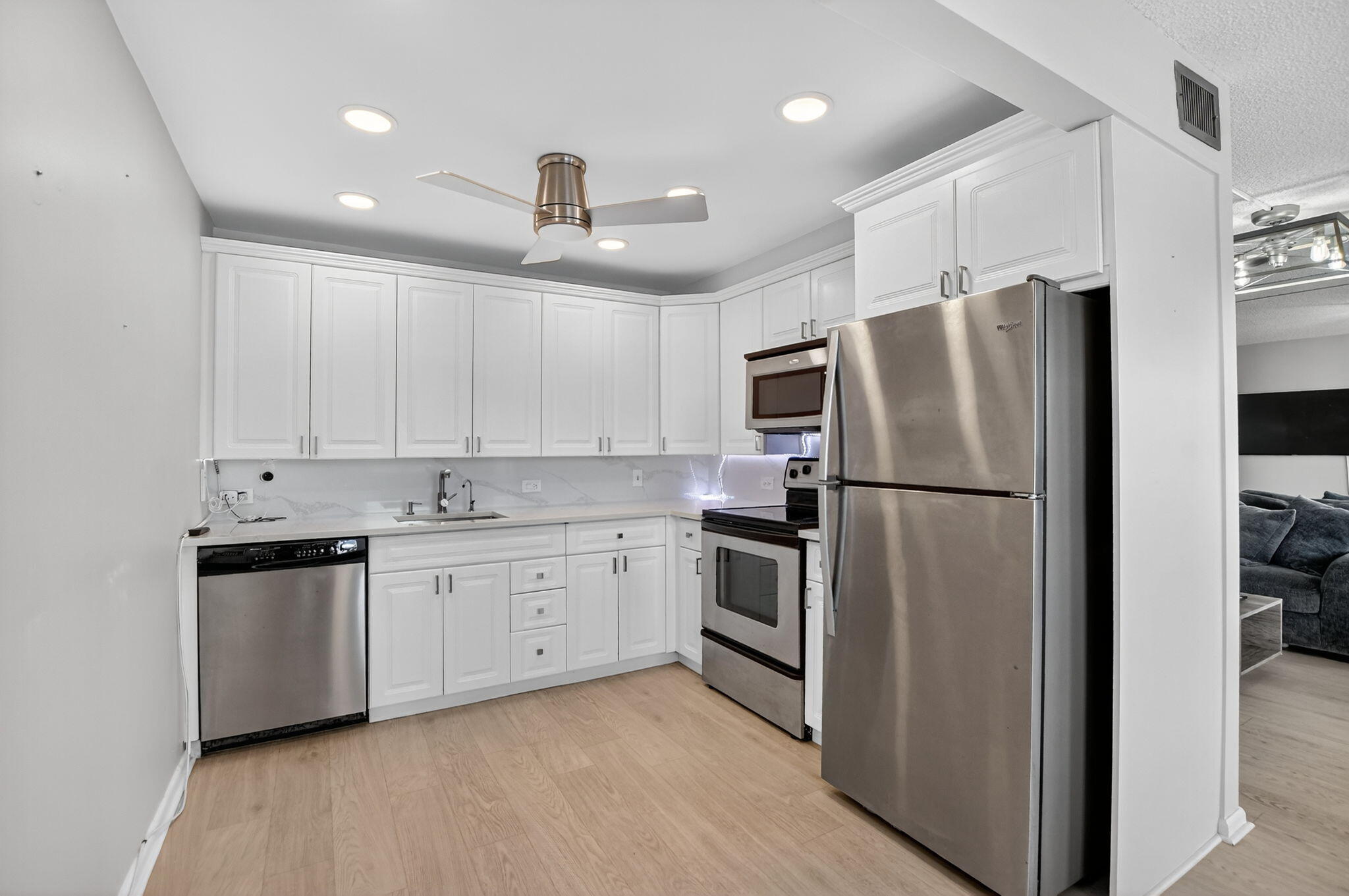 Step into a bright and airy 4th-floor apt featuring a stunning, updated kitchen with quartz countertops and modern stainless steel appliances. The spacious living area boasts elegant wood-look flooring, creating a warm and inviting atmosphere. Nicely furnished with TV's.Relish breathtaking lake views from your enclosed patio, accessible through two sliding doors. This home is perfectly situated across from the Rexford pool and close to house of worship and clubhouse. Century Village offers a true resort experience with an array of amenities, including a fitness center, live shows, movies, courtesy buses, classes, bingo, card rooms, and organized trips. Stay active with tennis and pickleball, or enjoy the convenience of nearby shopping and restaurants.