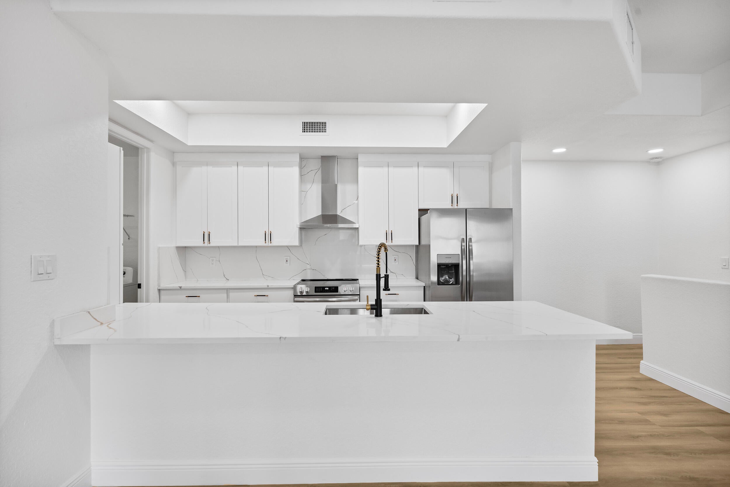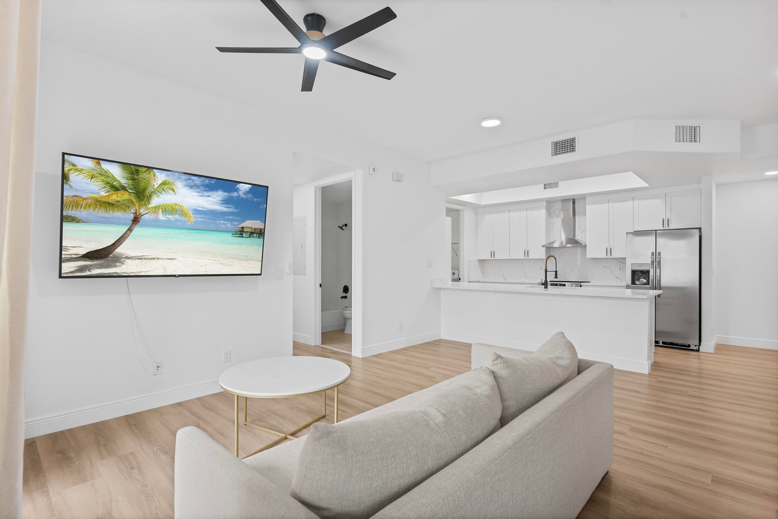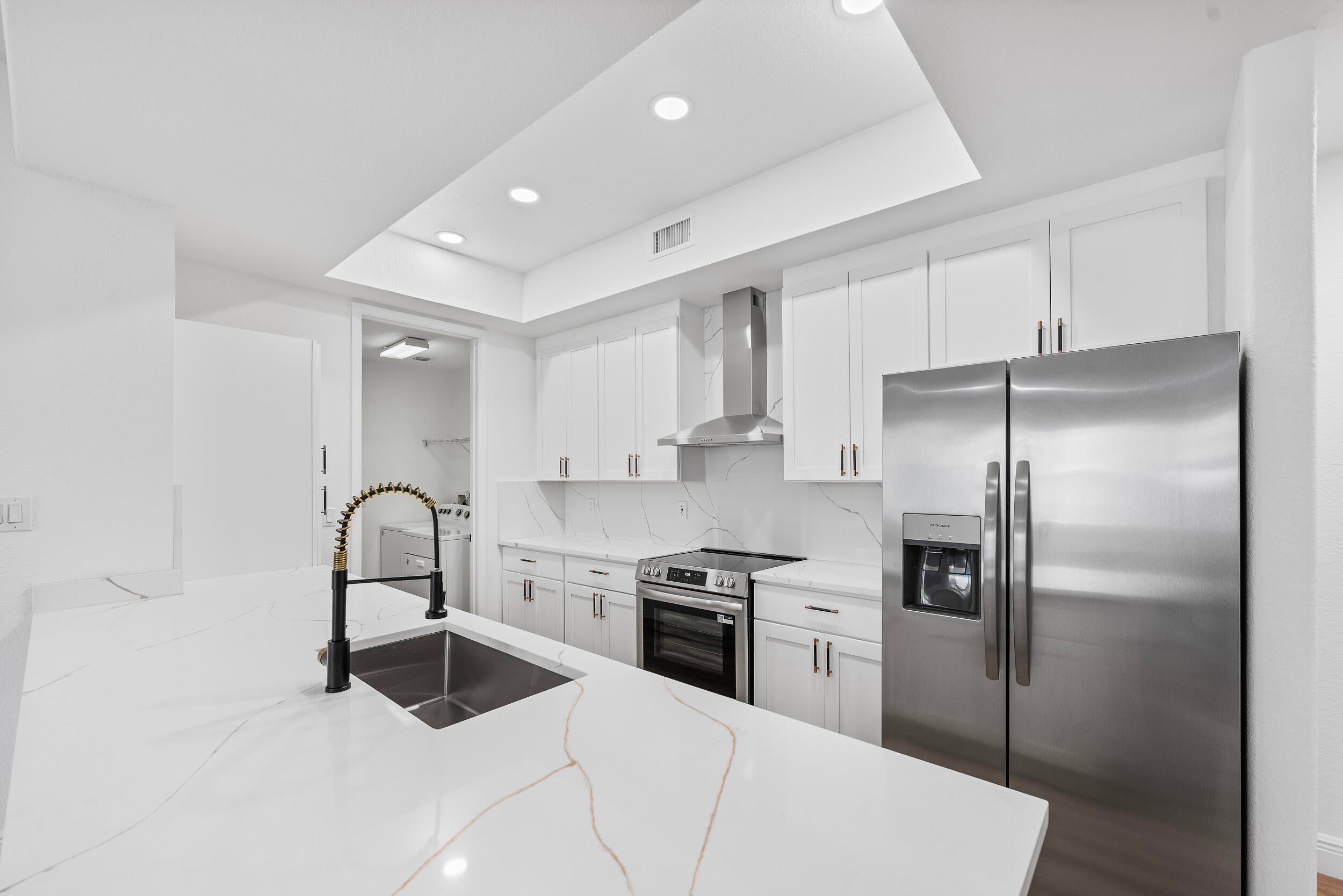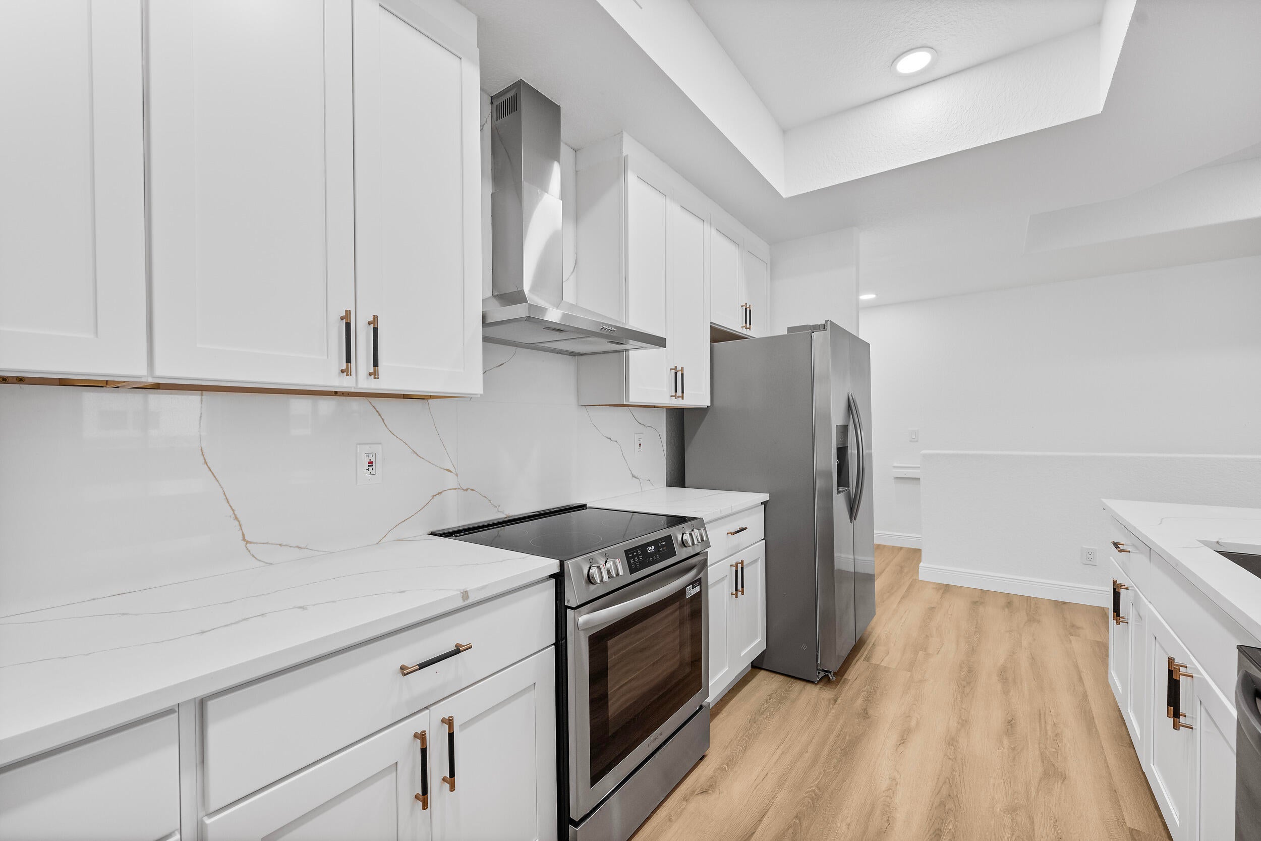 Welcome to one of very few FULLY REMODELED townhome units in the Promenade of Tradition Square! This spacious 2 bed / 2 bath townhome has been COMPLETELY renovated this year. New kitchen, flooring, doors, bathrooms, light fixtures, and more! Kitchen is equipped with 42in slow close cabinets, calacatta quartz countertops and back splash, 2025 Stainless steel appliances, hood vent range, and farmhouse stainless steel sink! Upgraded LED recessed lighting, remote operated fans, new doors and hardware, and luxury vinyl flooring. This immaculate unit is also equipped with full storm protection, 2018 AC, 2021 water heater, and 2017 metal roof. As if all that wasn't enough, this unit is located in the HEART of Tradition Square! Everything you need is within walking distance of your front door!