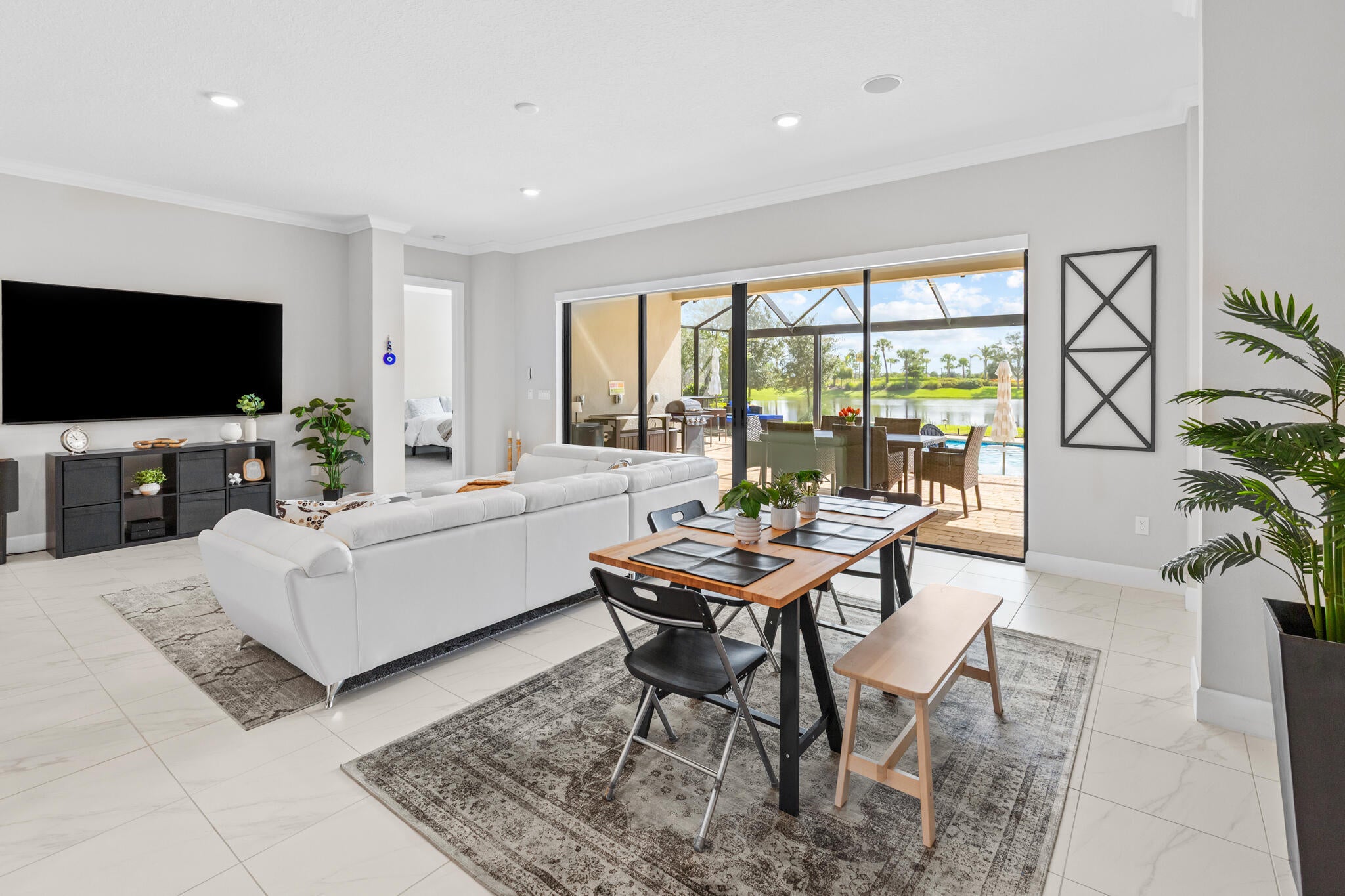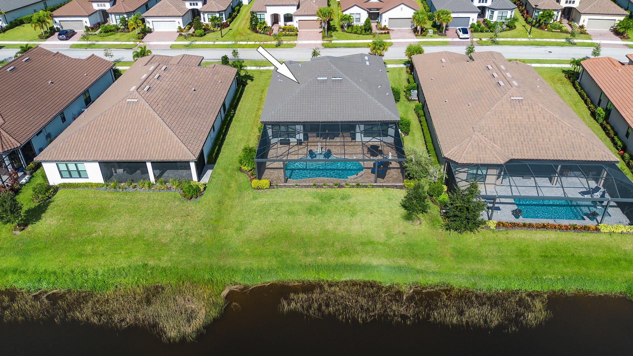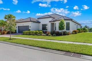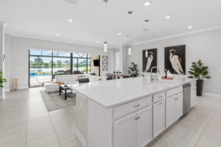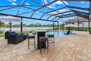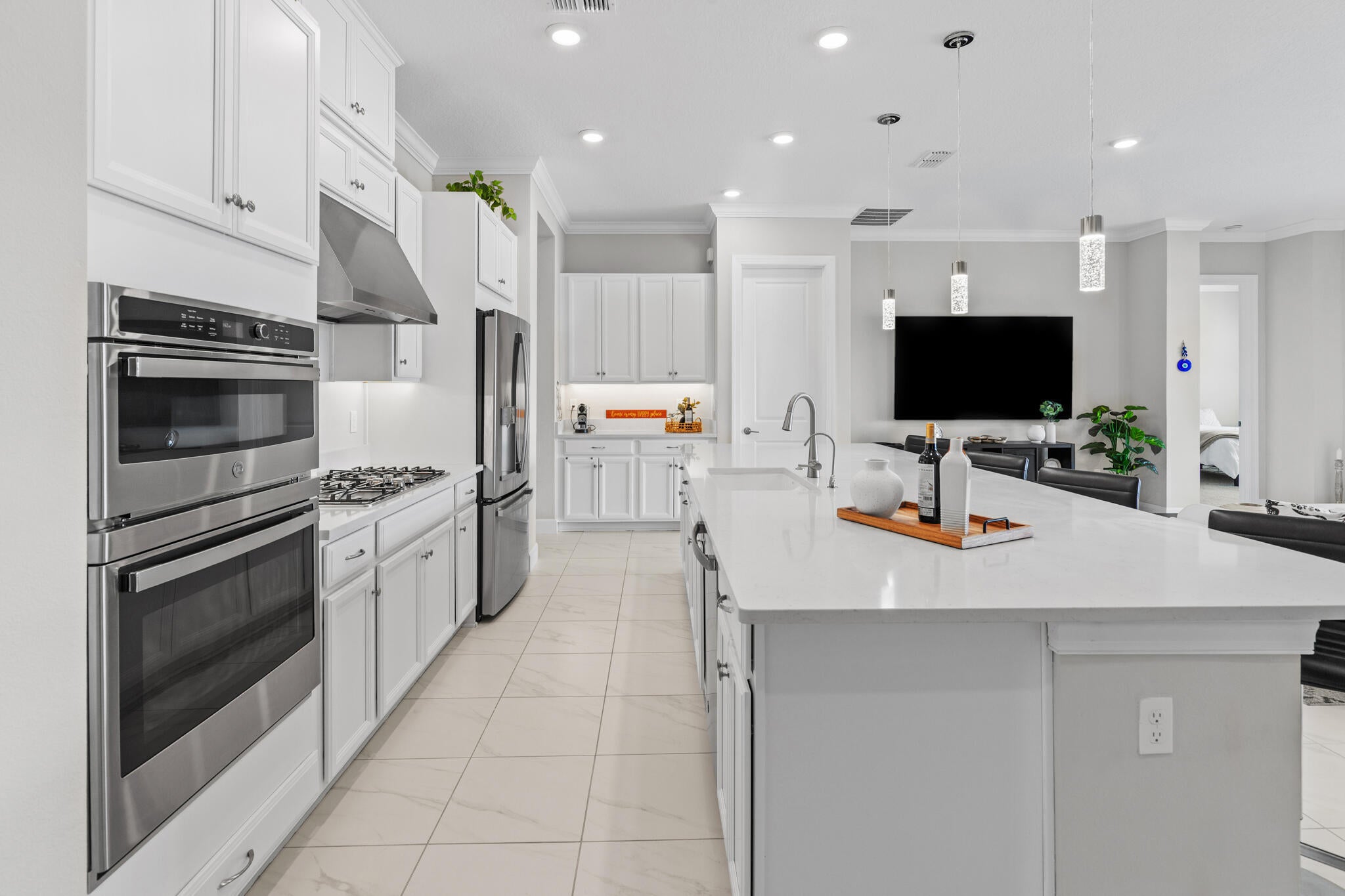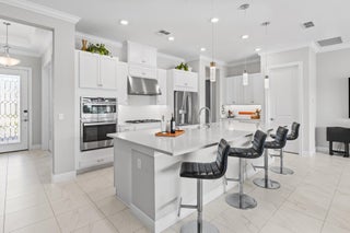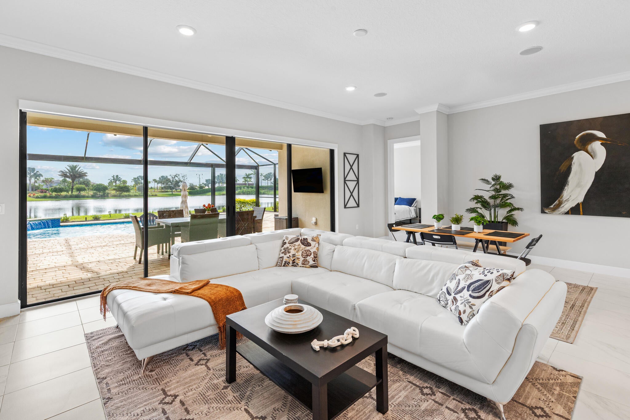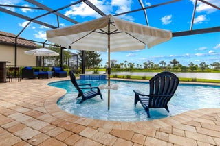 Welcome to this stunning AMBRA model in the desirable 55+ community of Esplanade at Tradition. This 3 bedroom, 3 full bath home features 2 primary suites plus a den with elegant glass French doors. The open, light-filled floor plan offers tile floors in main areas, crown molding and expansive pocketing sliding doors that open to a screened patio with pool, panoramic lake view, and a full-view screen enclosure. The gourmet kitchen boasts quartz countertops, upgraded cabinetry, a large island, stainless steel appliances, and spacious walk-in pantry Both primary suites include walk-in closets and spa like baths with quartz counters. With over $100,000+ in builder upgrades, landscaping, and so much more, this home is an incredible opportunity