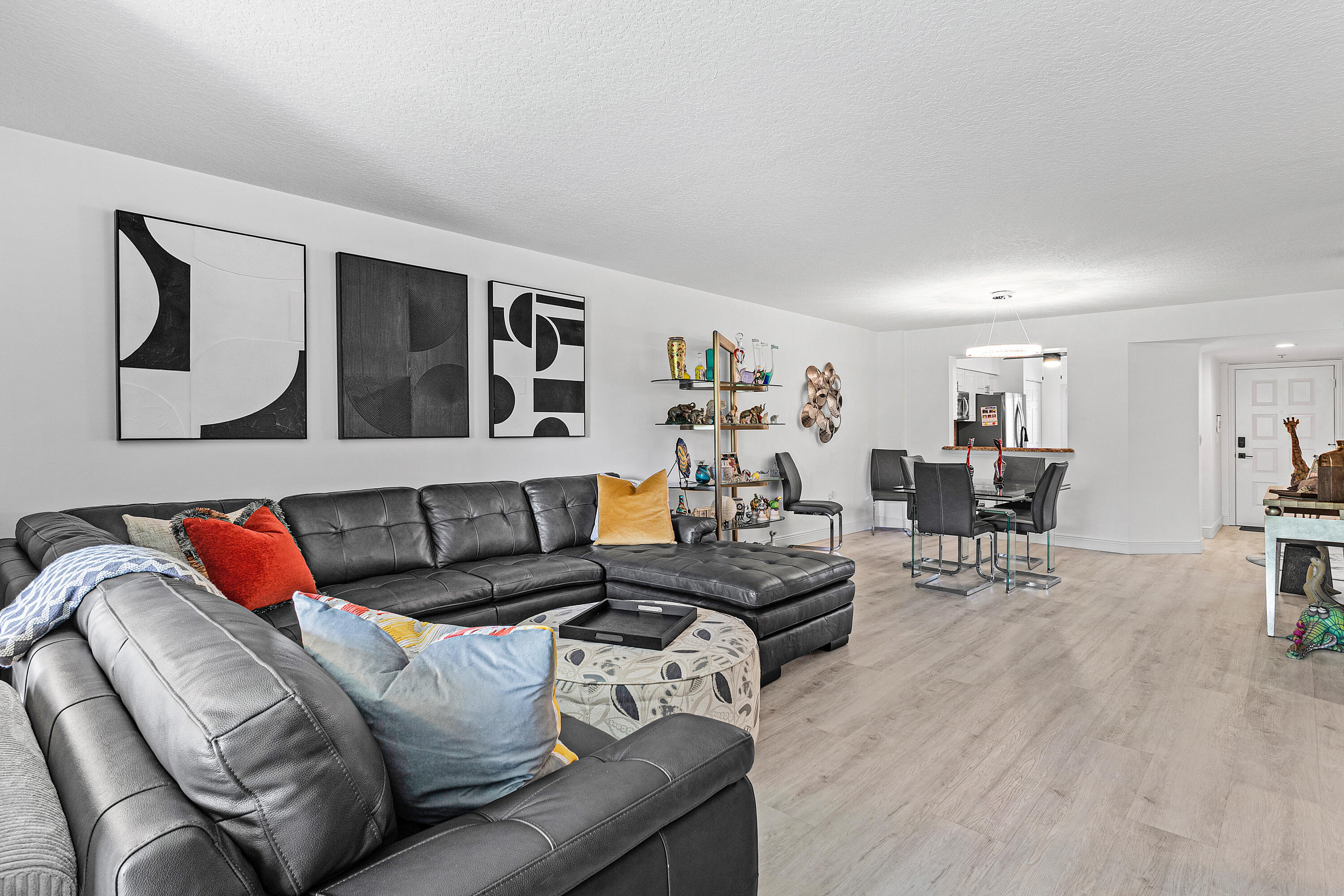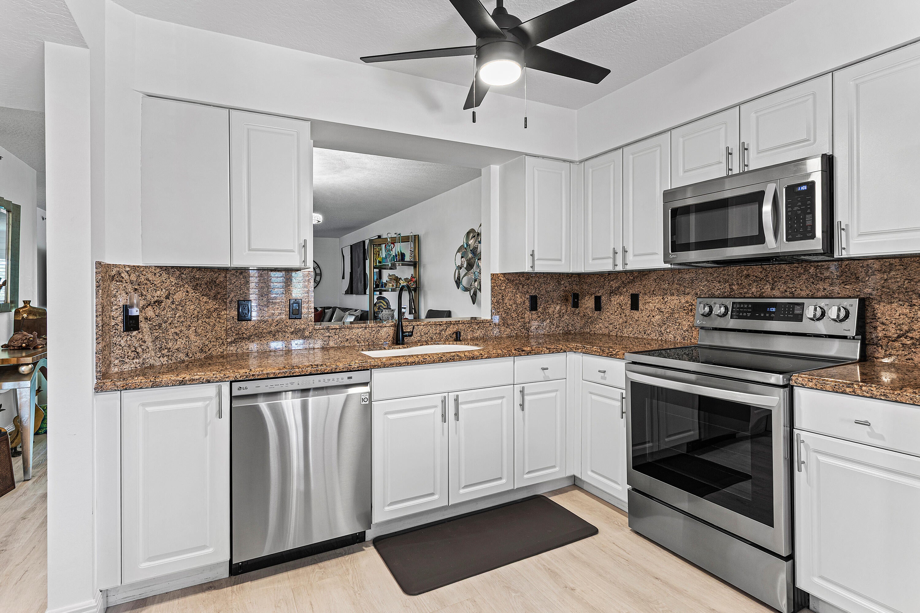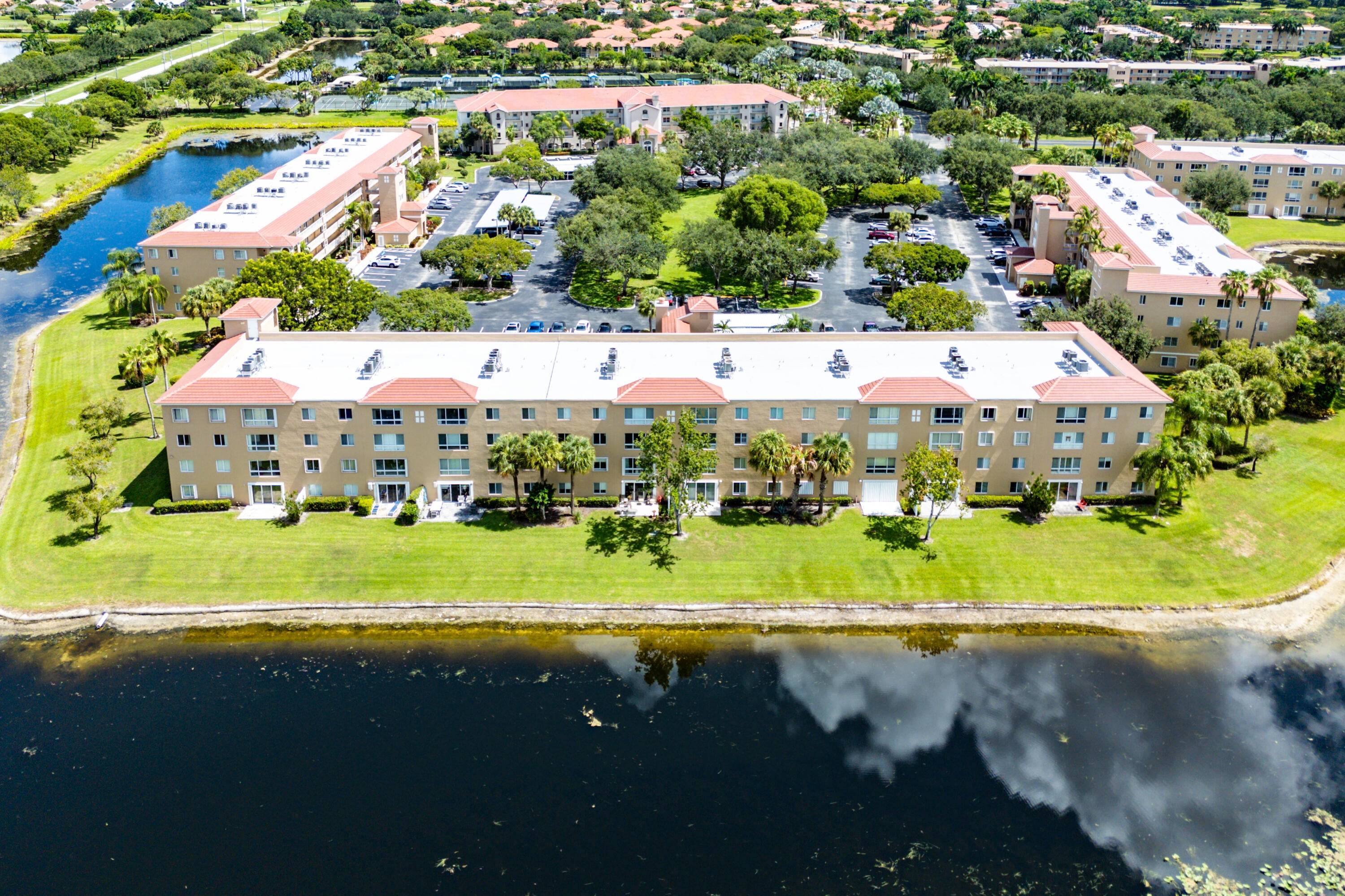 THE BEST OF EVERYTHING!Largest MAJESTY Model 3 BD / 2 BTH + Assigned COVERED PARKING Space. Amazing Lake View w/Southern Exposure. Step into Perfection. Completely Renovated* no expense spared*. White Cabinets, Granite Counters + Backsplash, All New Hardware w/New LG SS Appliances, French Door Refrigerator, Hi Arch Faucet, Custom Undermount Ceramic Sink. All New Vinyl Flooring Thru-Out- Woodland Oak Oyster, Waterproof .22 Mill , New Porcelain Tile in Both Bathrooms. New Shower Enclosures in both Mst + Guest Bthrms, Frameless Shower Enclosures, New Vanities, Lighting, counter tops and Hi Arch Faucets, Dual SinkVanity Mst Bthrm. All Door Knobs, Ceiling Fans and Lighting Fixtures are High End and Brand New. Entire Condo Freshly Painted. AC 2024. New LG Washer and Dryer in separate laundry room with utility sink. Every Window has Plantation Shutters and New Screens. There is an Outdoor Light installed in the front of the condominium to provide additional lighting upon entry. The front door is a Keyless Entry. This property comes with a Deeded Covered Parking Space which is close to the front entry to the building. SELECT ITEMS OF FURNITURE NEGOTIABLE. Enjoy Country Club Style Amenities: Clubhouse, Performing Arts Theater, Shows, Cafe, Indoor + Outdoor Pools, Locker rooms w/Sauna,Steam,Wirlpool, Tennis, Pickleball, Billiards, Cards, Clubs, Arts Crafts, Ceramics, Aerobics, Classes, Library and so much more to enjoy!