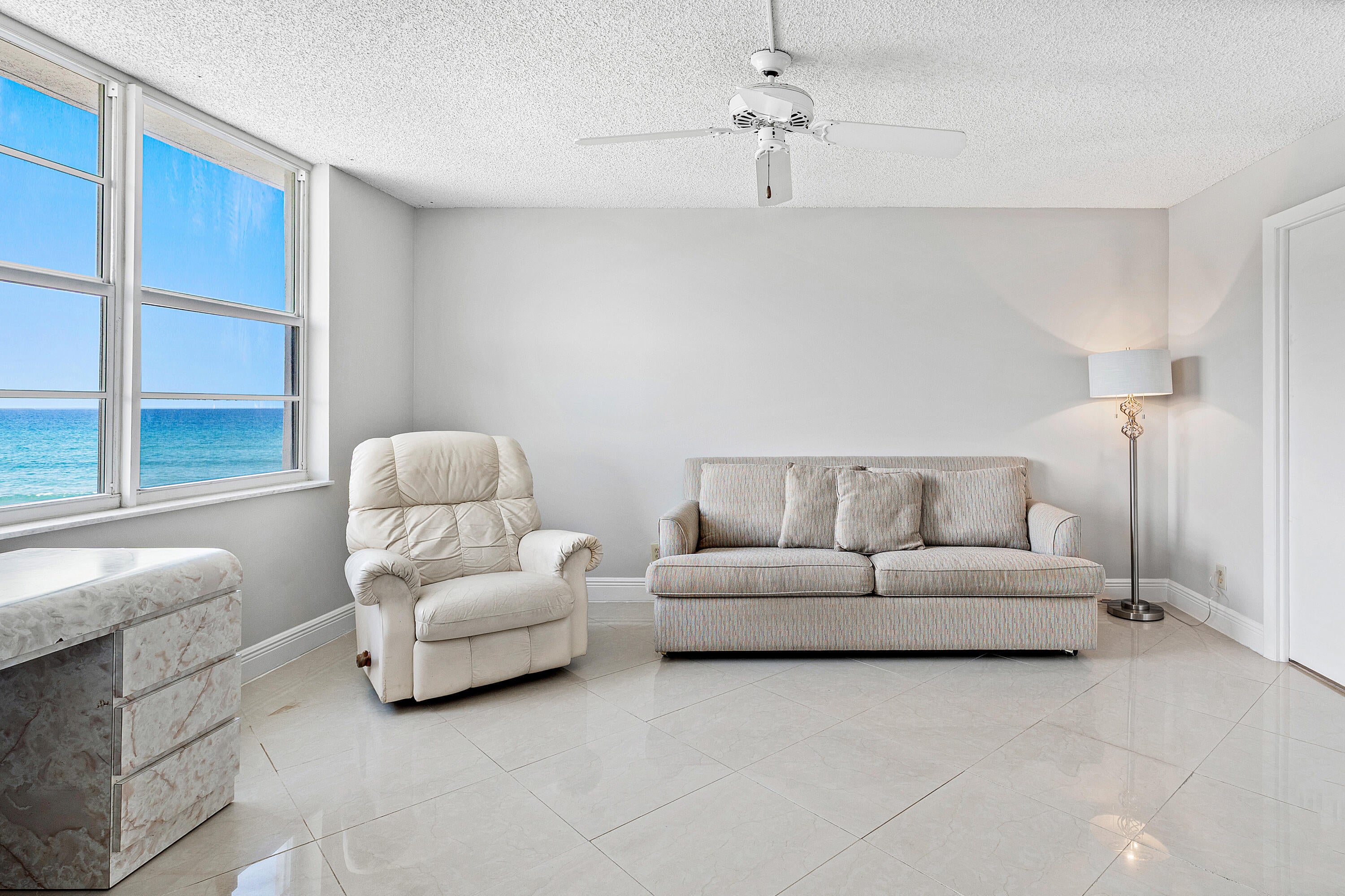 Welcome to 45 Ocean, a bright and happy 2-bed, 2-bath condo in the heart of beautiful Highland Beach. This home offers about 1,100 square feet of easy, stylish living with wide ocean views from every room. The condo faces north, giving you soft light and peaceful water views all day long. The home is in move-in ready shape with fresh updates and is being sold fully furnished, making it perfect for full-time living or a simple seasonal getaway. Just bring your suitcase and start enjoying the beach life right away. This unit sits in one of the best spots on the floor. The laundry room and trash chute are right outside your door, making daily life simple and stress free. Cable and WiFi are included in the monthly fee, adding even more value. Step outside and you are moments from the sand atat the stunning 2½-mile Helen Reed Beach. This area is known for being safe, quiet, and easy to walk, with its own dedicated police patrols. You are also perfectly placed between Delray Beach and Boca Raton, giving you quick access to great food, fun nights out, and everyday shopping. Rent right away with a three-month minimum, one rental per year. Priced to impress in an oceanfront community, this condo is a rare chance to enjoy coastal living at a smart value. Come see it today!