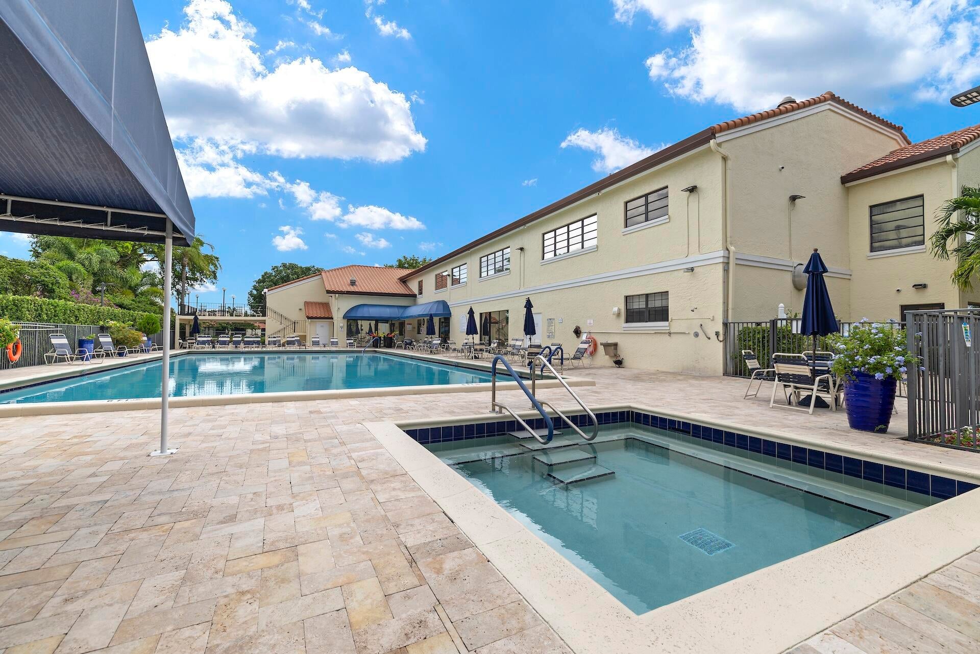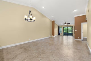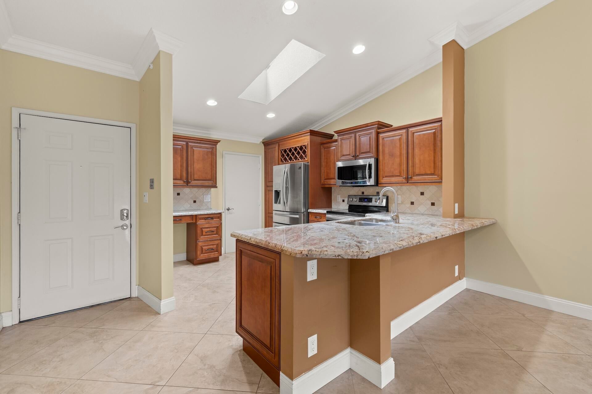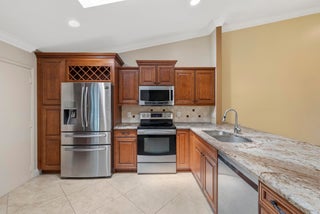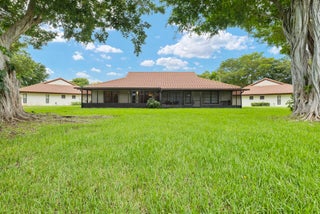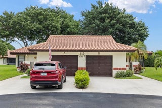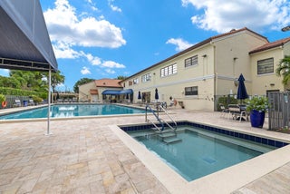 Spacious 2-bedroom villa with sunroom and 1-car garage in the gated 55+ community of Palm Chase. A private courtyard welcomes you, while a skylight fills the kitchen with natural light. Vaulted ceilings in the living and dining areas create an airy, open feel, making the villa live like a single-family home. The garage offers direct access to the kitchen, plus a 2-car driveway. The home also comes equipped with a Tesla Wall Charger. Enjoy resort-style amenities including a temperature-controlled pool, hot tub, fitness center, clubhouse with social clubs, walking paths, pickleball, bocce, and tennis courts. Generator in garage does not convey.
