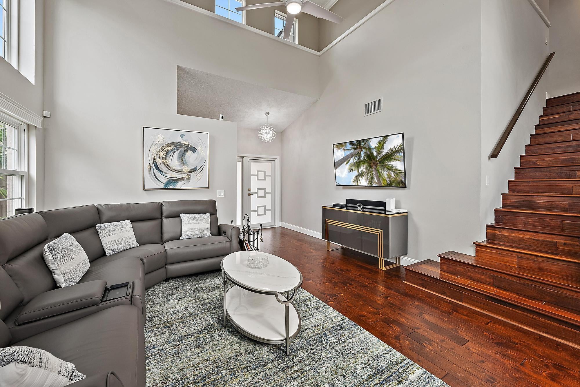 Beautifully updated and meticulously maintained 3 bedrooms, 2.5 bath, 2 car garage home located in the quite enclave of Bristol Club inside PGA National. Vaulted ceilings & remote-controlled solar shades on the upper windows. Newly renovated kitchen and powder bath. Wood flooring throughout the downstairs, stairs & upstairs hallway, and new designer carpeting in the bedrooms. Turnkey and fully furnished with high end newer furniture include king bed in primary bedroom, queen bed in 2nd bedroom, and queen sleeper sofa in 3rd bedroom that can be switched out to queen bed. Impact glass windows and doors throughout. 2023 a/c with UV lighting. Upgraded landscaping, fenced yard. Phantom screens & retractable awning in extended patio. Garage has a wall-mounted a/c, EV outlet and epoxy flooring.