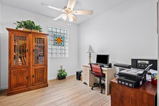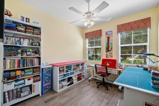Low HOA Fees in the Quaint Gated Community of Canopy Cove This stunning 3-bedroom, 2-bath, 2-car garage home with a flex room is located in the highly sought-after gated community of Canoy Cove. Built in 2019, the residence offers a modern split floor plan and a variety of impressive upgrades. The gourmet kitchen features custom white cabinetry, granite countertops, and a center island with breakfast bar, opening seamlessly to the dining area and spacious living room--perfect for entertaining or everyday living. The private master suite at the back of the home offers tranquil golf course and lake views. Its ensuite bath includes dual sinks, a private water closet, and a custom walk-in closet. Additional highlights include crown molding, custom closets, faux wood tile flooringthroughout, and impact windows and doors. The versatile flex room is ideal for a den, office, sewing room, or playroom. Step outside to a screened, covered porch and enjoy picturesque views of the golf course and lake, along with a variety of wildlife right from your backyard.
