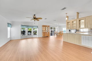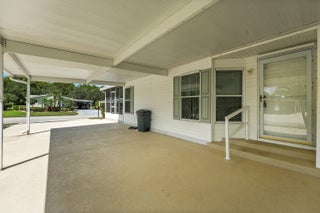 Beautiful corner ...nicely landscaped. lovely 3/2/1 carport, big 30 x 12 screened porch, shed 15 x 10 with electric. Huge kitchen, granite counter tops WITH BREAKFAST BAR AND stainless appliances. Laundry rm with washer & dryer. luxury vinyl floors, carpet in bedrooms. Sprinkler system. Home well maintained. NOTE: Land Leased property