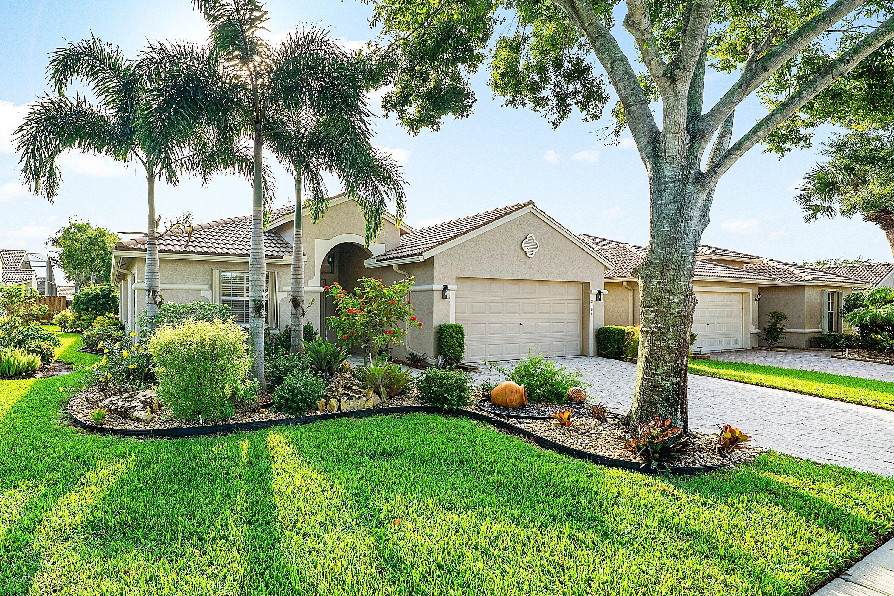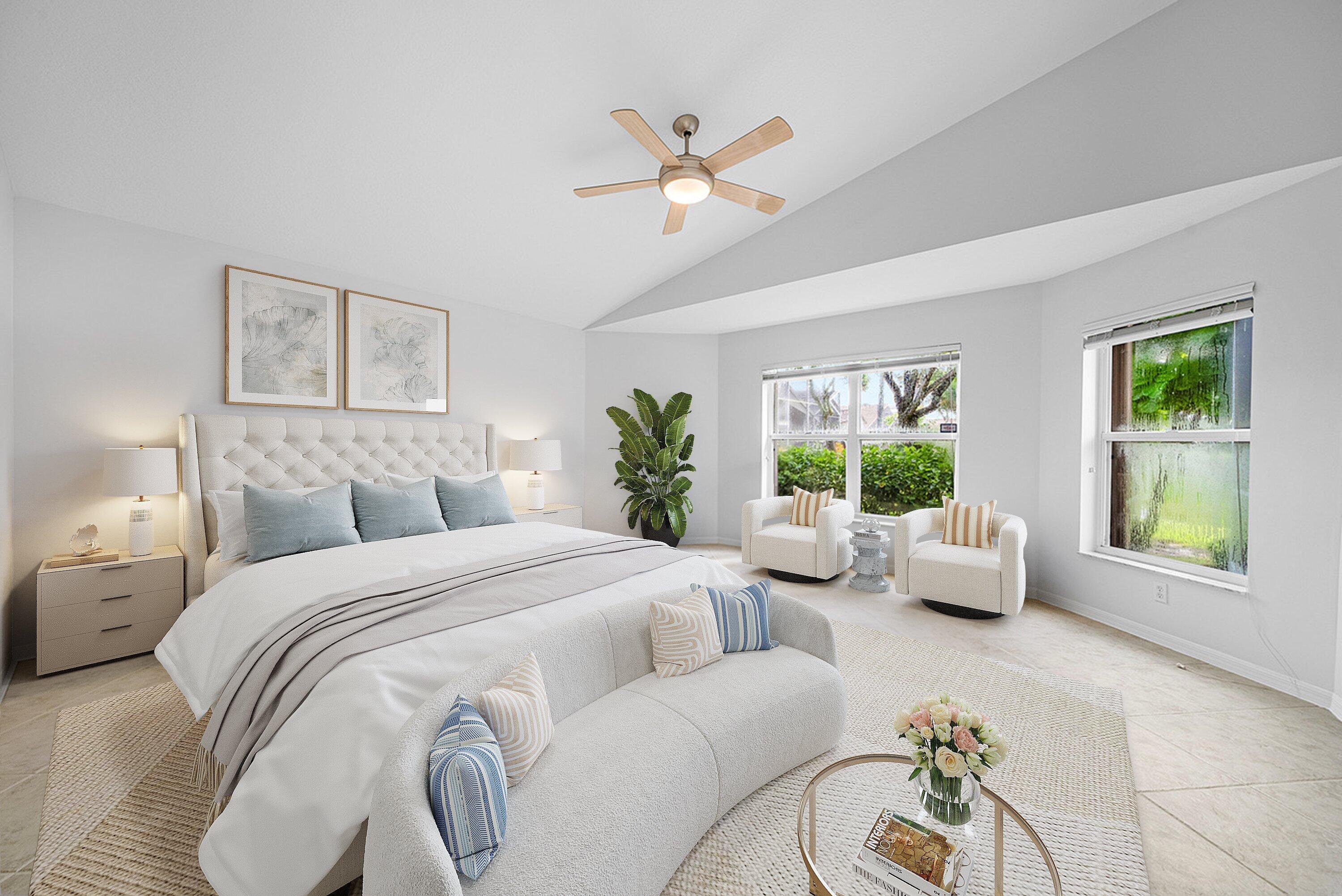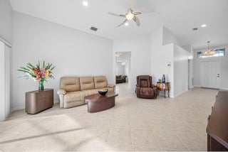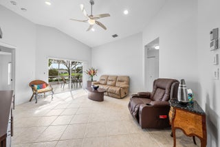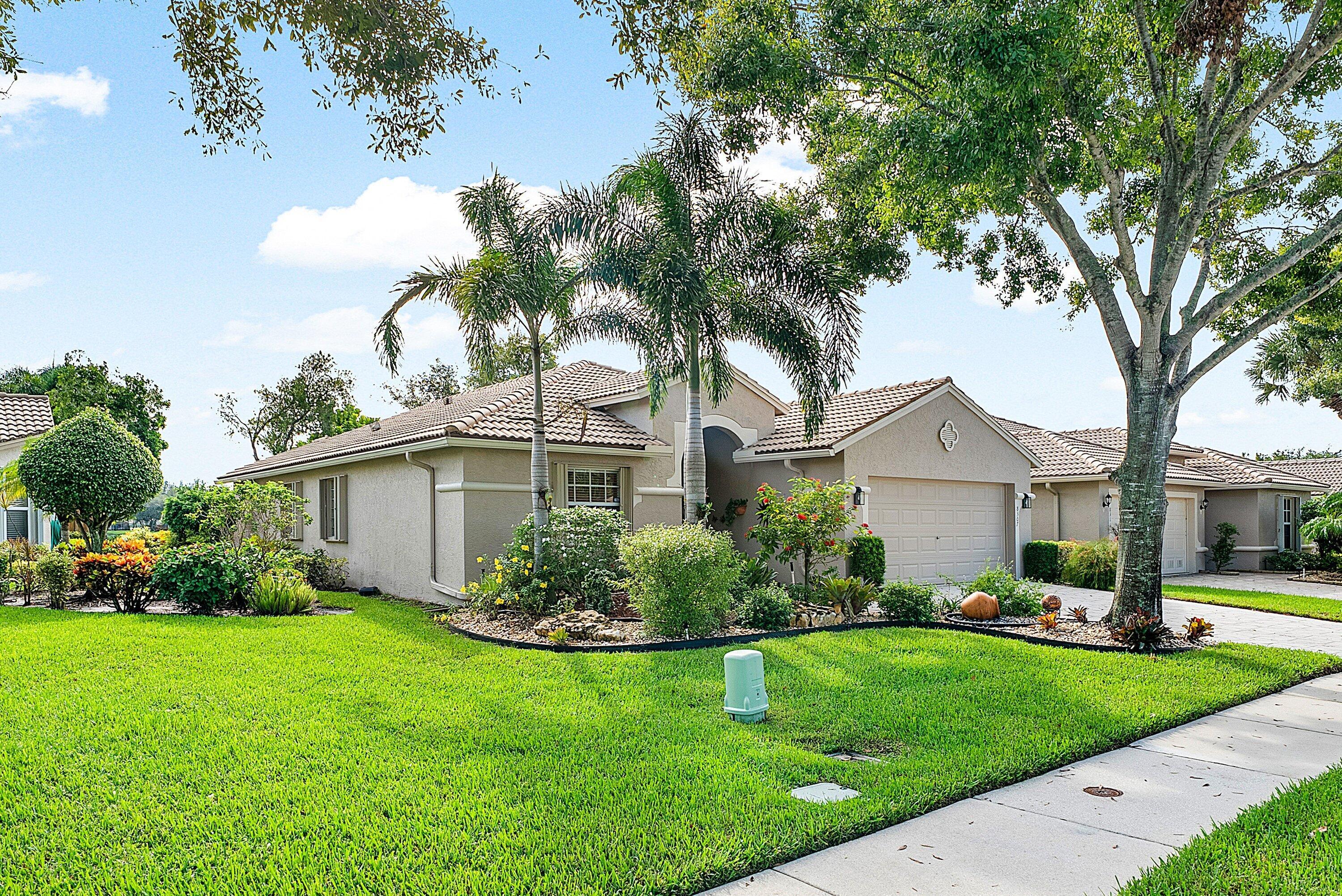 Breathtaking LONG lake views from this Avellino plan on a PRIME lot! This lovely 3-Bed/2-Bath/2 Car Garage waterfront home on an amazing corner lot! (3rd bedroom is used as a den with no closet). From the moment you arrive, you'll appreciate the meticulously landscaped walkway. On entry, take in the neutral, FRESHLY painted (9/25) interior, dramatic vaulted ceilings, custom mirrors and stunning lake views! The eat-in kitchen also features a snack bar, white cabinetry, black granite and a spacious pantry. The dining room is a great size, and is open to the kitchen and great room, making it a great layout for entertaining! The open and airy great room gives this home a contemporary feel, and the lake views are amazing from nearly every room! The primary suite is generous, witha picturesque bay window, tray ceiling, dual walk in closets, and a master bath retreat with separate tub and shower, single sink and make-up vanity area. The split bedroom plan allows privacy for you and your guests, with the 2nd bedroom, den/office and hall bath all located opposite the primary bedroom. There is a sink in the interior laundry room for convenience. AC was replaced in 2018. The fully remodeled and redesigned luxurious clubhouse offers endless social opportunities with its clubs, shows, events, restaurant and lounge, resort style pools, state of the art fitness building, ballroom/social hall, arts & crafts studio, billiards, bocce ball, tennis, pickleball, card rooms and SO much more!