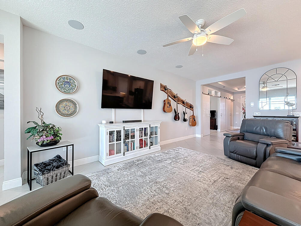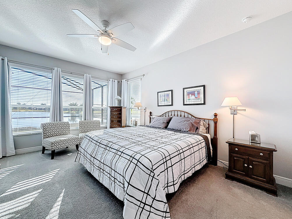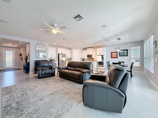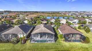 Welcome to your Vitalia dream home! This bright and open home offers breathtaking long-water lake views visible from the entrance foyer and extending into the dining area, great room and primary bedroom. This popular 2-bedroom, 2-bath Jensen model with a versatile den offers over 2000 square feet of luxurious living space. The expansive outdoor living area includes a screened lanai where you can enjoy sunrises, moonrises, rocket launches and tropical breezes whether relaxing in your heated spa, floating in your gorgeous saltwater pool or watching the big screen TV. Nestled in a prime location, this home is the perfect waterfront retreat for relaxation and entertaining family and friends. As you step inside, you'll be captivated by the tile flooring that flows seamlessly throughout themain living area, enhancing its modern elegance. The large open-concept great room creates a welcoming atmosphere and includes 5 ceiling mounted Bose speakers for surround sound. The stunning kitchen features 42-inch cabinets, a classic tile backsplash, rollout bottom shelves in lower cabinets, electric stove top, double ovens, microwave, under-cabinet lighting and a spacious quartz countertop and island layout that is perfect for cooking and entertaining. The oversized primary suite is a private sanctuary, complete with a large walk-in closet, a cozy sitting area, and an en-suite bath featuring his and her sinks and a spacious tile shower. The guest bedroom and bath are thoughtfully positioned at the front of the home, offering easy comfort for visitors. The adjoining den provides endless possibilities, ideal for a home office, media room, or additional guest space. Flexible sliding barn door configurations ensure visitor privacy is available for both rooms. The oversized garage is an excellent bonus, being 4 feet longer than a standard garage. Features include a finished epoxy floor and overhead, wall-rail and attic storage spaces to meet all your storage needs. As added bonuses, the pool/spa had new state-of-the-art equipment including pump, heater, chlorinator, control panels and remote access via smartphone installed in September 2024 with a 3-year warranty. Also, the home exterior was just painted in February 2025 and the pool deck was refinished at the same time. Additional features include a widened paver driveway, impact glass windows and doors for superior storm protection, and high-end finishes throughout. Vitalia is a vibrant and active adult community that offers a 24,000 SF clubhouse with a ballroom, aerobics studio, fitness center, demo kitchen, library, and card & game rooms. Residents can enjoy a variety of outdoor amenities, including tennis, pickleball, bocce, horseshoes, basketball, two heated pools, and a large putting green. With its spectacular waterfront views, luxurious upgrades and open-concept design, this home is the perfect blend of comfort and elegance. Don't miss the opportunity to make it yours!